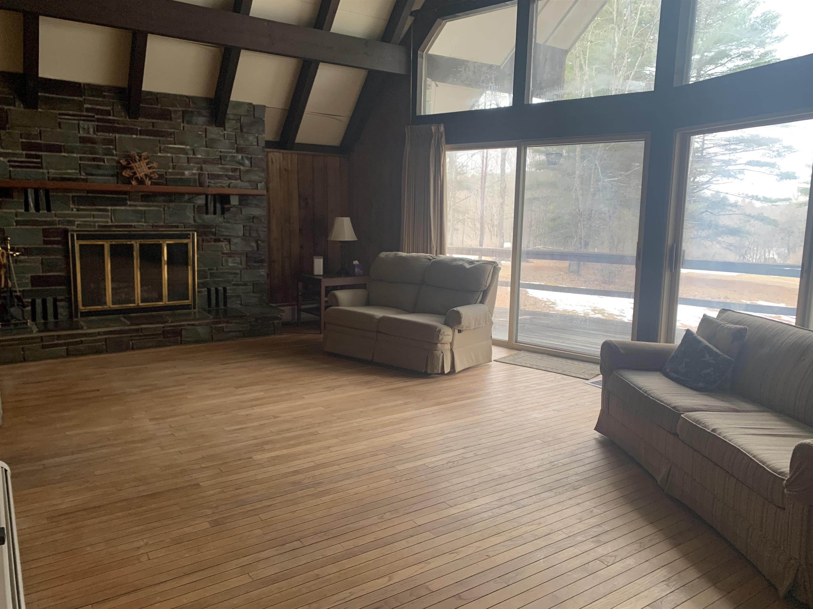 Nestled in the Lakes region on a charming town maintained country road, this home boasts 9 +/- acres. Outside features a sprawling lawn as well as a pond and waterfall on the property. Enter this 3 bedroom 2 full bath home through an attached 2 car garage and mudroom. Interior features living room with a wood burning fireplace and cathedral ceiling, kitchen, formal dining room , two first floor bedrooms and a full bath. Heated unfinished basement with a fireplace could be finished for additional space. Furnace, oil tank, electrical and septic have been updated. Close to Vermont State university, multiple lakes and ski areas.