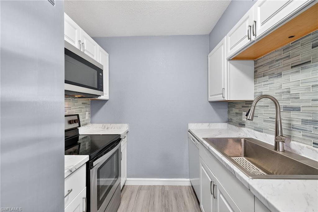 One or more photo(s) has been virtually staged, AI generated or rendered. Opportunity to Own in Naples for Under $195K! Experience the Naples coastal lifestyle in this beautifully updated 2-bedroom, 2-bath first-floor condominium located in the vibrant Bayshore Arts District at Abaco Bay. Offering approximately 886 square feet, this bright open floor plan features desirable split bedrooms and newly installed luxury vinyl flooring throughout for easy maintenance. The updated kitchen showcases