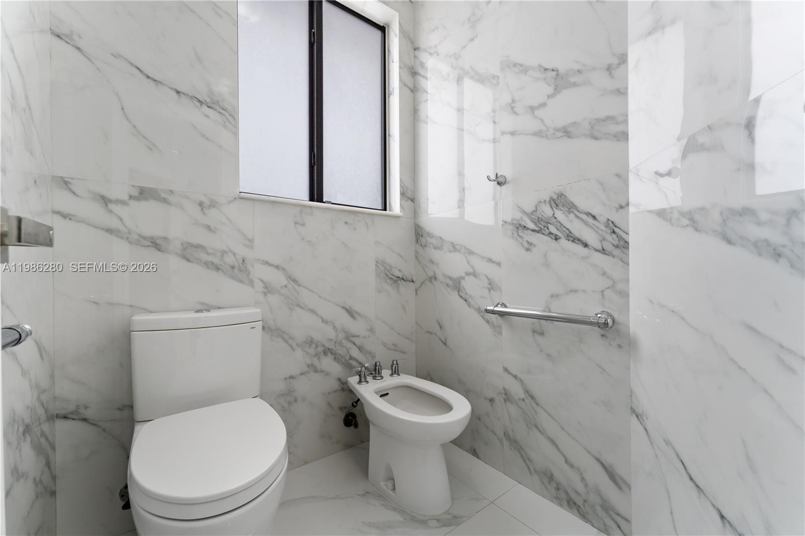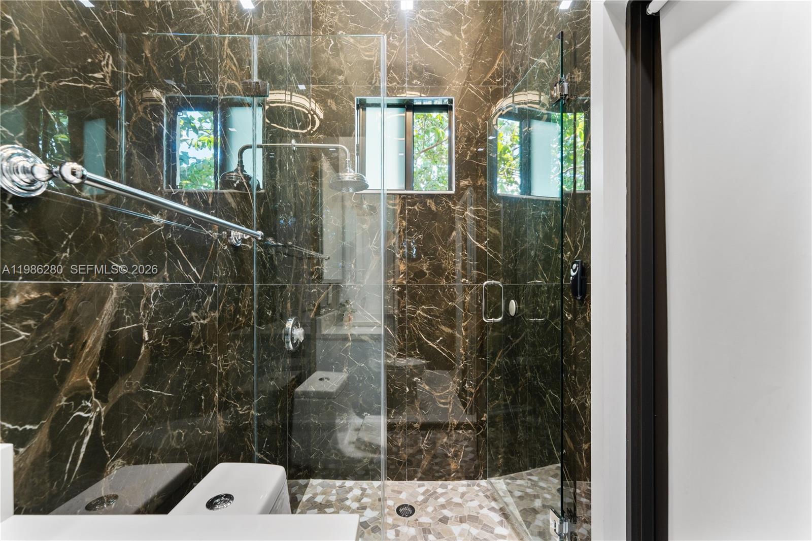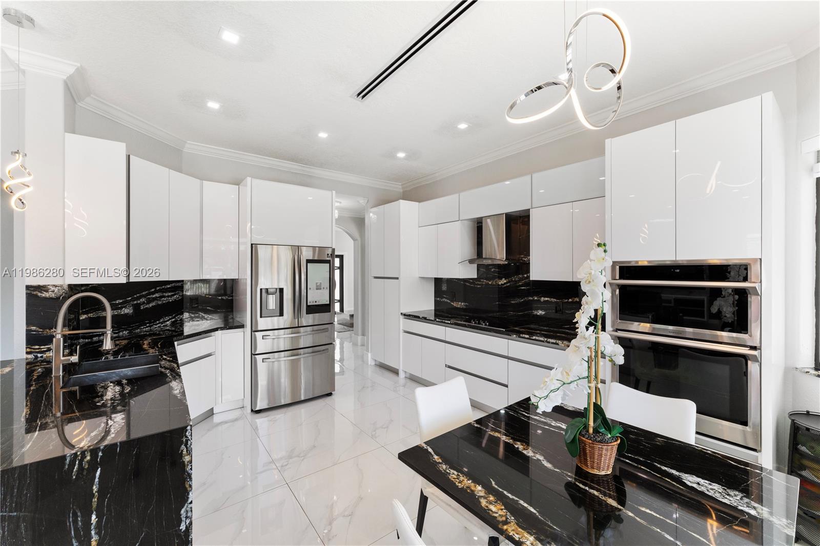 Inside, discover refined modern living with 24x24 designer tiles, zebra blinds, impact glass panel staircase, and custom closet cabinetry in every bedroom. The kitchen is a chef's dream, outfitted with high-end imported Italian acrylic cabinetry and stone, a striking waterfall island, Smart Samsung refrigerator and premium Samsung appliances.