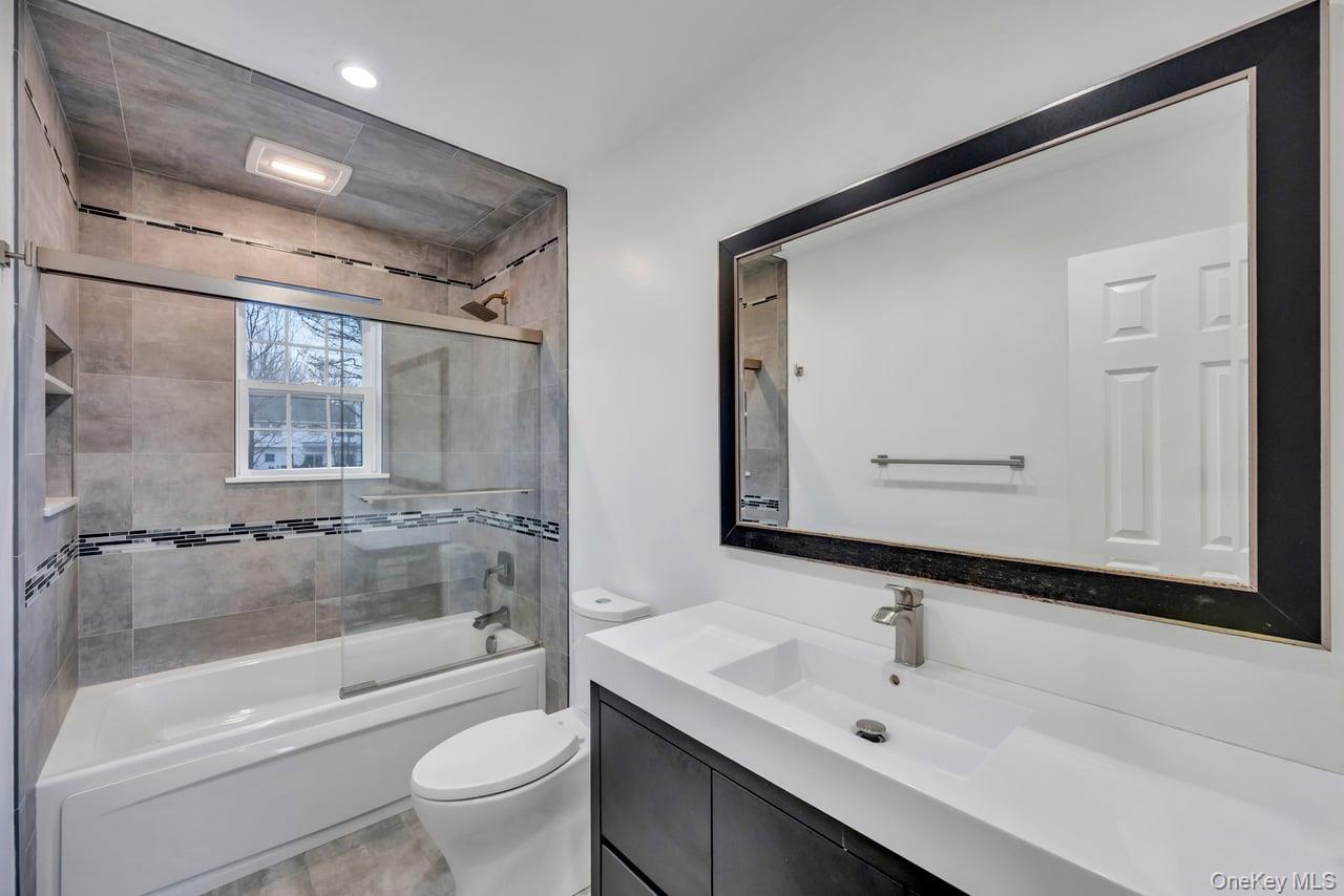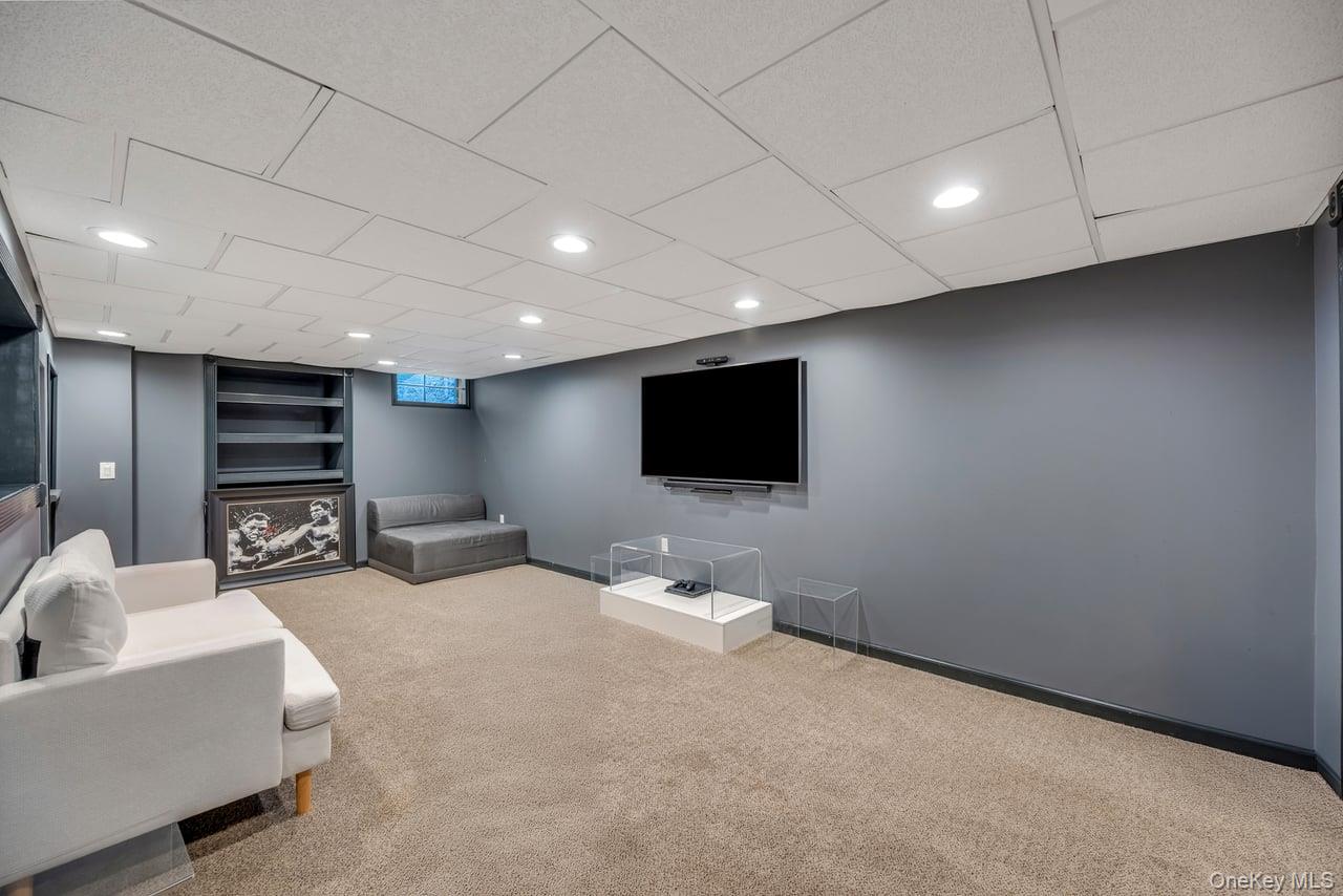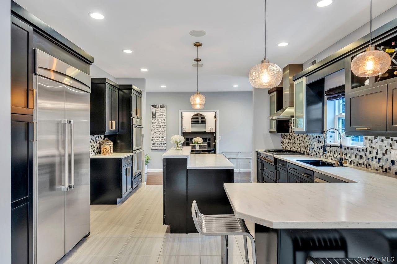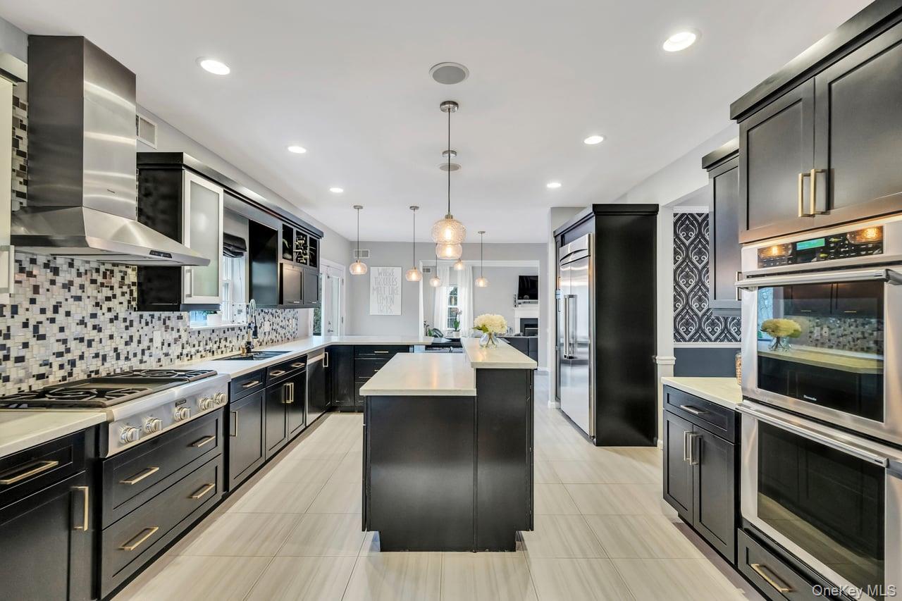 An extraordinary opportunity in the highly sought-after Three Village Club in East Setauket, this exceptional five-bedroom, four-full-bath, and one-half-bath colonial is ideally positioned in the heart of the community and offers a seamless blend of luxury, scale, and resort-style living. From the moment you arrive, the expanded blacktop driveway with cobblestone border, custom brick walkway, stone front porch, and inviting portico create a striking first impression, leading into a grand two-story entry with a wrought iron staircase, hardwood floors, custom moldings, crown detailing, recessed lighting, and soaring ceilings. The expansive layout is designed for both everyday living and entertaining, featuring a sun-filled formal living room with a wood-burning fireplace and custom mantle that flows into a true chef’s kitchen. This standout space includes black cabinetry, white quartz countertops, a bold black-and-white backsplash, glass display cabinets, wine storage, and a large two-level island with pendant lighting, along with premium Thermador double oven, built-in microwave, and oversized Built-in refrigerator. This massive kitchen features two eat-in areas, one with French doors. An additional eat-in area opens directly to a full deck overlooking the backyard. The kitchen connects seamlessly to a formal dining room with hardwood floors, natural light, and designer wallpaper, while a private sunken den and home office, enclosed with French doors, offers a quiet and refined workspace complete with coffered ceilings, custom built-ins, gas fireplace, and surround sound. A well-appointed mudroom with washer and dryer, built-in cabinetry, and side entrance access, along with a finished powder room with wainscoting, completes the main level. The second floor is anchored by a spacious primary suite with double-door entry, vaulted ceilings, hardwood floors, and a gas fireplace, along with a spa-like bath featuring double vanities, granite countertops, tile flooring, glass-enclosed shower, soaking tub, and multiple walk-in closets. A junior primary suite with a private bath, additional generously sized bedrooms, and a full hallway bath with both tub and glass shower provide flexibility and comfort. The full at-grade walk-out basement offers an additional level of living space with high ceilings, recessed lighting, wet bar with sink & refrigerator, an open layout ideal for recreation or fitness, a full bath, and French doors leading to a patio. The backyard is a true resort-caliber retreat, highlighted by a 25’ x 51’ saltwater in-ground pool with spa and cascading waterfall, surrounded by elegant pavers, a slide, diving board, shallow lounge area, and extended bench seating. The fully fenced grounds also feature a sport court, professional lighting, surround sound, manicured landscaping, in-ground sprinklers, multi-tiered stone retaining walls, and a spacious deck accessed from the kitchen. Residents of Three Village Club enjoy exclusive access to a private clubhouse with pool, tennis courts, and event space, completing this rare offering of luxury living in one of East Setauket’s most prestigious communities.