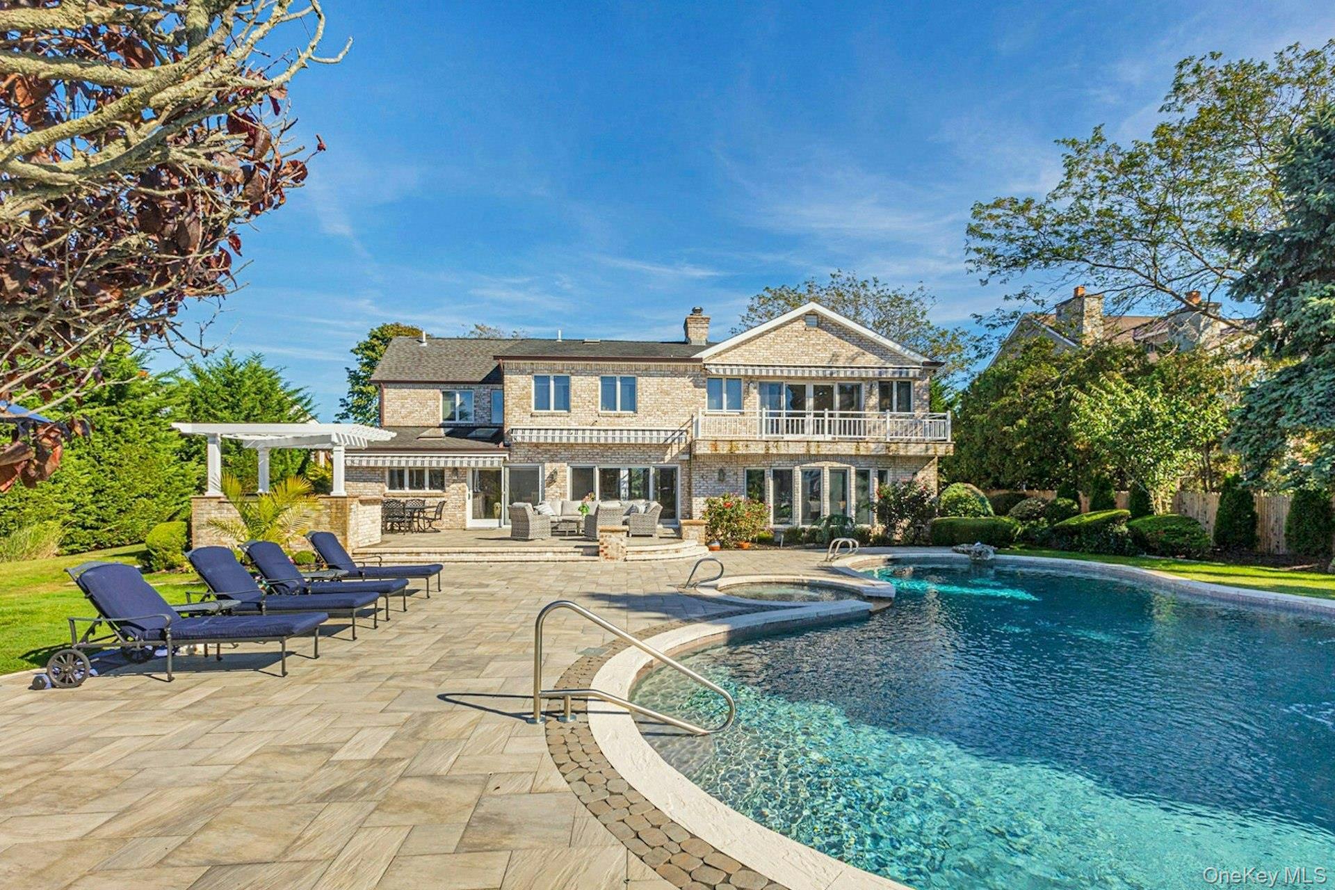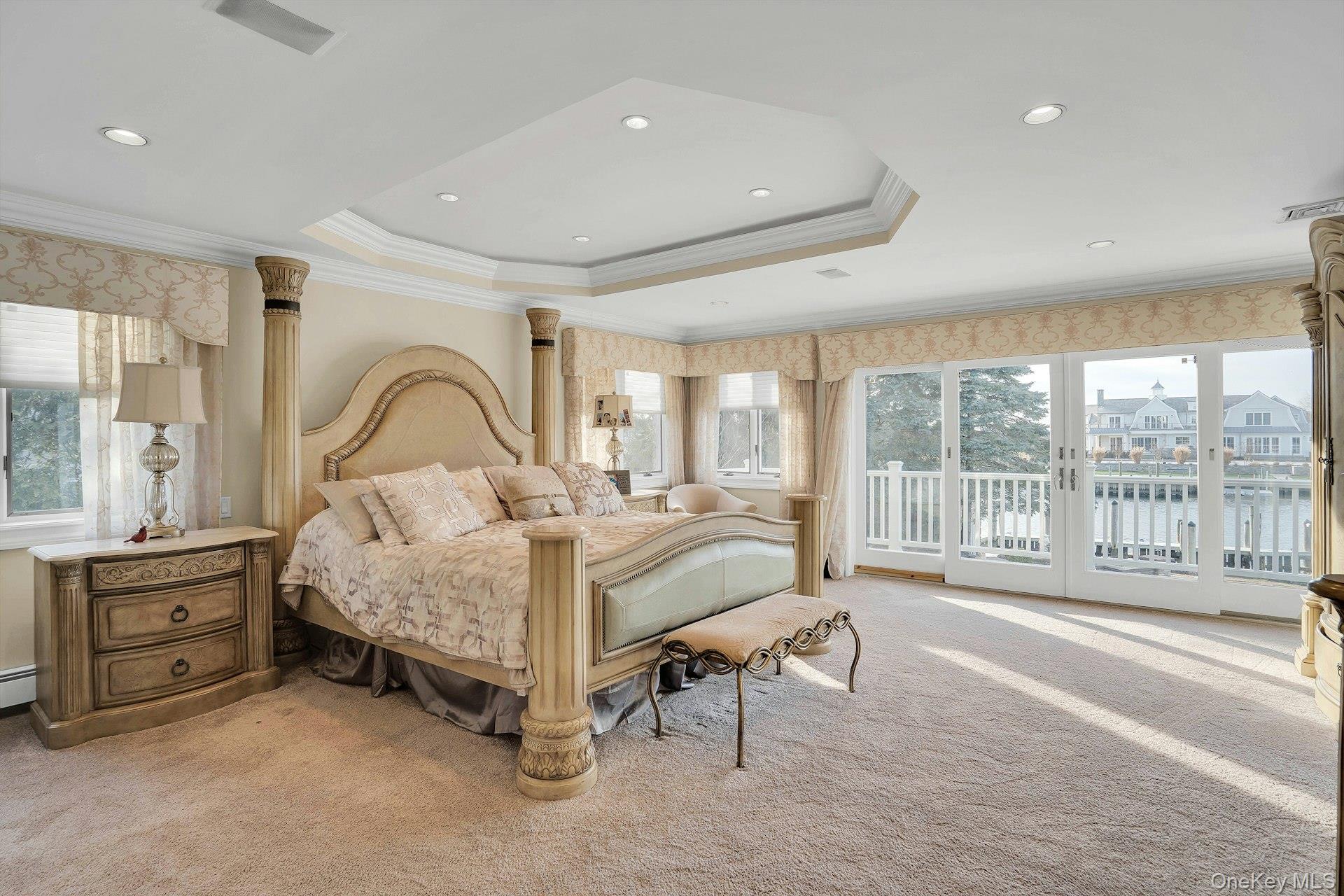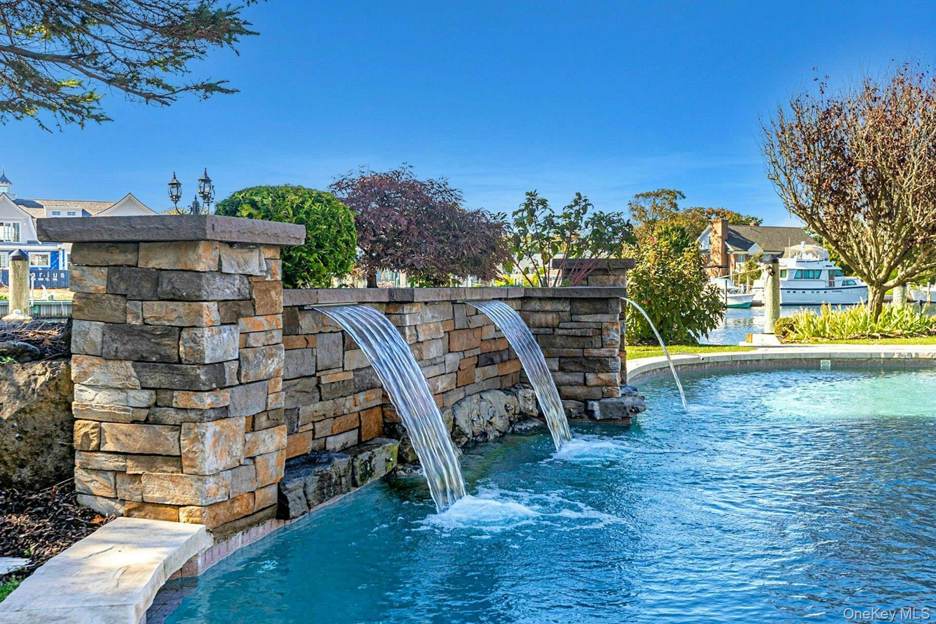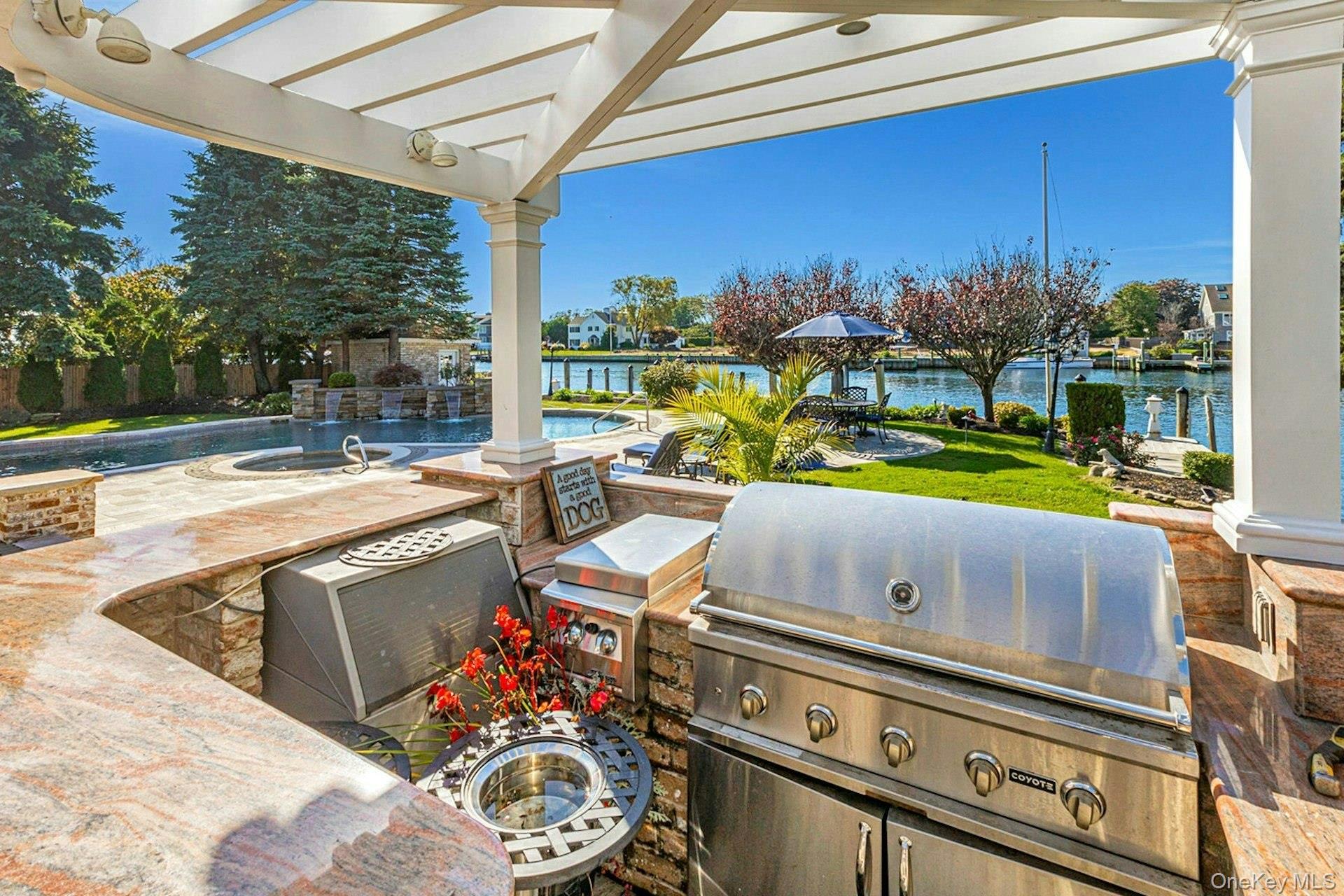 Privately gated, prestigious waterfront home in the heart of Bayberry Point Estates. Drive up the tree lined driveway and around the beautiful fountain to be greeted by new 10' mahogany entry doors, a two story entrance, marble floors, custom iron banisters and crystal Murano chandelier. From the moment you step inside this beautiful home you have a view of the flowing waterways. Windows, doors and skylights all around really brings the outside in. Newly renovated gourmet kitchen features radiant heated floors, fabulous center island with new custom granite counter, newly painted cabinets with designer hardware, 6 burner Wolf stove with grill, Wolf double ovens, Subzero refrigerator/freezer, wine cooler, refrigerator drawers and more! Custom wainscoting, gas fireplace with custom mantle & hardwood floors are an elegant touch. FDR features new coffered ceiling to add to the elegance. Den with attached bar room is a full entertainment space with big screen TV, electric fireplace and full bar overlooking the pool. Newly decorated first floor bedroom with full bath for guests. The Primary Bedroom has an amazing view of the canal and a balcony to enjoy it from. It also features 3 walk-in-closets and an ensuite bathroom. The ensuite bath is newly renovated with soaking tub, new double vanities with make-up area, beautiful chandelier and separate shower. The crown jewel of the home is the stunning yard with beautiful views and the widest canal in Bayberry for the avid boater. Sit in your pool with a cocktail and wave to the boats going by. The pool is a Gibbons gunite, salt water with waterfall and jacuzzi and brand new heater. The outdoor kitchen has new gas barbecue. Main dock is a U-Shape walk around that fits up to a 55' boat and the 2nd dock fits up to a 25' boat and can be converted to a launch. Boat house and shed in yard for extra storage. Lutron Lighting, 6 Vivant Camera Alarm System, CAC, Anderson Windows, New Interior Doors, New Washer & Dryer, All TV's Stay, New Boiler, New Custom Gutters, Garage has new custom flooring and cabinets and New Garage Doors. This is lifestyle living. X Flood Zone!! No flood insurance required. Sellers want to close in August preferably.