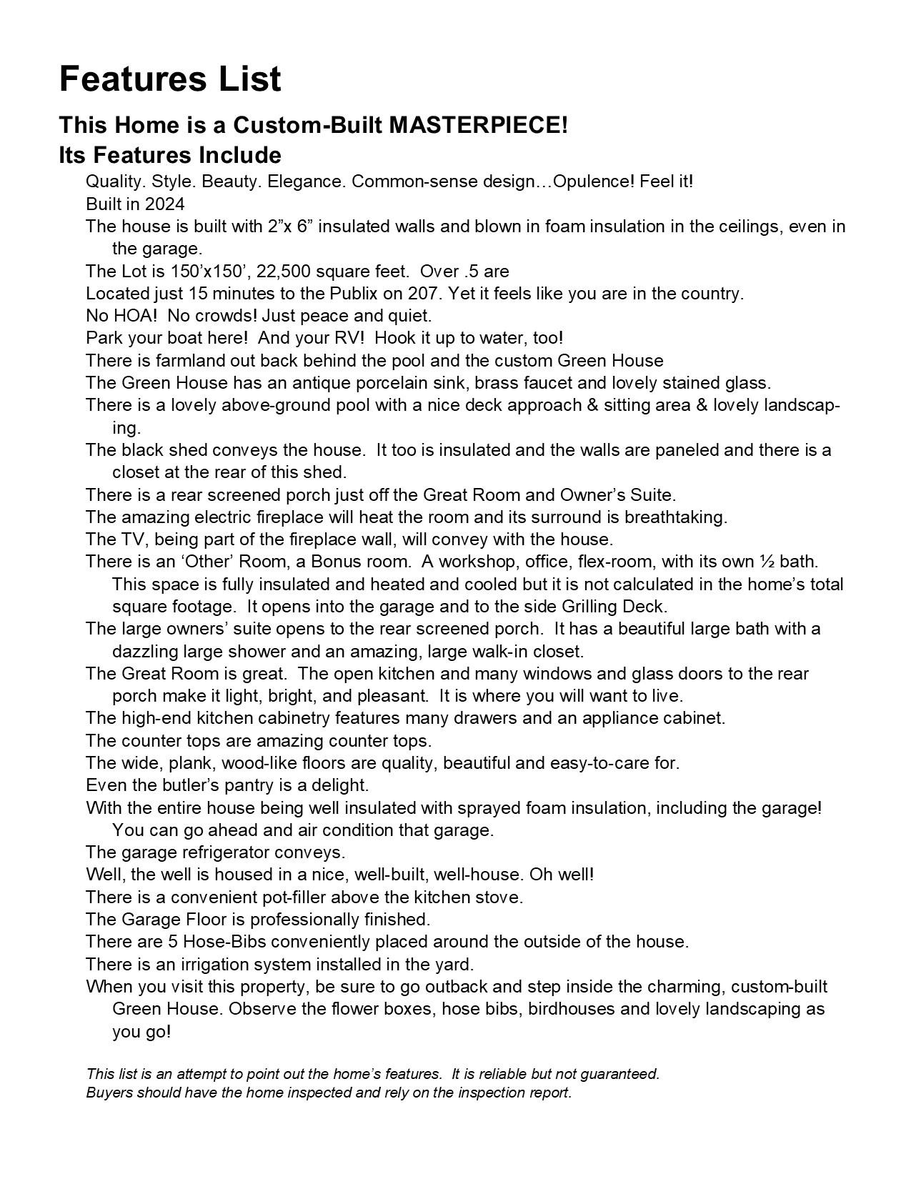 Custom Built MASTERPIECE! Quality. Style. Beauty. Elegance. Common-sense design…Opulence! You can feel the high-end detailed design & upscale materials! This 2-year old home is on a 150’x150’ lot in Elkton. . . 15 minutes to the Publix on 207 it feels like you are in the country. Park your boat & RV here! No HOA! No crowds! Just quite farmland out behind the pool and the enchanting GREENHOUSE! Even the GREENHOUSE is upscale and complete with antique porcelain sink & stained glass. There're too many features to list here. Check out the "Features List" in the Photos section of this listing to see just how special this home is. NOTE: There is an open house this Sunday, 1 - 4 pm See You There! This home is a must see. Even the garage has upscale cabinets & a professionally finished floor & like the rest of the house has 2'x6' insulated walls and blown-in foam insulation in the attic. The pool & deck & landscaping surrounding it, are beautiful. There's a large screen porch & a deck for grilling. The detail around the fireplace and TV is amazing. (Note-the TV conveys!) Fall in love with the workshop/flex-room with its own ½ bath. It is beautifully finished with doors to the garage and the grilling deck but its square footage is not counted in the home's Total square footage. The owners’ suite is fit for Royals with amazing shower and closet! You will love it all! Note: The Square Footage of 1951 reflects the Studio and 1/2 Bath which is not included in the Tax Records.