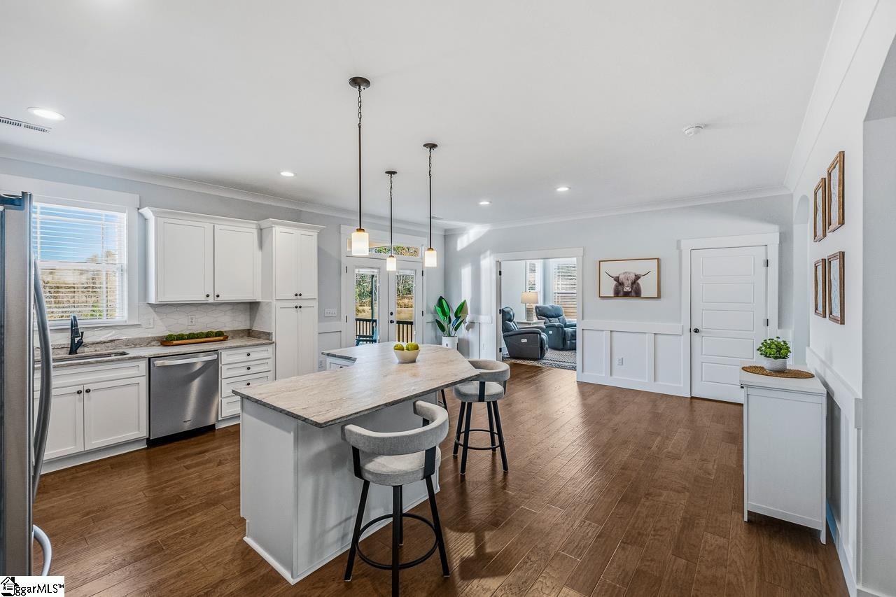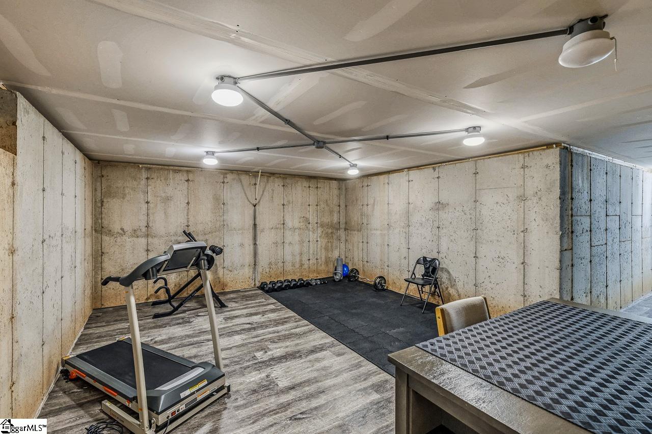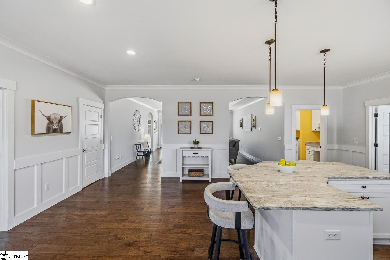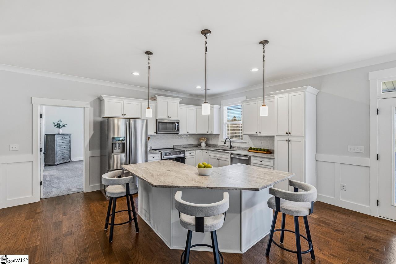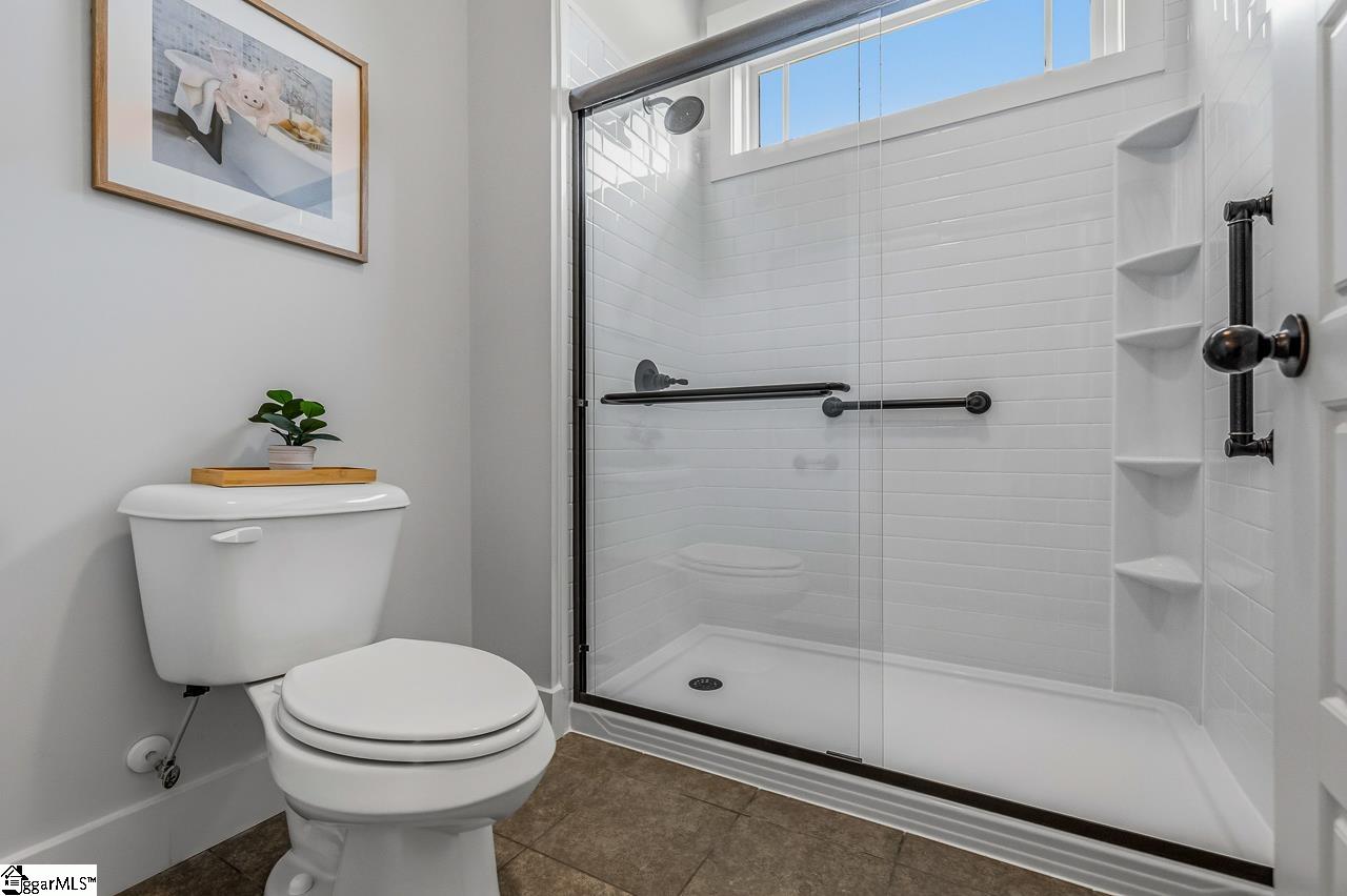 Nestled against a serene, wooded backdrop on an expansive lot, this meticulously designed home offers the ultimate tranquil retreat without sacrificing convenience. Perfectly positioned between Greenville and Spartanburg, this location allows for an effortless commute in either direction and easy access to shopping and restaurants. From the moment you step inside, it is clear that this home was thoughtfully designed for modern living, seamlessly blending functionality with elevated style. Premium upgrades and unparalleled craftsmanship make this residence a stand out choice. Upon entering, you will immediately notice the warm hardwood floors that flow through the main living area, the high ceilings, and the classic crown molding which has been beautifully accented throughout the majority of this home, creating a polished and cohesive feel. Designed for relaxation, the main level living room is enhanced with a stunning trey ceiling, soft accent lighting, and a cozy gas log fireplace creating the perfect setting for quiet nights in. The kitchen has been designed with crisp, white cabinetry, stainless steel appliances, and a generously sized island. This space flows seamlessly together with the dining area allowing plenty of space for everyday living or entertaining. Just off the main space, a versatile flex room with double glass doors and a closet offers the perfect setup for a home office, study, or an additional living area. Located just steps from the garage, a mudroom/laundry room combo maximizes efficiency with custom built-in cabinetry, a utility sink, and a dedicated workspace perfect for a drop zone or laundry folding. The spacious primary suite acts as your private retreat complete with trey ceiling, accent lighting, dual closets, and a well-appointed bath featuring a jetted tub, separate tiled shower, and double vanities. Enjoy a peaceful split-bedroom layout, with two secondary bedrooms positioned on the opposite side of the home allowing for maximum privacy. The finished basement, complete with luxury vinyl flooring, crown molding, ceiling fan, and recessed lighting, provides a spacious recreation area perfect for entertaining a few friends or a large group. The sliding glass door brings in plenty of light and leads directly to the backyard patio. An oversized guest bedroom and full bath finish out the space. The unfinished area of the basement is extremely large and can be used as storage, a workshop, home gym, or future expansion. An oversized detached garage adds additional space for parking a large truck and still leaves plenty of room for the included work bench, lawn equipment or other recreational toys. Recent updates include a new 5 burner slide in range with air fry technology, a beautifully remodeled secondary bathroom shower completed just months ago, and custom closet shelving in the primary suite and two secondary bedrooms. With the home being built in 2020, enjoy the peace of mind that major systems and features remain modern and low maintenance. Schedule a showing to see this remarkable home today!