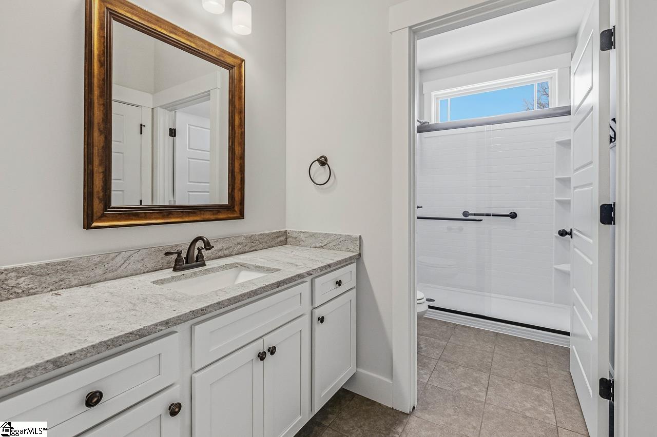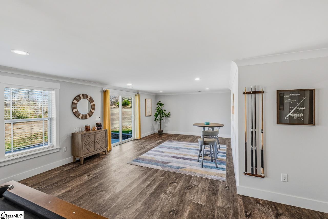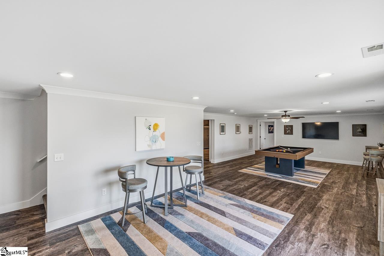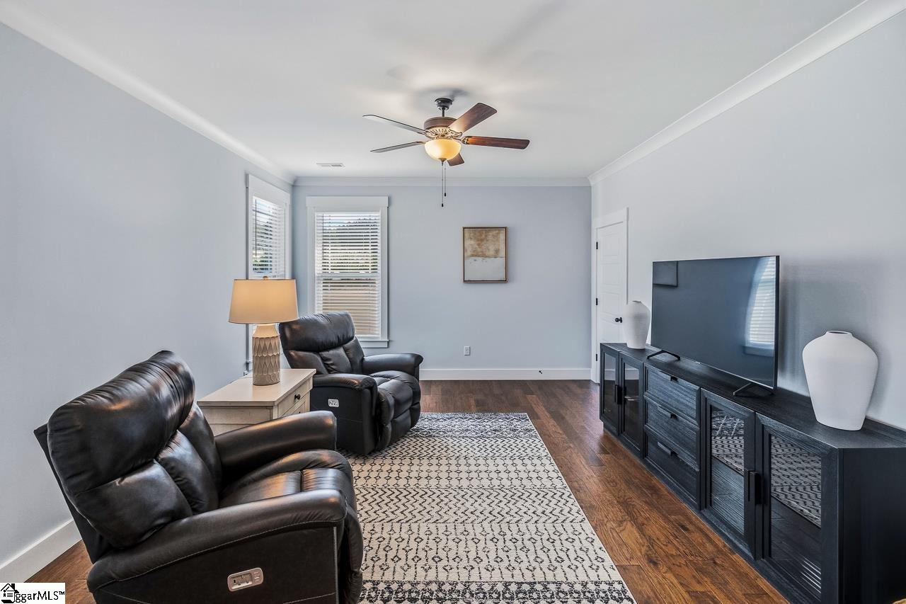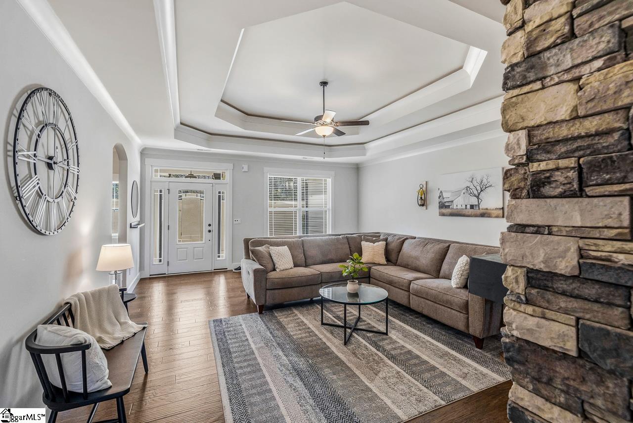 Nestled against a serene, wooded backdrop on an expansive lot, this meticulously designed home offers the ultimate tranquil retreat without sacrificing convenience. Perfectly positioned between Greenville and Spartanburg, this location allows for an effortless commute in either direction and easy access to shopping and restaurants. From the moment you step inside, it is clear that this home was thoughtfully designed for modern living, seamlessly blending functionality with elevated style. Premium upgrades and unparalleled craftsmanship make this residence a stand out choice. Upon entering, you will immediately notice the warm hardwood floors that flow through the main living area, the high ceilings, and the classic crown molding which has been beautifully accented throughout the majority of this home, creating a polished and cohesive feel. Designed for relaxation, the main level living room is enhanced with a stunning trey ceiling, soft accent lighting, and a cozy gas log fireplace creating the perfect setting for quiet nights in. The kitchen has been designed with crisp, white cabinetry, stainless steel appliances, and a generously sized island. This space flows seamlessly together with the dining area allowing plenty of space for everyday living or entertaining. Just off the main space, a versatile flex room with double glass doors and a closet offers the perfect setup for a home office, study, or an additional living area. Located just steps from the garage, a mudroom/laundry room combo maximizes efficiency with custom built-in cabinetry, a utility sink, and a dedicated workspace perfect for a drop zone or laundry folding. The spacious primary suite acts as your private retreat complete with trey ceiling, accent lighting, dual closets, and a well-appointed bath featuring a jetted tub, separate tiled shower, and double vanities. Enjoy a peaceful split-bedroom layout, with two secondary bedrooms positioned on the opposite side of the home allowing for maximum privacy. The finished basement, complete with luxury vinyl flooring, crown molding, ceiling fan, and recessed lighting, provides a spacious recreation area perfect for entertaining a few friends or a large group. The sliding glass door brings in plenty of light and leads directly to the backyard patio. An oversized guest bedroom and full bath finish out the space. The unfinished area of the basement is extremely large and can be used as storage, a workshop, home gym, or future expansion. An oversized detached garage adds additional space for parking a large truck and still leaves plenty of room for the included work bench, lawn equipment or other recreational toys. Recent updates include a new 5 burner slide in range with air fry technology, a beautifully remodeled secondary bathroom shower completed just months ago, and custom closet shelving in the primary suite and two secondary bedrooms. With the home being built in 2020, enjoy the peace of mind that major systems and features remain modern and low maintenance. Schedule a showing to see this remarkable home today!