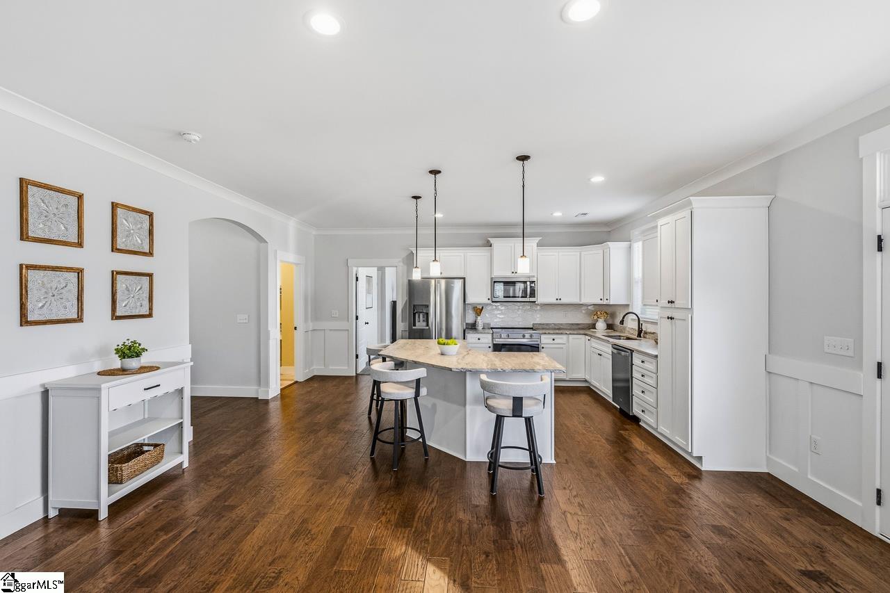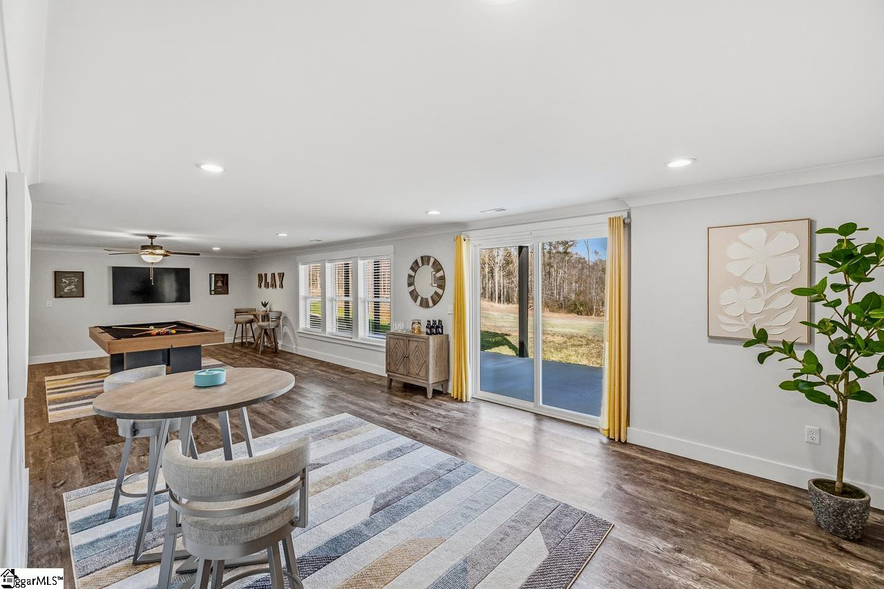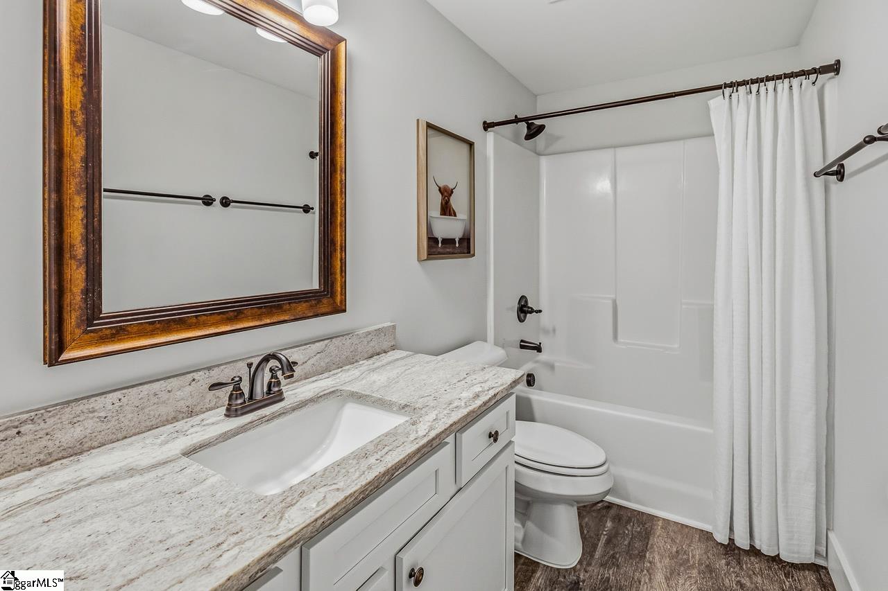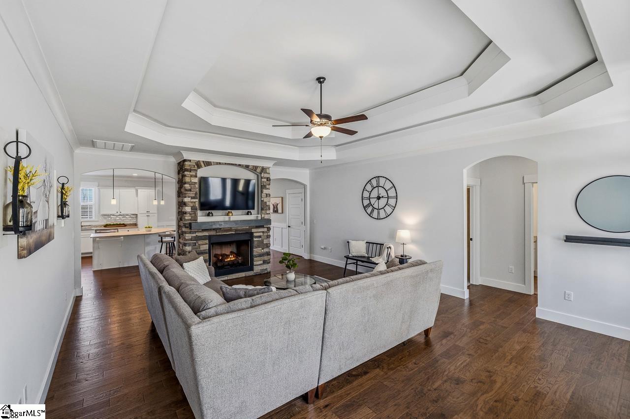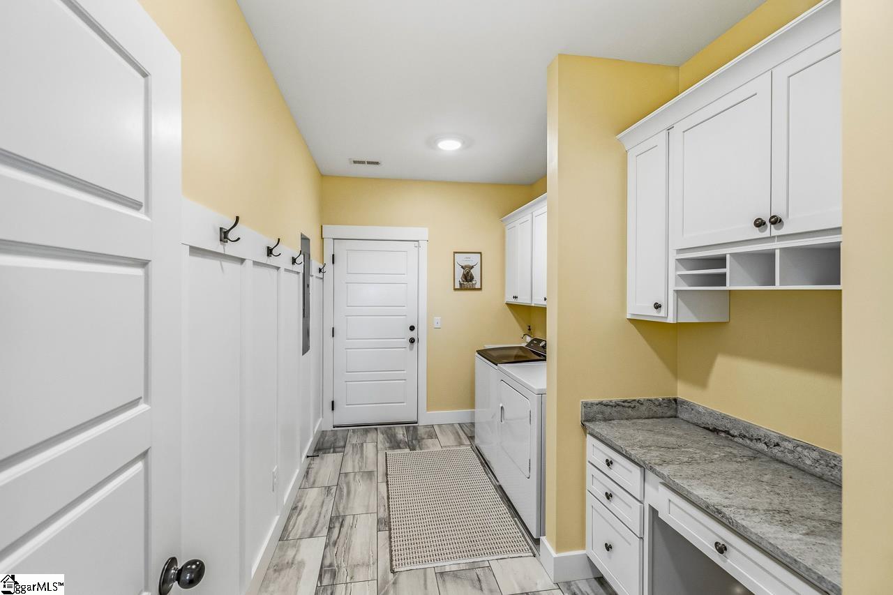 Nestled against a serene, wooded backdrop on an expansive lot, this meticulously designed home offers the ultimate tranquil retreat without sacrificing convenience. Perfectly positioned between Greenville and Spartanburg, this location allows for an effortless commute in either direction and easy access to shopping and restaurants. From the moment you step inside, it is clear that this home was thoughtfully designed for modern living, seamlessly blending functionality with elevated style. Premium upgrades and unparalleled craftsmanship make this residence a stand out choice. Upon entering, you will immediately notice the warm hardwood floors that flow through the main living area, the high ceilings, and the classic crown molding which has been beautifully accented throughout the majority of this home, creating a polished and cohesive feel. Designed for relaxation, the main level living room is enhanced with a stunning trey ceiling, soft accent lighting, and a cozy gas log fireplace creating the perfect setting for quiet nights in. The kitchen has been designed with crisp, white cabinetry, stainless steel appliances, and a generously sized island. This space flows seamlessly together with the dining area allowing plenty of space for everyday living or entertaining. Just off the main space, a versatile flex room with double glass doors and a closet offers the perfect setup for a home office, study, or an additional living area. Located just steps from the garage, a mudroom/laundry room combo maximizes efficiency with custom built-in cabinetry, a utility sink, and a dedicated workspace perfect for a drop zone or laundry folding. The spacious primary suite acts as your private retreat complete with trey ceiling, accent lighting, dual closets, and a well-appointed bath featuring a jetted tub, separate tiled shower, and double vanities. Enjoy a peaceful split-bedroom layout, with two secondary bedrooms positioned on the opposite side of the home allowing for maximum privacy. The finished basement, complete with luxury vinyl flooring, crown molding, ceiling fan, and recessed lighting, provides a spacious recreation area perfect for entertaining a few friends or a large group. The sliding glass door brings in plenty of light and leads directly to the backyard patio. An oversized guest bedroom and full bath finish out the space. The unfinished area of the basement is extremely large and can be used as storage, a workshop, home gym, or future expansion. An oversized detached garage adds additional space for parking a large truck and still leaves plenty of room for the included work bench, lawn equipment or other recreational toys. Recent updates include a new 5 burner slide in range with air fry technology, a beautifully remodeled secondary bathroom shower completed just months ago, and custom closet shelving in the primary suite and two secondary bedrooms. With the home being built in 2020, enjoy the peace of mind that major systems and features remain modern and low maintenance. Schedule a showing to see this remarkable home today!