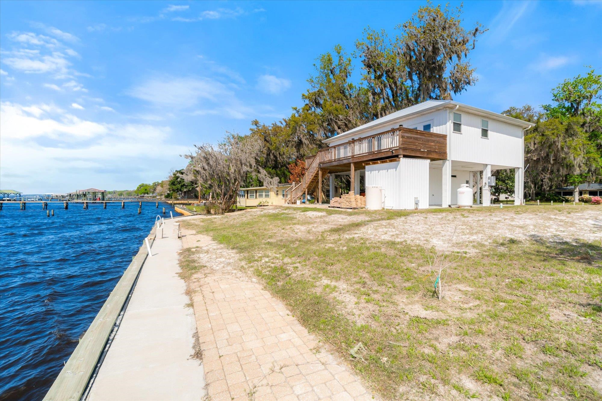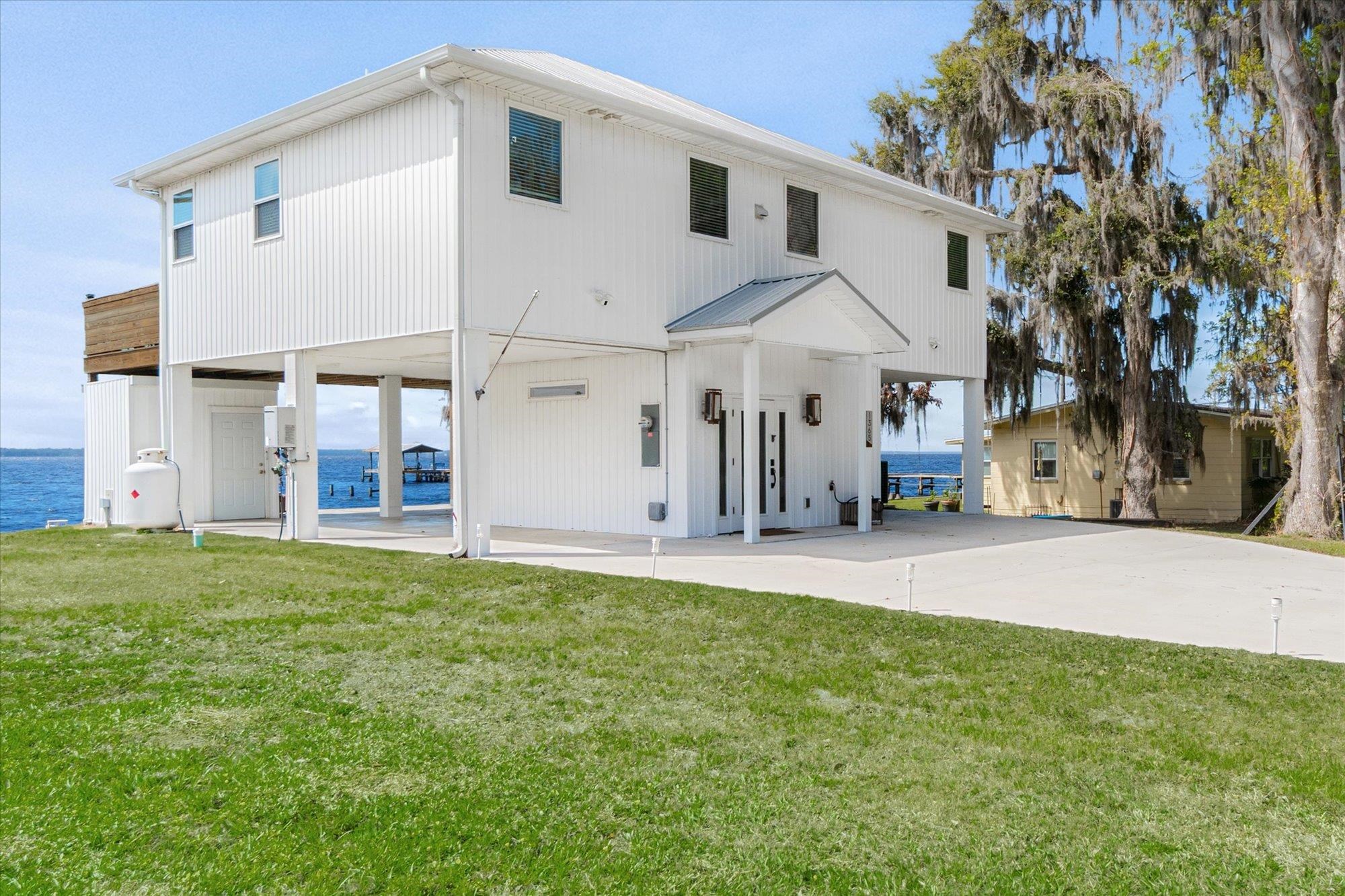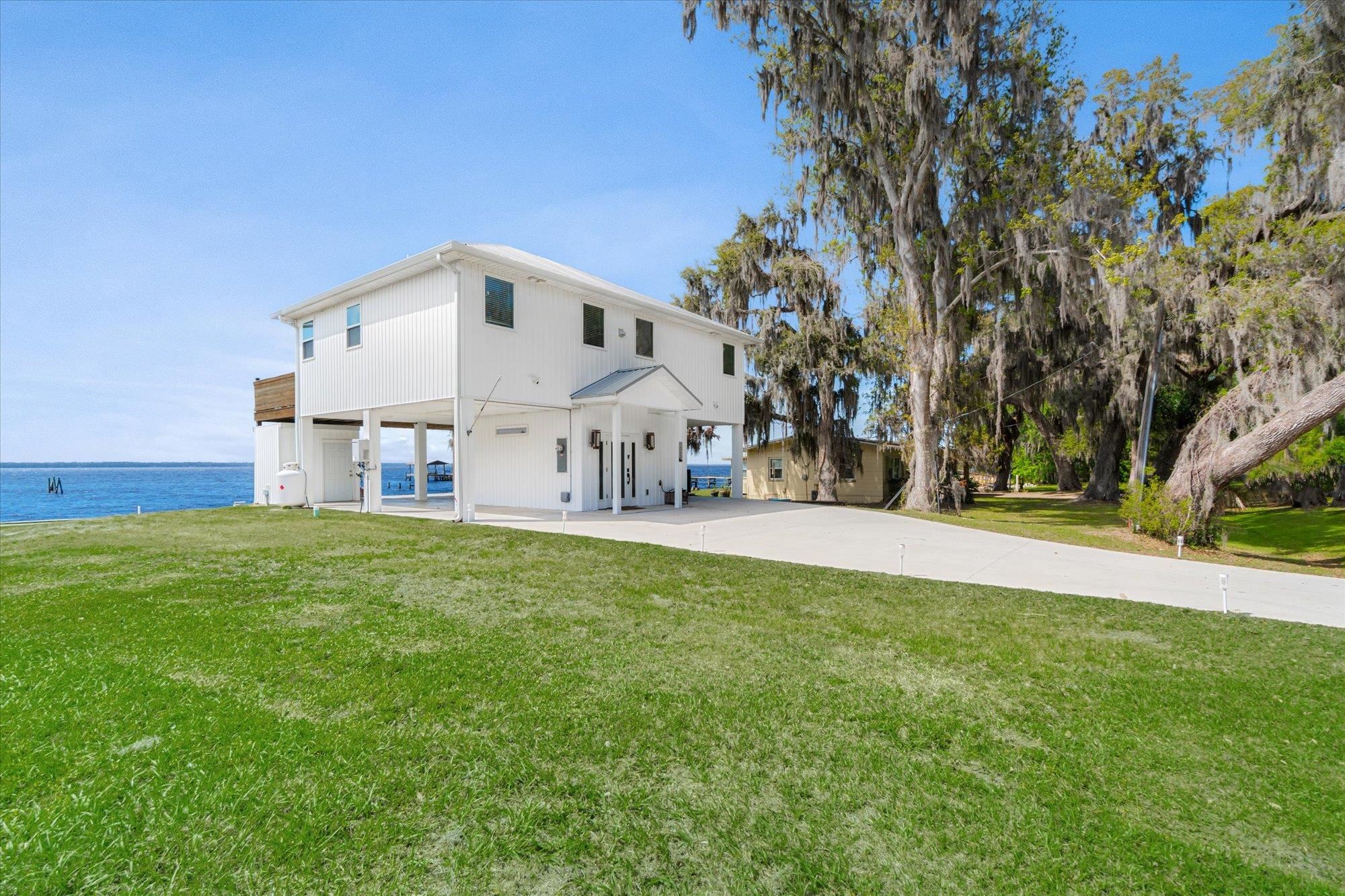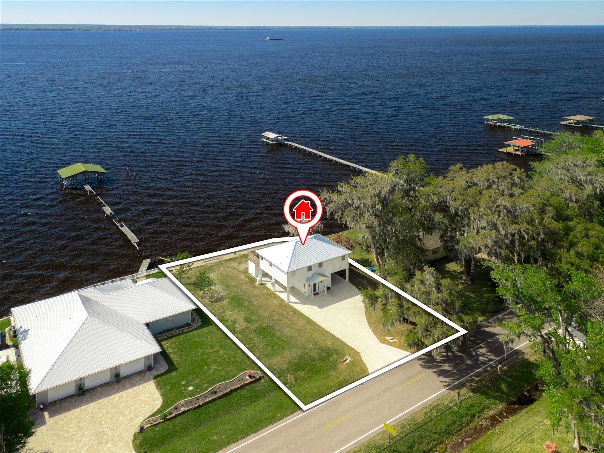 Welcome to your slice of riverfront paradise in St. Augustine! Built in 2024, this beautifully crafted home offers the perfect blend of modern construction and serene waterfront living along the scenic St. Johns River. Upon entry, you’ll find a convenient ground-level landing area complete with a laundry space and a half bathroom—perfect after a day spent outdoors. Head upstairs to a thoughtfully designed split floor plan featuring two spacious bedrooms, each with its own private en suite—ideal for comfort and privacy. Both bedrooms are enhanced by elegant double doors that open onto a sprawling deck, where you can unwind while taking in breathtaking river views and unforgettable sunsets. The main living space flows effortlessly from the kitchen, creating an inviting atmosphere for relaxing or entertaining. This property is built for enjoying the waterfront lifestyle, with a brand-new seawall installed in 2024 and paver stones guiding you to the bulkhead, where you can fish, boat, or simply soak in the tranquil surroundings. Additional storage is abundant, including a shed located beneath the carport for all your tools, gear, and toys. Whether you’re searching for a full-time residence or a weekend retreat, this exceptional riverfront home offers the best of Florida living with modern peace of mind and unbeatable views.