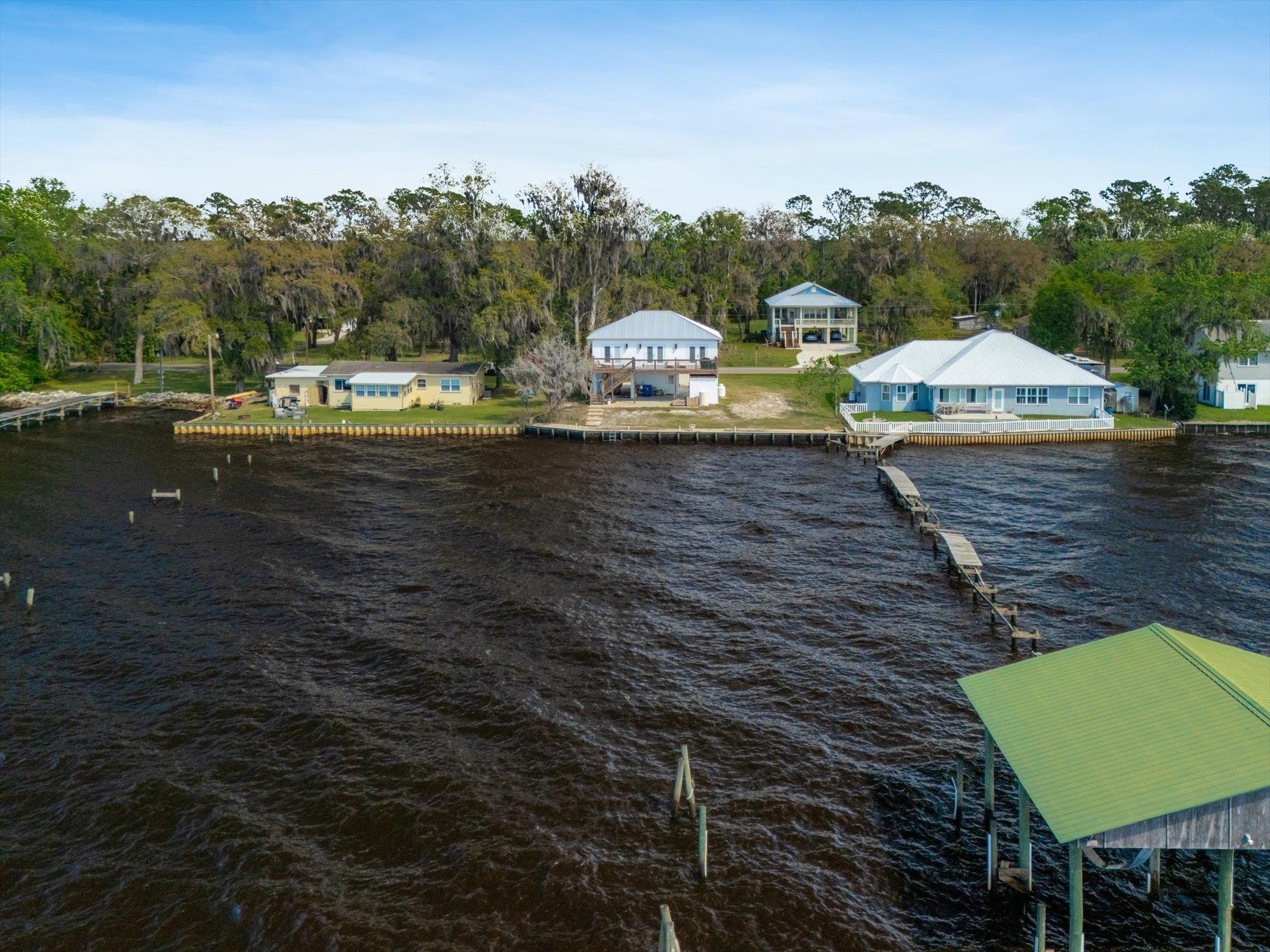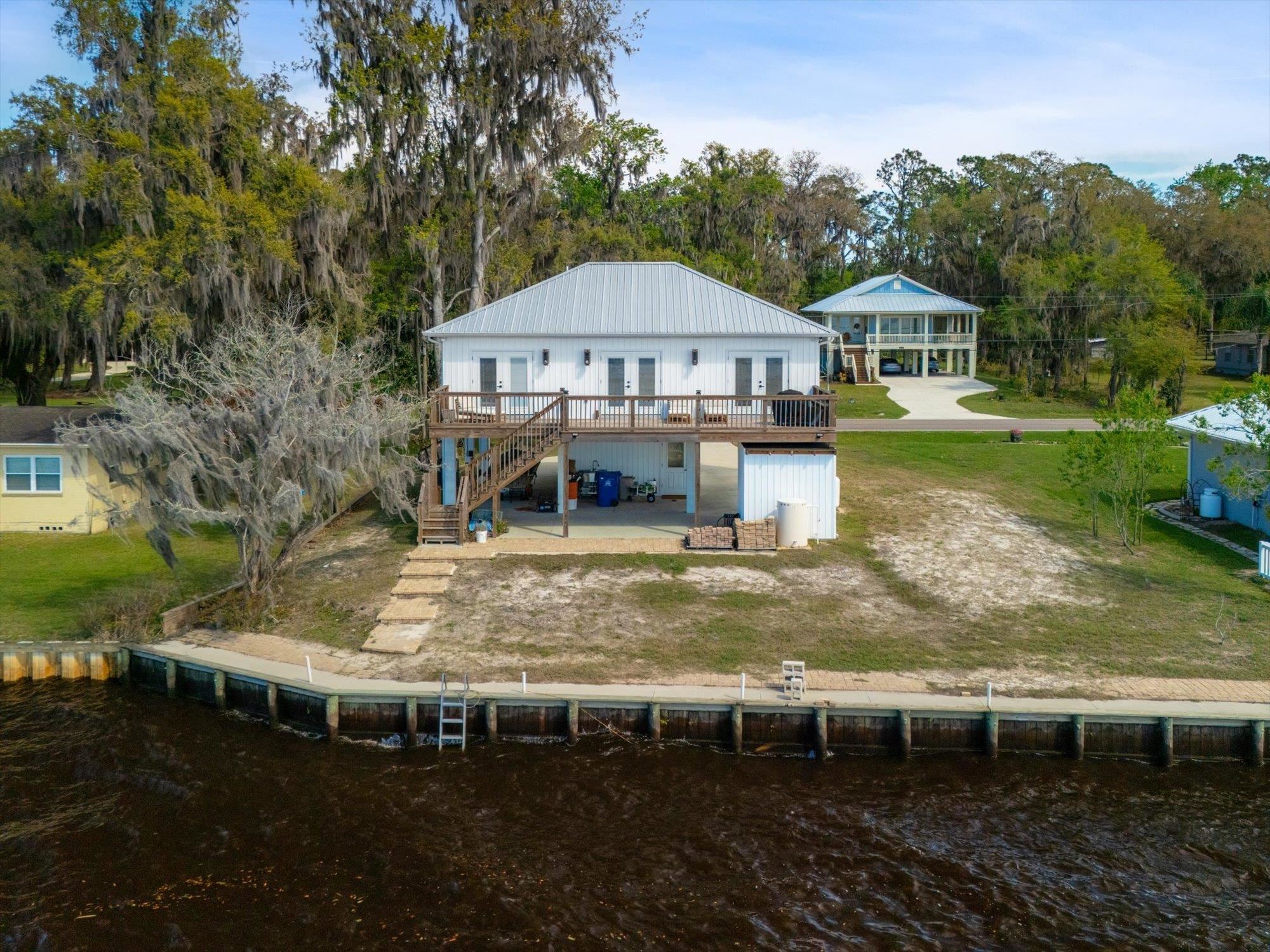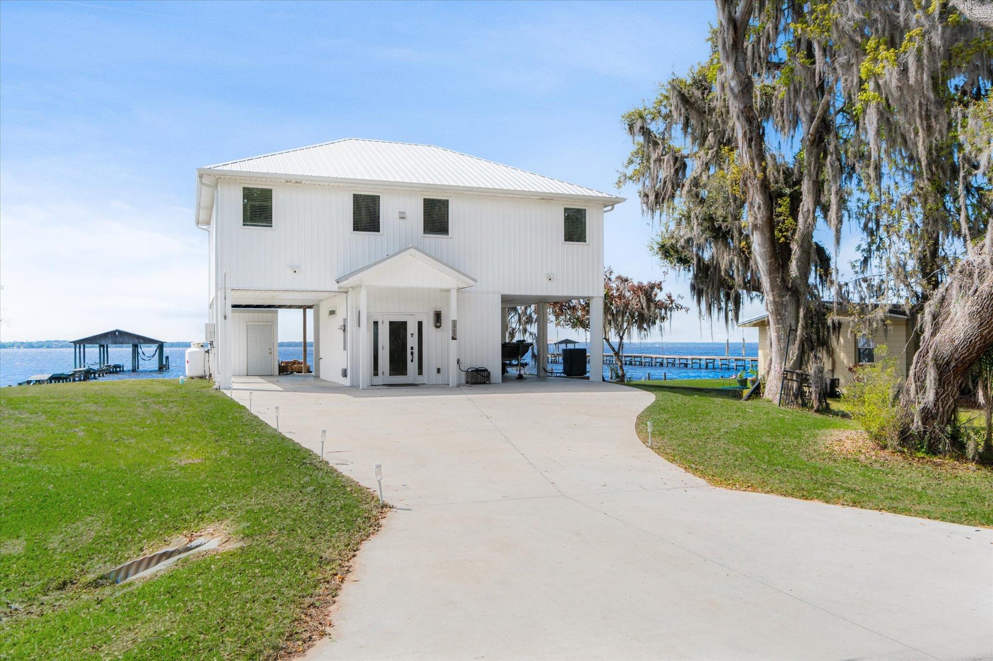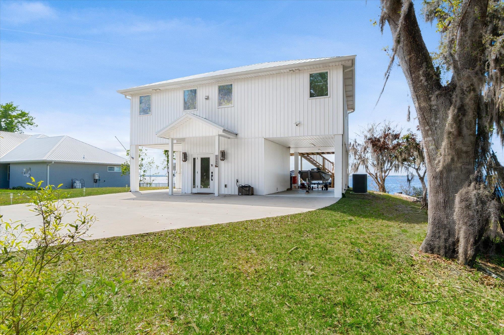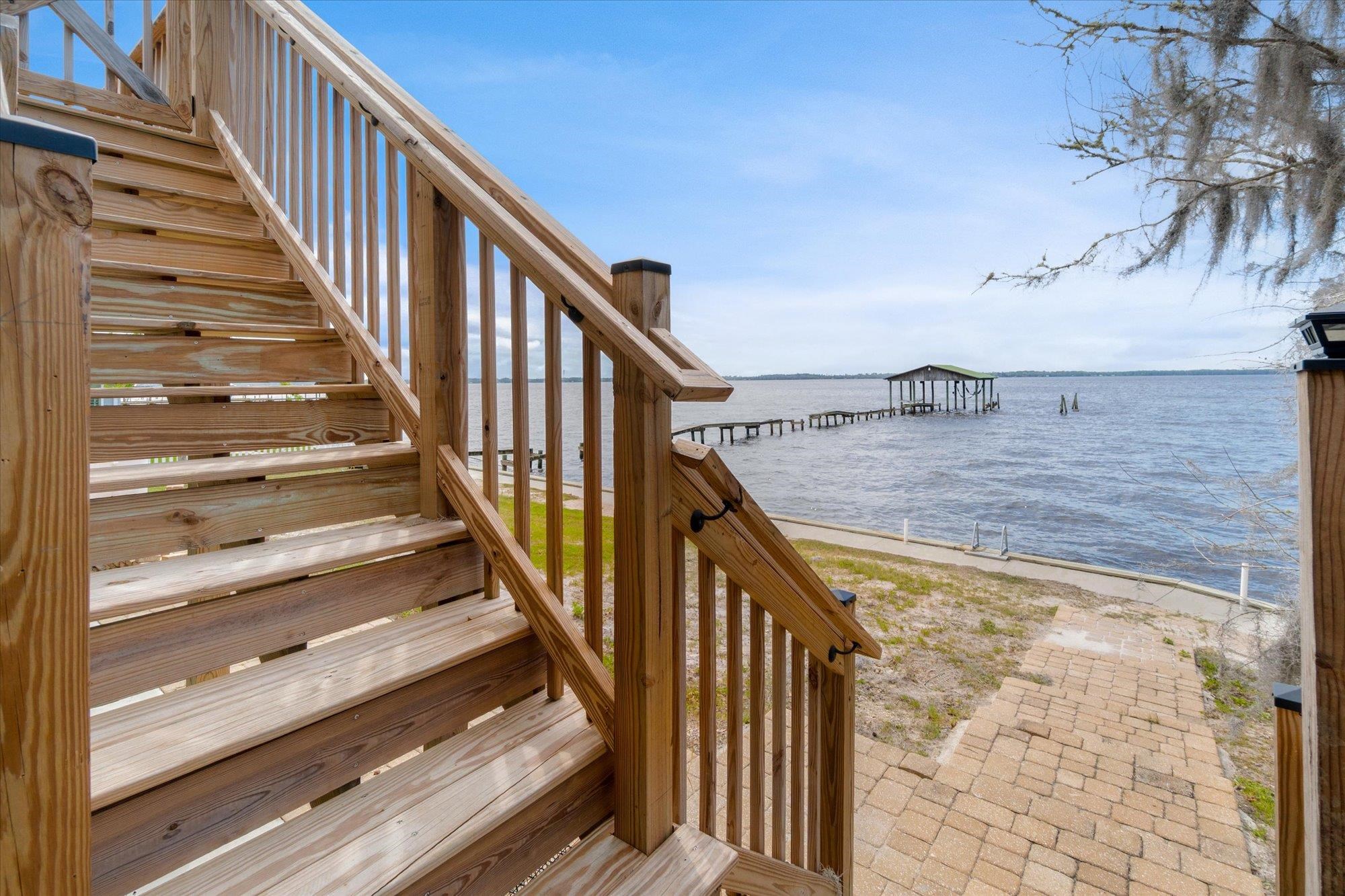 Welcome to your slice of riverfront paradise in St. Augustine! Built in 2024, this beautifully crafted home offers the perfect blend of modern construction and serene waterfront living along the scenic St. Johns River. Upon entry, you’ll find a convenient ground-level landing area complete with a laundry space and a half bathroom—perfect after a day spent outdoors. Head upstairs to a thoughtfully designed split floor plan featuring two spacious bedrooms, each with its own private en suite—ideal for comfort and privacy. Both bedrooms are enhanced by elegant double doors that open onto a sprawling deck, where you can unwind while taking in breathtaking river views and unforgettable sunsets. The main living space flows effortlessly from the kitchen, creating an inviting atmosphere for relaxing or entertaining. This property is built for enjoying the waterfront lifestyle, with a brand-new seawall installed in 2024 and paver stones guiding you to the bulkhead, where you can fish, boat, or simply soak in the tranquil surroundings. Additional storage is abundant, including a shed located beneath the carport for all your tools, gear, and toys. Whether you’re searching for a full-time residence or a weekend retreat, this exceptional riverfront home offers the best of Florida living with modern peace of mind and unbeatable views.