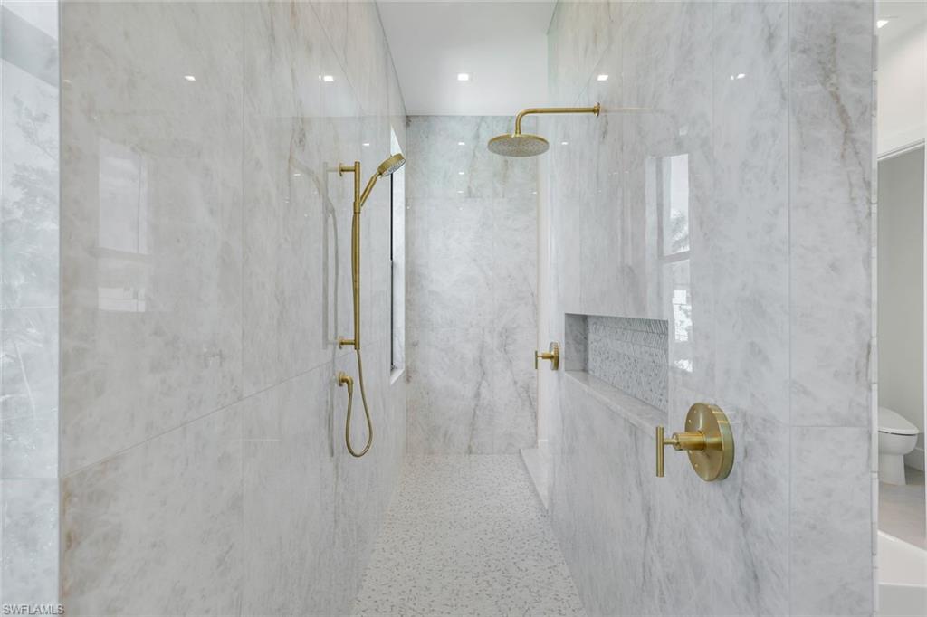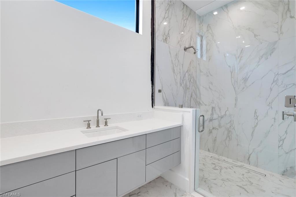 Outdoor living is designed to impress, with a covered lanai featuring a fully equipped summer kitchen and grilling station supported by a 1, 000-gallon propane gas tank. The backyard is a private retreat with a 14x28 custom pool, integrated sun shelf, and six-foot spa. The property is professionally landscaped with privacy in mind, creating a serene and secluded setting for relaxation and entertaining. Enjoy one of the most walkable coastal locations in North Naples, where you are just a short stroll to the beach for morning walks, sunset views, and everyday access to the Gulf. Close proximity to premier shopping, dining, and entertainment enhances the ease of living in this exceptional location. This is coastal luxury designed for both elegance and everyday livability.