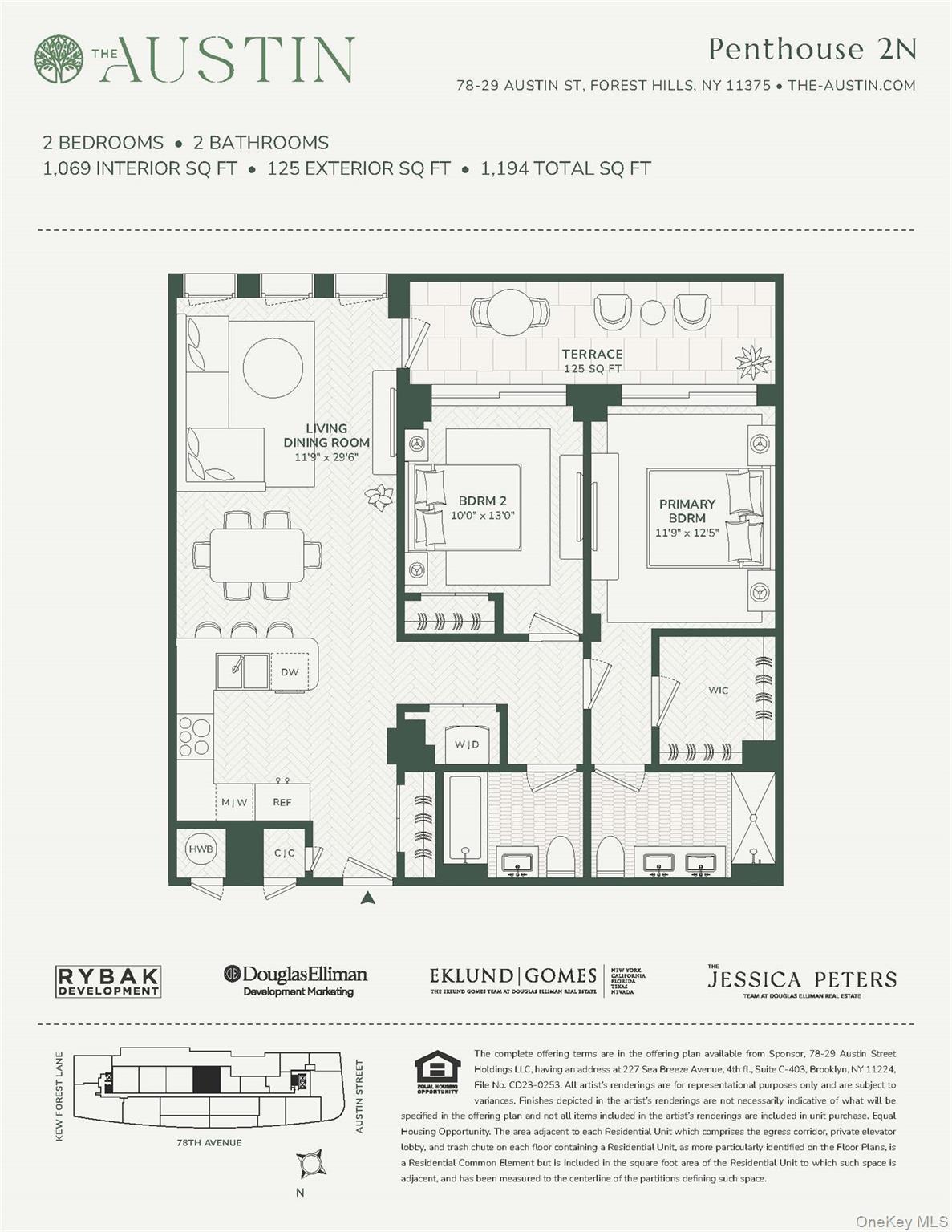 78-29 Austin Street Penthouse 2N Penthouse 2N is a remarkable two-bedroom, two-bathroom residence offering 1, 069 square feet of interior space, along with a 125-square-foot private terrace. With dramatic ceiling heights up to 10 feet tall, Penthouse 2N features interiors expertly designed by Italian firm S20M. White Oak herringbone wood floors and spectacular custom wall paneling run throughout the primary living spaces, while the gracious living room is punctuated with floor-to-ceiling triple glazed windows. The adjacent private terrace allows for true indoor / outdoor living. The custom Scavolini kitchen features a best-in-class integrated suite of Viking appliances, including an induction cooktop with Savalo marble hood, refrigerator, dishwasher, and microwave. Glass upper cabinets with undermount lighting are paired with Italian Calacatta marble countertops. The private primary bedroom suite features an expansive walk-in closet and a tranquil en-suite bath. Anchored by a dual Porcelanosa vanity, the primary bathroom is equipped with Robern medicine cabinets, designer wall sconces, and wall mounted Toto toilet. The separate secondary bedroom is provided with ample closet space and is adjacent to the secondary bathroom. Penthouse 2N is equipped with a vented washer and dryer and a dedicated entry closet, while the private concierge closet provides the ultimate convenience. Nestled in the charming Forest Hills neighborhood, The Austin is a remarkable collection of 98 condominium residences. A transformative new development where every detail is exquisitely designed from the ground up, The Austin transcends the condominium status quo with outstanding craftsmanship and world class amenities, surrounded by abundant tranquil green spaces. Spanning Austin Street to Kew Forest Lane, this offering rivals anything else found in Queens. The Austin offers a refined collection of resort-style amenities designed to enhance everyday living. Residents are welcomed by a full-time doorman and concierge, with inviting spaces including a residents’ lounge with garden views, a residents’ library, and a vibrant children’s playroom and music room. The state-of-the-art fitness center features cardio and strength equipment, a stretching studio, spa, and indoor basketball court. Two fully amenitized rooftop levels include an outdoor saltwater junior Olympic pool, pickleball court, outdoor cinema, and outdoor kitchen and dining areas with panoramic views of Manhattan and Queens. Additional conveniences include a live-in superintendent, pet spa, as well as private parking and private storage available for purchase. The complete offering terms are in the offering plan available from Sponsor, 78-29 Austin Street Holdings LLC, having an address at 227 Sea Breeze Avenue, 4th fl. , Suite C-403, Brooklyn, NY 11224, File No. CD23-0253. All artist’s renderings are for representational purposes only and are subject to variances. Finishes depicted in the artist’s renderings are not necessarily indicative of what will be specified in the offering plan and not all items included in the artist’s renderings are included in unit purchase. Equal Housing Opportunity.