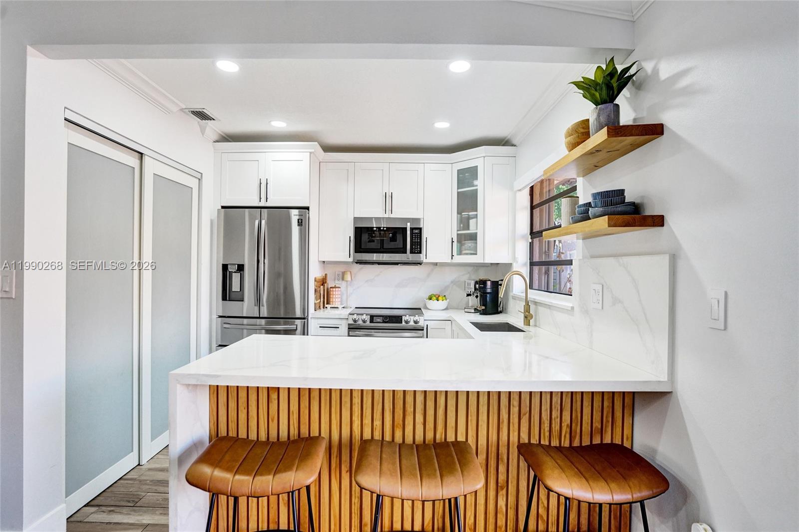 GORGEOUS VILLA W/2 BD, 2 BATHS, & DEN (EASY 3RD BDRM W/CLOSET & WINDOW). PERFECT FOREVER HOME OR STARTER HOME. RECENTLY REMODELED W/NEW KITCHEN CABINETS & QUARTZ COUNTERTOPS, STAINLESS STEEL DOUBLE DOOR REFRIGERATOR, SLIDE IN RANGE & WINE COOLER, NEW TILE FLOORING, OVERSIZE MASTER BDRM W/WALL TO WALL CLOSET AND NEWLY REMODELED MASTER BATH, MODERN ENTRY ROOM & CLOSET DOORS THROUGOUT THE HOME, UPDATED BASEBOARDS, NEWER CENTRAL A/C, TILE ROOF (2018), FULL SIZE WASHER & DRYER W/CABINET STORAGE, ACCORDIAN SHUTTERS, FENCED IN CONCRETE PATIO AREA W/CANOPY AWNING. TWO ASSIGNED PKG IN FRONT OF UNIT, LOCATED IN THE SOUGHT AFTER COMMUNITY OF FOREST LAKE. A+ SCHOOLS, LOW HOA DUES, PARK JUST MINUTES AWAY & MUCH MORE. MAKE IT MUST SEE!! EASY TO SHOW!