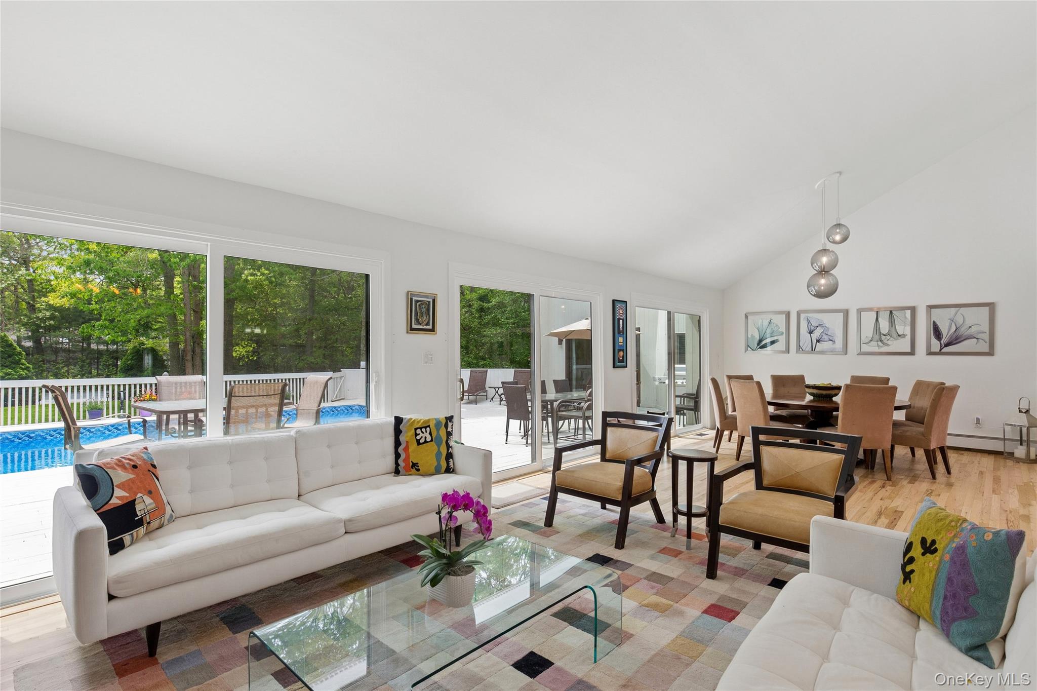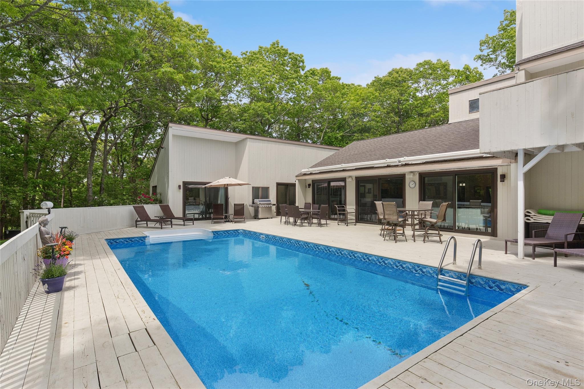 AVAILABLE- MD-LD $75, 000, JUNE $20, 000 JULY- $30, 000, AUG-LD $37, 500, OFF SEASON $4, 500 MONTHLY. POOL/TENNIS: RAVENSWOOD DEVELOPMENT -Spectacular 4 bedroom 3 1/2 bath contemporary with an open floor plan and expansive decking overlooking the heated pool/har tru tennis court and yard. The first floor includes a great room-living room/dining room/kitchen and dining nook. In addition, there is a separate living area for guests which includes a living room, bedroom with slider to the outdoor deck and full bath. Two additional bedrooms with a shared bath and separate powder room rounds out the first level. The second floor includes the primary ensuite bedroom with a separate living space/TV room, large bath, walk in closet and second story deck with steps to the first level pool area. Meticulously landscaped on a private one acre parcel. Close to East Landing Beach, ocean beaches, waterfront dining and shopping.
