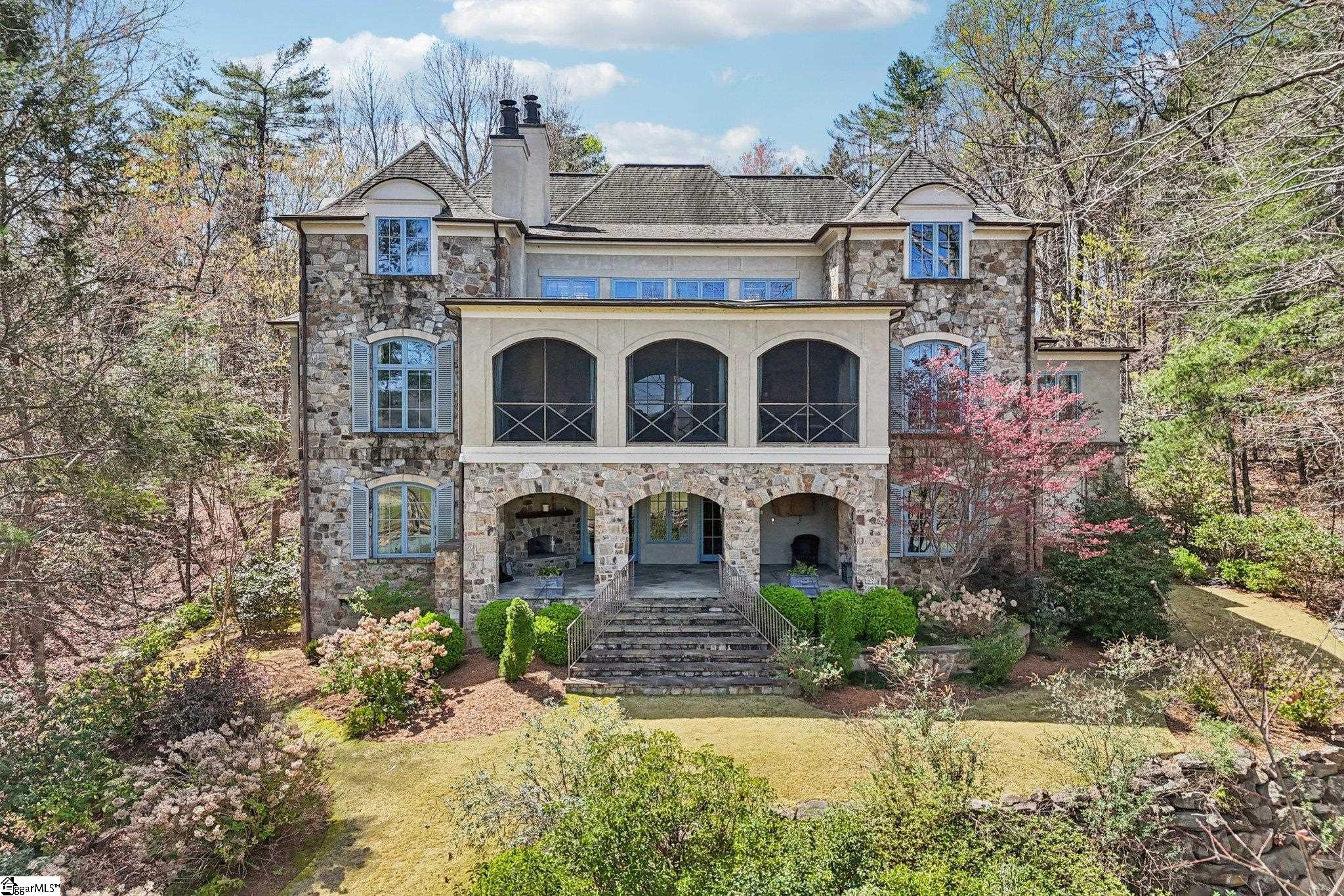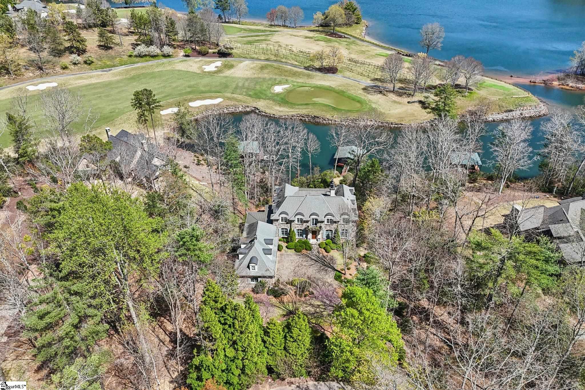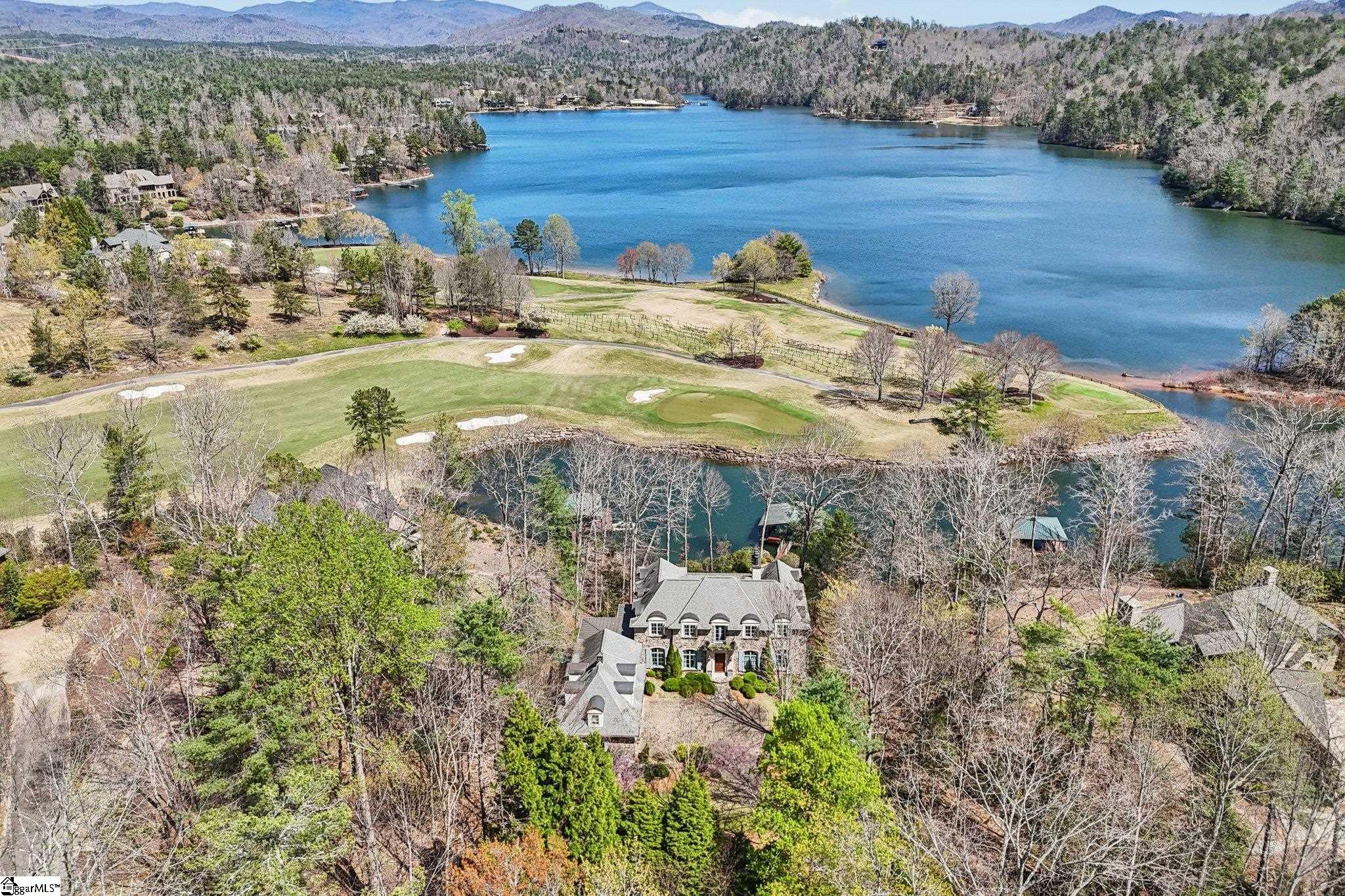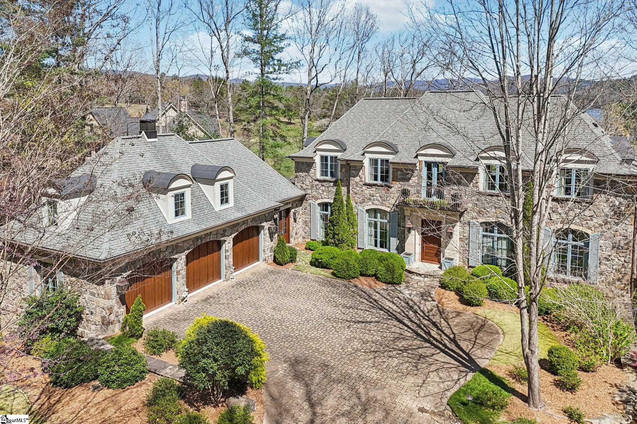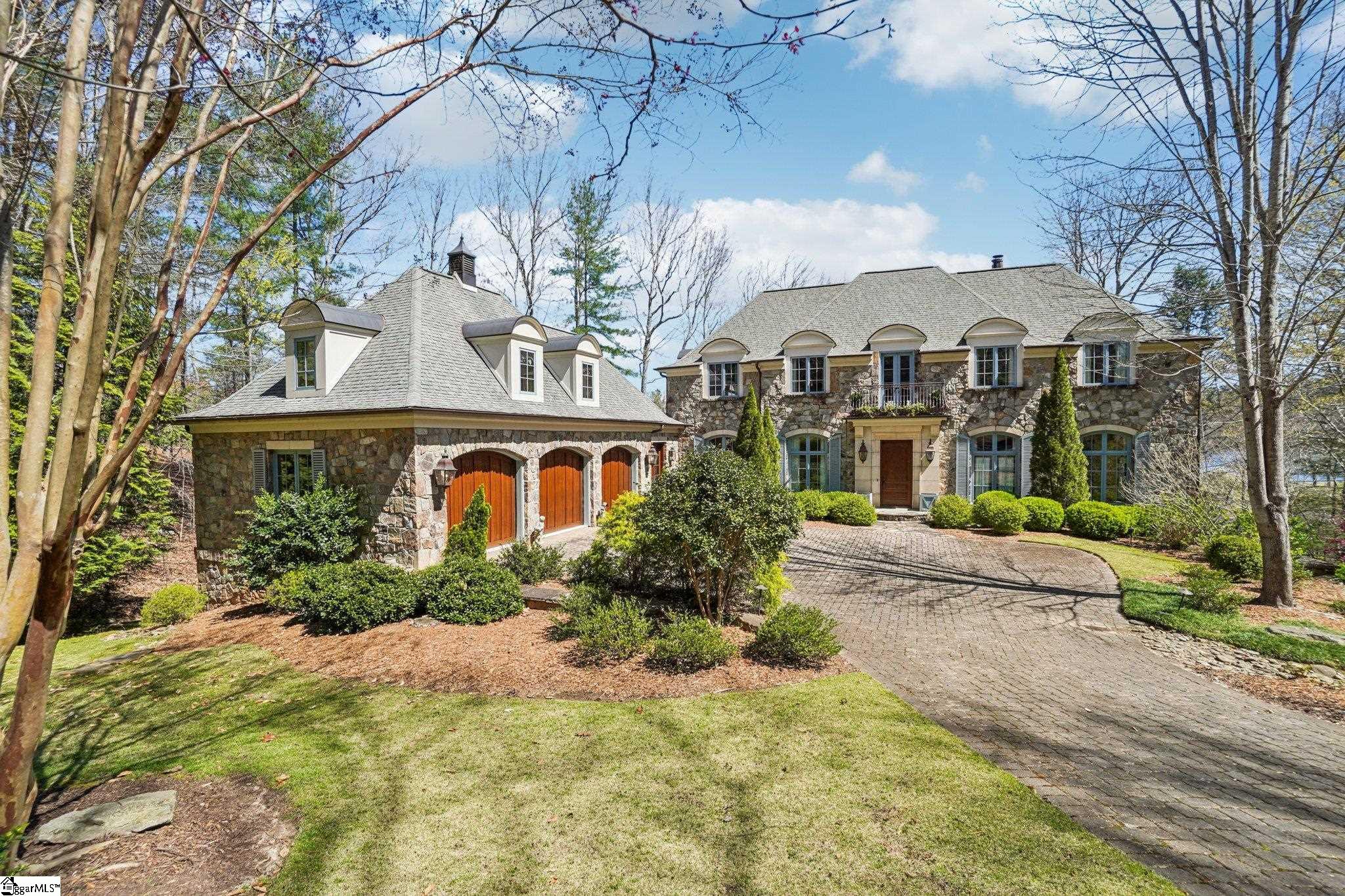 Elegance and exquisite taste are personified in this beautifully proportioned French Country lake home in an exclusive enclave of The Cliffs at Keowee Vineyards. Gentle topography and a plethora of high-canopied native trees frame the 9 bedroom home, served by 6 full bathrooms and one powder room. Views are multi-dimensional, including mountains, lake cove and channel, pristine state parkland, and the 4th green of the Tom Fazio golf course. The tranquil cove is just off the main channel, protecting boats and swimmers alike, whilst providing privacy. Set into the gracious stone façade, a handsome mahogany door opens into a contiguous living area, with beamed great room lit by Charleston lanterns, dining room, keeping room, and kitchen. Vaulted ceilings, clerestory windows, vast sliding doors to the screened outdoor living area, and a multitude of inner balconies and windows enhance the spacious atmosphere, while numerous European antique architectural elements add an essence of timelessness. The kitchen is flanked by the comfortable keeping room, and outfitted with a Dacor 6-burner gas range, double Dacor wall ovens, two apron farmhouse sinks, a walnut-topped island, and walk-in pantry. The generous screened porch readily accommodates dining and sitting areas on blue crab orchard stone, warmed by a gas-log limestone fireplace. In addition to four principally-sized suites are two darling double bedrooms, a charming bunk room at the lower level, and separate suite above the 3-car garage. The lake level media room opens to a blue flagstone patio delineated by zinc planters, with inset hot tub, grilling kitchen, and second outdoor fireplace. Also at this level are the bunk room, 9th bedroom, two full bathrooms, media room with billiards, a wet bar with ice machine, plenty of storage (including lake toy “garage”), and second laundry room with 3rd fridge and 2nd dishwasher. The home is professionally decorated, with sumptuous window treatments and thoughtful detailing throughout. Numerous impressive features include custom lighting fixtures (many of which are either antique or artisan-crafted from antiques), a home office with lake views, custom hand-wrought iron balusters, Grade 1 white oak flooring (a recent addition to the lower level), a two-slip boathouse, exterior gas lanterns, solid stone exterior, some 7, 000 square feet of custom designed and engineered living space, and superlative artistic sensitivity, in both plan and execution. This beautifully designed and masterfully constructed home is a Cliffs at Keowee Vineyards icon with recent that bely the home’s early 2000’s construction.