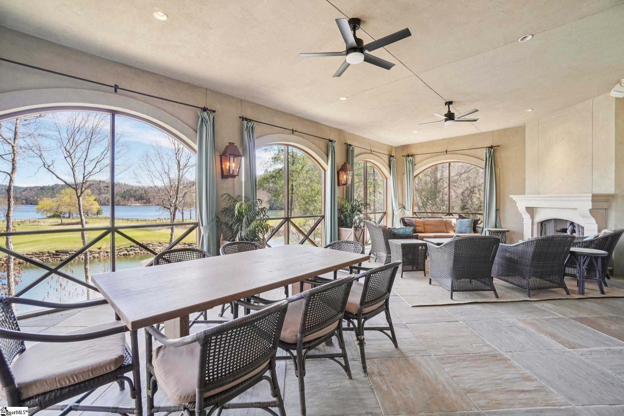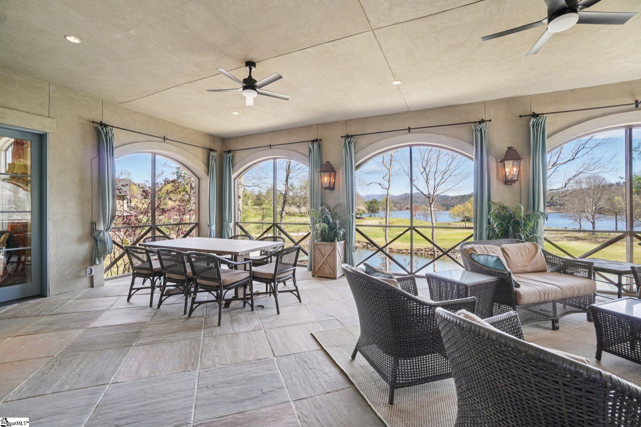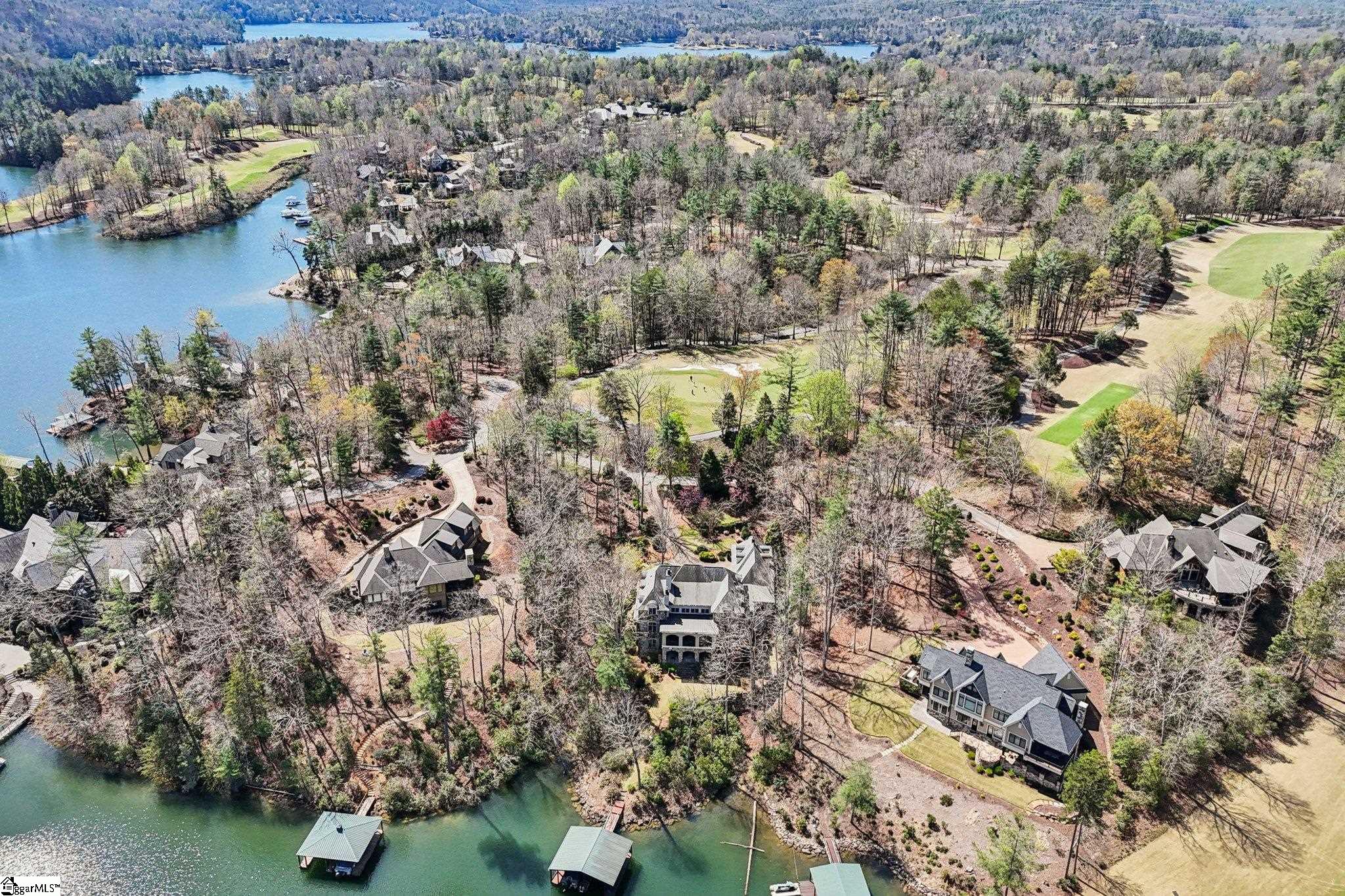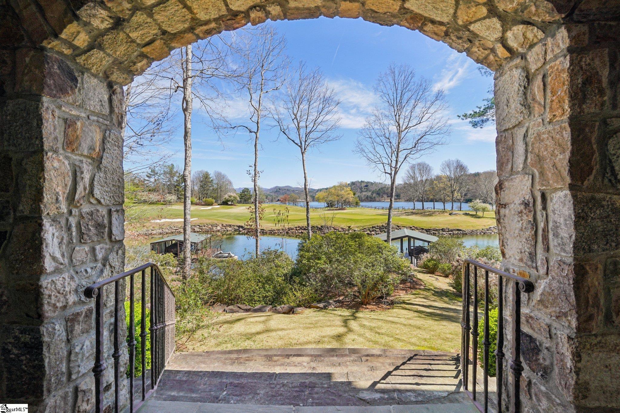 Elegance and exquisite taste are personified in this beautifully proportioned French Country lake home in an exclusive enclave of The Cliffs at Keowee Vineyards. Gentle topography and a plethora of high-canopied native trees frame the 9 bedroom home, served by 6 full bathrooms and one powder room. Views are multi-dimensional, including mountains, lake cove and channel, pristine state parkland, and the 4th green of the Tom Fazio golf course. The tranquil cove is just off the main channel, protecting boats and swimmers alike, whilst providing privacy. Set into the gracious stone façade, a handsome mahogany door opens into a contiguous living area, with beamed great room lit by Charleston lanterns, dining room, keeping room, and kitchen. Vaulted ceilings, clerestory windows, vast sliding doors to the screened outdoor living area, and a multitude of inner balconies and windows enhance the spacious atmosphere, while numerous European antique architectural elements add an essence of timelessness. The kitchen is flanked by the comfortable keeping room, and outfitted with a Dacor 6-burner gas range, double Dacor wall ovens, two apron farmhouse sinks, a walnut-topped island, and walk-in pantry. The generous screened porch readily accommodates dining and sitting areas on blue crab orchard stone, warmed by a gas-log limestone fireplace. In addition to four principally-sized suites are two darling double bedrooms, a charming bunk room at the lower level, and separate suite above the 3-car garage. The lake level media room opens to a blue flagstone patio delineated by zinc planters, with inset hot tub, grilling kitchen, and second outdoor fireplace. Also at this level are the bunk room, 9th bedroom, two full bathrooms, media room with billiards, a wet bar with ice machine, plenty of storage (including lake toy “garage”), and second laundry room with 3rd fridge and 2nd dishwasher. The home is professionally decorated, with sumptuous window treatments and thoughtful detailing throughout. Numerous impressive features include custom lighting fixtures (many of which are either antique or artisan-crafted from antiques), a home office with lake views, custom hand-wrought iron balusters, Grade 1 white oak flooring (a recent addition to the lower level), a two-slip boathouse, exterior gas lanterns, solid stone exterior, some 7, 000 square feet of custom designed and engineered living space, and superlative artistic sensitivity, in both plan and execution. This beautifully designed and masterfully constructed home is a Cliffs at Keowee Vineyards icon with recent that bely the home’s early 2000’s construction.