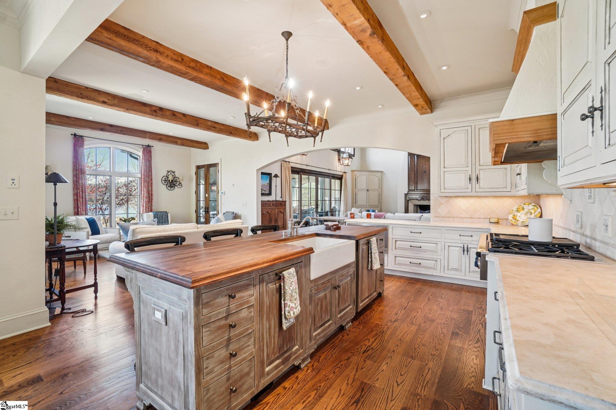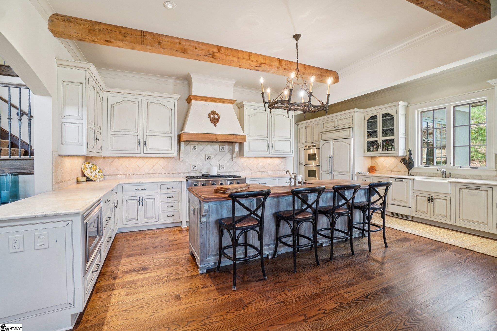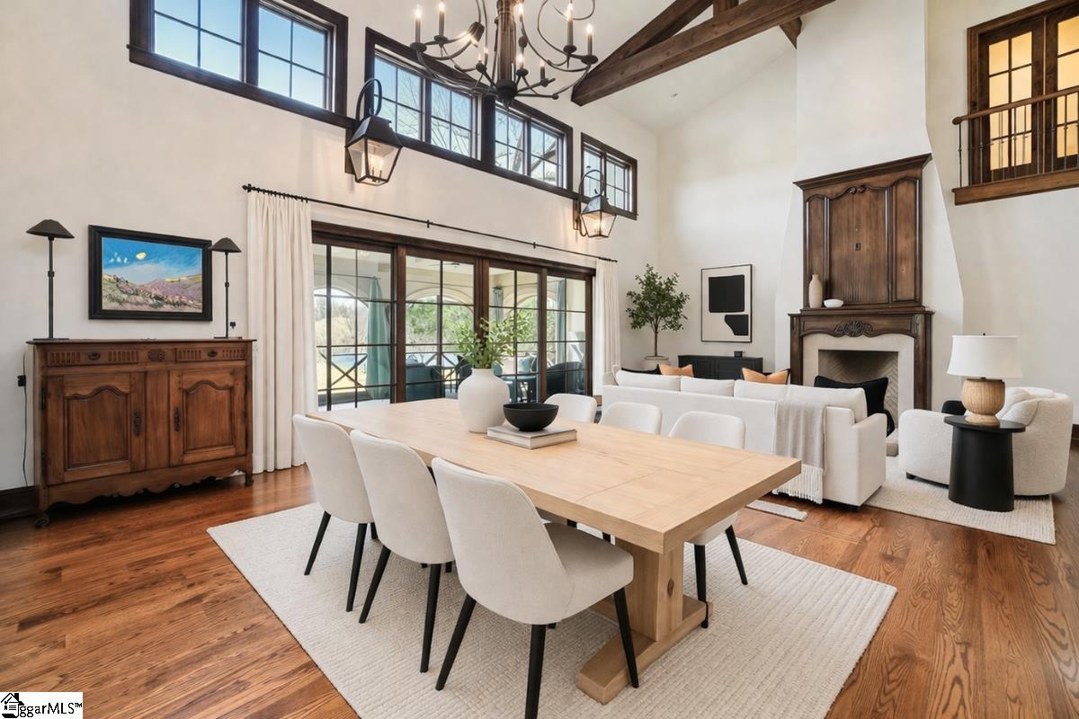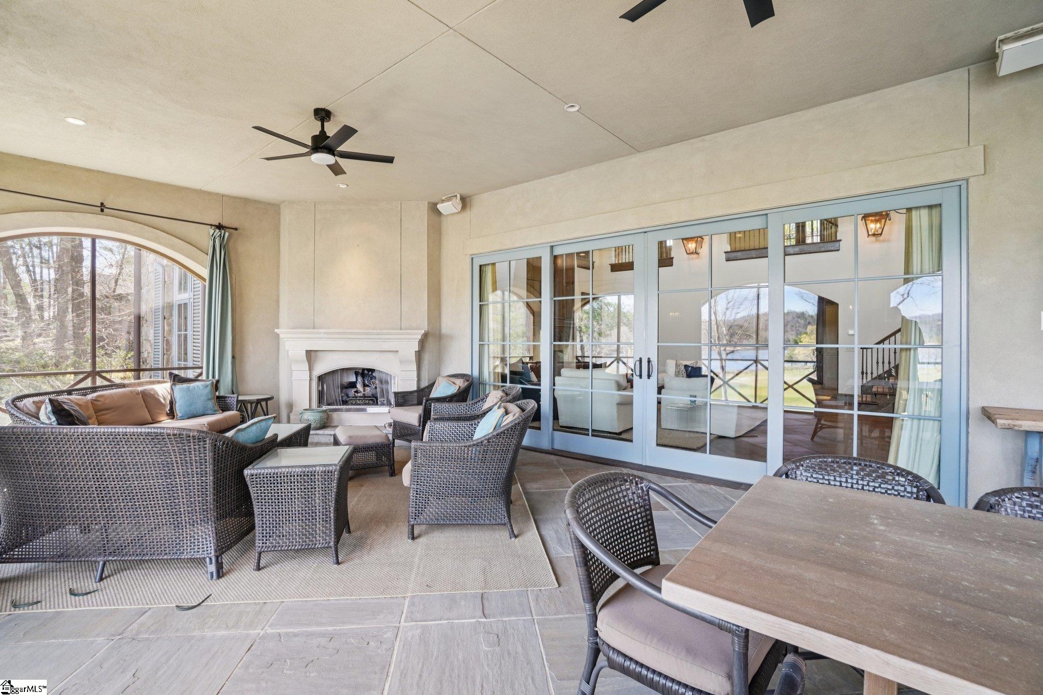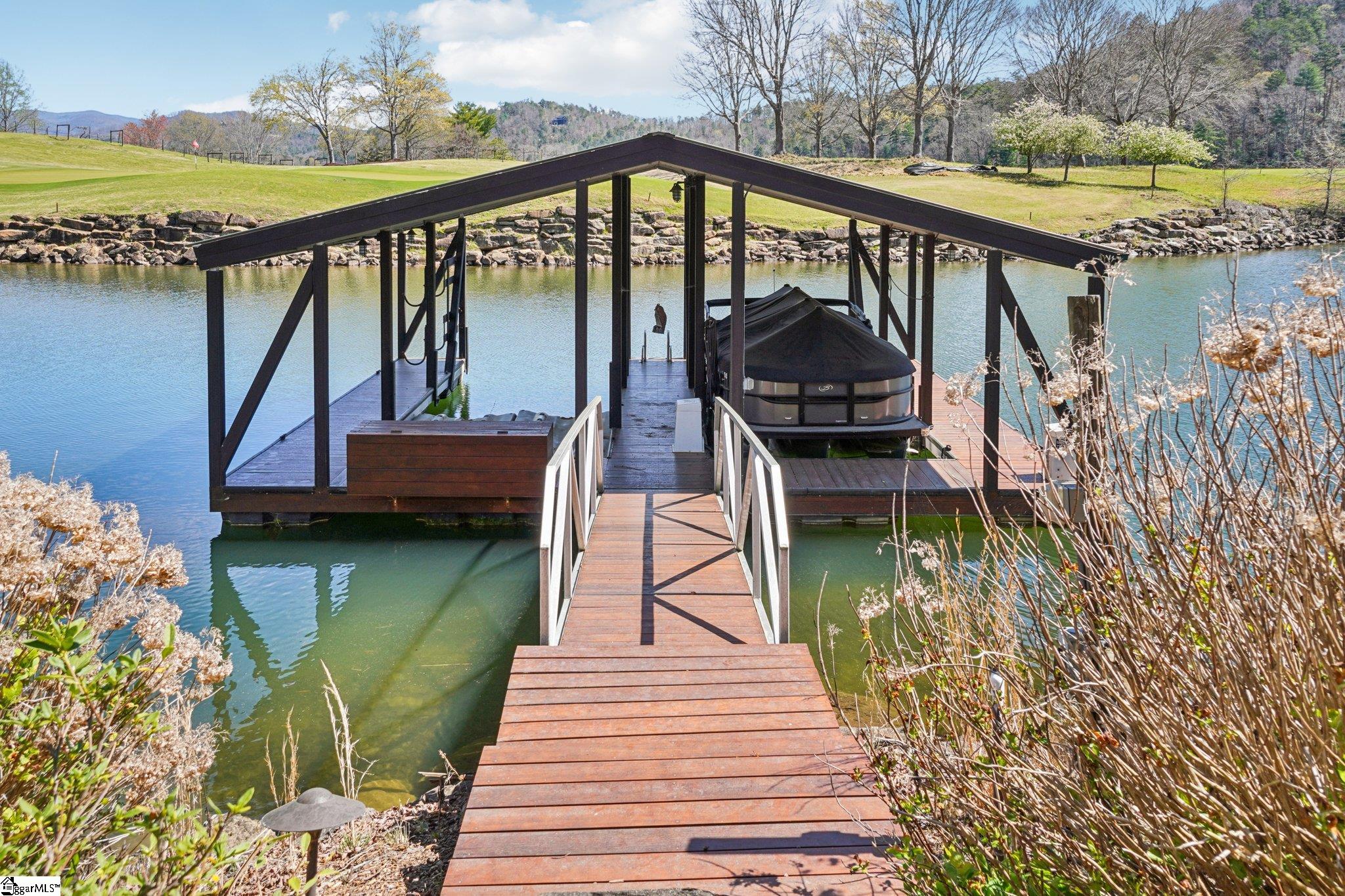 Elegance and exquisite taste are personified in this beautifully proportioned French Country lake home in an exclusive enclave of The Cliffs at Keowee Vineyards. Gentle topography and a plethora of high-canopied native trees frame the 9 bedroom home, served by 6 full bathrooms and one powder room. Views are multi-dimensional, including mountains, lake cove and channel, pristine state parkland, and the 4th green of the Tom Fazio golf course. The tranquil cove is just off the main channel, protecting boats and swimmers alike, whilst providing privacy. Set into the gracious stone façade, a handsome mahogany door opens into a contiguous living area, with beamed great room lit by Charleston lanterns, dining room, keeping room, and kitchen. Vaulted ceilings, clerestory windows, vast sliding doors to the screened outdoor living area, and a multitude of inner balconies and windows enhance the spacious atmosphere, while numerous European antique architectural elements add an essence of timelessness. The kitchen is flanked by the comfortable keeping room, and outfitted with a Dacor 6-burner gas range, double Dacor wall ovens, two apron farmhouse sinks, a walnut-topped island, and walk-in pantry. The generous screened porch readily accommodates dining and sitting areas on blue crab orchard stone, warmed by a gas-log limestone fireplace. In addition to four principally-sized suites are two darling double bedrooms, a charming bunk room at the lower level, and separate suite above the 3-car garage. The lake level media room opens to a blue flagstone patio delineated by zinc planters, with inset hot tub, grilling kitchen, and second outdoor fireplace. Also at this level are the bunk room, 9th bedroom, two full bathrooms, media room with billiards, a wet bar with ice machine, plenty of storage (including lake toy “garage”), and second laundry room with 3rd fridge and 2nd dishwasher. The home is professionally decorated, with sumptuous window treatments and thoughtful detailing throughout. Numerous impressive features include custom lighting fixtures (many of which are either antique or artisan-crafted from antiques), a home office with lake views, custom hand-wrought iron balusters, Grade 1 white oak flooring (a recent addition to the lower level), a two-slip boathouse, exterior gas lanterns, solid stone exterior, some 7, 000 square feet of custom designed and engineered living space, and superlative artistic sensitivity, in both plan and execution. This beautifully designed and masterfully constructed home is a Cliffs at Keowee Vineyards icon with recent that bely the home’s early 2000’s construction.