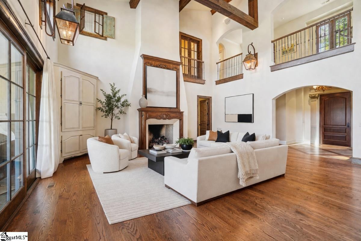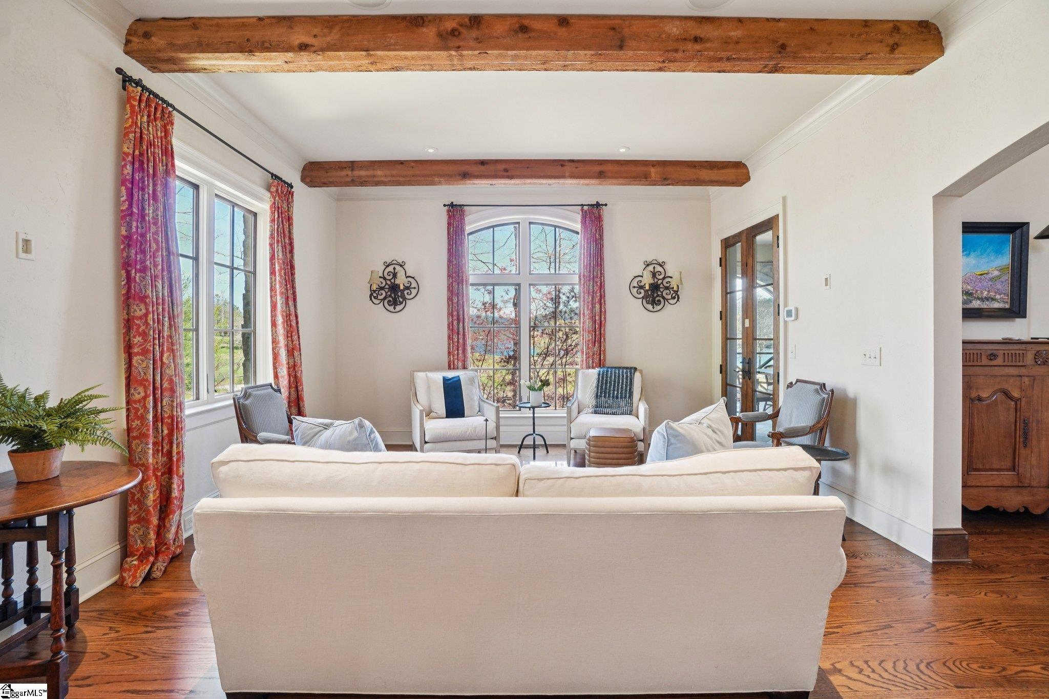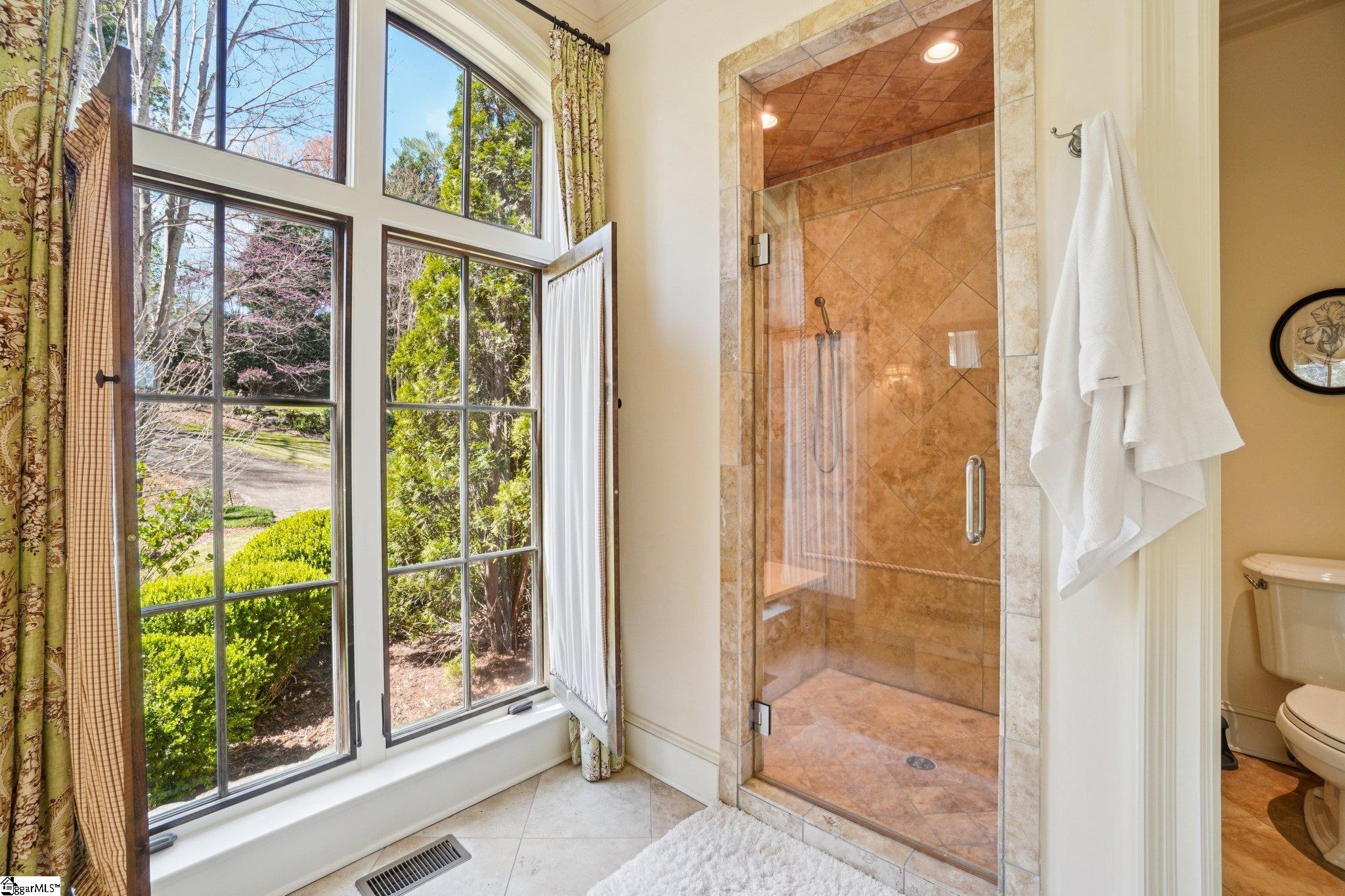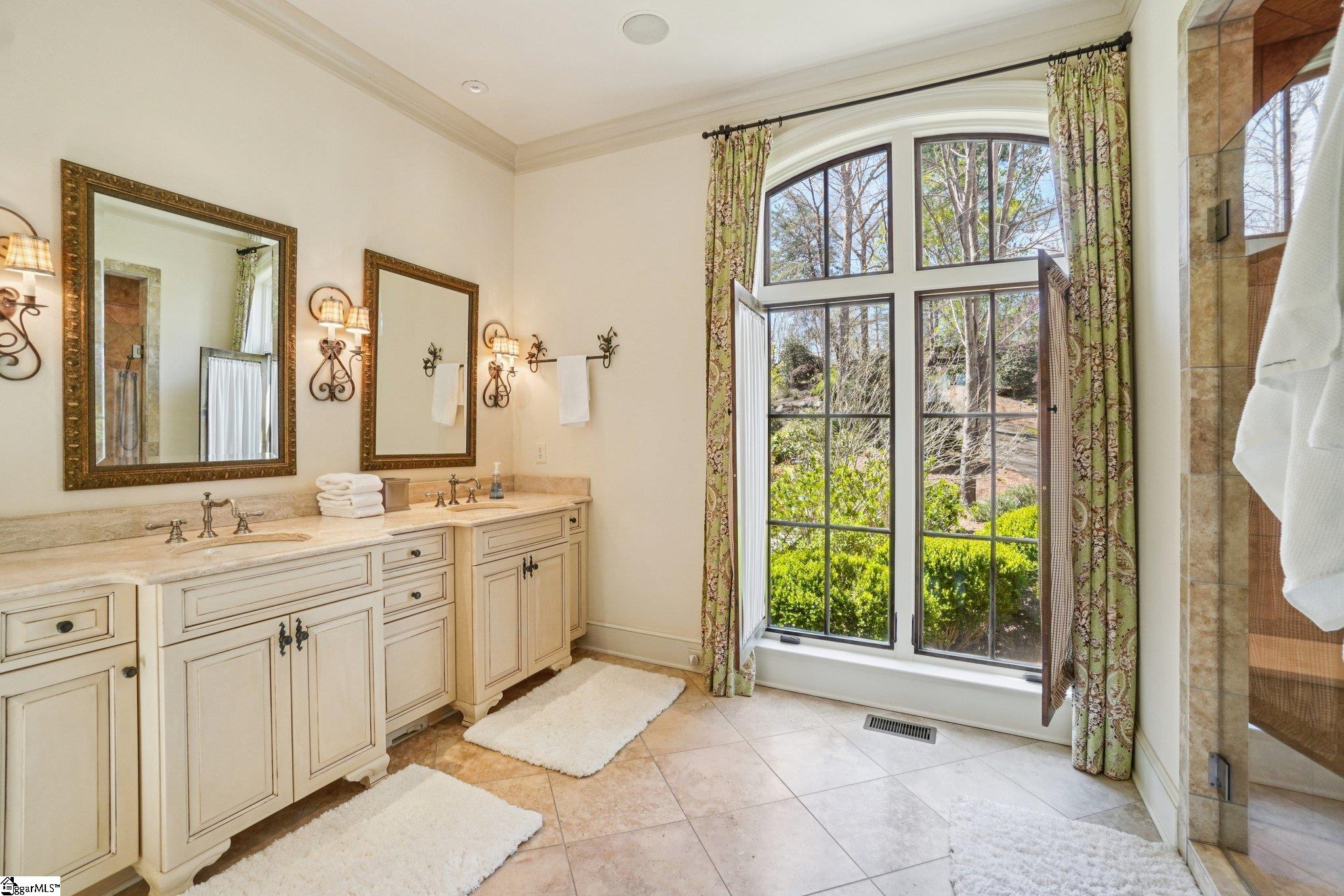 Elegance and exquisite taste are personified in this beautifully proportioned French Country lake home in an exclusive enclave of The Cliffs at Keowee Vineyards. Gentle topography and a plethora of high-canopied native trees frame the 9 bedroom home, served by 6 full bathrooms and one powder room. Views are multi-dimensional, including mountains, lake cove and channel, pristine state parkland, and the 4th green of the Tom Fazio golf course. The tranquil cove is just off the main channel, protecting boats and swimmers alike, whilst providing privacy. Set into the gracious stone façade, a handsome mahogany door opens into a contiguous living area, with beamed great room lit by Charleston lanterns, dining room, keeping room, and kitchen. Vaulted ceilings, clerestory windows, vast sliding doors to the screened outdoor living area, and a multitude of inner balconies and windows enhance the spacious atmosphere, while numerous European antique architectural elements add an essence of timelessness. The kitchen is flanked by the comfortable keeping room, and outfitted with a Dacor 6-burner gas range, double Dacor wall ovens, two apron farmhouse sinks, a walnut-topped island, and walk-in pantry. The generous screened porch readily accommodates dining and sitting areas on blue crab orchard stone, warmed by a gas-log limestone fireplace. In addition to four principally-sized suites are two darling double bedrooms, a charming bunk room at the lower level, and separate suite above the 3-car garage. The lake level media room opens to a blue flagstone patio delineated by zinc planters, with inset hot tub, grilling kitchen, and second outdoor fireplace. Also at this level are the bunk room, 9th bedroom, two full bathrooms, media room with billiards, a wet bar with ice machine, plenty of storage (including lake toy “garage”), and second laundry room with 3rd fridge and 2nd dishwasher. The home is professionally decorated, with sumptuous window treatments and thoughtful detailing throughout. Numerous impressive features include custom lighting fixtures (many of which are either antique or artisan-crafted from antiques), a home office with lake views, custom hand-wrought iron balusters, Grade 1 white oak flooring (a recent addition to the lower level), a two-slip boathouse, exterior gas lanterns, solid stone exterior, some 7, 000 square feet of custom designed and engineered living space, and superlative artistic sensitivity, in both plan and execution. This beautifully designed and masterfully constructed home is a Cliffs at Keowee Vineyards icon with recent that bely the home’s early 2000’s construction.