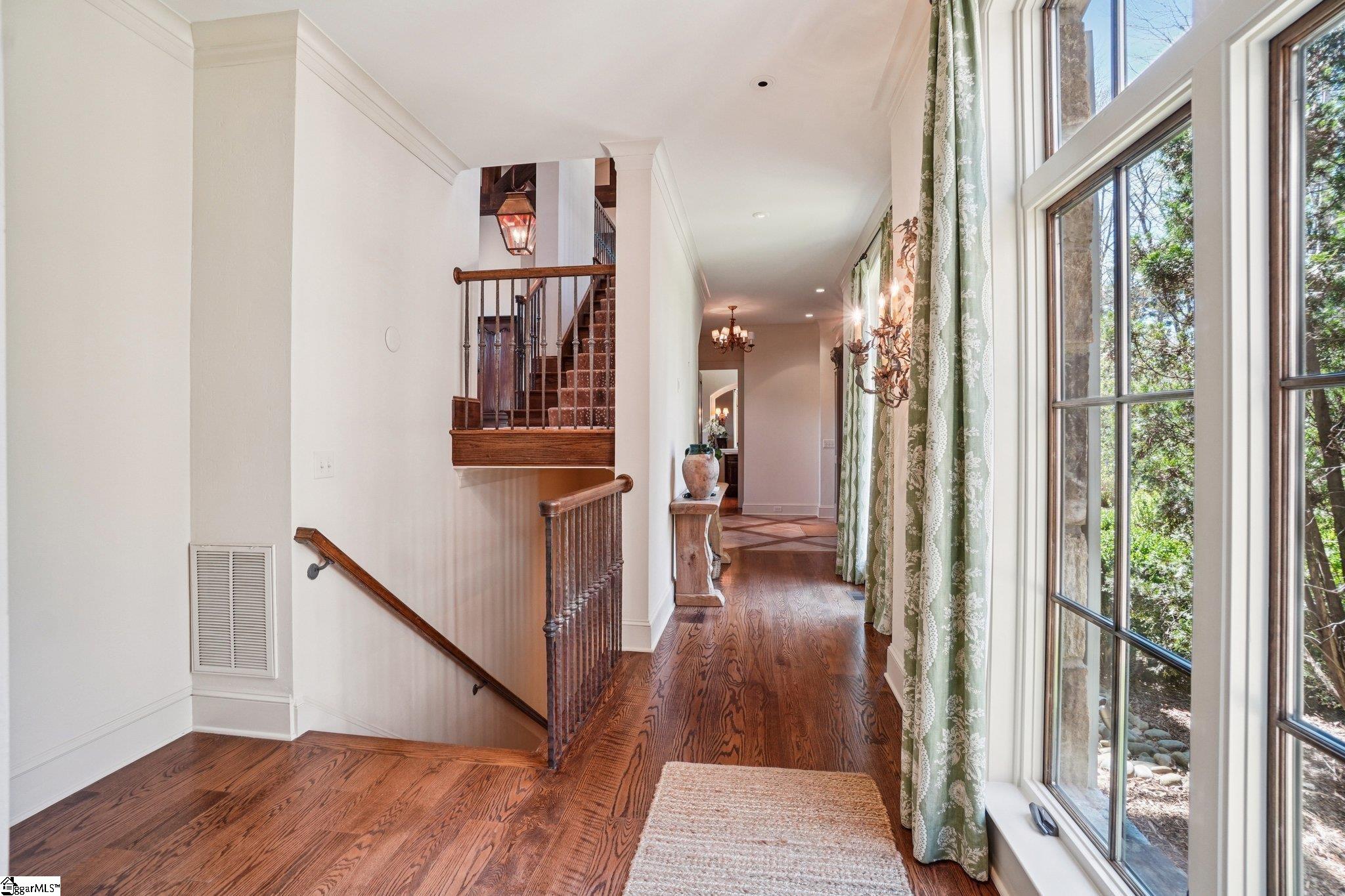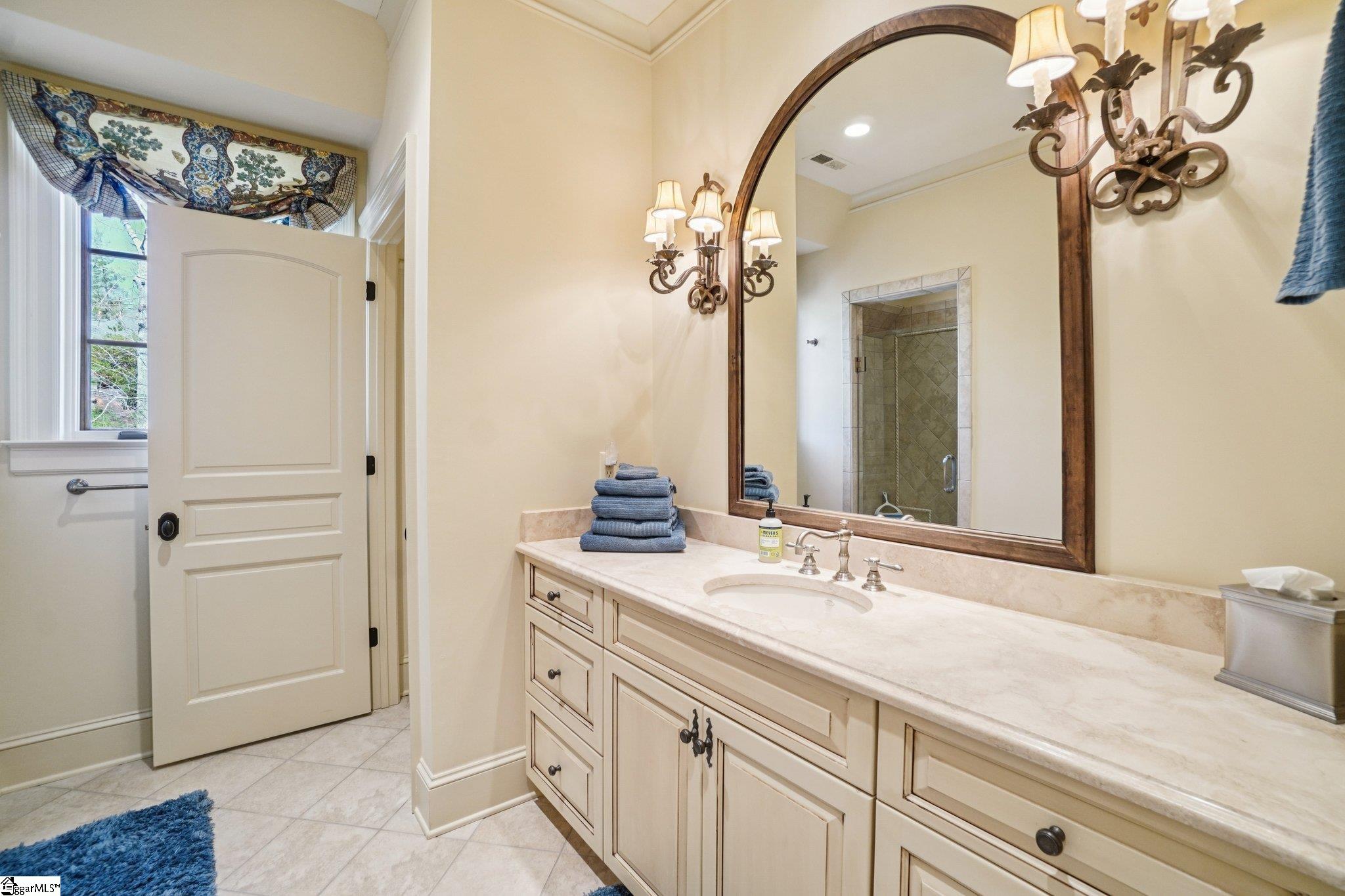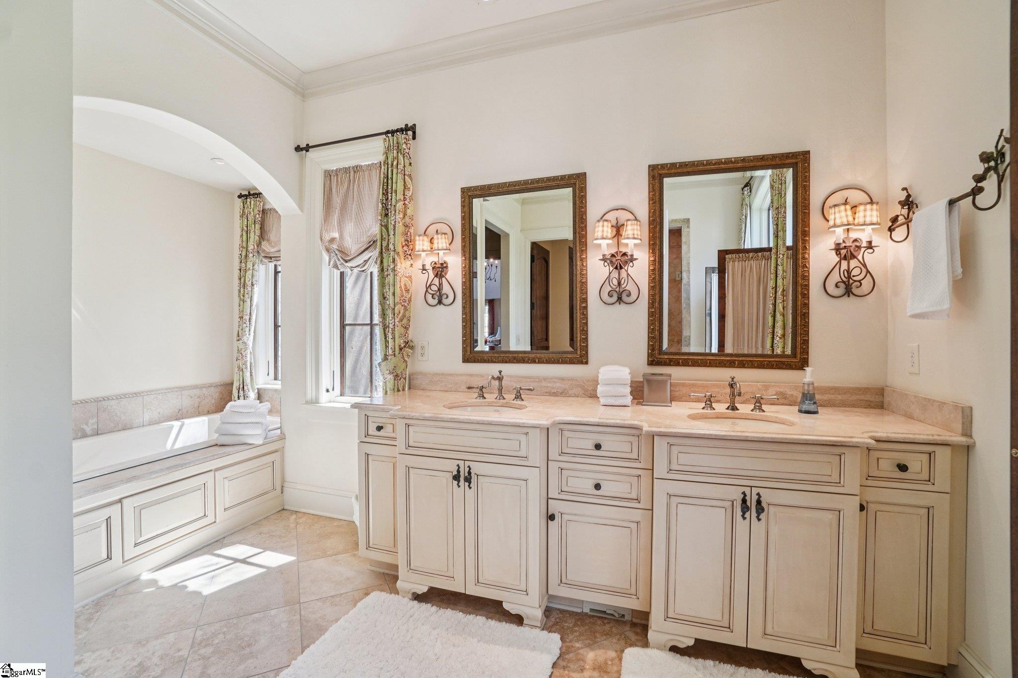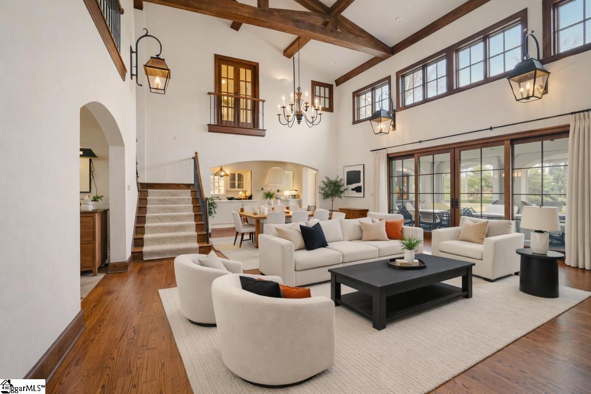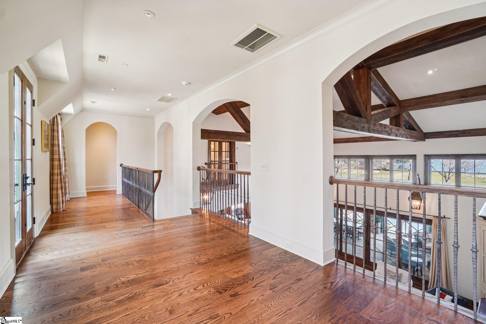 Elegance and exquisite taste are personified in this beautifully proportioned French Country lake home in an exclusive enclave of The Cliffs at Keowee Vineyards. Gentle topography and a plethora of high-canopied native trees frame the 9 bedroom home, served by 6 full bathrooms and one powder room. Views are multi-dimensional, including mountains, lake cove and channel, pristine state parkland, and the 4th green of the Tom Fazio golf course. The tranquil cove is just off the main channel, protecting boats and swimmers alike, whilst providing privacy. Set into the gracious stone façade, a handsome mahogany door opens into a contiguous living area, with beamed great room lit by Charleston lanterns, dining room, keeping room, and kitchen. Vaulted ceilings, clerestory windows, vast sliding doors to the screened outdoor living area, and a multitude of inner balconies and windows enhance the spacious atmosphere, while numerous European antique architectural elements add an essence of timelessness. The kitchen is flanked by the comfortable keeping room, and outfitted with a Dacor 6-burner gas range, double Dacor wall ovens, two apron farmhouse sinks, a walnut-topped island, and walk-in pantry. The generous screened porch readily accommodates dining and sitting areas on blue crab orchard stone, warmed by a gas-log limestone fireplace. In addition to four principally-sized suites are two darling double bedrooms, a charming bunk room at the lower level, and separate suite above the 3-car garage. The lake level media room opens to a blue flagstone patio delineated by zinc planters, with inset hot tub, grilling kitchen, and second outdoor fireplace. Also at this level are the bunk room, 9th bedroom, two full bathrooms, media room with billiards, a wet bar with ice machine, plenty of storage (including lake toy “garage”), and second laundry room with 3rd fridge and 2nd dishwasher. The home is professionally decorated, with sumptuous window treatments and thoughtful detailing throughout. Numerous impressive features include custom lighting fixtures (many of which are either antique or artisan-crafted from antiques), a home office with lake views, custom hand-wrought iron balusters, Grade 1 white oak flooring (a recent addition to the lower level), a two-slip boathouse, exterior gas lanterns, solid stone exterior, some 7, 000 square feet of custom designed and engineered living space, and superlative artistic sensitivity, in both plan and execution. This beautifully designed and masterfully constructed home is a Cliffs at Keowee Vineyards icon with recent that bely the home’s early 2000’s construction.