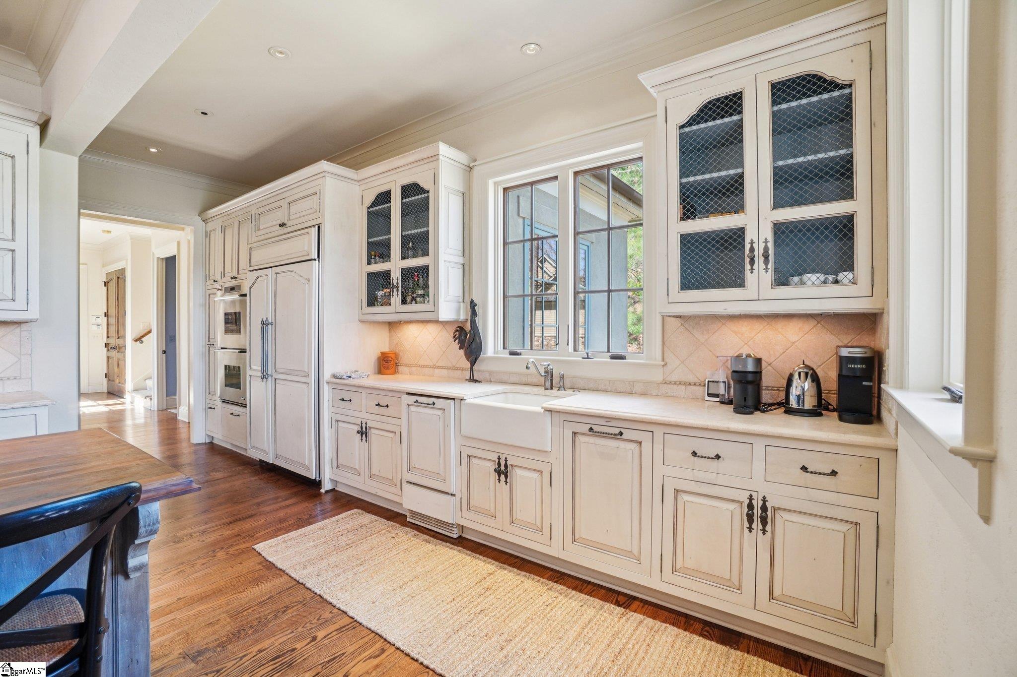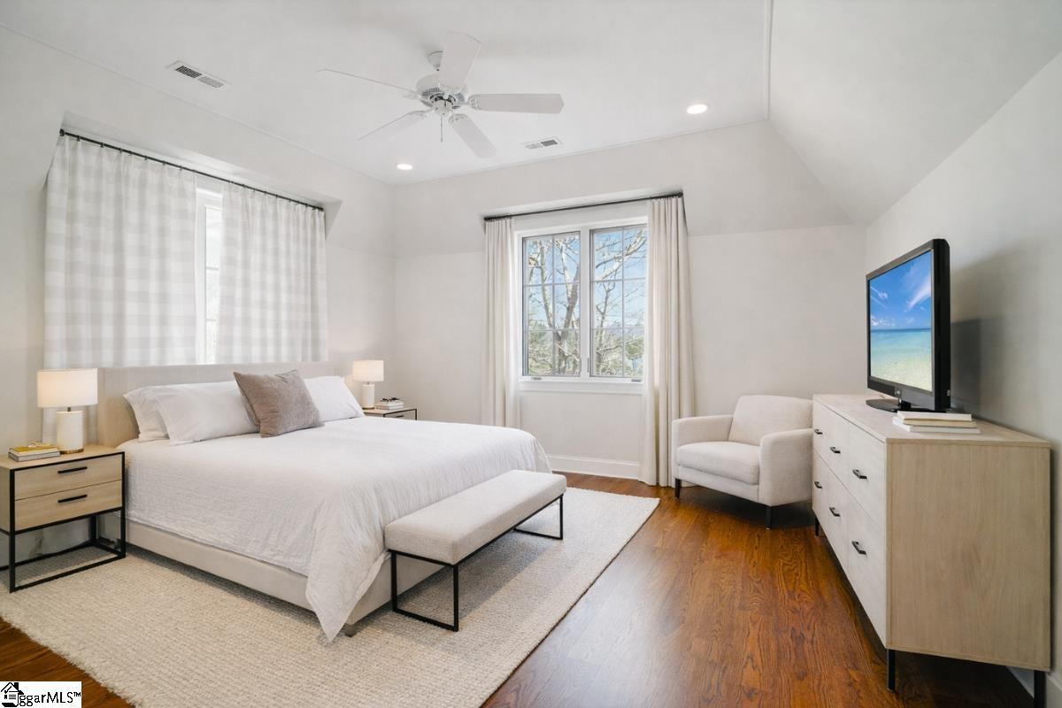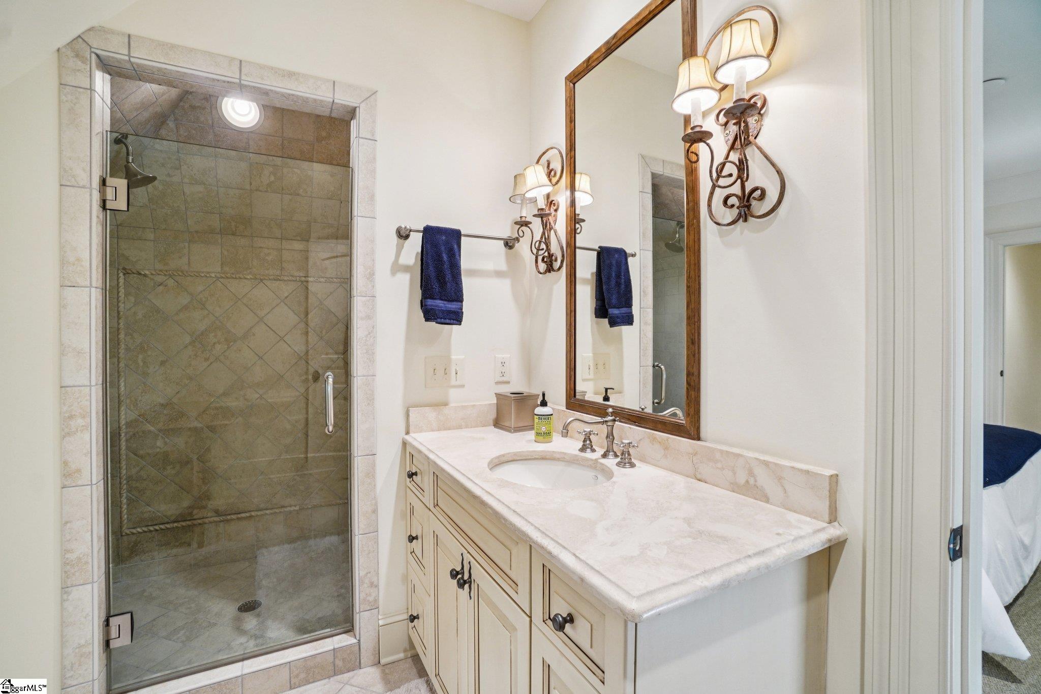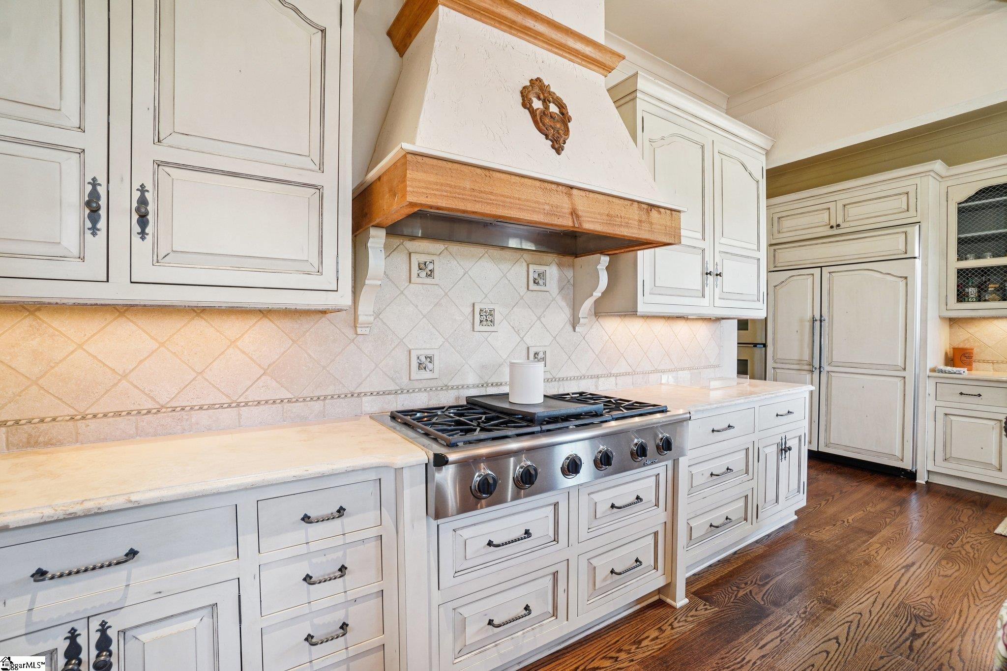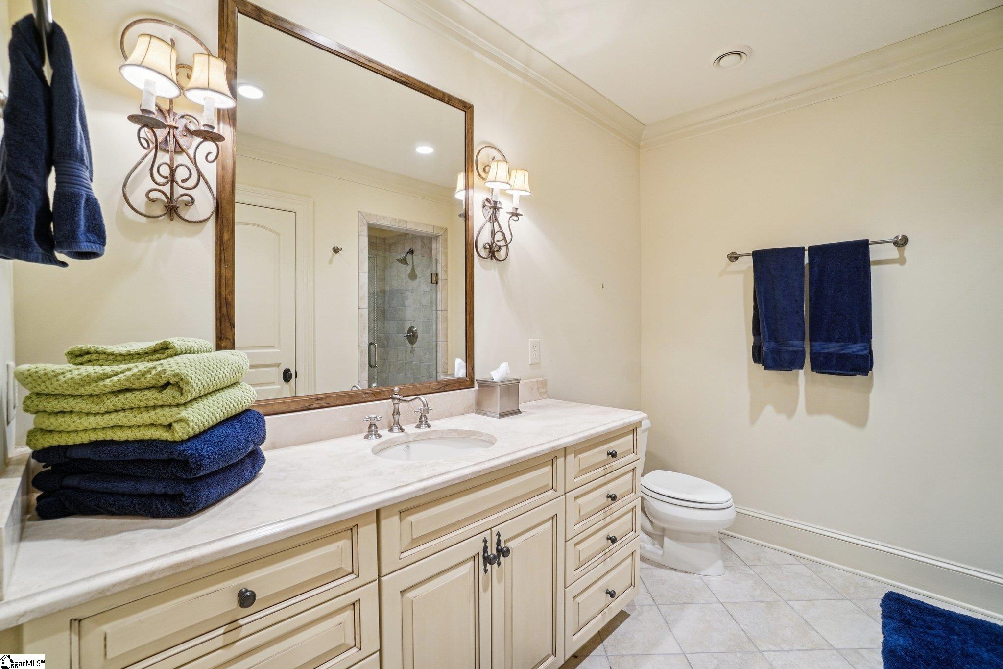 Elegance and exquisite taste are personified in this beautifully proportioned French Country lake home in an exclusive enclave of The Cliffs at Keowee Vineyards. Gentle topography and a plethora of high-canopied native trees frame the 9 bedroom home, served by 6 full bathrooms and one powder room. Views are multi-dimensional, including mountains, lake cove and channel, pristine state parkland, and the 4th green of the Tom Fazio golf course. The tranquil cove is just off the main channel, protecting boats and swimmers alike, whilst providing privacy. Set into the gracious stone façade, a handsome mahogany door opens into a contiguous living area, with beamed great room lit by Charleston lanterns, dining room, keeping room, and kitchen. Vaulted ceilings, clerestory windows, vast sliding doors to the screened outdoor living area, and a multitude of inner balconies and windows enhance the spacious atmosphere, while numerous European antique architectural elements add an essence of timelessness. The kitchen is flanked by the comfortable keeping room, and outfitted with a Dacor 6-burner gas range, double Dacor wall ovens, two apron farmhouse sinks, a walnut-topped island, and walk-in pantry. The generous screened porch readily accommodates dining and sitting areas on blue crab orchard stone, warmed by a gas-log limestone fireplace. In addition to four principally-sized suites are two darling double bedrooms, a charming bunk room at the lower level, and separate suite above the 3-car garage. The lake level media room opens to a blue flagstone patio delineated by zinc planters, with inset hot tub, grilling kitchen, and second outdoor fireplace. Also at this level are the bunk room, 9th bedroom, two full bathrooms, media room with billiards, a wet bar with ice machine, plenty of storage (including lake toy “garage”), and second laundry room with 3rd fridge and 2nd dishwasher. The home is professionally decorated, with sumptuous window treatments and thoughtful detailing throughout. Numerous impressive features include custom lighting fixtures (many of which are either antique or artisan-crafted from antiques), a home office with lake views, custom hand-wrought iron balusters, Grade 1 white oak flooring (a recent addition to the lower level), a two-slip boathouse, exterior gas lanterns, solid stone exterior, some 7, 000 square feet of custom designed and engineered living space, and superlative artistic sensitivity, in both plan and execution. This beautifully designed and masterfully constructed home is a Cliffs at Keowee Vineyards icon with recent that bely the home’s early 2000’s construction.