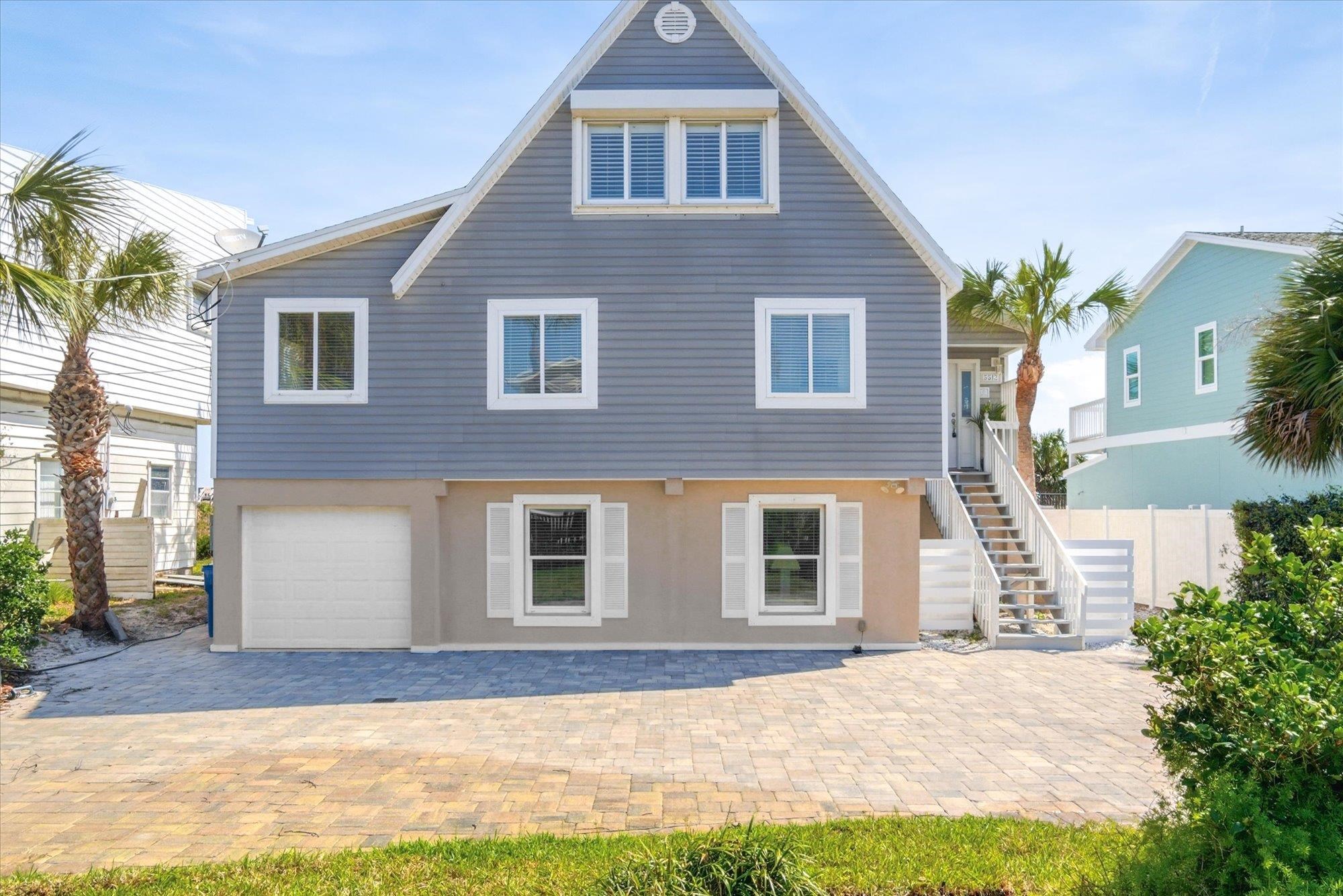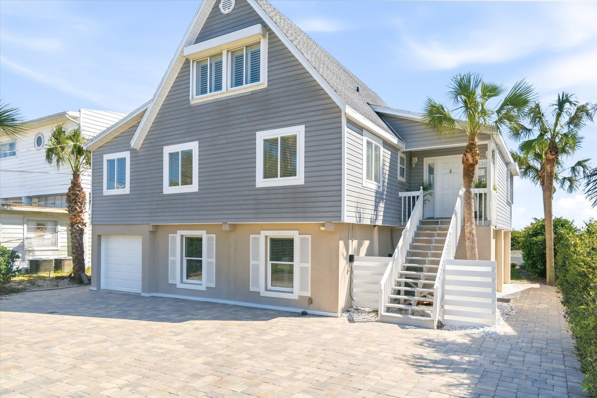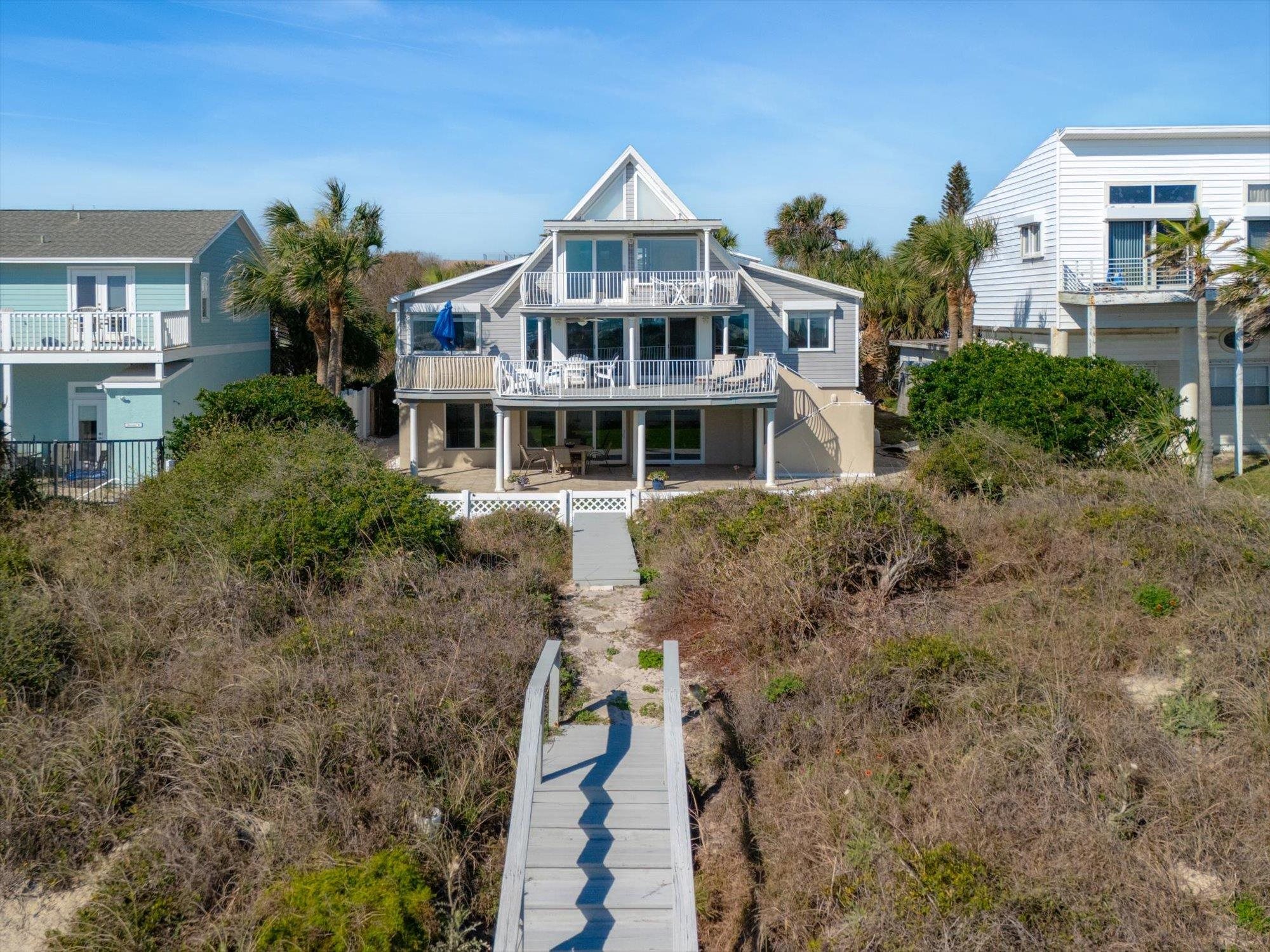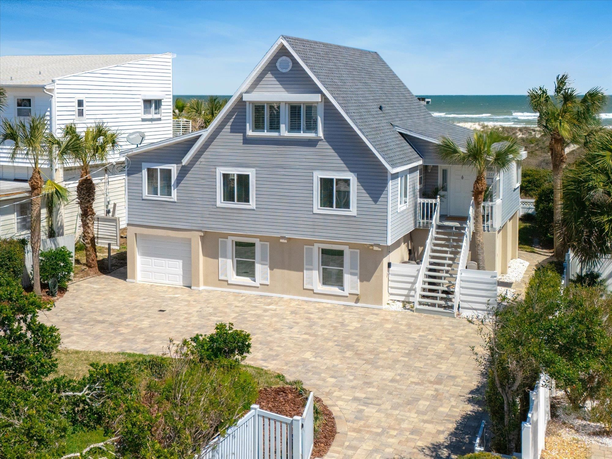 Experience elevated coastal living in this exceptional oceanfront residence in St. Augustine Beach, where panoramic Atlantic views and direct beach access define a truly rare offering. Perched along the dunes with a private access to the shoreline, this 3, 093-square-foot, 5-bedroom, 4-bath home captures the essence of a relaxed yet refined beachside lifestyle. Spanning three thoughtfully designed levels, the home maximizes both versatility and breathtaking ocean vistas. The main living level, positioned on the second floor, welcomes you with rich wood flooring and an open-concept design where walls of windows frame sweeping views of the Atlantic. Natural light and coastal breezes fill the space, while the living and dining areas extend seamlessly to a spacious oceanfront deck—an ideal setting for morning coffee, sunset gatherings, or evenings listening to the waves. Furnishings are negotiable. The kitchen is both functional and inviting, featuring granite countertops, bar-top seating, and stainless steel appliances, all oriented to remain connected to the main living spaces. Two bedrooms and a full bath complete this level, offering comfort and flexibility for family or guests. The third floor is dedicated to a private primary retreat, where elevated views create a true sense of escape. A secluded oceanfront deck provides a front-row seat to the coastline, while the suite itself offers generous walk-in closets and a spacious bath with dual vanities, a jetted tub, and a separate shower—designed for both comfort and relaxation. On the first level, a fully equipped secondary living space offers its own kitchen, living area, two bedrooms, and two full baths, opening to a covered patio. This level provides exceptional flexibility for hosting guests, multigenerational living, or creating a private retreat within the home. Outside, the property continues to impress with a large, grassed backyard offering ample space to design a custom pool, complemented by a covered patio and multiple outdoor living areas that embrace the coastal setting. A private dune path places the beach just steps away, allowing for effortless days on the sand and in the surf. Don’t miss the separate dune walk over deck with seating before you hit the waves. Additional highlights include a recently updated paver driveway, newer roof, connection to city sewer, impact doors, windows and shutters, a separate laundry room, and a one-car garage—ensuring both comfort and peace of mind. Set along one of St. Augustine Beach’s most desirable stretches of oceanfront, this home offers the perfect balance of privacy and convenience, with local dining, shopping, and historic downtown St. Augustine just minutes away. Positioned in a sought-after area where short-term rentals are permitted, creating an exceptional opportunity for income generation. With sweeping ocean views from every level, direct beach access, and a layout designed for both gathering and retreat, this residence presents a rare opportunity to own a true coastal sanctuary.