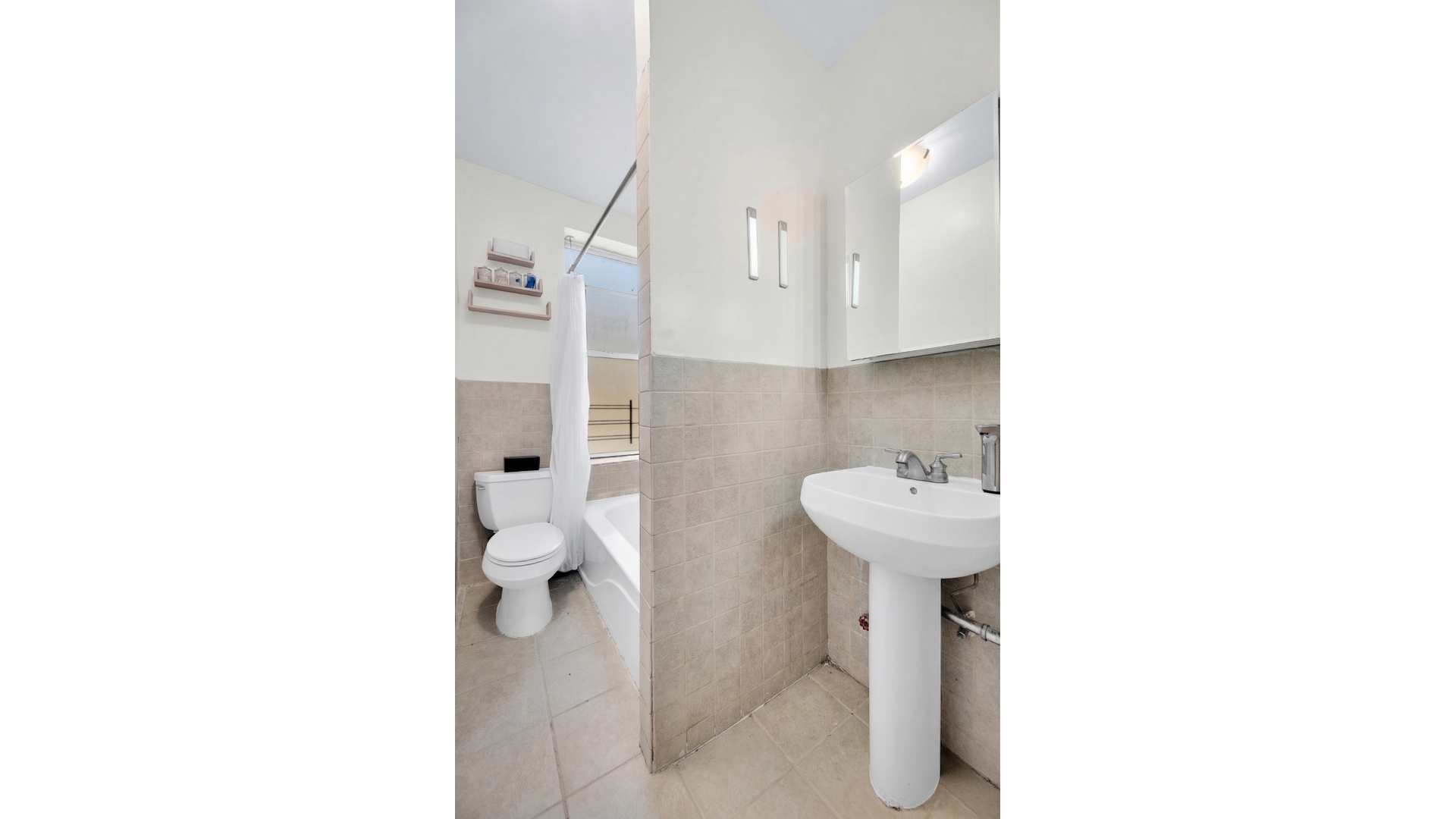 Windowed bathroom is fully renovated with natural color tile and a shower-tub combo.