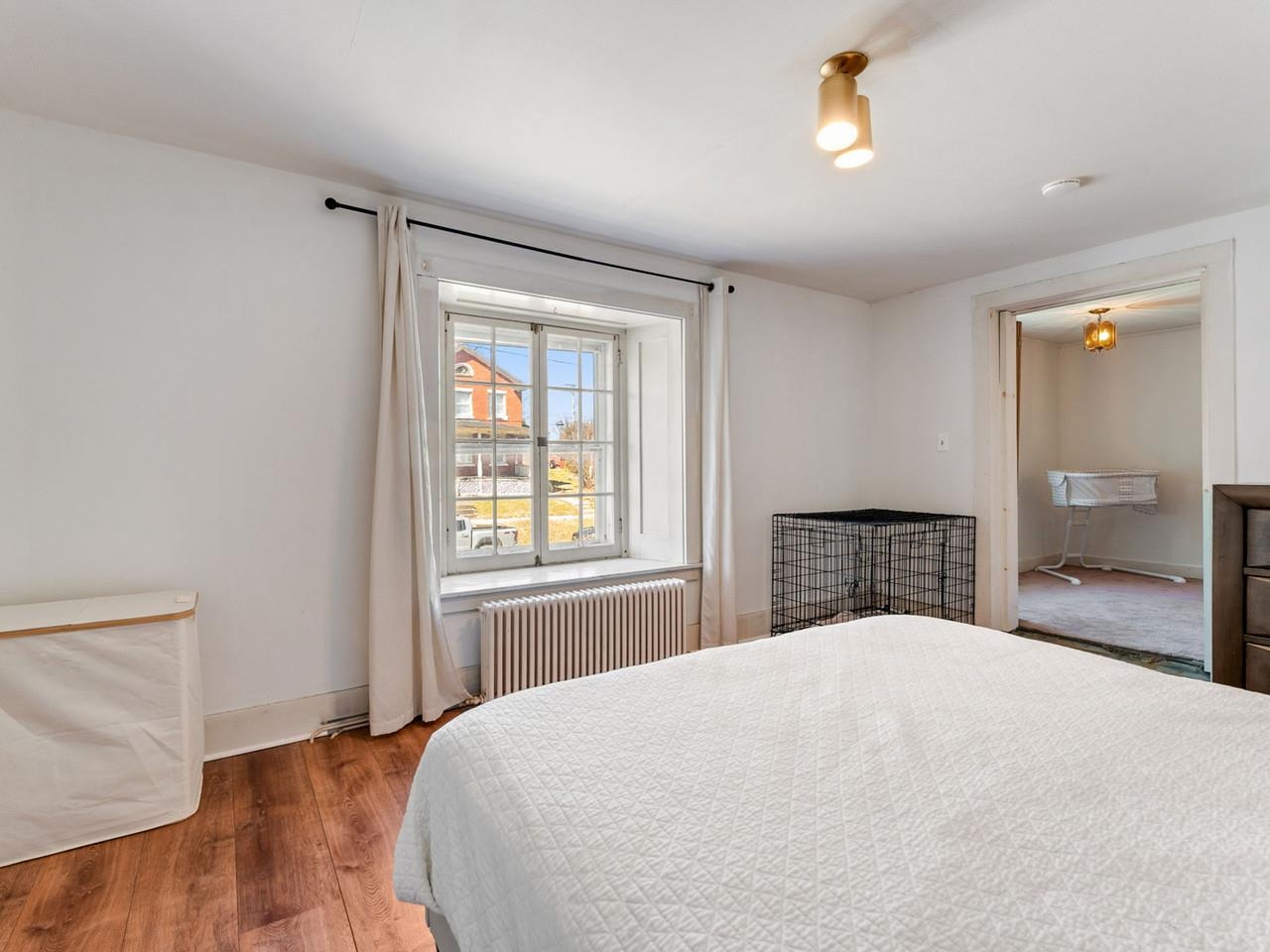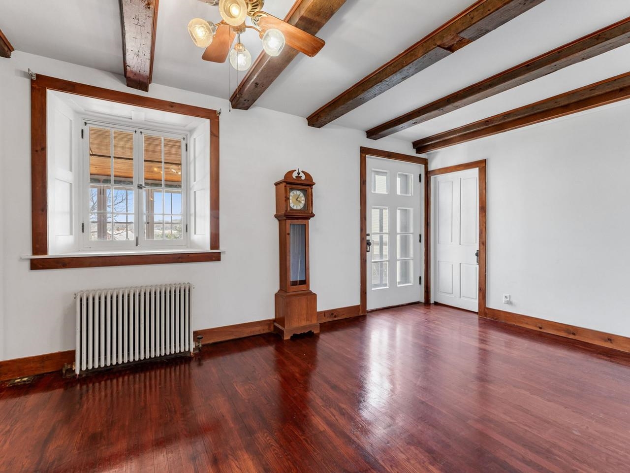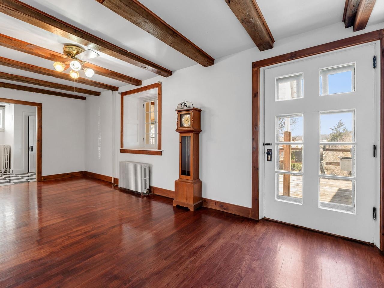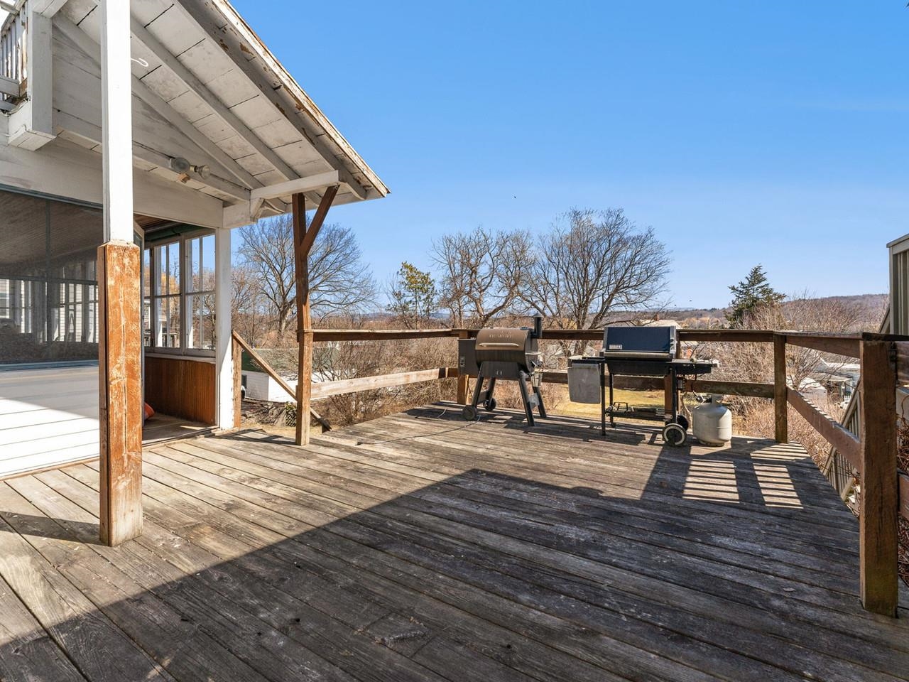 This beautifully preserved 1880s home sits right in the heart of Vergennes, offering the ultimate convenience just a stone's throw from local favorite restaurants and a literal front-row seat to the annual Memorial Day parade. Inside, you are greeted by the warmth of original woodworking, including striking exposed beams and hardwood floors that have been recently refinished to a brilliant shine. The main level features a spacious living room and a large formal dining room that flows seamlessly into an eat-in kitchen complete with an island, as well as a convenient first-floor half bath and laundry. Upstairs, the second level hosts two bedrooms and a full bathroom, along with two versatile bonus rooms that are perfect for dedicated office spaces or playrooms. The outdoor living options are equally impressive, featuring a private balcony area, a charming three-season porch, and a generous deck designed for grilling while taking in elevated views of the city. Practicality meets historical charm in the basement, where tall ceilings and walk-out doors provide excellent potential for a garage or extensive additional storage, all complemented by a fresh coat of paint throughout the home that makes this historic gem move-in ready.