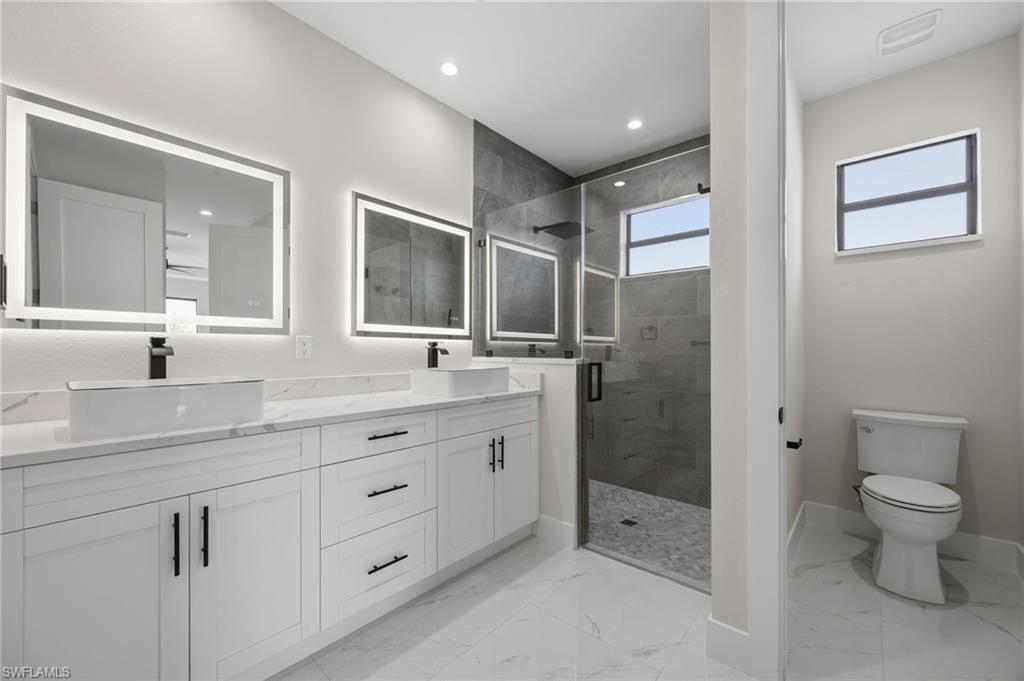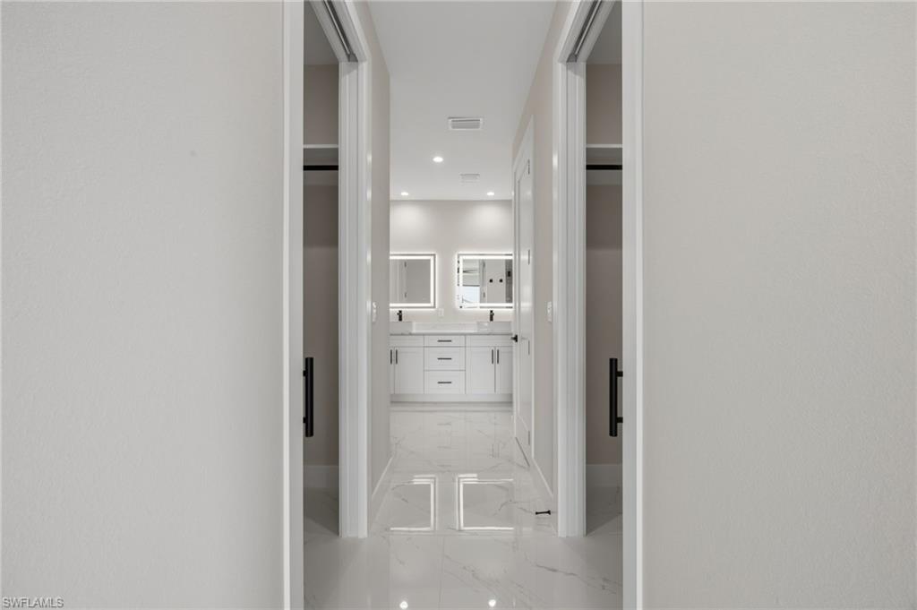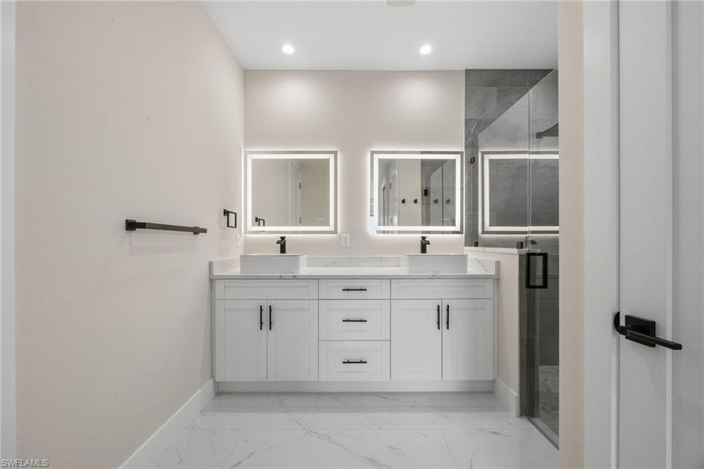 The spacious primary suite offers a private retreat with beautiful pool views, dual walk in closets with custom built ins, and a spa inspired bathroom featuring double vanities, LED mirrors, and a walk in shower with glass enclosure. Two additional guest bedrooms with built in closets share a well appointed full bathroom.