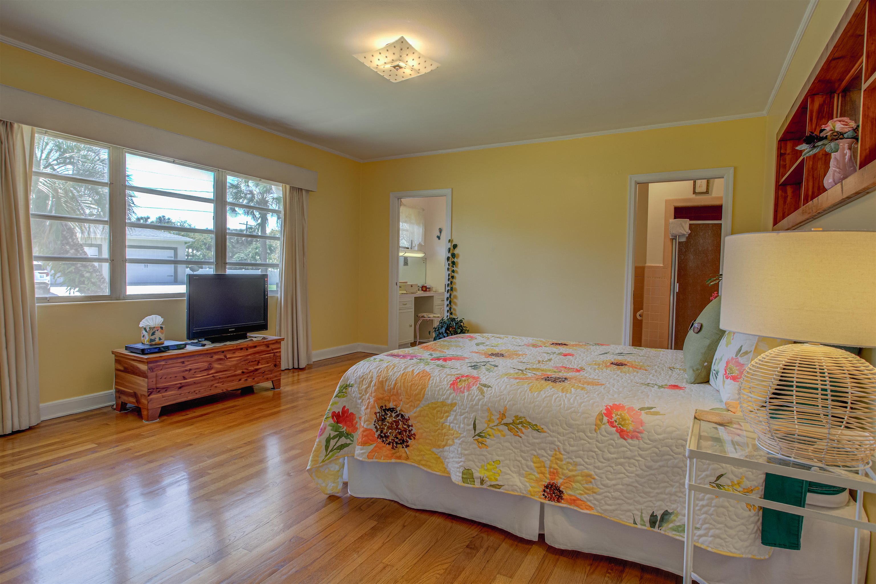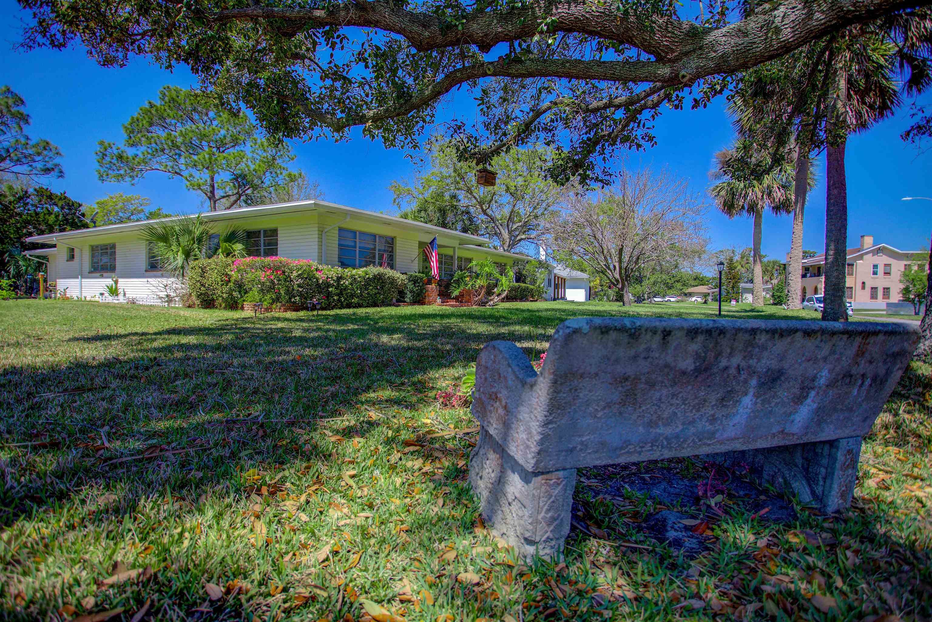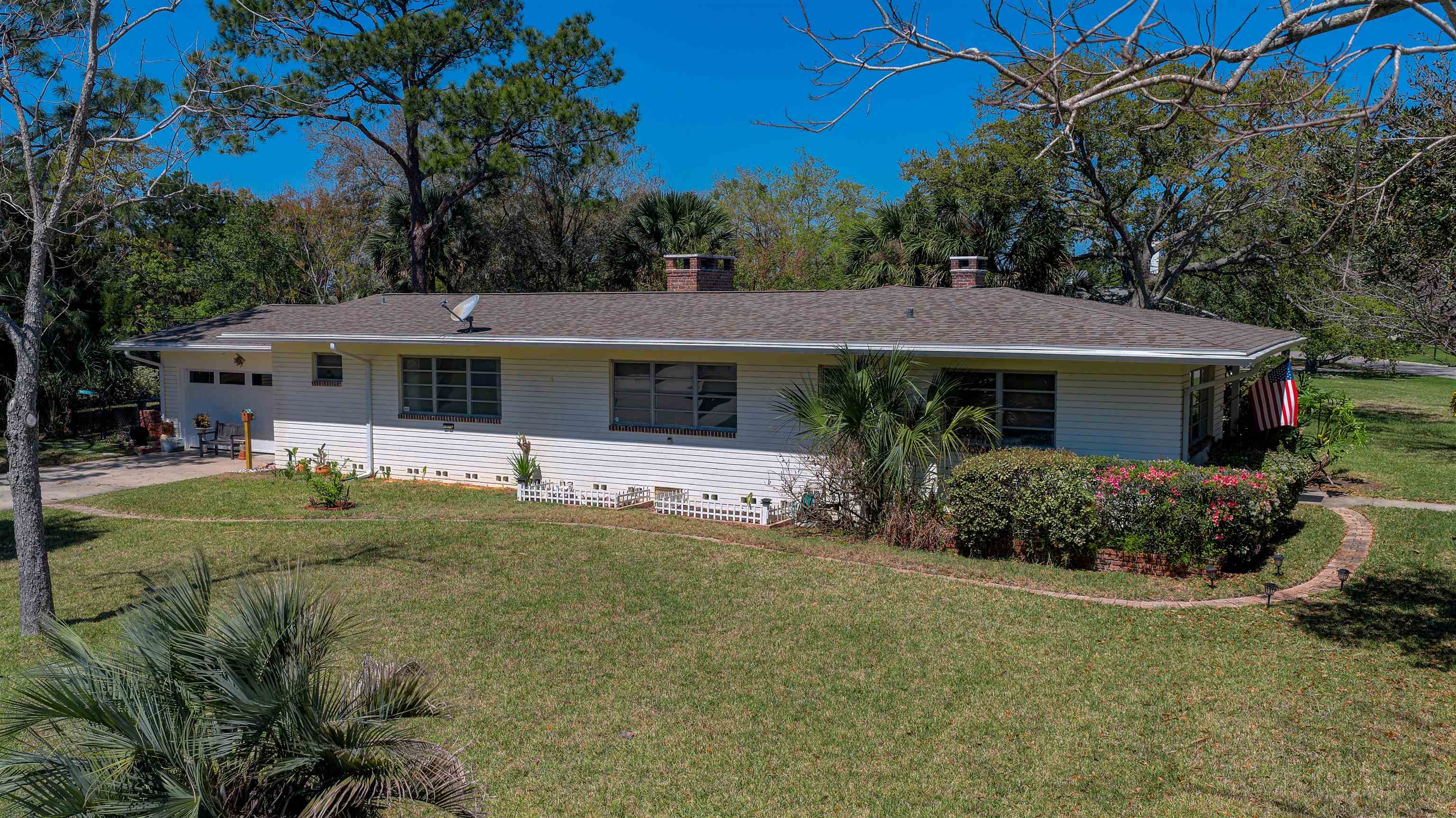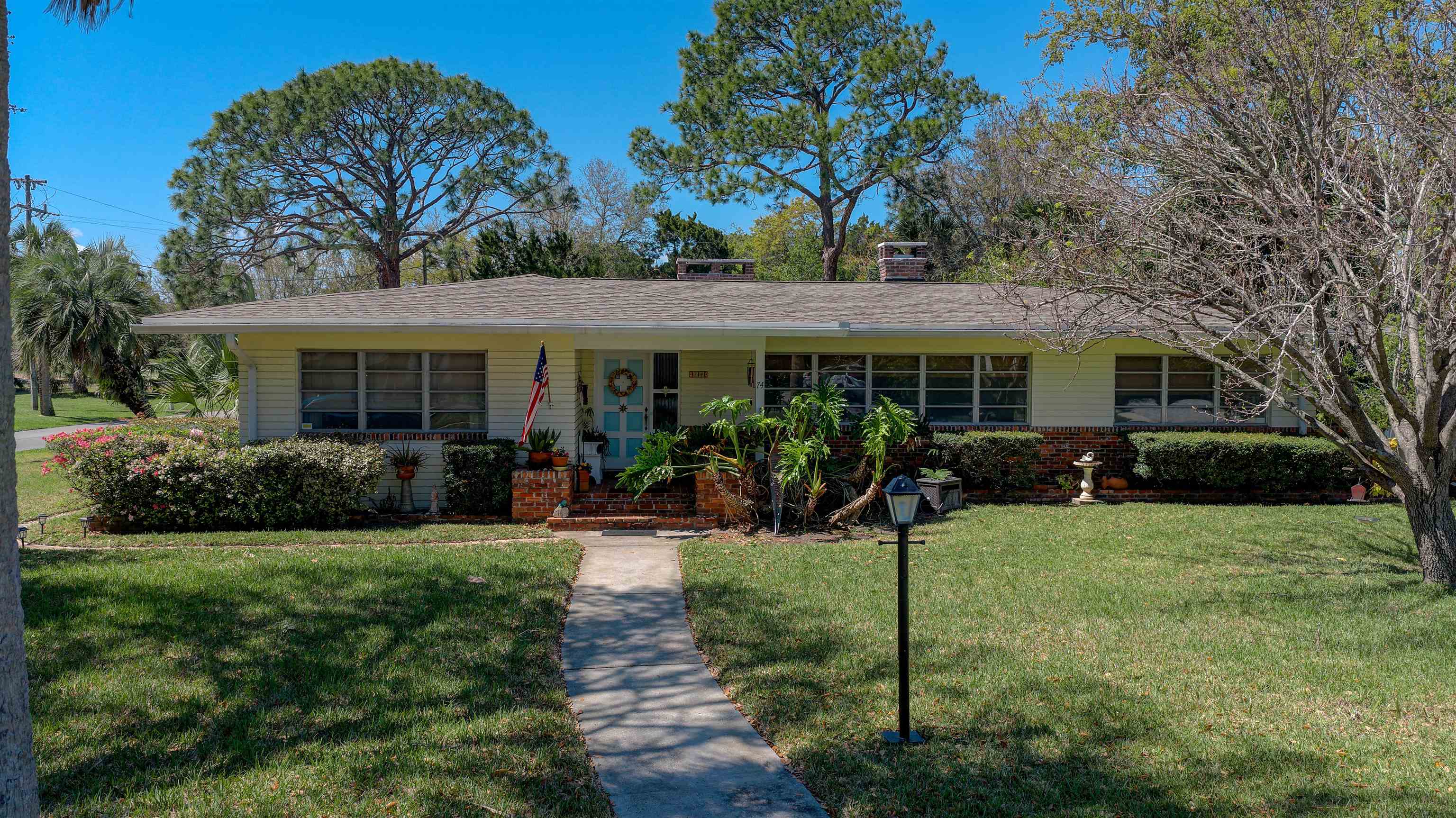 Concrete block 3-bedroom, 2-bath spacious home located in desirable Davies Shores, situated on a prominent corner lot. This well-maintained residence features hardwood floors throughout and a spacious family room with a fireplace that has been converted to gas. 2-car garage leads into a spacious warm and sunny Florida room. The kitchen has been thoughtfully renovated to reflect mid-century period details while offering modern functionality. Solid construction, classic character, and a prime location close to downtown St Augustine, intercoastal waterway, beaches and local amenities make this property a standout opportunity. Custom brick exterior, deck off the kitchen, ideal for morning coffee or evening gatherings all set against a peaceful, tranquil backyard. Home has well for lawn irrigation.