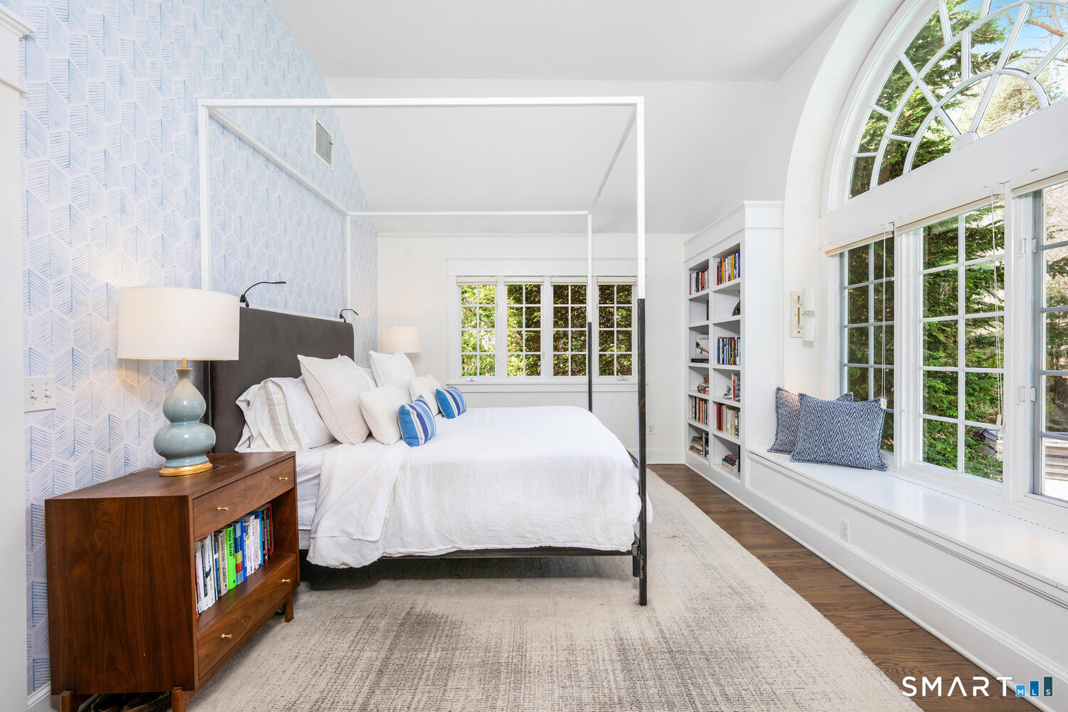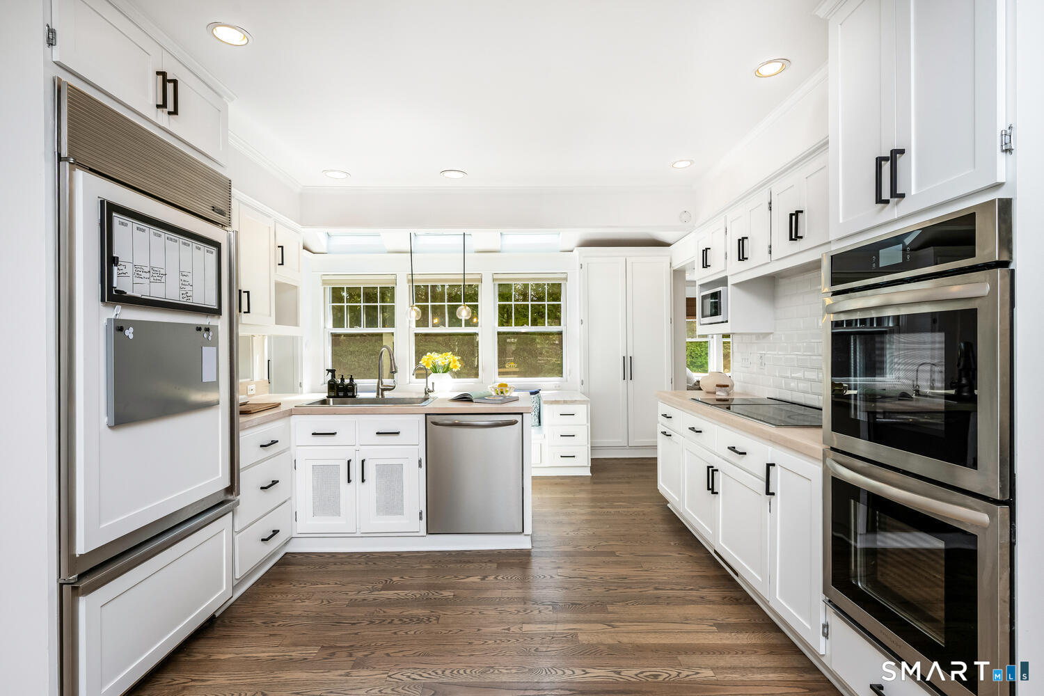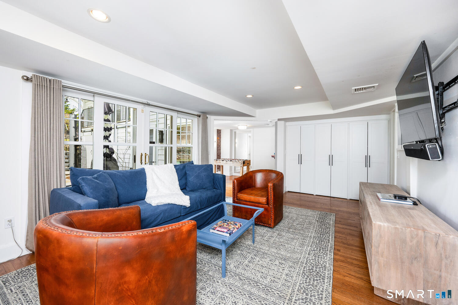 Few homes in Darien offer this combination: five bedrooms, five indoor entertainment spaces, a private elevator, gunite pool, hot tub, and pool cabana with wet bar-all on a private . 70-acre lot in the Tokeneke School district. Fully updated 2021-2026 and just a walk to Metro-North and downtown. Spanning three fully finished floors, the main floor is built for living and entertaining: a formal living room with fireplace, sunroom with, family room with fireplace, and a renovated chef's kitchen open to the dining room, featuring new cabinet doors, hardware, countertops, sink, faucet, pantry, and updated lighting. The primary suite features a dressing room and a cedar walk-in closet. Upstairs: home office and home gym. The at-grade lower level-built into natural ledge with no below-grade space-opens via French doors directly to the pool and features a pool entertainment room, three bedrooms, playroom, game room, cabana with wet bar, a mudroom, and two attached garages (a two-car garage and a separate third garage bay). Outside: gunite pool, new hot tub (2025), new pool heater (2024), pool cabana with wet bar and fridge, stone patio, large custom playset, full irrigation, fenced yard, and professional landscaping. Updated 2021-2026: two central A/C units, Ecobee smart thermostats, new appliances, refinished hardwood floors, renovated bathrooms, and painted exterior. No deferred maintenance. A private world of its own.