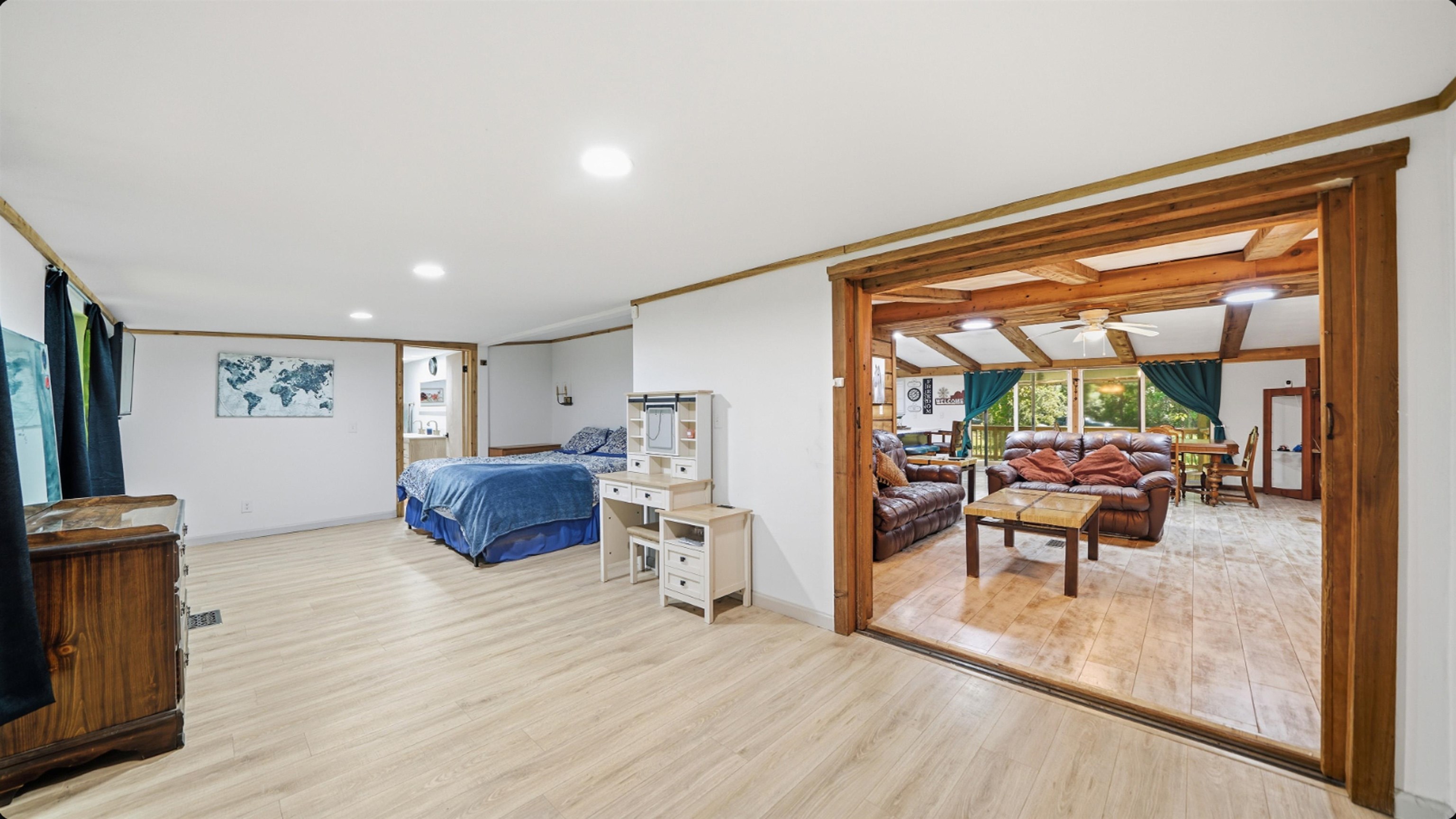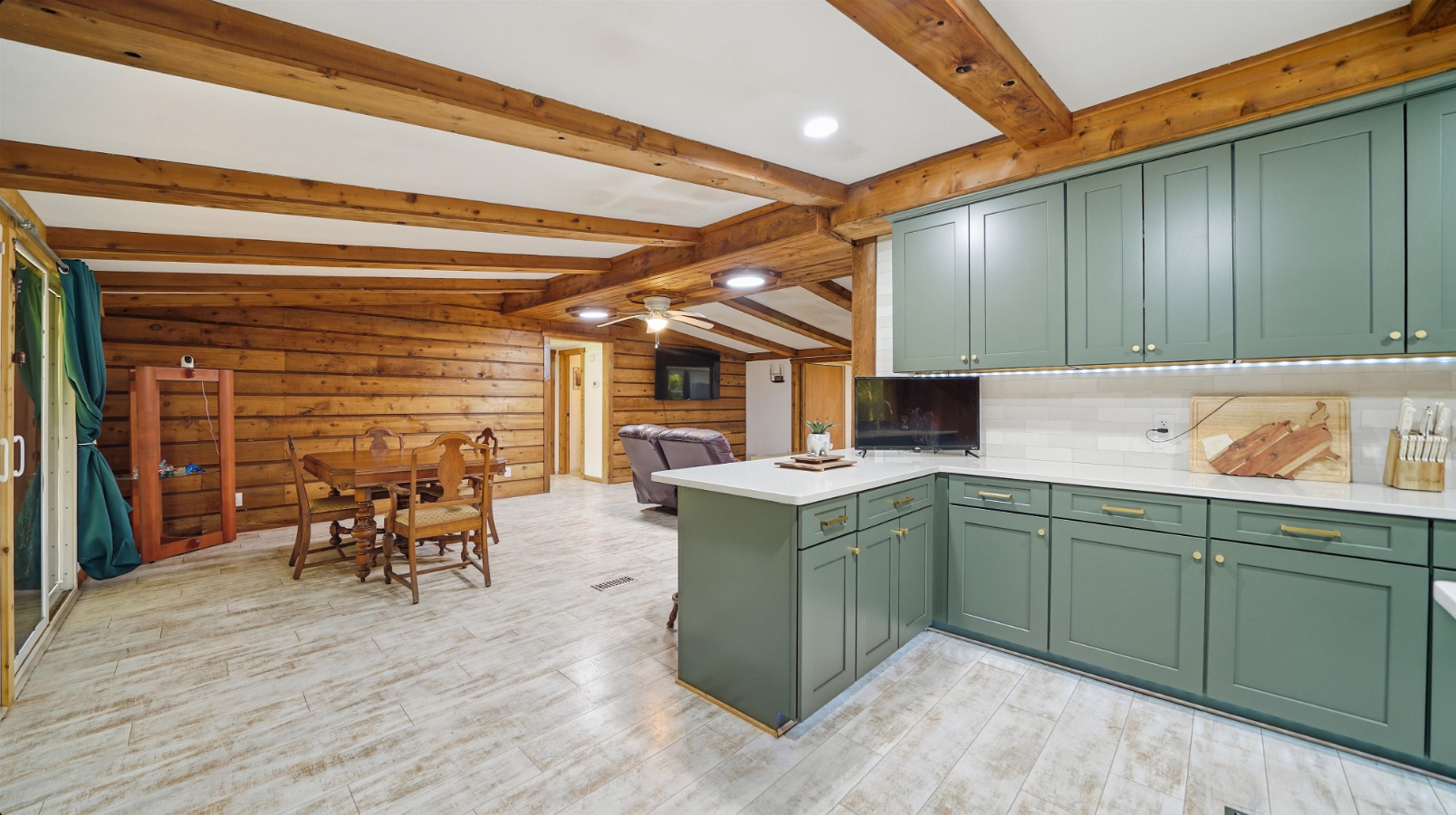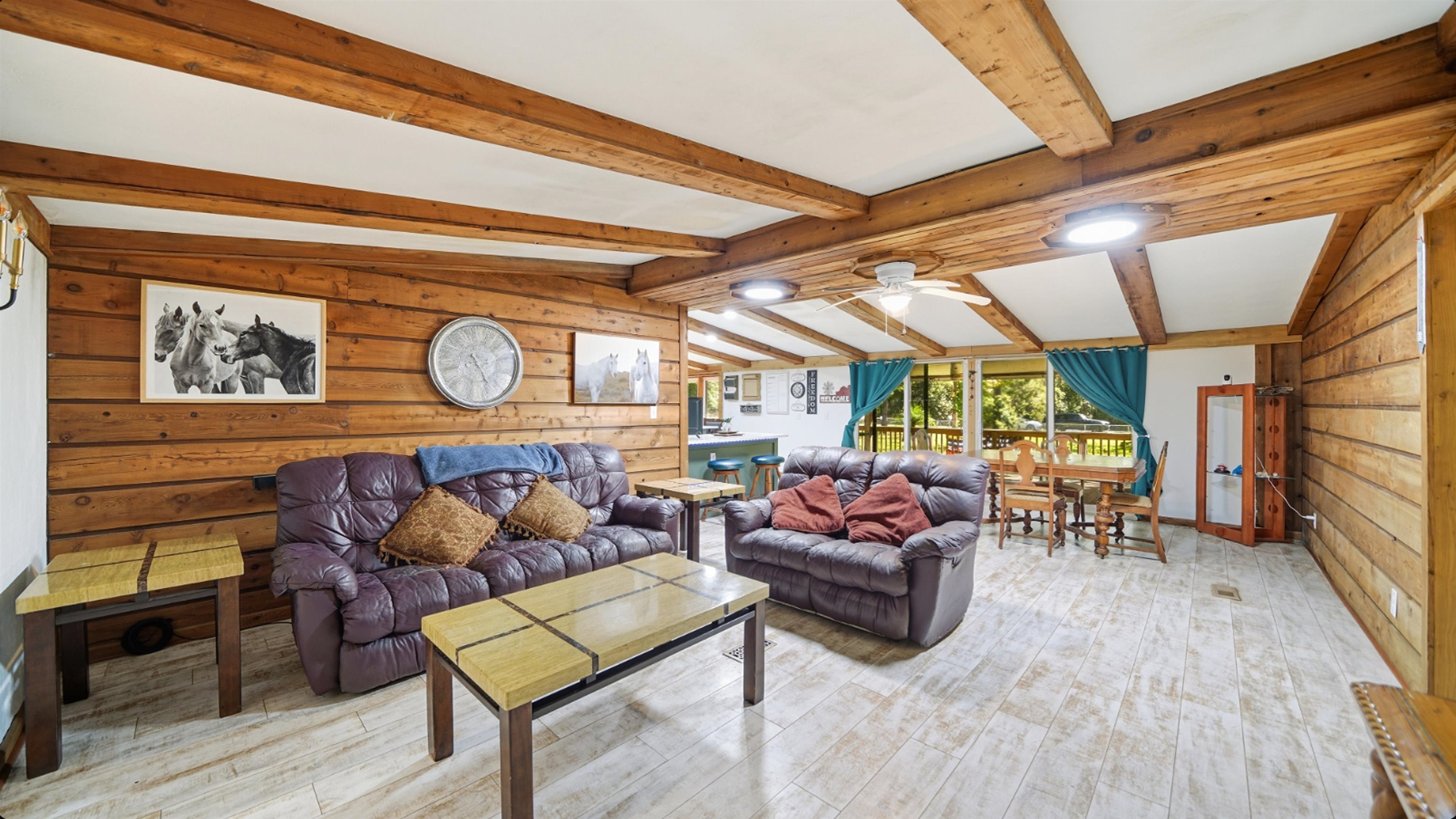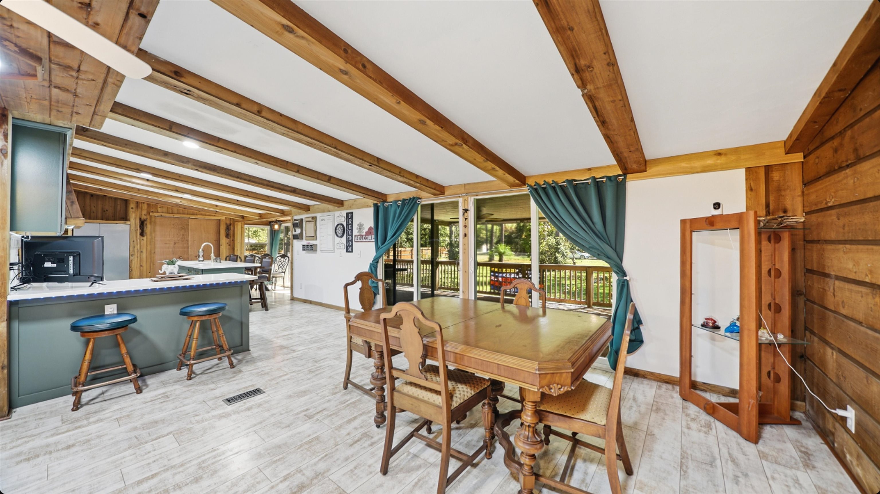 Welcome to your private retreat at 5920 Nutwood Avenue—a beautifully updated 4-bed, 3-bath home nestled on just over an acre of peaceful land in Bunnell. Step inside and you’ll immediately feel the warmth of this log-cabin-inspired interior, complete with wood beams, natural textures, and a cozy yet modern aesthetic. The heart of the home features a fully renovated kitchen with rich green cabinetry, quartz countertops, stainless steel appliances, and stylish fixtures—perfect for cooking and entertaining alike. The spacious living area offers an inviting rustic charm with its woodwork and open layout, creating the ideal blend of comfort and character. Each of the three full bathrooms has been tastefully remodeled with contemporary finishes, including a spa-like primary bath showcasing a stand-alone soaking tub. Throughout the home, you’ll find durable luxury vinyl plank flooring, adding both beauty and functionality. Relax and unwind on the large covered front porch, perfect for morning coffee, evening sunsets, or welcoming guests with classic southern charm. Set on over an acre, this property provides the space and privacy you’ve been looking for—whether you envision a garden, workshop, or simply room to enjoy the Florida sunshine. Additional features include a whole-home water purification system for the well, ensuring clean, great-tasting water year-round. Experience the best of both worlds: quiet country living with modern luxury touches just minutes from local conveniences. All information pertaining to the property is deemed reliable, but not guaranteed. Information to be verified by the Buyer. Be advised that cameras may exist recording audio and video inside/outside the property, such as ring doorbells. Photos are digitally enhanced and could be altered, please verify. Virtually staged photos are included.