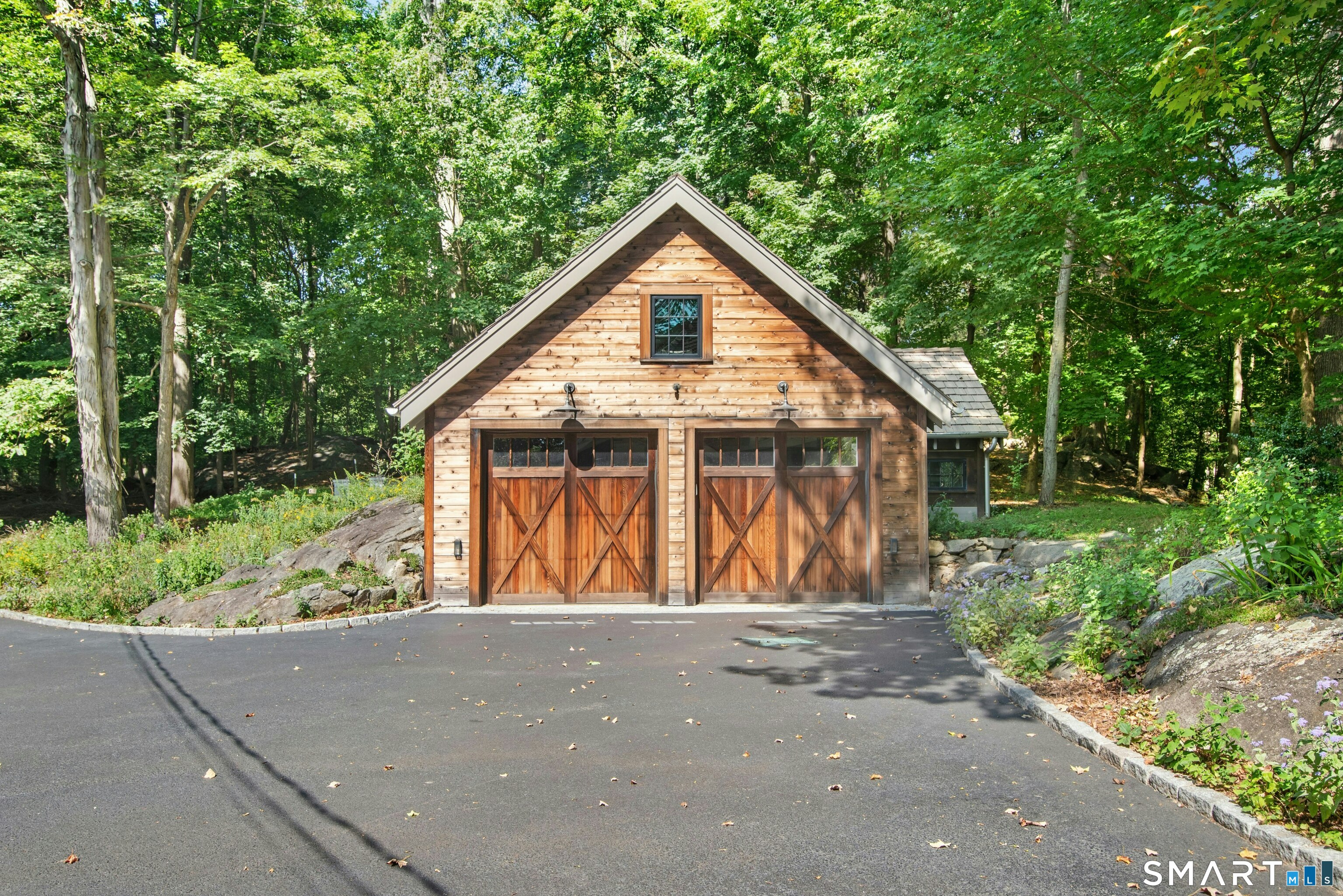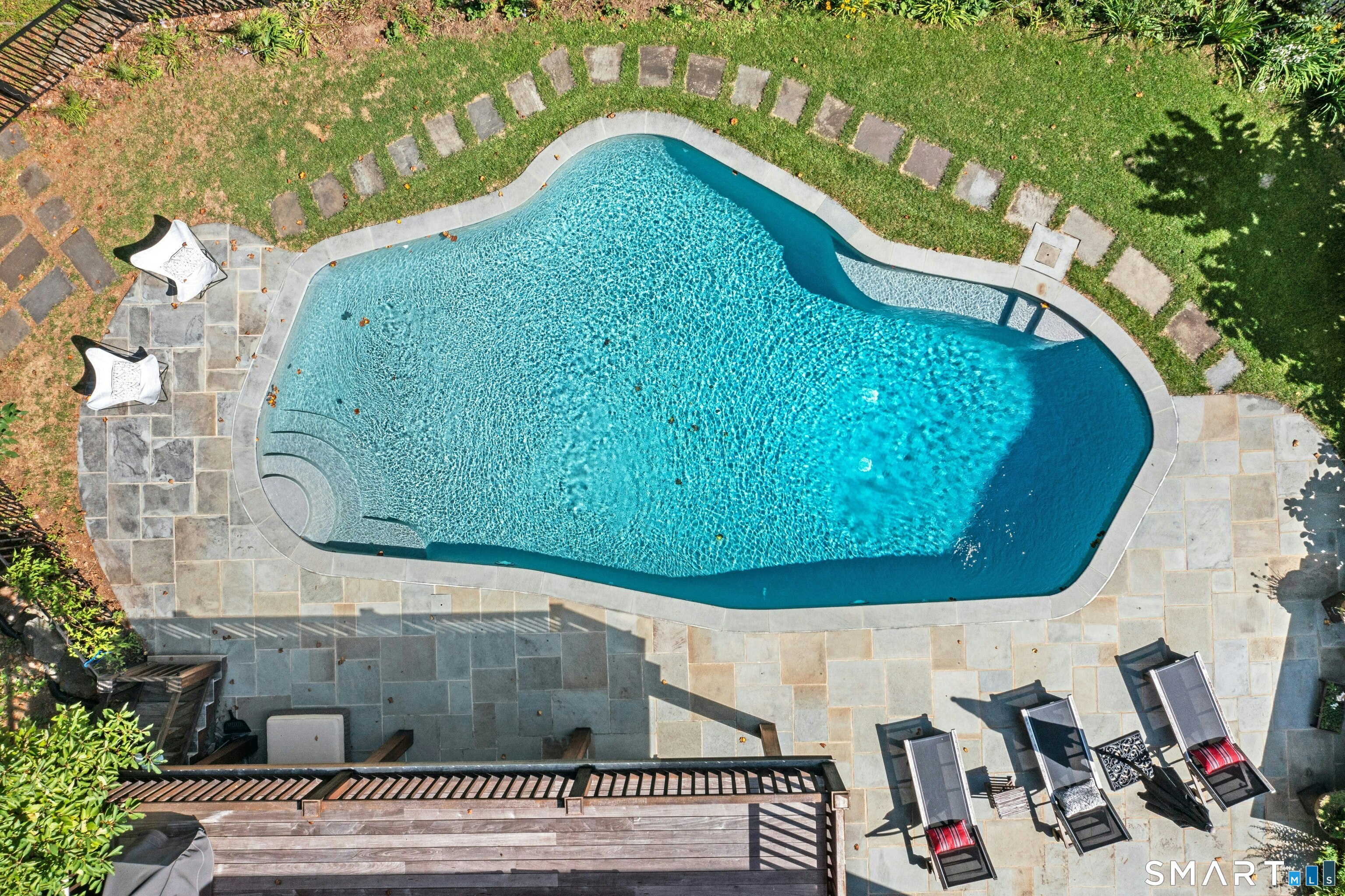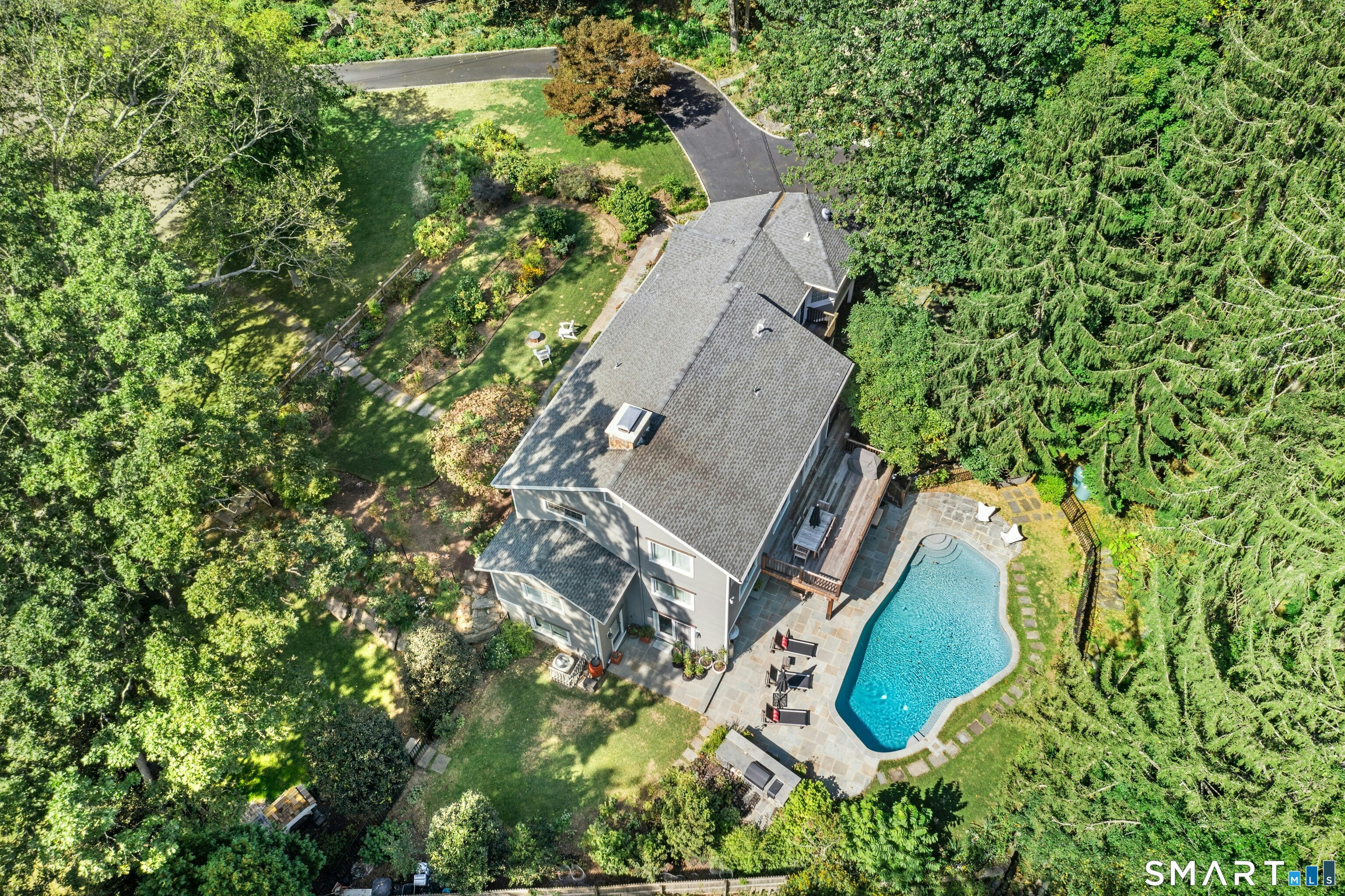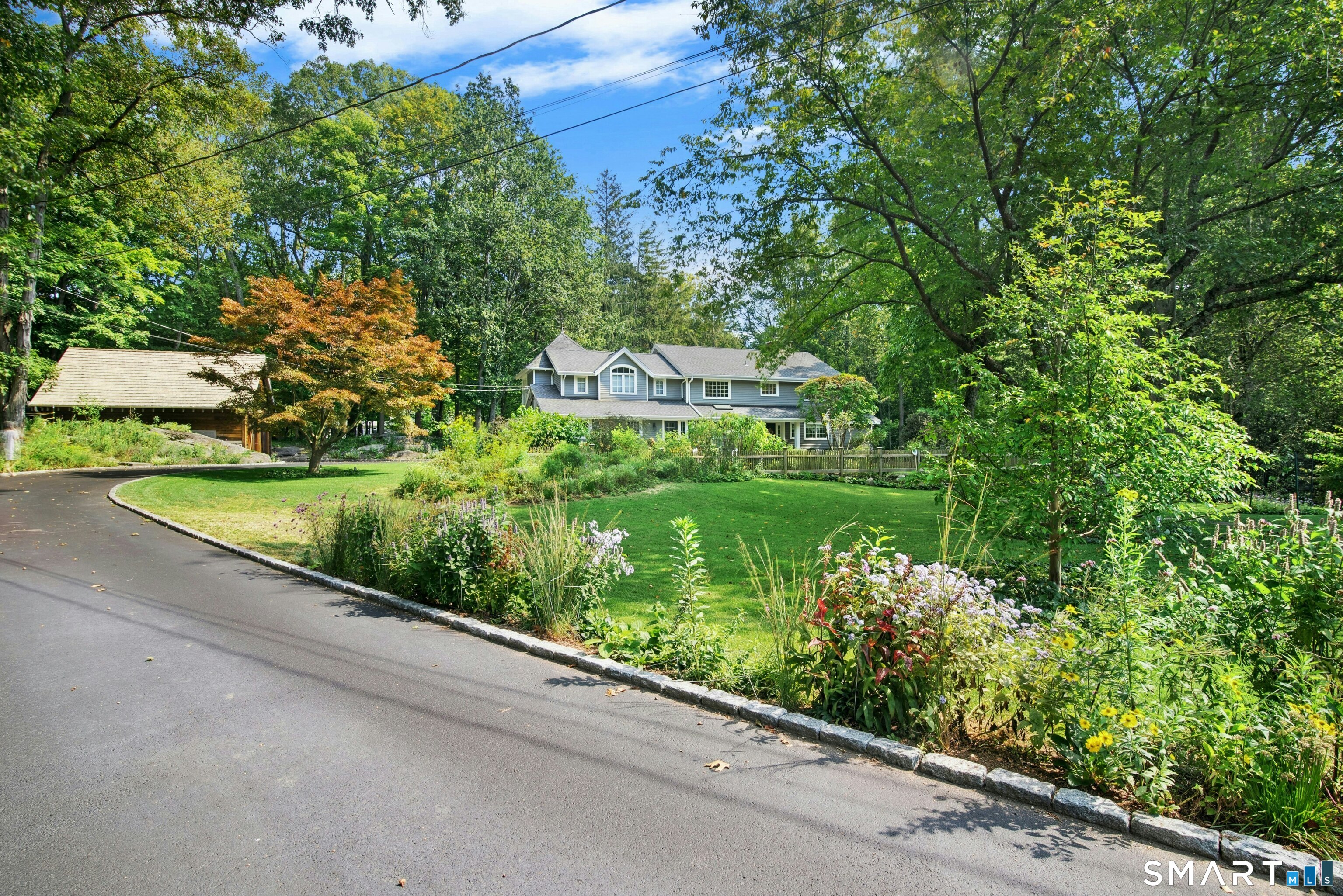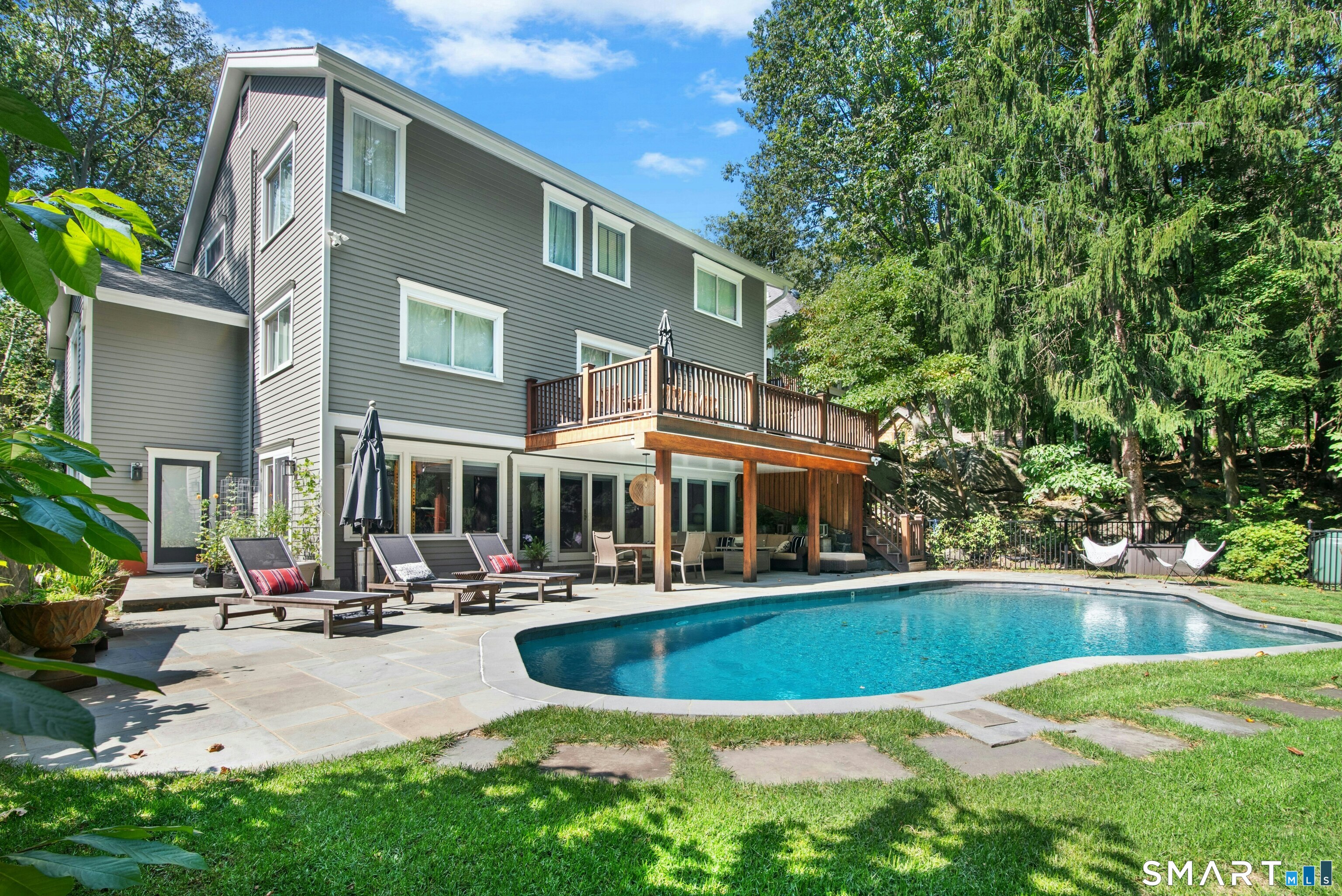 Rarely do you find a property that has it all: a spacious move-in ready house with a pool, and a private one-acre parcel close to everything Darien has to offer. Tucked away at the end of a cul-de-sac, steps away from the newly reimaged town center, and close to beaches, this thoughtfully renovated 5 bed/4. 5 bath home strikes just the right balance between comfortable living and sophistication. With tons of natural light, the first floor features an open living/dining room with access to the deck overlooking the pool, a kitchen with cozy banquette, family room with built-in desks and shelving, and a mudroom with laundry and custom cubbies. There are 4 spacious bedrooms and 3 baths upstairs, including a luxurious primary suite with vaulted ceiling, office, and generous walk-in closet and bathroom. The 5th bedroom, and 4th full bath, are in the walkout lower level which also offers a large "hang out" room with plenty of space for both relaxing and working out. For the car enthusiast, the detached barn, with heat and A/C, has an additional 2 garage bays as well as a workshop. Surrounded by nature, and awash with lush gardens, this is an unexpected oasis in the center of town.