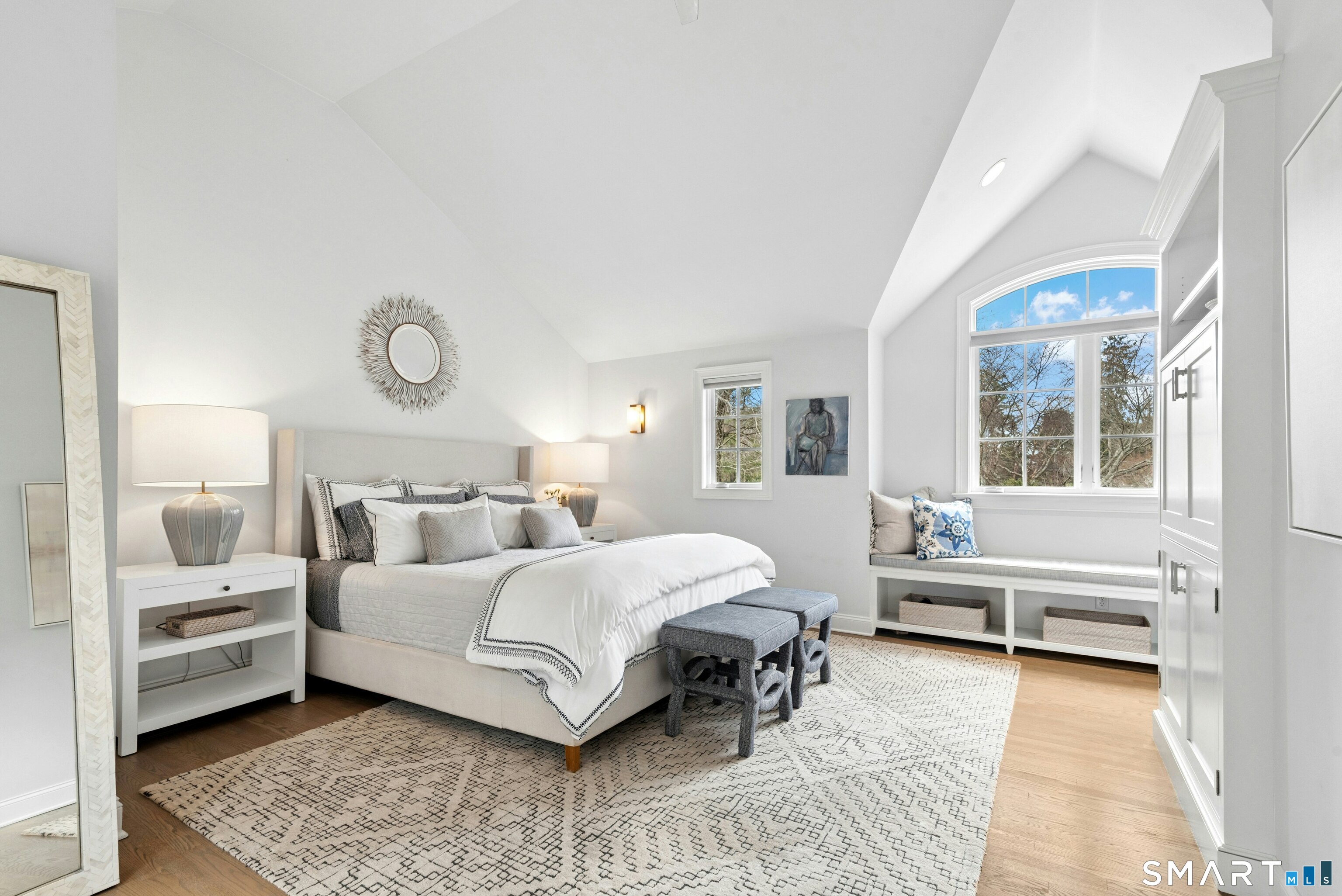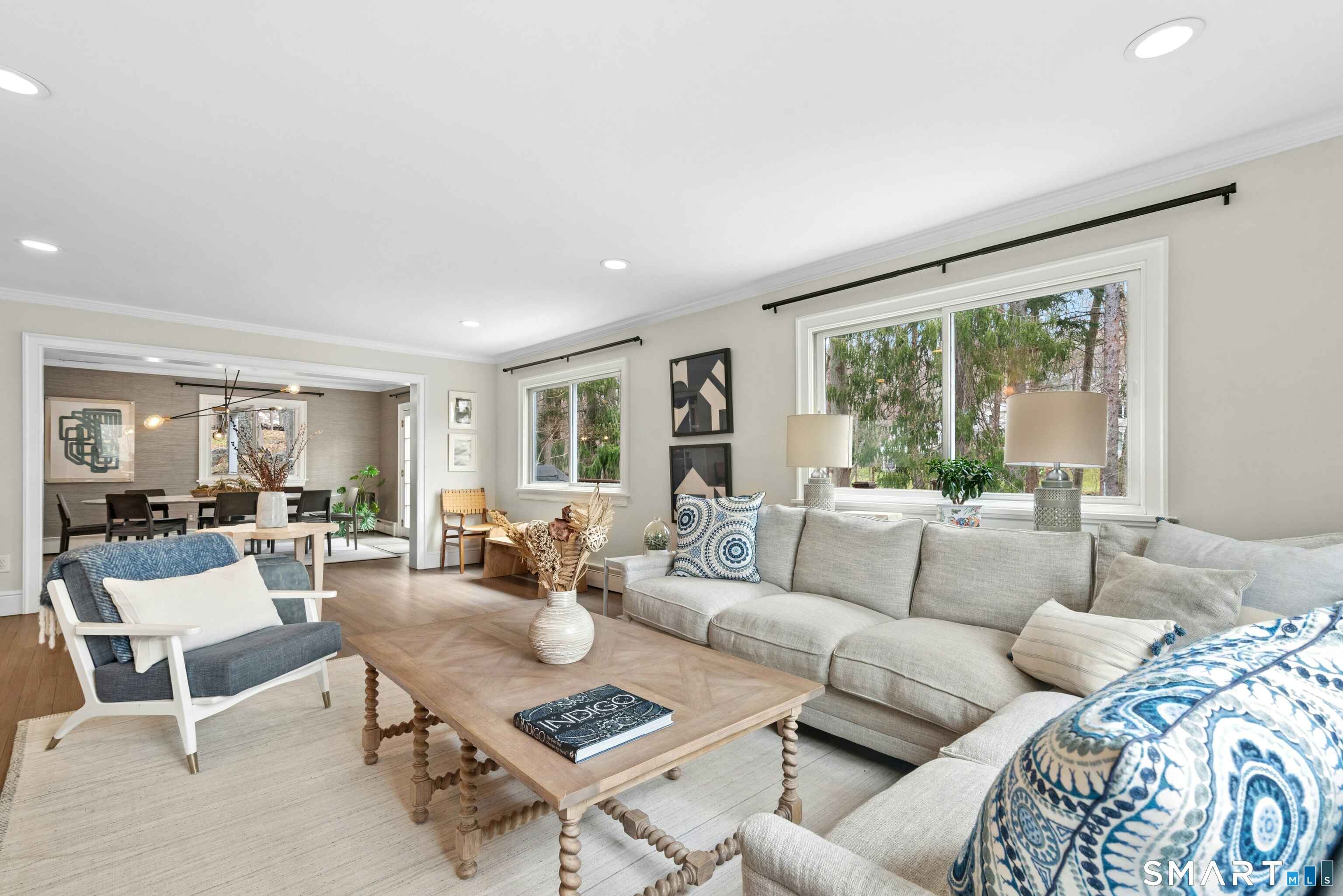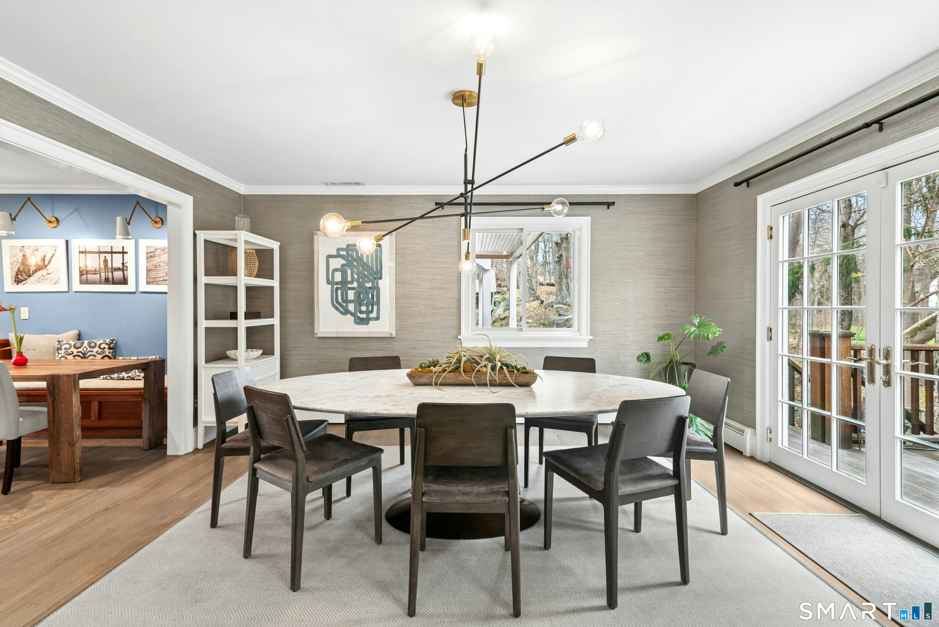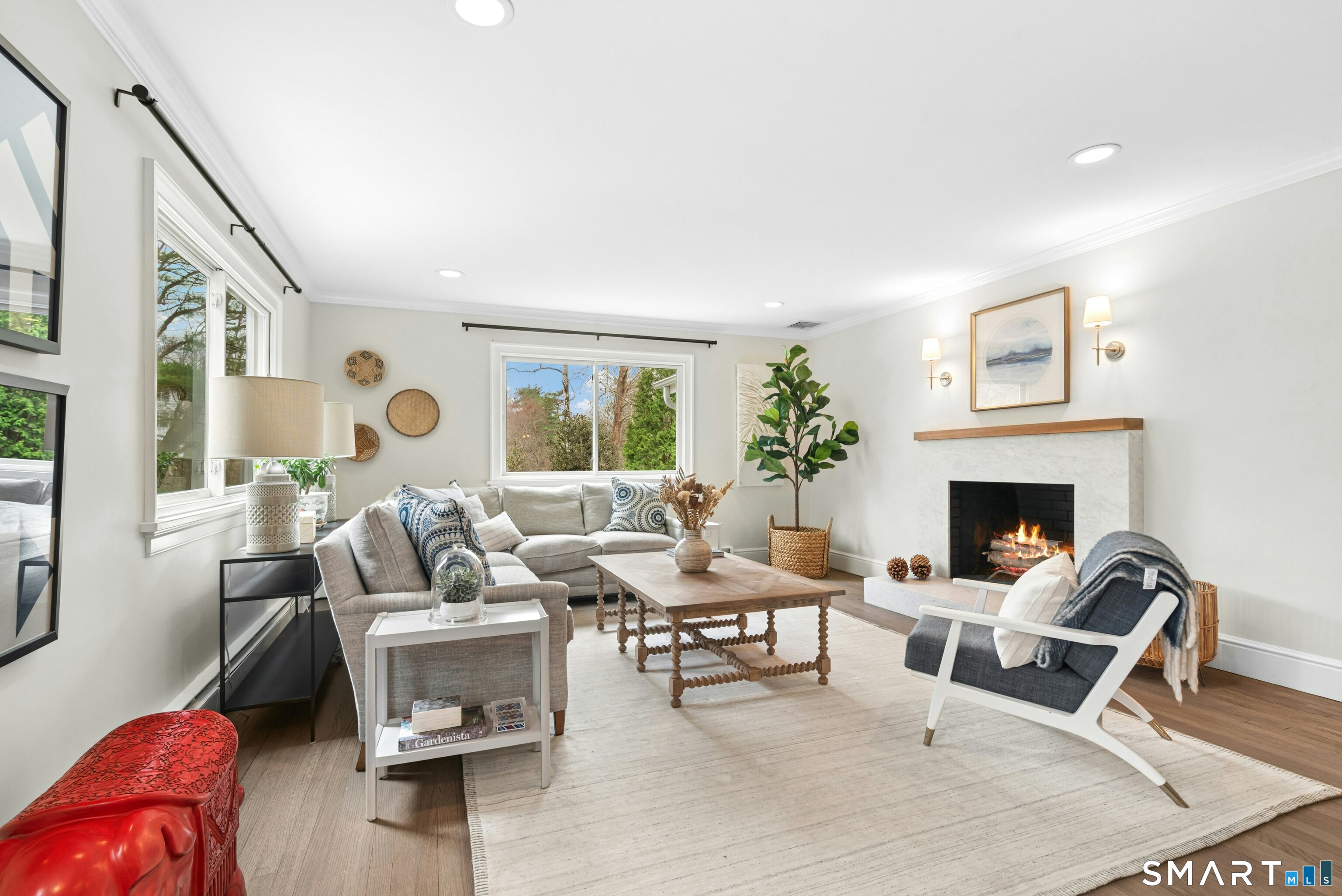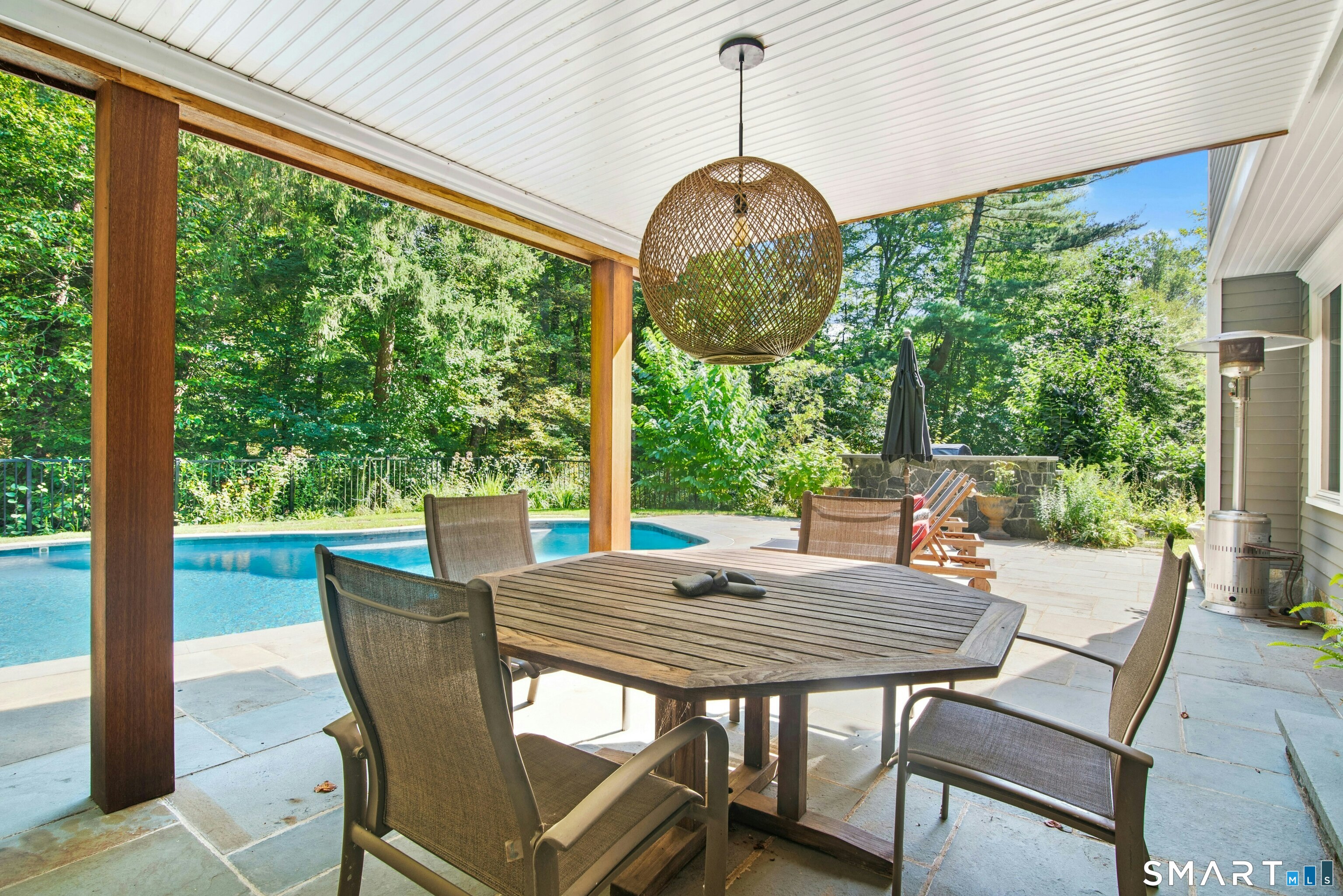 Rarely do you find a property that has it all: a spacious move-in ready house with a pool, and a private one-acre parcel close to everything Darien has to offer. Tucked away at the end of a cul-de-sac, steps away from the newly reimaged town center, and close to beaches, this thoughtfully renovated 5 bed/4. 5 bath home strikes just the right balance between comfortable living and sophistication. With tons of natural light, the first floor features an open living/dining room with access to the deck overlooking the pool, a kitchen with cozy banquette, family room with built-in desks and shelving, and a mudroom with laundry and custom cubbies. There are 4 spacious bedrooms and 3 baths upstairs, including a luxurious primary suite with vaulted ceiling, office, and generous walk-in closet and bathroom. The 5th bedroom, and 4th full bath, are in the walkout lower level which also offers a large "hang out" room with plenty of space for both relaxing and working out. For the car enthusiast, the detached barn, with heat and A/C, has an additional 2 garage bays as well as a workshop. Surrounded by nature, and awash with lush gardens, this is an unexpected oasis in the center of town.