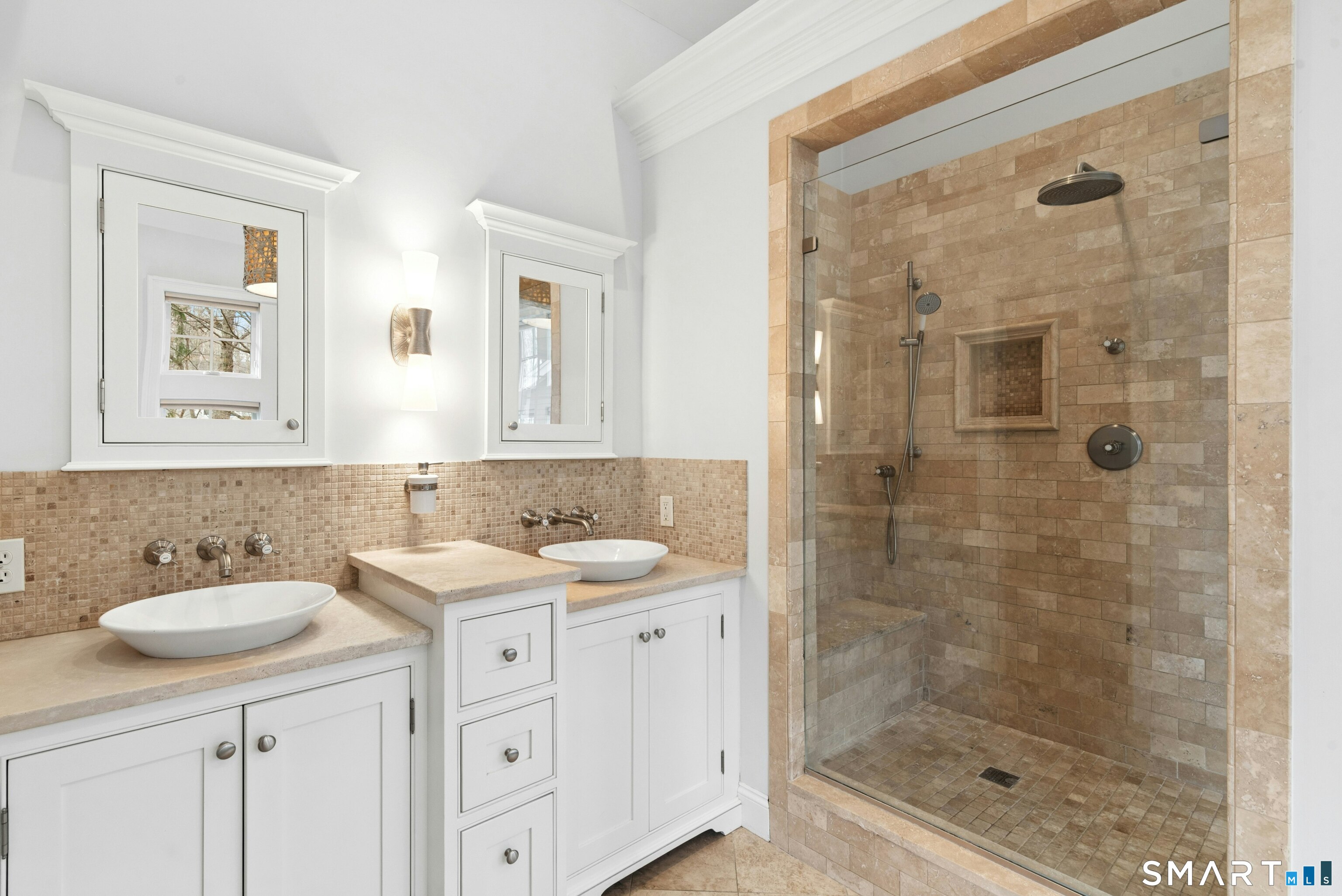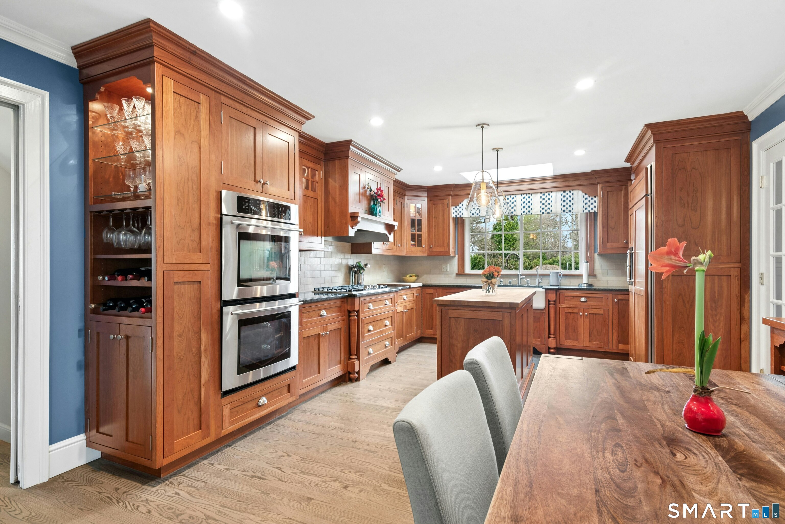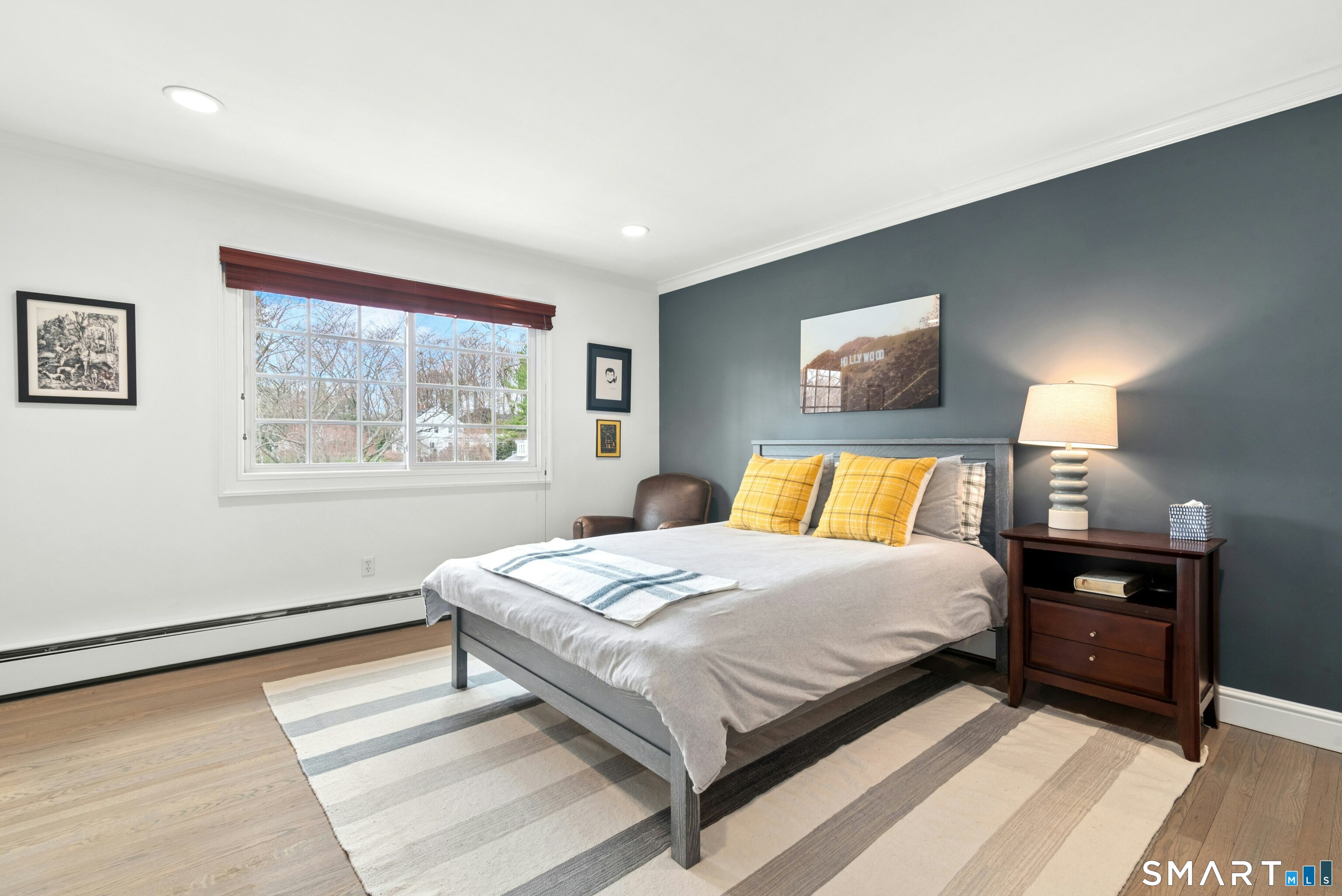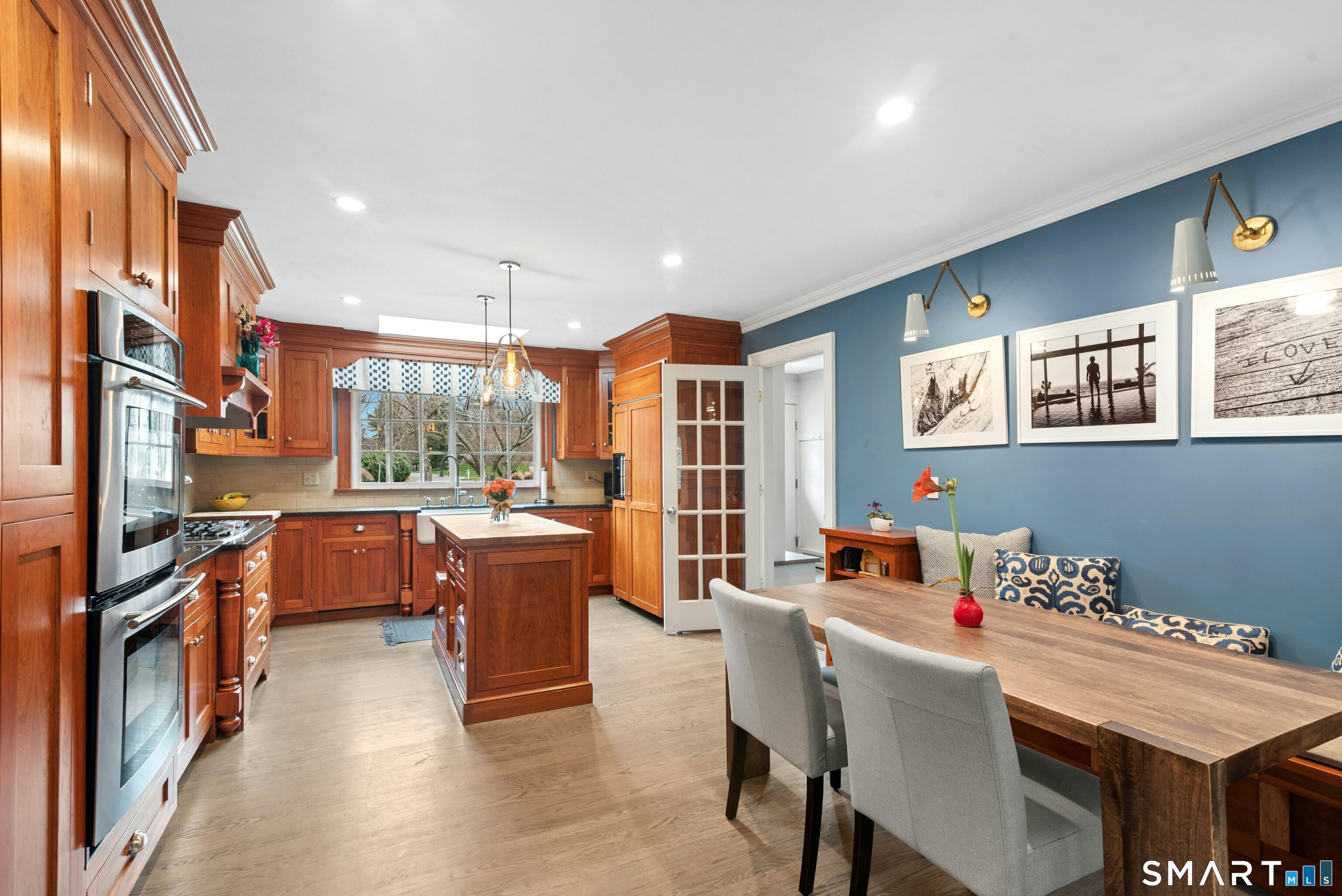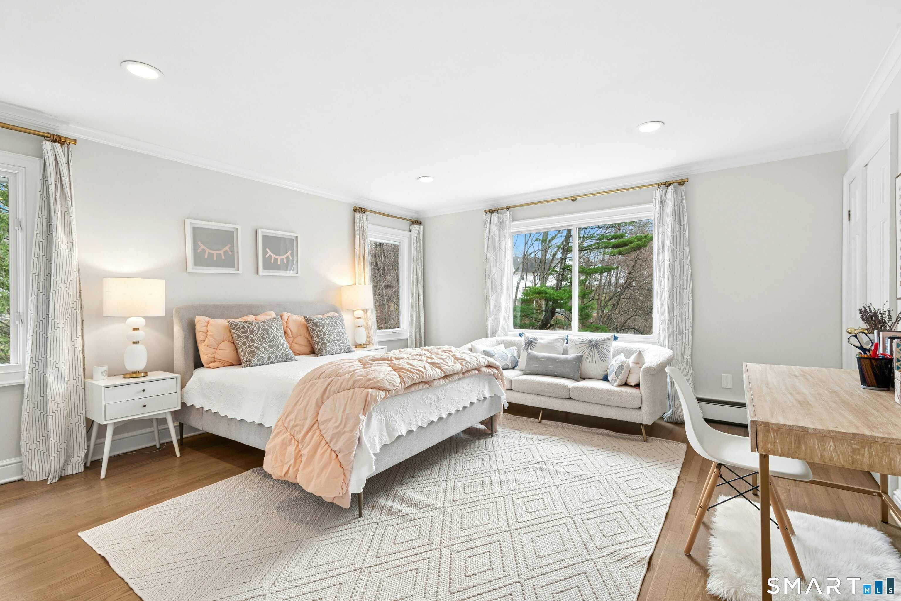 Rarely do you find a property that has it all: a spacious move-in ready house with a pool, and a private one-acre parcel close to everything Darien has to offer. Tucked away at the end of a cul-de-sac, steps away from the newly reimaged town center, and close to beaches, this thoughtfully renovated 5 bed/4. 5 bath home strikes just the right balance between comfortable living and sophistication. With tons of natural light, the first floor features an open living/dining room with access to the deck overlooking the pool, a kitchen with cozy banquette, family room with built-in desks and shelving, and a mudroom with laundry and custom cubbies. There are 4 spacious bedrooms and 3 baths upstairs, including a luxurious primary suite with vaulted ceiling, office, and generous walk-in closet and bathroom. The 5th bedroom, and 4th full bath, are in the walkout lower level which also offers a large "hang out" room with plenty of space for both relaxing and working out. For the car enthusiast, the detached barn, with heat and A/C, has an additional 2 garage bays as well as a workshop. Surrounded by nature, and awash with lush gardens, this is an unexpected oasis in the center of town.