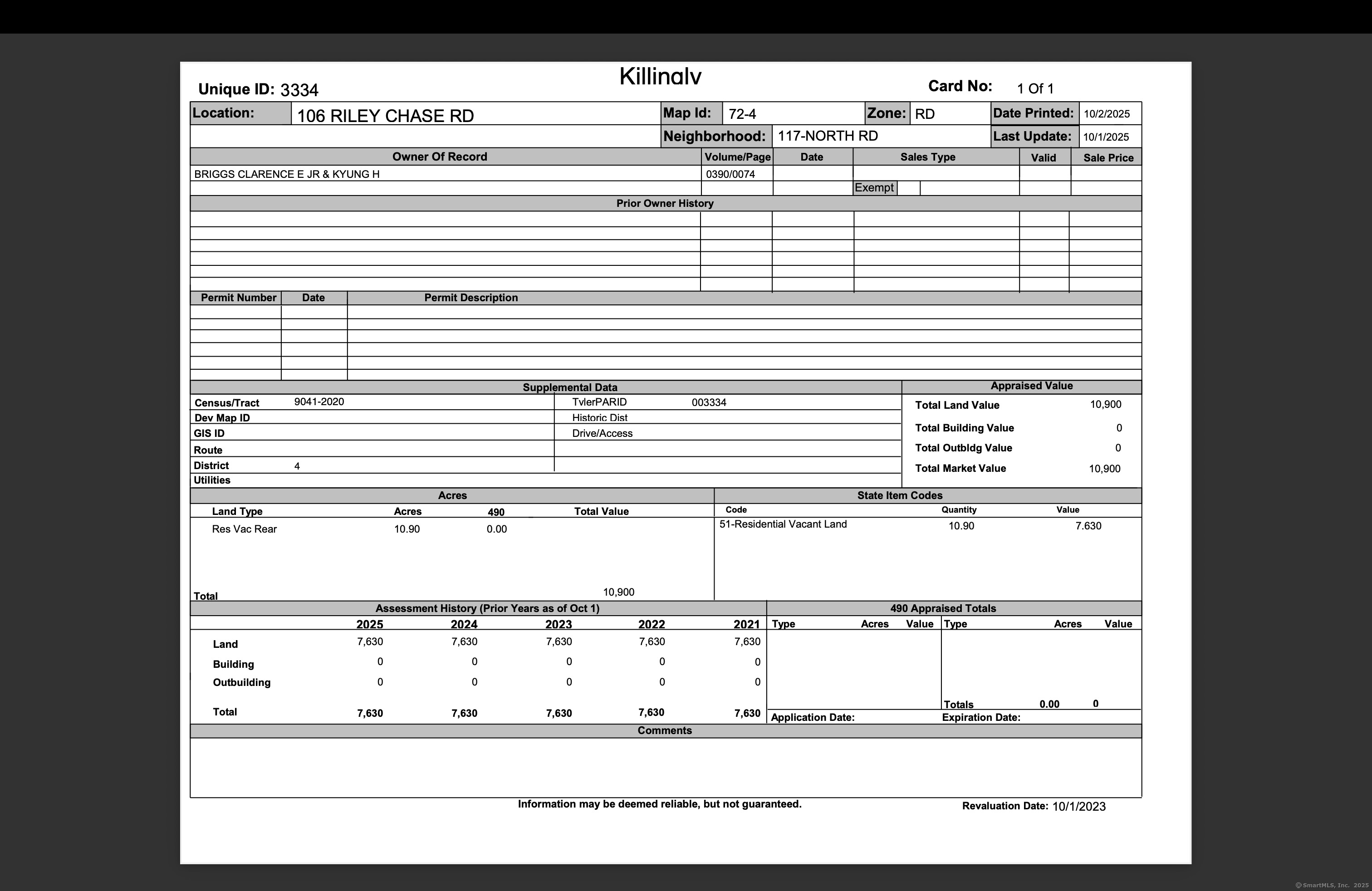 Discover the perfect opportunity to build your dream home or create a private retreat on this beautiful 10. 9-acre parcel located at 106 Riley Chase Road, Killingly, CT. Nestled in a quiet, rural setting, this expansive property offers plenty of space, privacy, and natural beauty. The gently rolling terrain provides multiple potential building sites, while the mature trees and natural landscape create a peaceful backdrop. Key Features: * 10. 9 acres of versatile land * Ideal for a single-family home, mini farm, or recreational getaway * Surrounded by nature with plenty of privacy * Easy access to major roads and nearby amenities * Located in a low-traffic, country setting while still being close to town Conveniently situated near the Rhode Island border and just a short drive to I-395, this property combines tranquility with accessibility. Whether you're looking to build now or invest for the future, this is an excellent opportunity at an affordable price point. Don't miss out on this peaceful slice of New England countryside. Schedule a walk-through today and imagine the possibilities! Buyer to do own due diligence and confirm zoning approval.