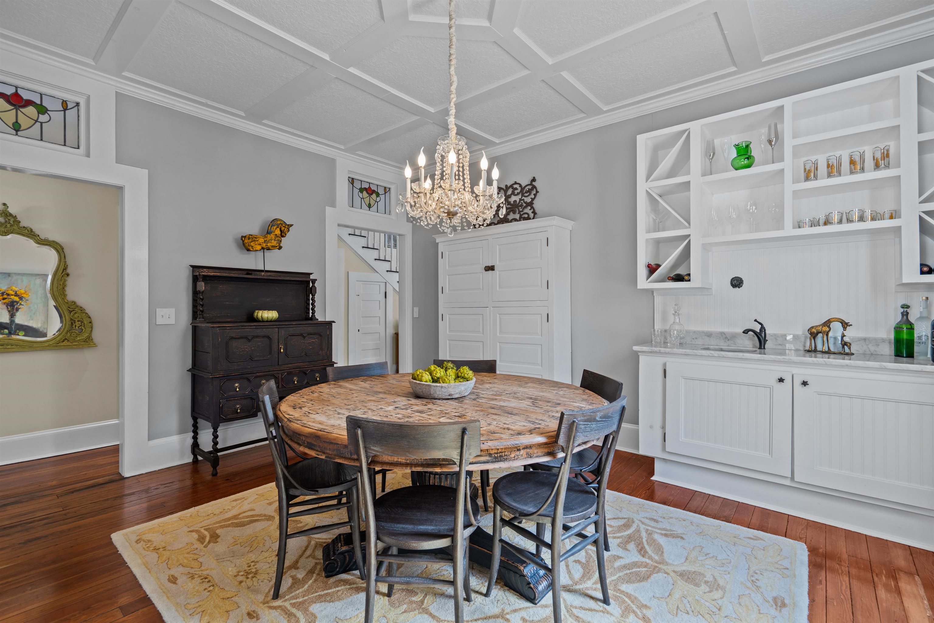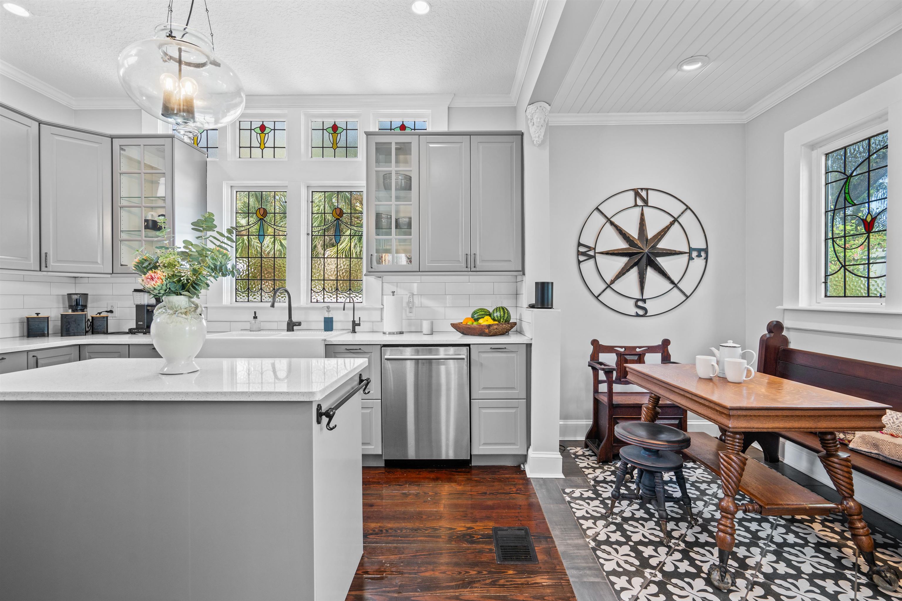 Historic Elegance Revived: Charming 4-Bedroom Home with timeless appeal in the heart of Henry Flagler's original neighborhood. This enchanting residence, circa 1910, stands as a testament to Saint Augustine's rich history. Beyond the white picket fence and landscaping, discover a meticulously restored four-bedroom, two-bath home that seamlessly merges the allure of its historic era with modern conveniences. A welcoming entry sets the tone, leading to a spacious living room adorned with a gas fireplace, built-in bookshelves, and an eye-catching staircase, showcasing the timeless charm of this two-story downtown home. The newly remodeled kitchen is a chef's dream, featuring quartz countertops, high-end stainless appliances, a state-of-the-art double oven, upgraded cabinetry, custom light fixtures, and breathtaking stained-glass windows. A recently added breakfast nook enhances the space. This income producing property, RG1 zoning/nightly rentals property is a must see. The formal dining room, adjacent to the kitchen, provides an ideal space for entertaining, boasting crown molding, upgradedlighting, coffered ceilings, and a convenient wet bar. The first level also hosts a full bath, laundry room with doors originatingfrom the Henry Flagler Building, original heart wood flooring throughout, and numerous custom-built-ins. Ascending the eye-catching staircase, the second level reveals a generous master bedroom, three additional bedrooms, and a lavish bathfeaturing a custom walk-in shower with stained glass transom windows and a seamless glass enclosure. Situated on a cornerlot, brick- paved walkways, and patios, creating a picturesque setting. while the low-maintenance, pollinator-friendly gardensare thoughtfully irrigated, creating a serene and Eco-friendly oasis. A carriage house and an expansive newly restored, wrap-around porch add to the character and functionality of the property. This home seamlessly combines historic charm withmodern luxury.
