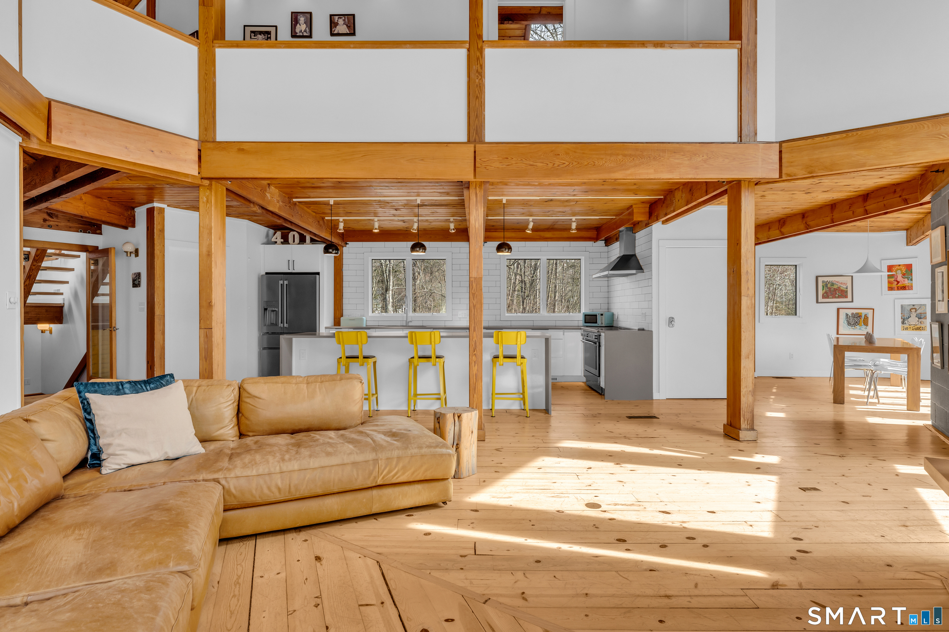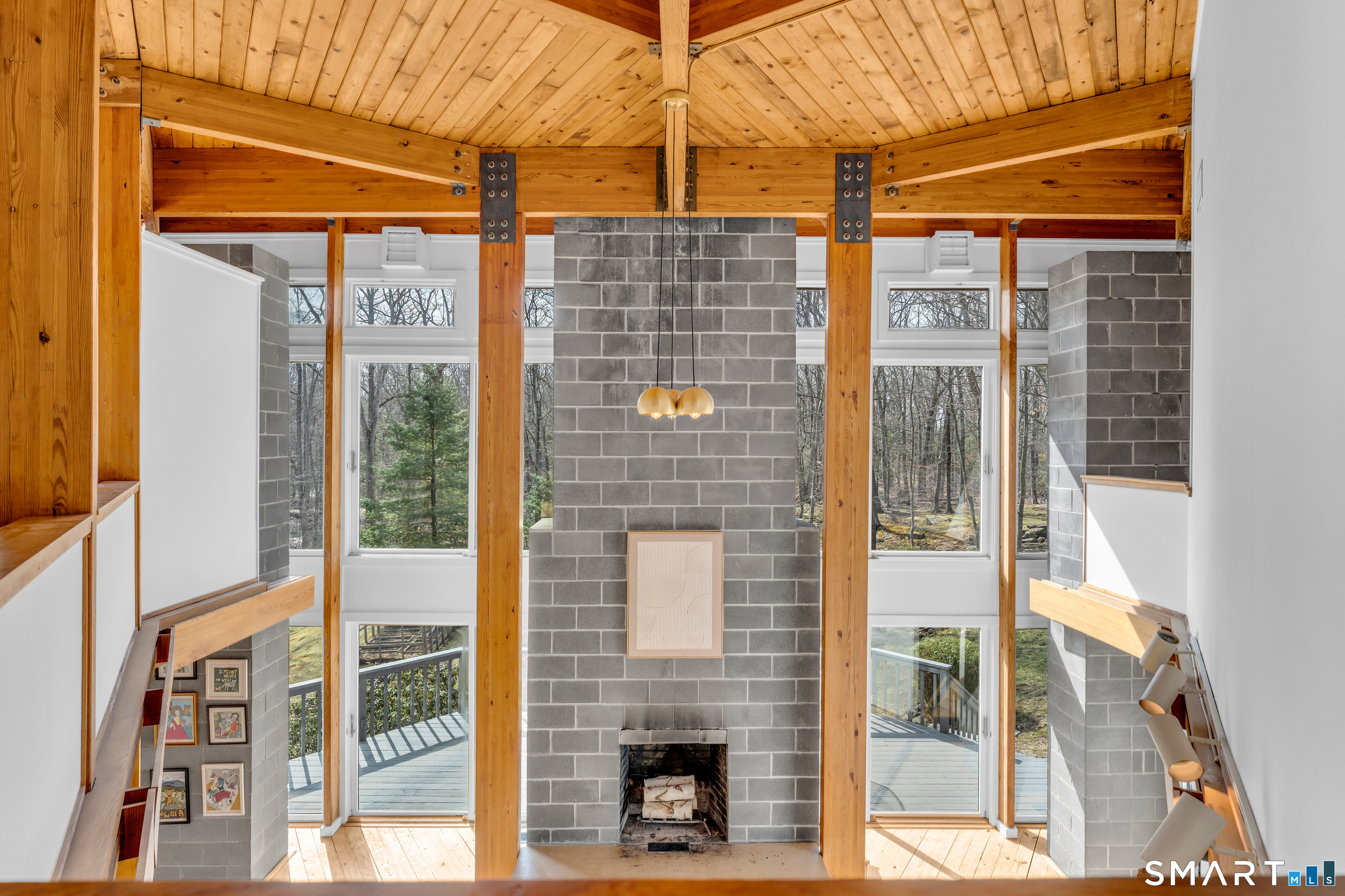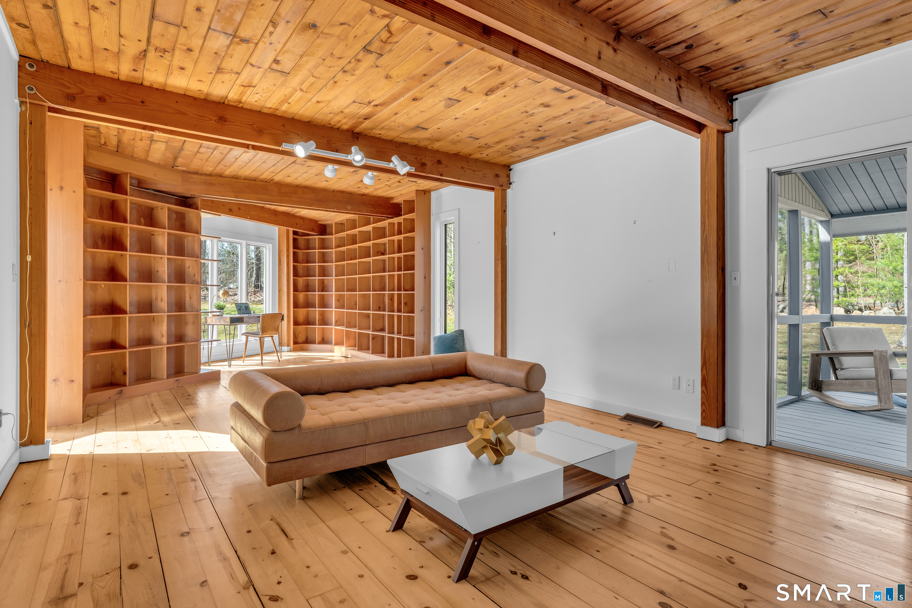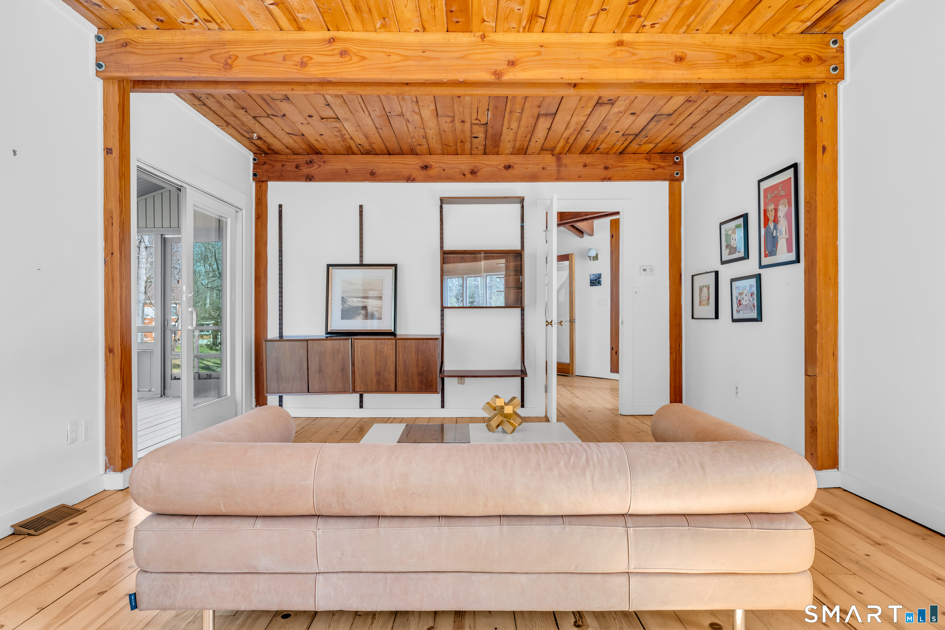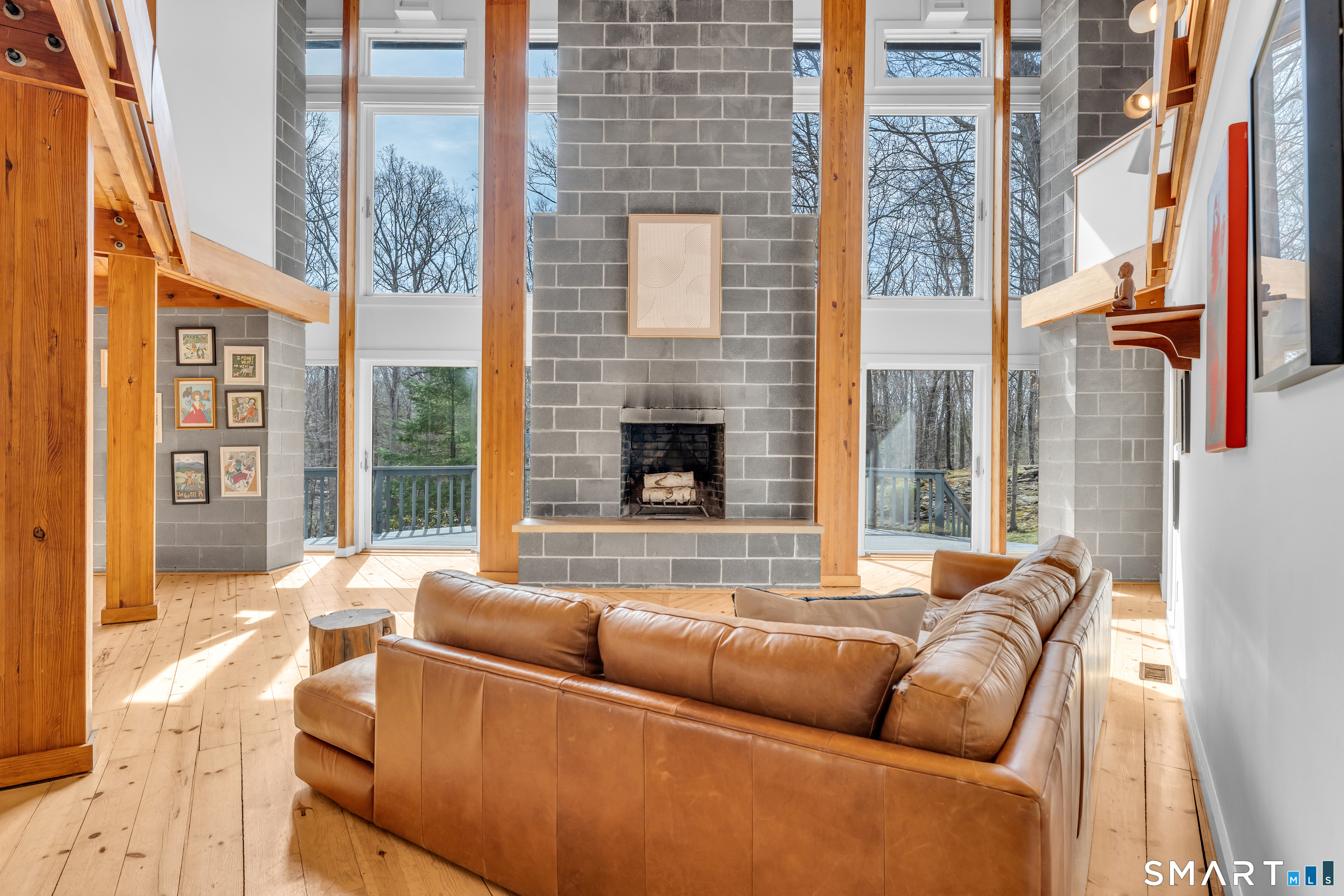 Just minutes to downtown Guilford, this striking 4 bedroom contemporary offers exceptional living space & bold architectural design. A dramatic floating staircase & soaring ceilings create an unforgettable first impression the moment you enter. The expansive great room is the heart of the home, featuring a stunning floor to ceiling fireplace, walls of glass that fill the space with natural light, and an open dining area perfect for everyday living and entertaining. Glass doors lead to an oversized deck overlooking a breathtaking, private backyard, creating seamless indoor and outdoor entertaining The newly completely remodeled custom kitchen is a true showpiece with abundant cabinetry, a massive center island, and dramatic waterfall countertops that combine beauty and function. Additional flexible living space includes an oversized family room or library with double walls of custom built ins, ideal for book lovers, or work from home setup. From here, step directly into the inviting screened porch that extends your living space outdoors. The second floor features 4 plus bedrooms and two beautifully updated bathrooms. The spacious primary suite includes an adjoining bonus room perfect for a home office, yoga studio, dressing room, or private sitting area. This exceptional home offers style, space, and versatility in an unbeatable location just minutes to the train, major highways, beaches, restaurants, and the historic Guilford Green.