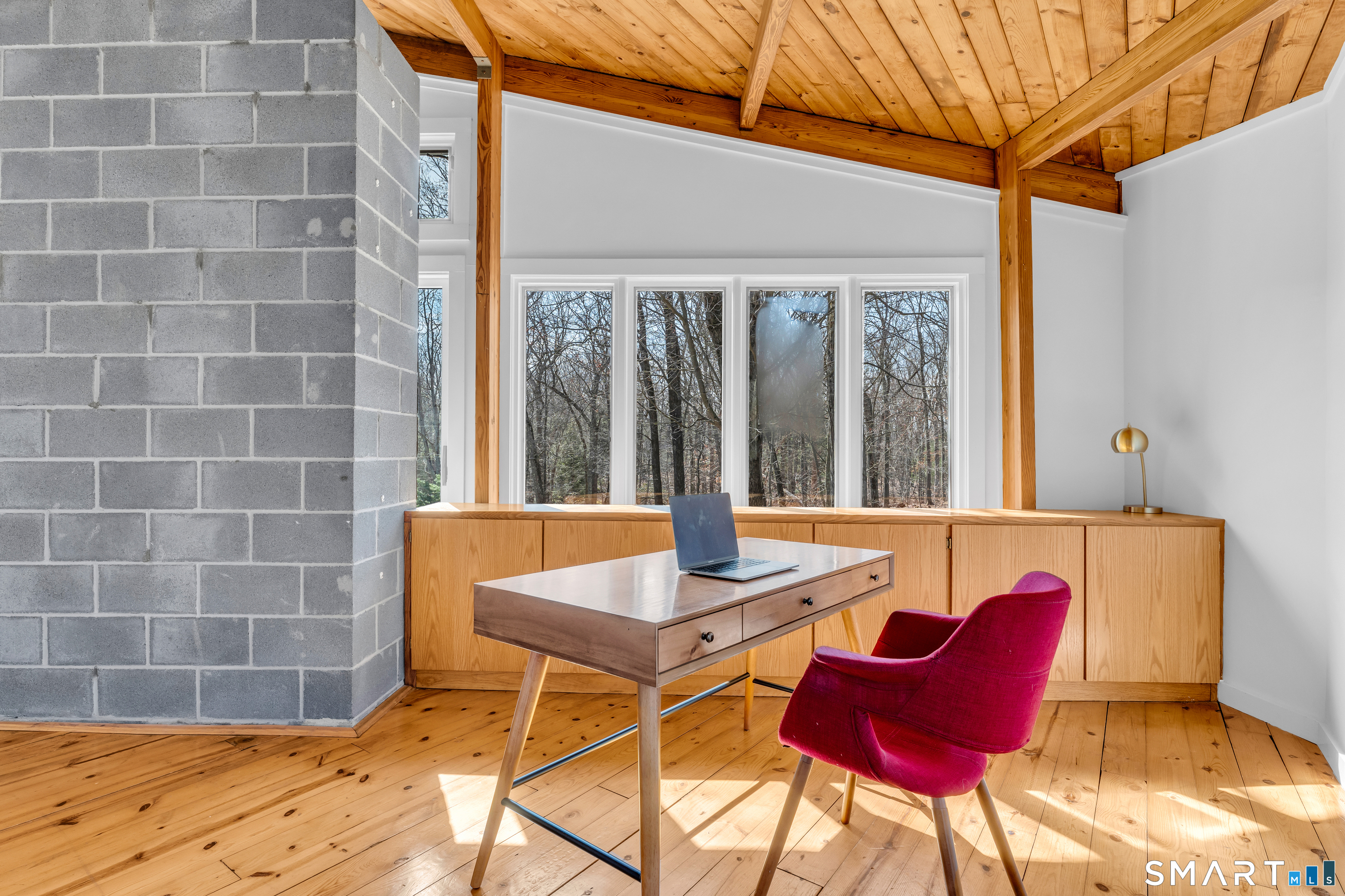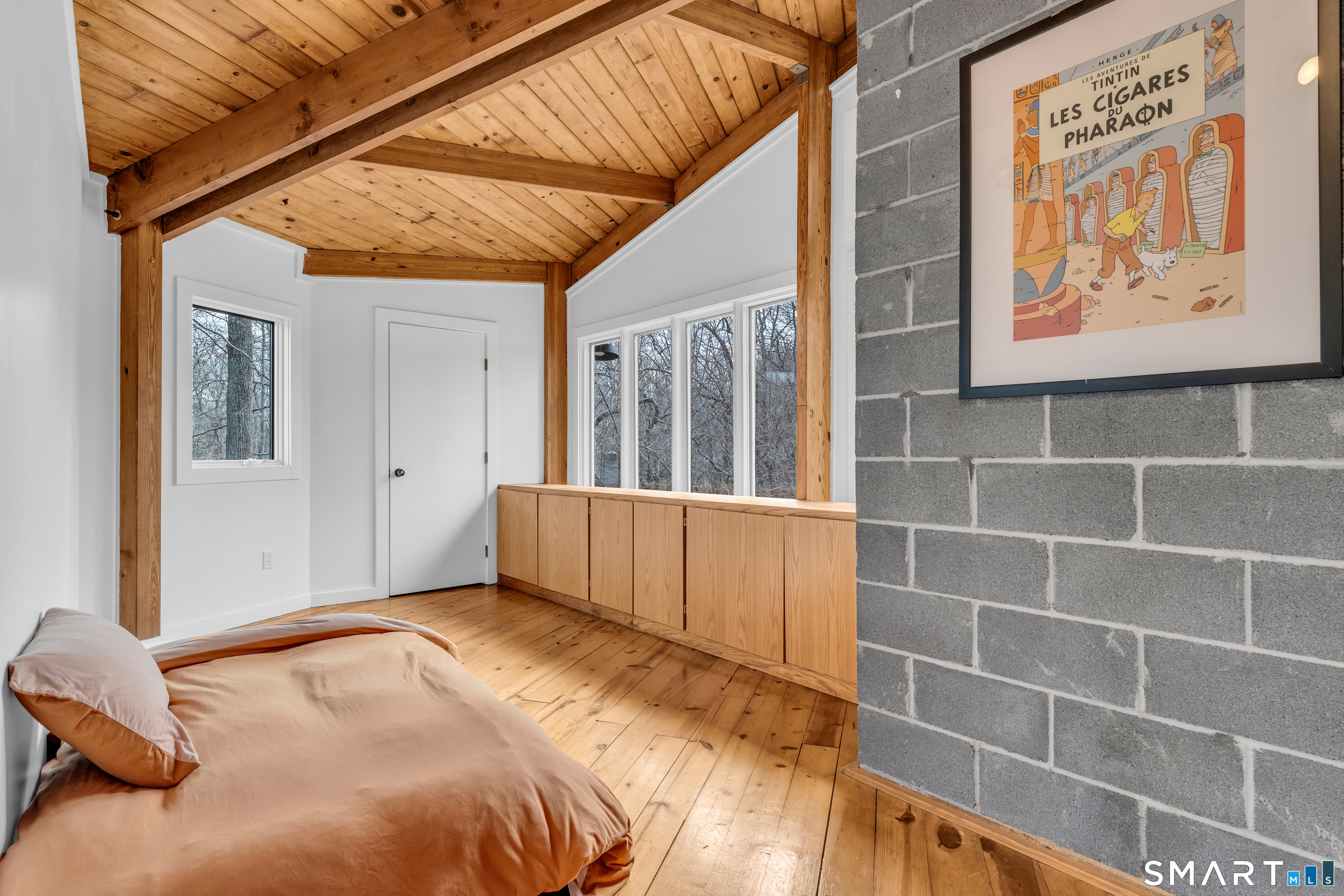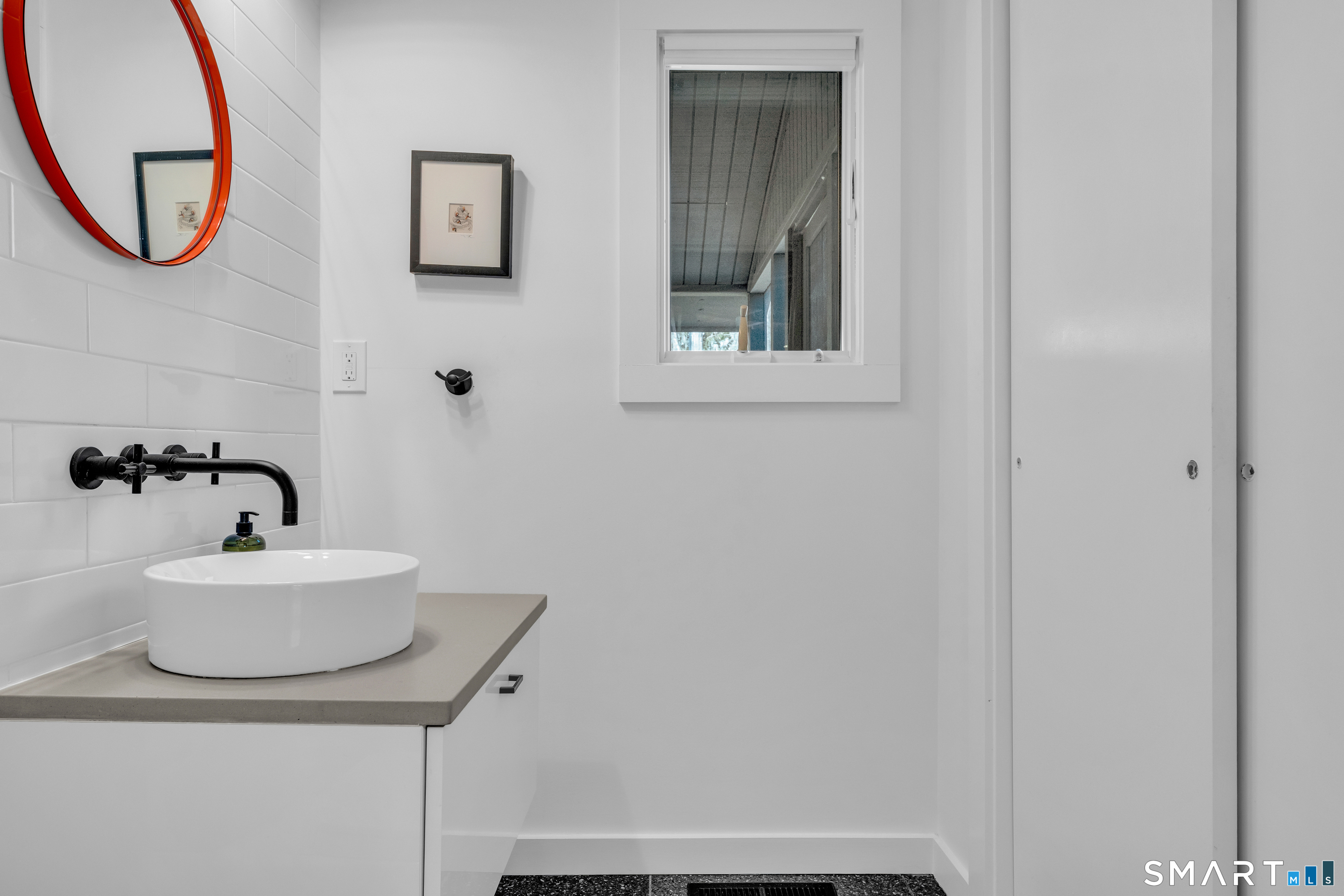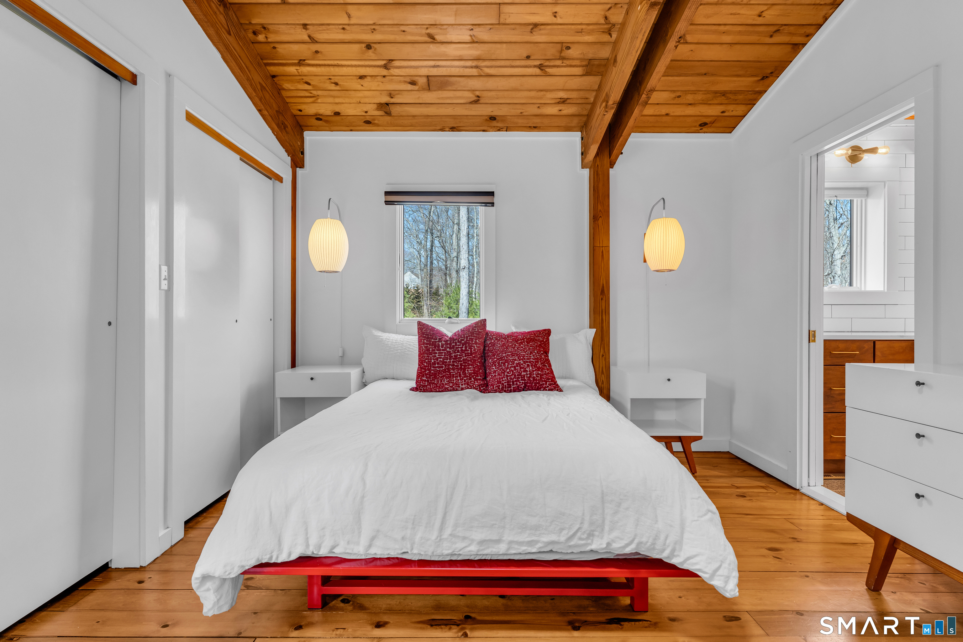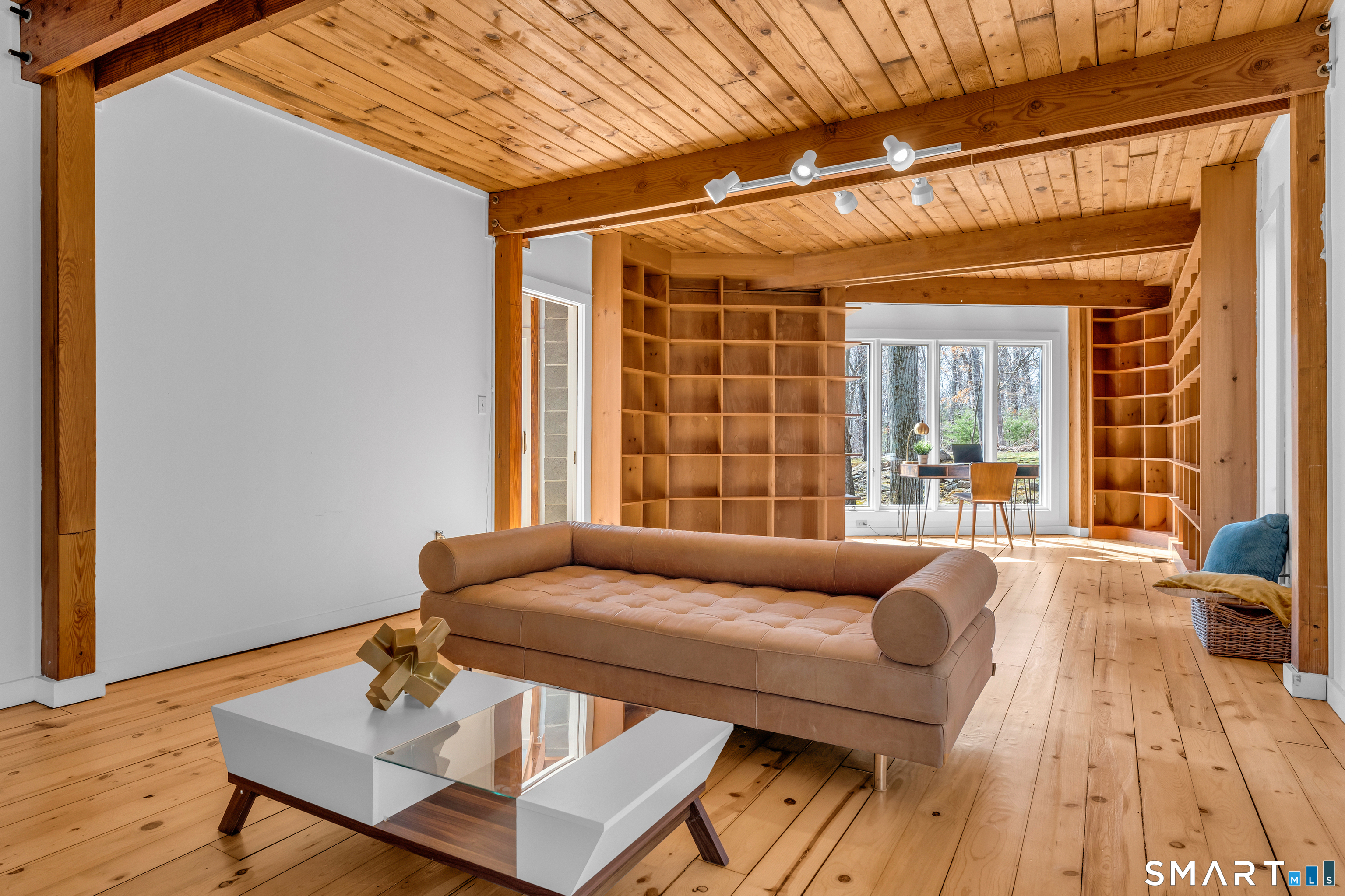 Just minutes to downtown Guilford, this striking 4 bedroom contemporary offers exceptional living space & bold architectural design. A dramatic floating staircase & soaring ceilings create an unforgettable first impression the moment you enter. The expansive great room is the heart of the home, featuring a stunning floor to ceiling fireplace, walls of glass that fill the space with natural light, and an open dining area perfect for everyday living and entertaining. Glass doors lead to an oversized deck overlooking a breathtaking, private backyard, creating seamless indoor and outdoor entertaining The newly completely remodeled custom kitchen is a true showpiece with abundant cabinetry, a massive center island, and dramatic waterfall countertops that combine beauty and function. Additional flexible living space includes an oversized family room or library with double walls of custom built ins, ideal for book lovers, or work from home setup. From here, step directly into the inviting screened porch that extends your living space outdoors. The second floor features 4 plus bedrooms and two beautifully updated bathrooms. The spacious primary suite includes an adjoining bonus room perfect for a home office, yoga studio, dressing room, or private sitting area. This exceptional home offers style, space, and versatility in an unbeatable location just minutes to the train, major highways, beaches, restaurants, and the historic Guilford Green.