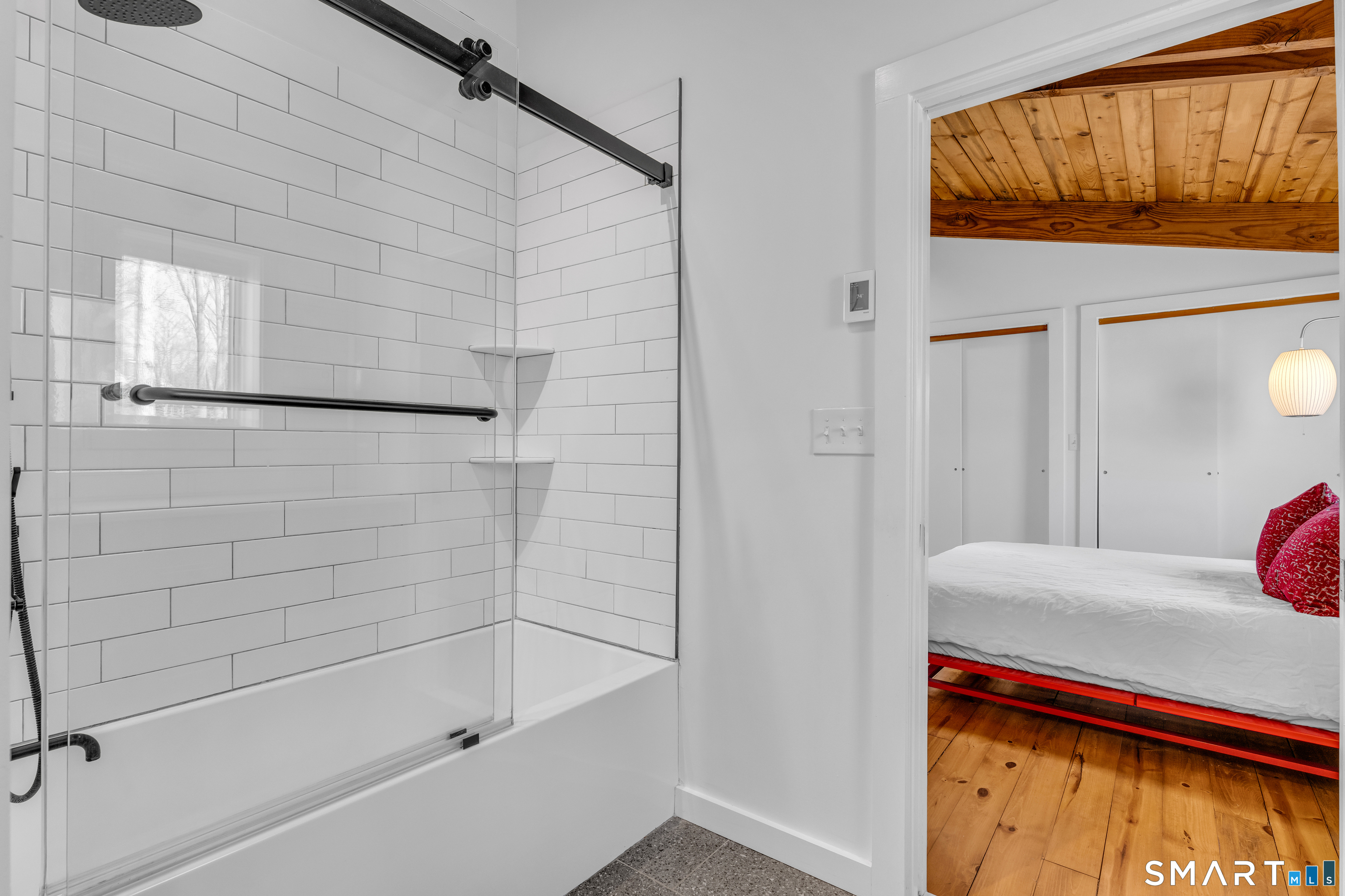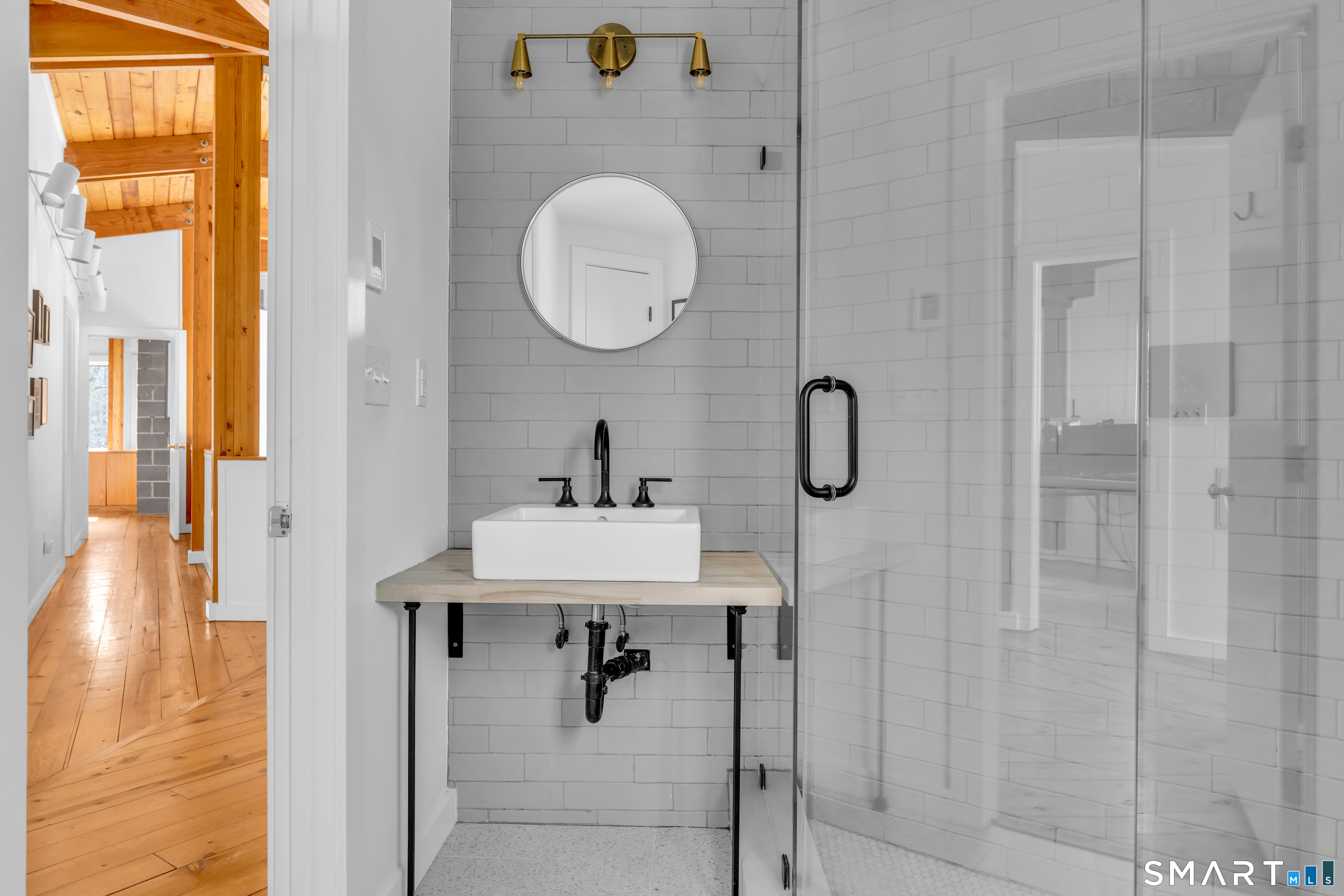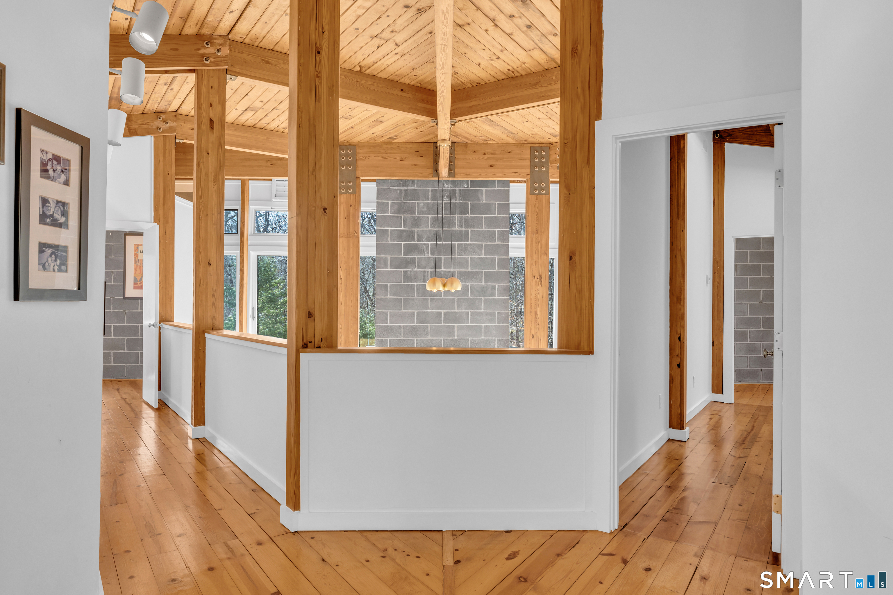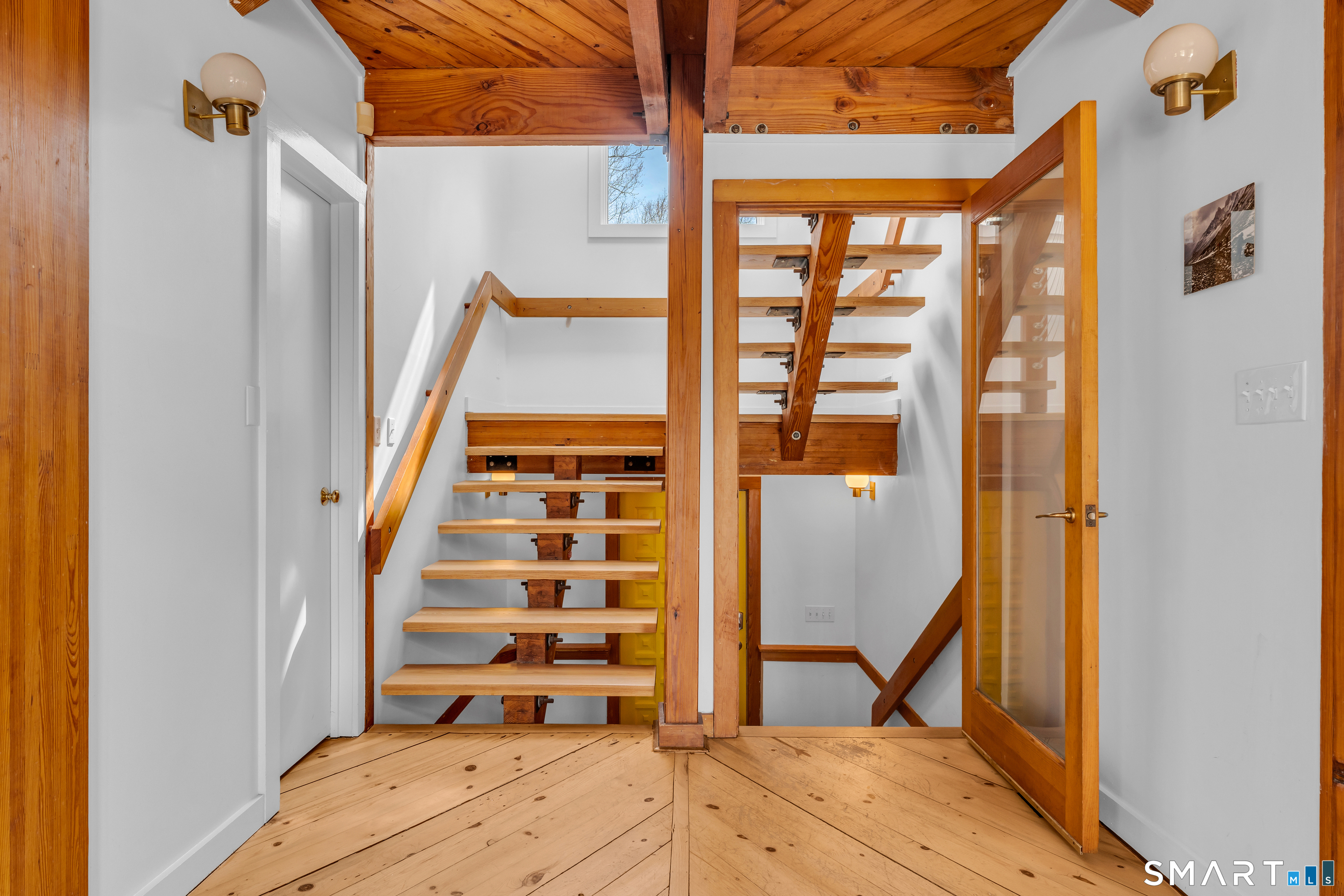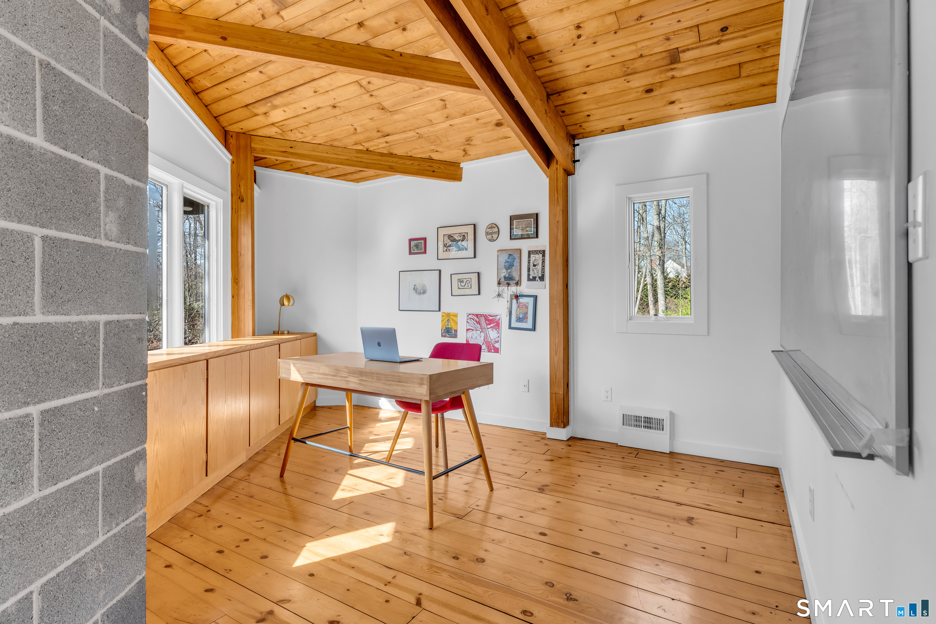 Just minutes to downtown Guilford, this striking 4 bedroom contemporary offers exceptional living space & bold architectural design. A dramatic floating staircase & soaring ceilings create an unforgettable first impression the moment you enter. The expansive great room is the heart of the home, featuring a stunning floor to ceiling fireplace, walls of glass that fill the space with natural light, and an open dining area perfect for everyday living and entertaining. Glass doors lead to an oversized deck overlooking a breathtaking, private backyard, creating seamless indoor and outdoor entertaining The newly completely remodeled custom kitchen is a true showpiece with abundant cabinetry, a massive center island, and dramatic waterfall countertops that combine beauty and function. Additional flexible living space includes an oversized family room or library with double walls of custom built ins, ideal for book lovers, or work from home setup. From here, step directly into the inviting screened porch that extends your living space outdoors. The second floor features 4 plus bedrooms and two beautifully updated bathrooms. The spacious primary suite includes an adjoining bonus room perfect for a home office, yoga studio, dressing room, or private sitting area. This exceptional home offers style, space, and versatility in an unbeatable location just minutes to the train, major highways, beaches, restaurants, and the historic Guilford Green.