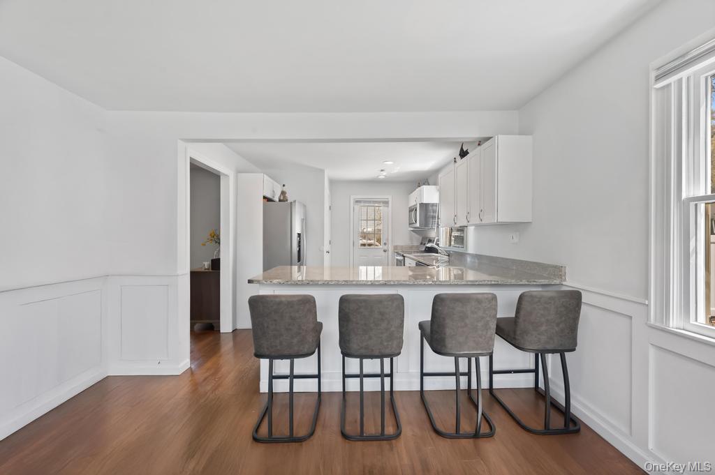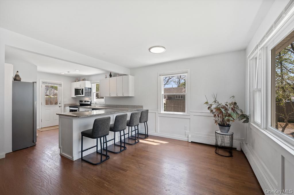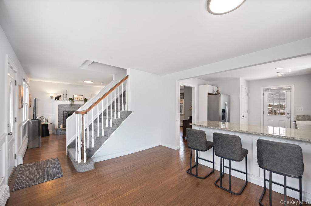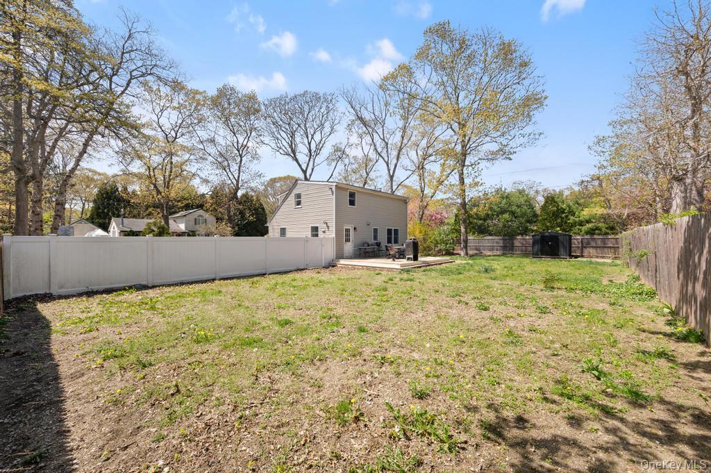 Updated 3 Bedroom 1 1/2 Bath Cape on a Corner Lot! This beautifully updated home features an open-concept layout with wood floors and a cozy wood-burning fireplace in the living room. The bright open eat-in kitchen has granite countertops, Stainless steel appliances, large pantry with L-shaped peninsula for seating, perfect for entertaining. Formal Dining Room. Upstairs has 3 bedrooms with a full bathroom. New flooring in bedrooms. Full basement includes washer dryer hookup, utilities, and convenient outdoor access. Extra large 6 car driveway. Great backyard with deck. New fence. Backyard access for boat/camper storage. Low Taxes!! Just a short walk to the Forge River Marina! A must-see gem!