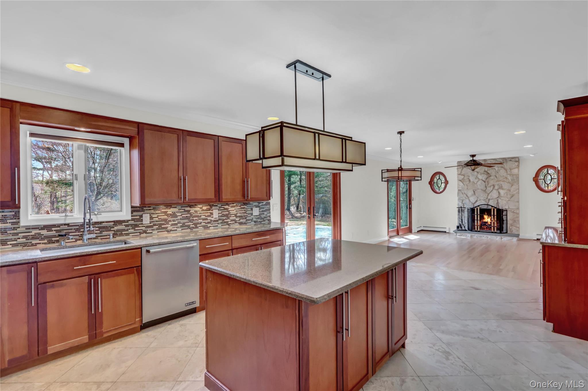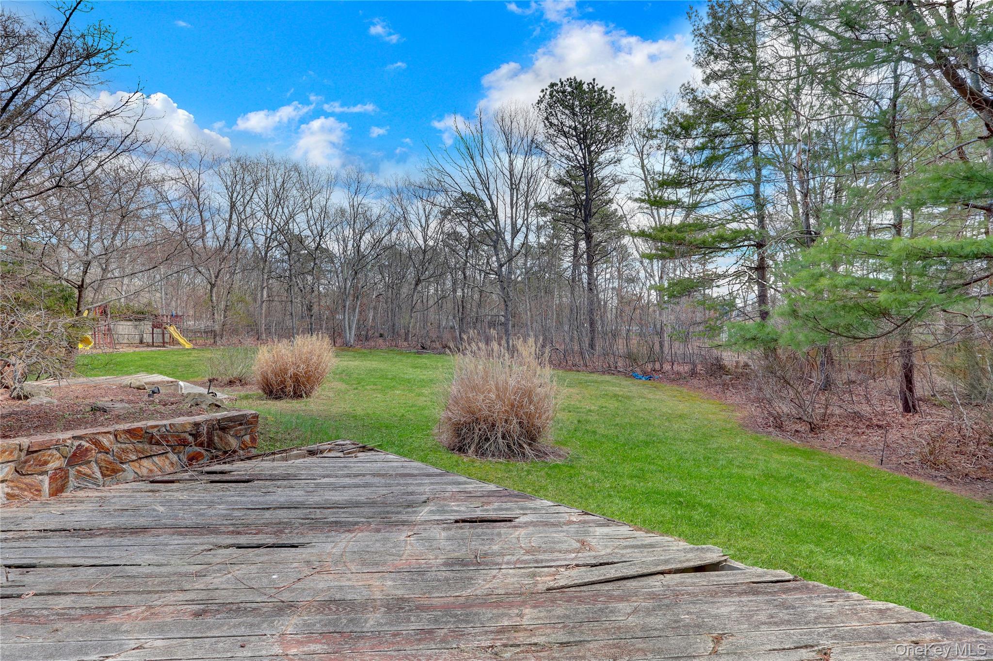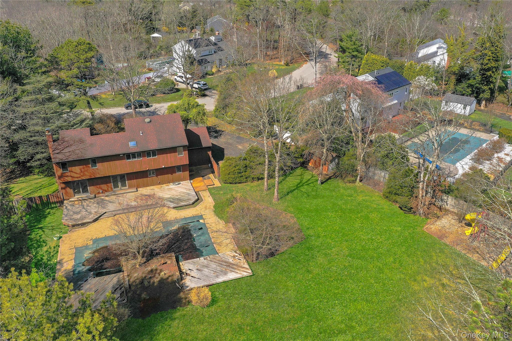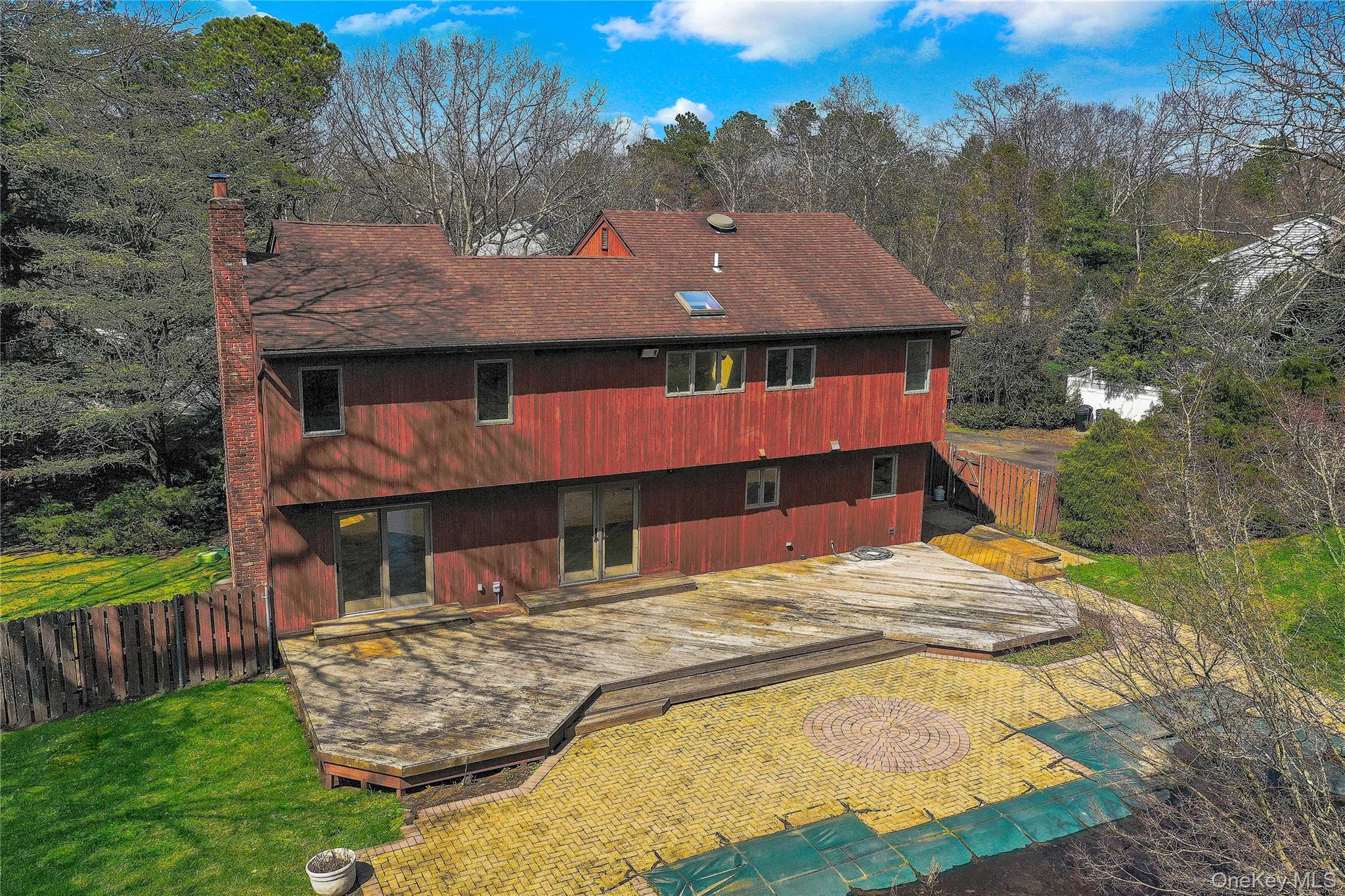 Set on nearly an acre in the heart of Miller Place, this striking contemporary residence offers a rare opportunity to own a private retreat designed for both everyday comfort and exceptional entertaining. From the moment you enter, soaring vaulted ceilings and expansive skylights flood the home with natural light, creating an open, airy ambience throughout the main living spaces. The thoughtfully designed layout flows seamlessly from a welcoming entry foyer to a formal dining room and an inviting den anchored by a wood-burning fireplace-ideal for intimate gatherings or relaxed evenings at home. At the center of the home is a spacious eat-in kitchen appointed with granite countertops, stainless steel appliances, and a dedicated service area complete with a wine cooler-perfect for hosting with ease and style. The primary suite offers a true sense of retreat, featuring generous proportions, dual walk-in closets, and a spa-inspired en-suite bath with a jetted tub and refined finishes. Additional bedrooms provide flexibility for guests, home office space, or growing households. The full finished basement elevates the home's entertainment appeal, featuring a custom bar and a dedicated theater area-creating a versatile space for game nights, celebrations, or private screenings. Outdoors, the property transforms into your own resort-style escape. A wraparound deck overlooks the expansive grounds, where a gunite in-ground pool and spa set the stage for summer living, outdoor entertaining, and tranquil relaxation-all surrounded by the privacy and scale that nearly an acre affords. Additional highlights include a tankless hot water system, updated finishes throughout, and a two-car garage with ample parking. With its generous footprint, unique architectural character, and exceptional outdoor setting, this home offers not just a residence-but a lifestyle. Whether enjoyed as-is or further customized, the possibilities here are substantial