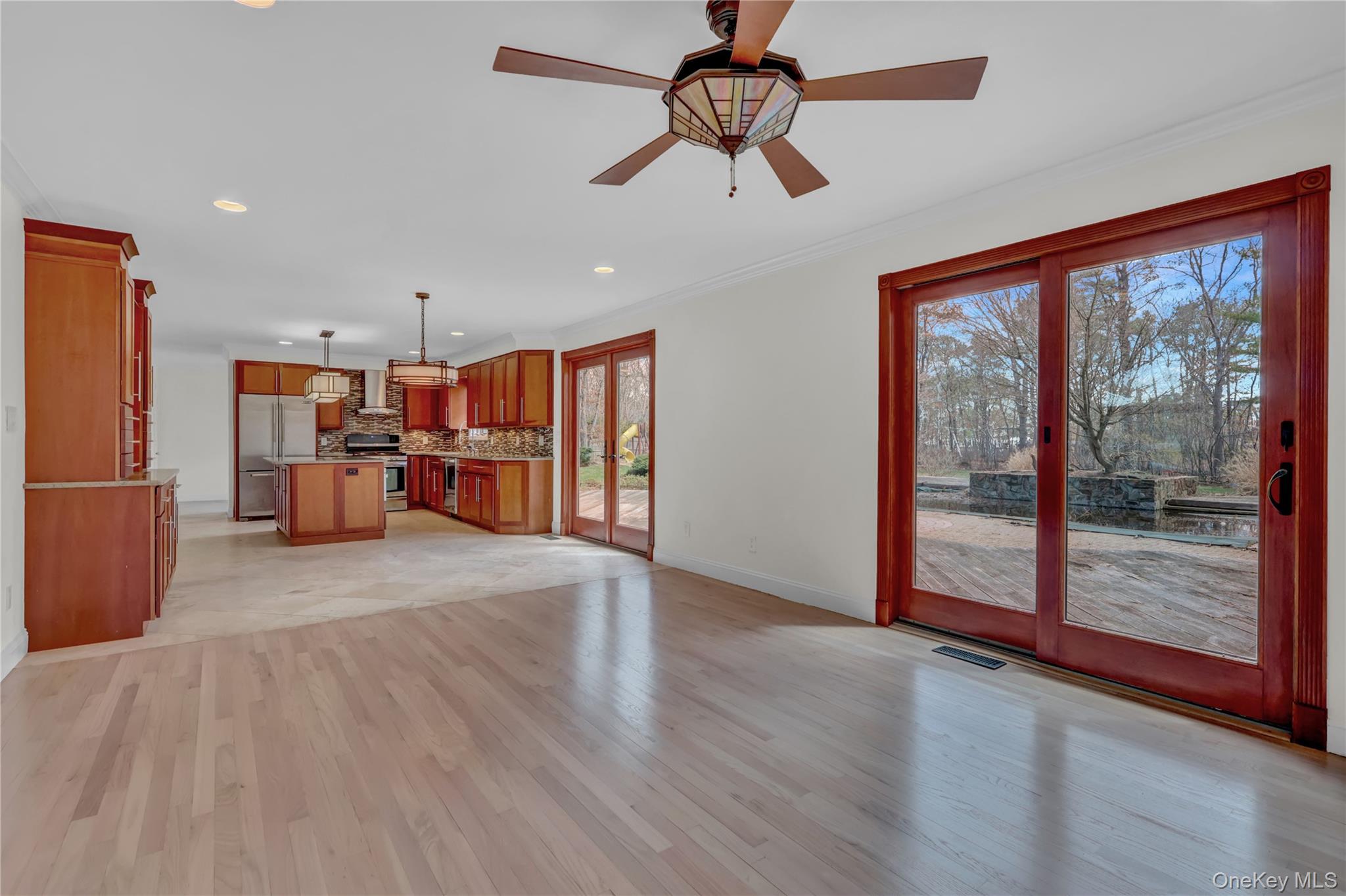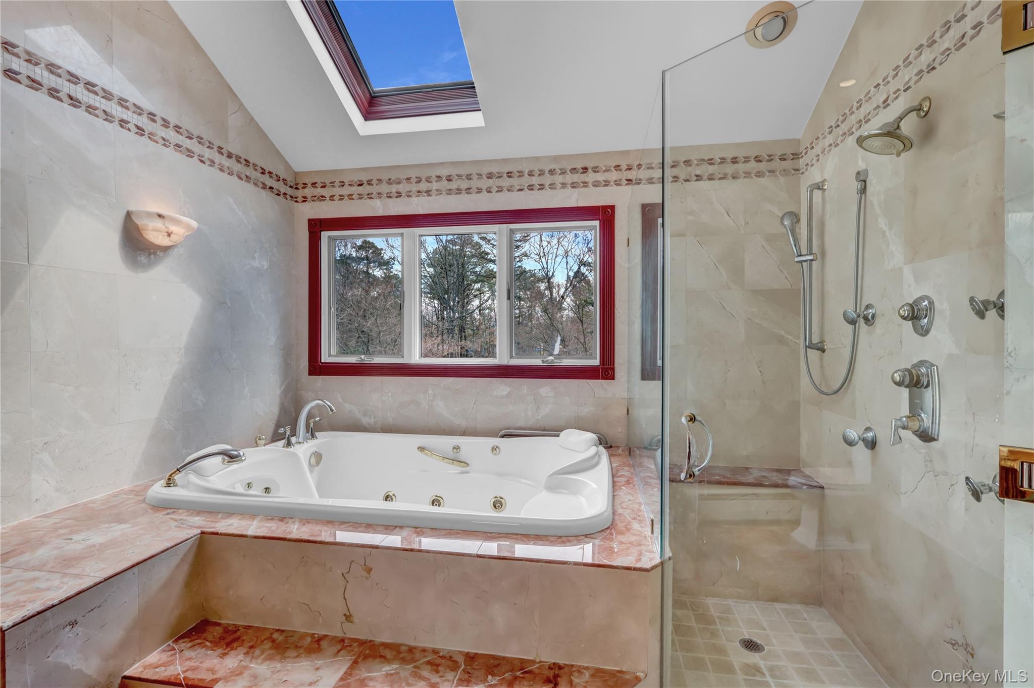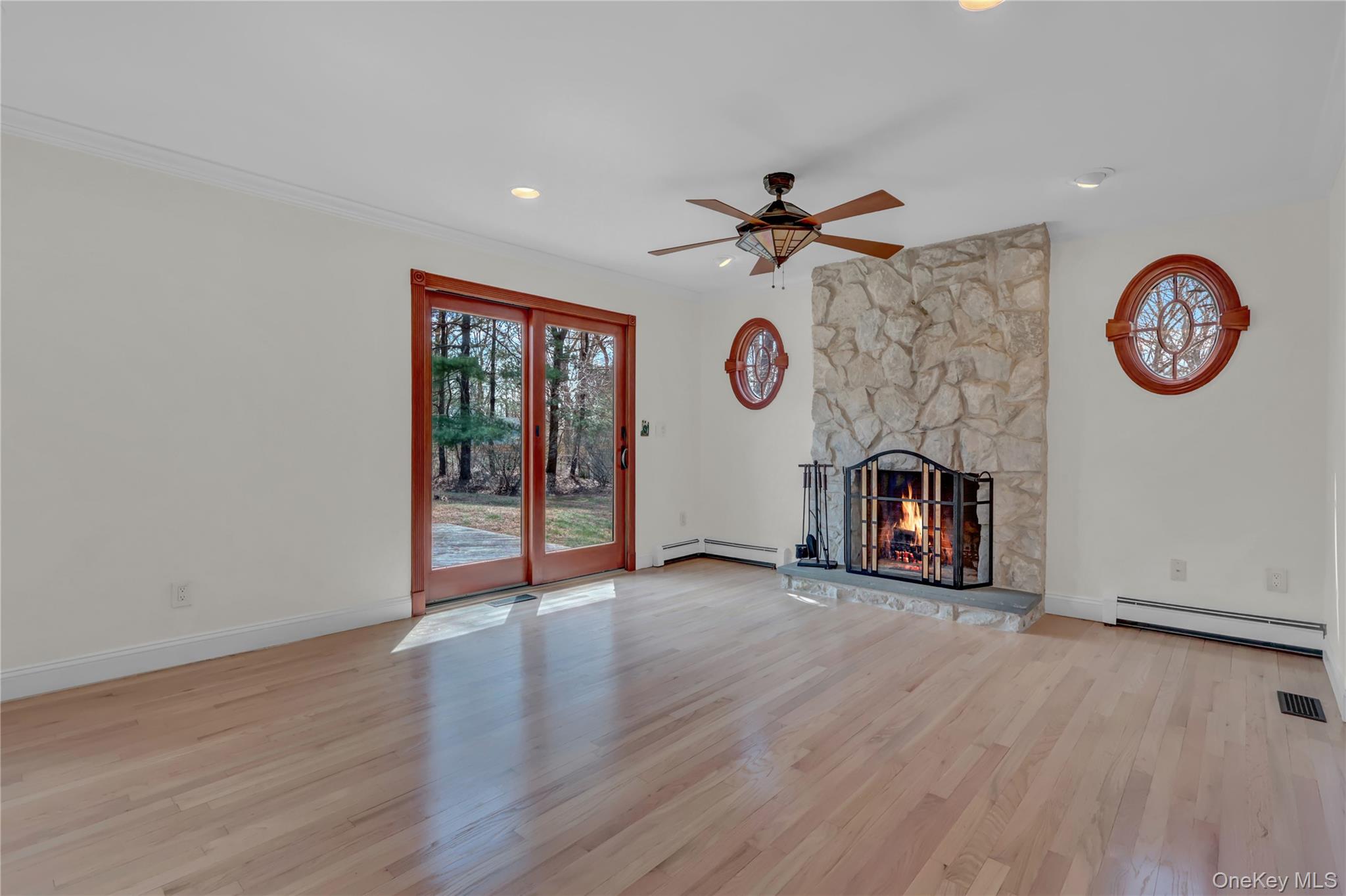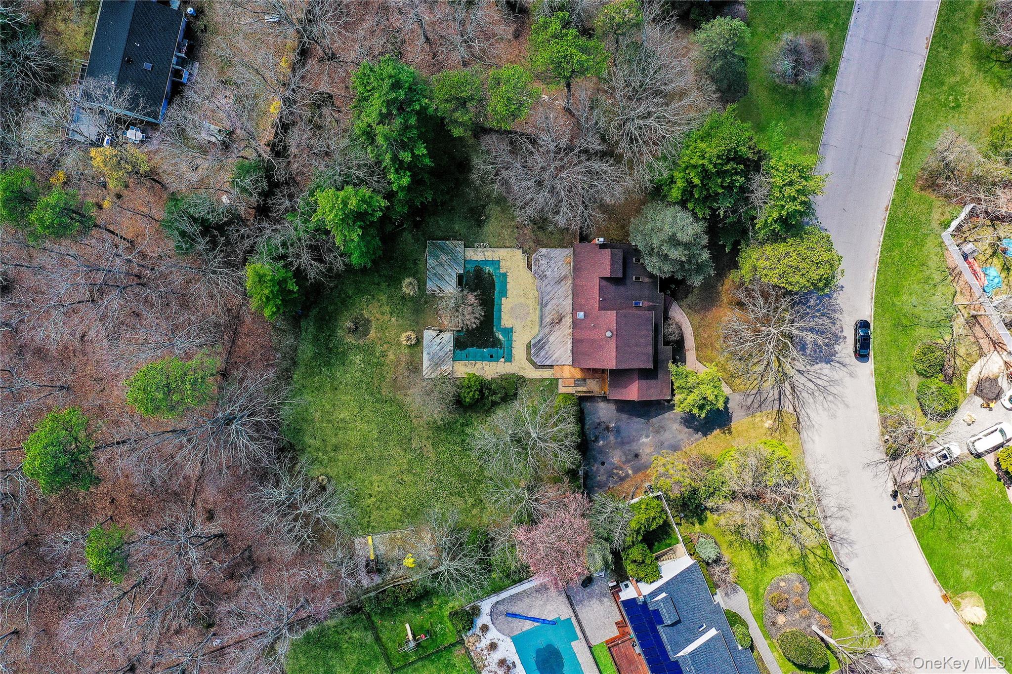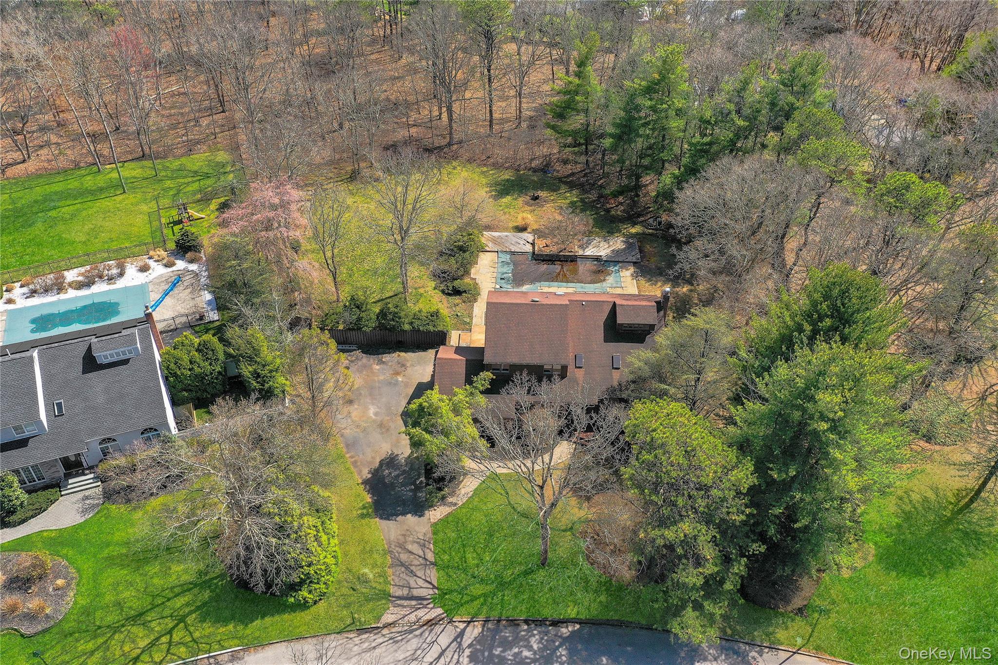 Set on nearly an acre in the heart of Miller Place, this striking contemporary residence offers a rare opportunity to own a private retreat designed for both everyday comfort and exceptional entertaining. From the moment you enter, soaring vaulted ceilings and expansive skylights flood the home with natural light, creating an open, airy ambience throughout the main living spaces. The thoughtfully designed layout flows seamlessly from a welcoming entry foyer to a formal dining room and an inviting den anchored by a wood-burning fireplace-ideal for intimate gatherings or relaxed evenings at home. At the center of the home is a spacious eat-in kitchen appointed with granite countertops, stainless steel appliances, and a dedicated service area complete with a wine cooler-perfect for hosting with ease and style. The primary suite offers a true sense of retreat, featuring generous proportions, dual walk-in closets, and a spa-inspired en-suite bath with a jetted tub and refined finishes. Additional bedrooms provide flexibility for guests, home office space, or growing households. The full finished basement elevates the home's entertainment appeal, featuring a custom bar and a dedicated theater area-creating a versatile space for game nights, celebrations, or private screenings. Outdoors, the property transforms into your own resort-style escape. A wraparound deck overlooks the expansive grounds, where a gunite in-ground pool and spa set the stage for summer living, outdoor entertaining, and tranquil relaxation-all surrounded by the privacy and scale that nearly an acre affords. Additional highlights include a tankless hot water system, updated finishes throughout, and a two-car garage with ample parking. With its generous footprint, unique architectural character, and exceptional outdoor setting, this home offers not just a residence-but a lifestyle. Whether enjoyed as-is or further customized, the possibilities here are substantial