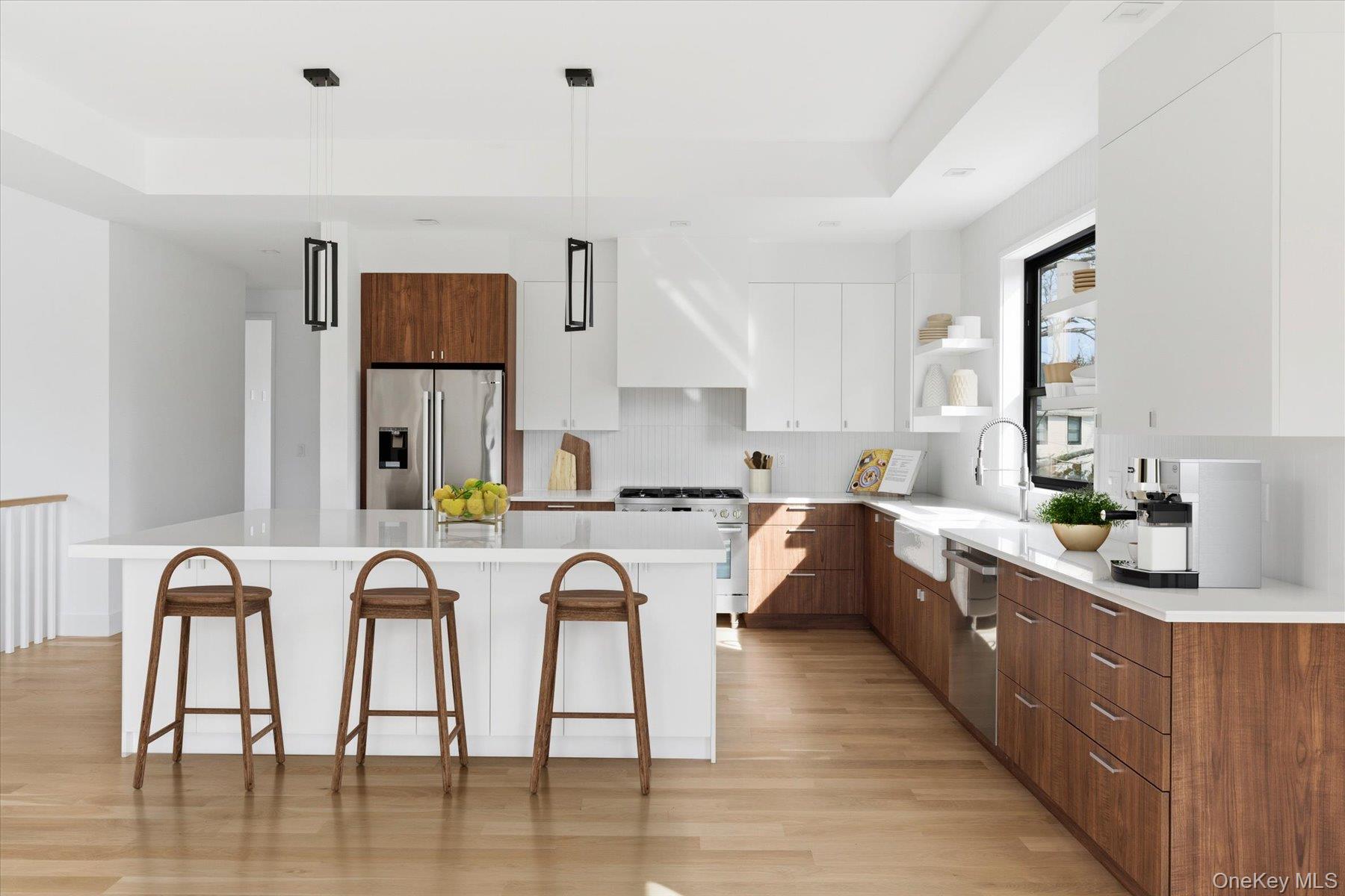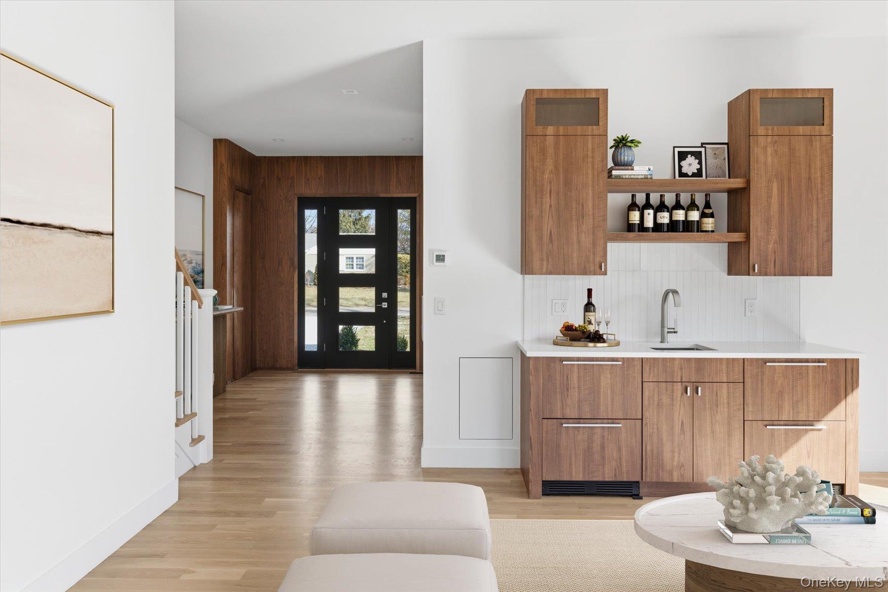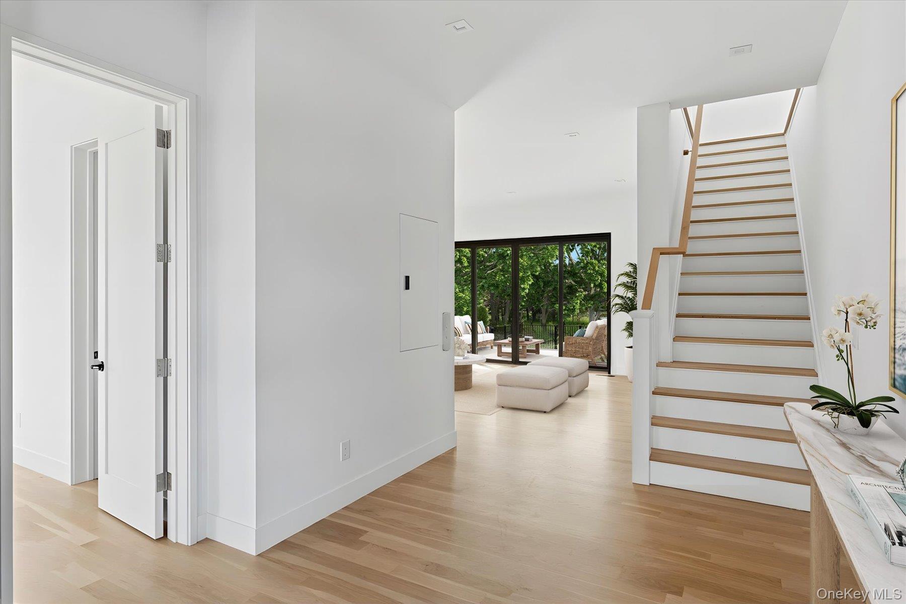 Set along the scenic shores of Goose Creek, this newly constructed waterfront home offers a private dock with direct boating access to the Peconic Bay, an increasingly rare offering on the North Fork. Combining new construction with waterfront access, the property delivers a lifestyle that is difficult to replicate. Thoughtfully designed for both everyday living and entertaining, the home features four bedrooms and five-and-a-half baths across a well-planned layout. The main level includes a spacious living room with a wet bar and dumbwaiter, seamlessly connected to a gourmet kitchen and dining area, along with two bedrooms. The upper level offers a primary suite and an additional guest bedroom, both with access to an oversized deck overlooking Goose Creek. Designed for summer living, the outdoor space includes a pool and expansive patio set against a tranquil waterfront backdrop, ideal for entertaining or enjoying the peaceful surroundings. Additional features include a garage and a full unfinished lower level offering exceptional potential for customization and added value. Located in the heart of Southold, just minutes from vineyards, beaches, and renowned North Fork destinations, this is a rare opportunity to own new construction waterfront with private dock access. This listing may include images that have been digitally altered or virtually staged. Original, unedited images are available upon request.