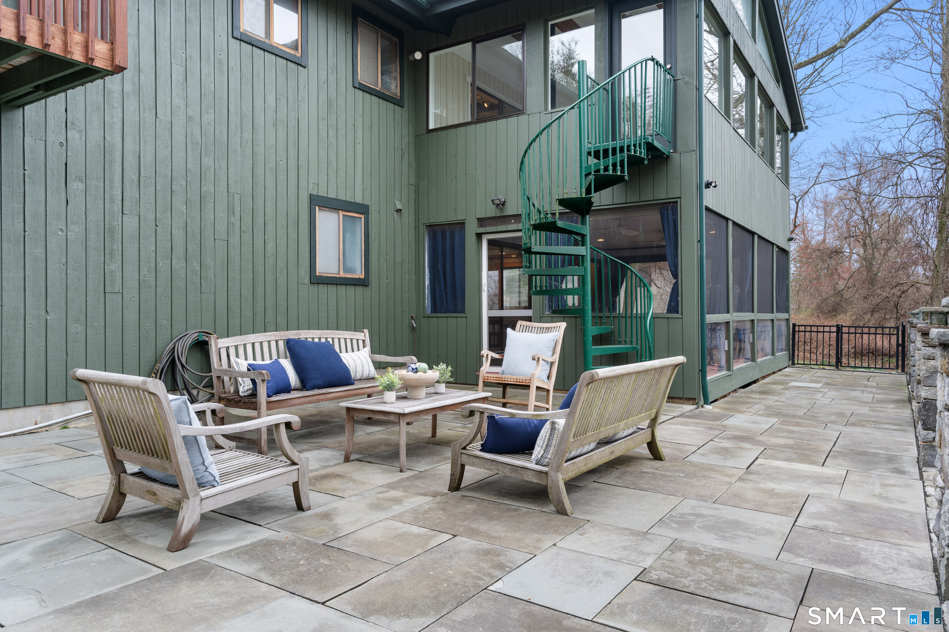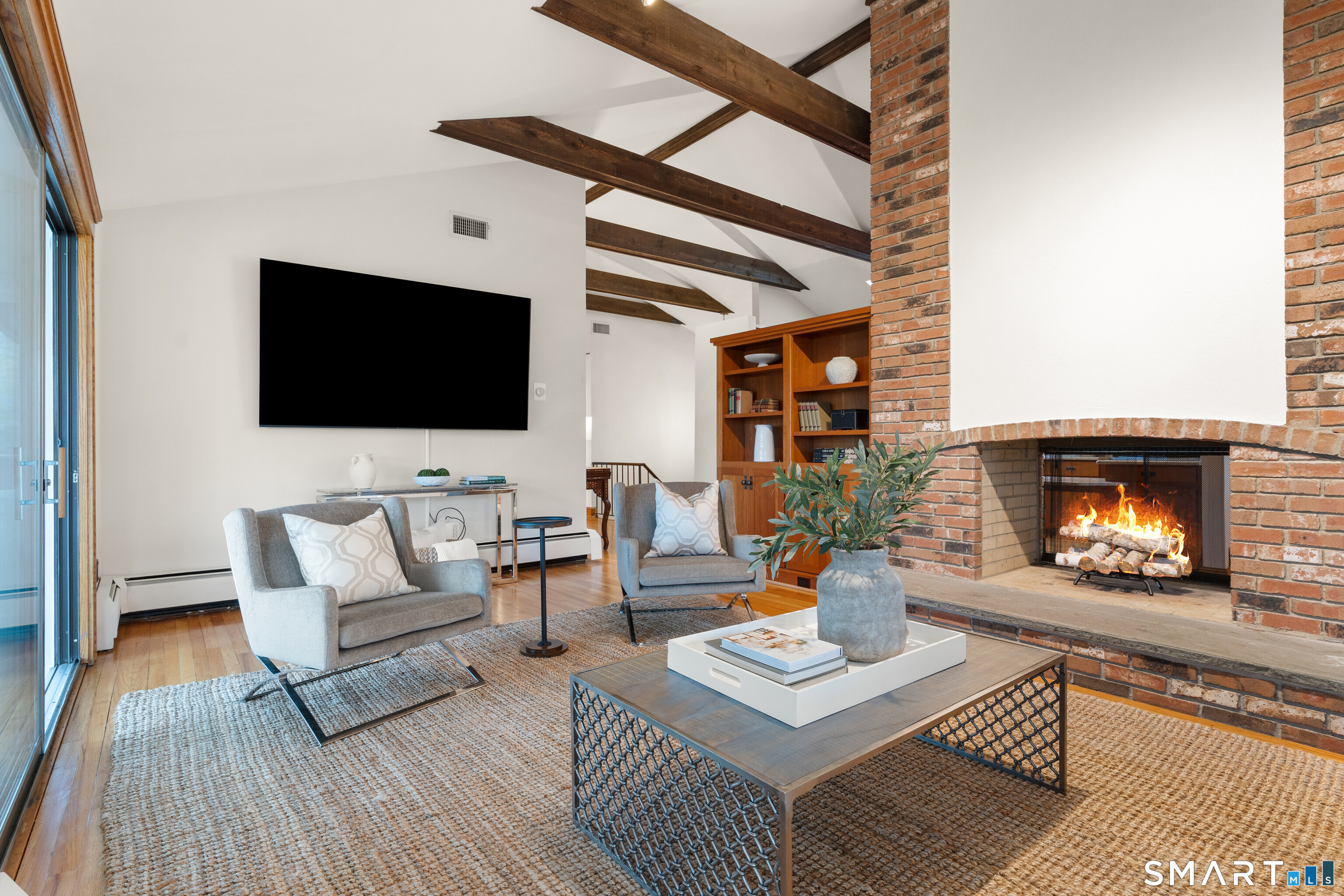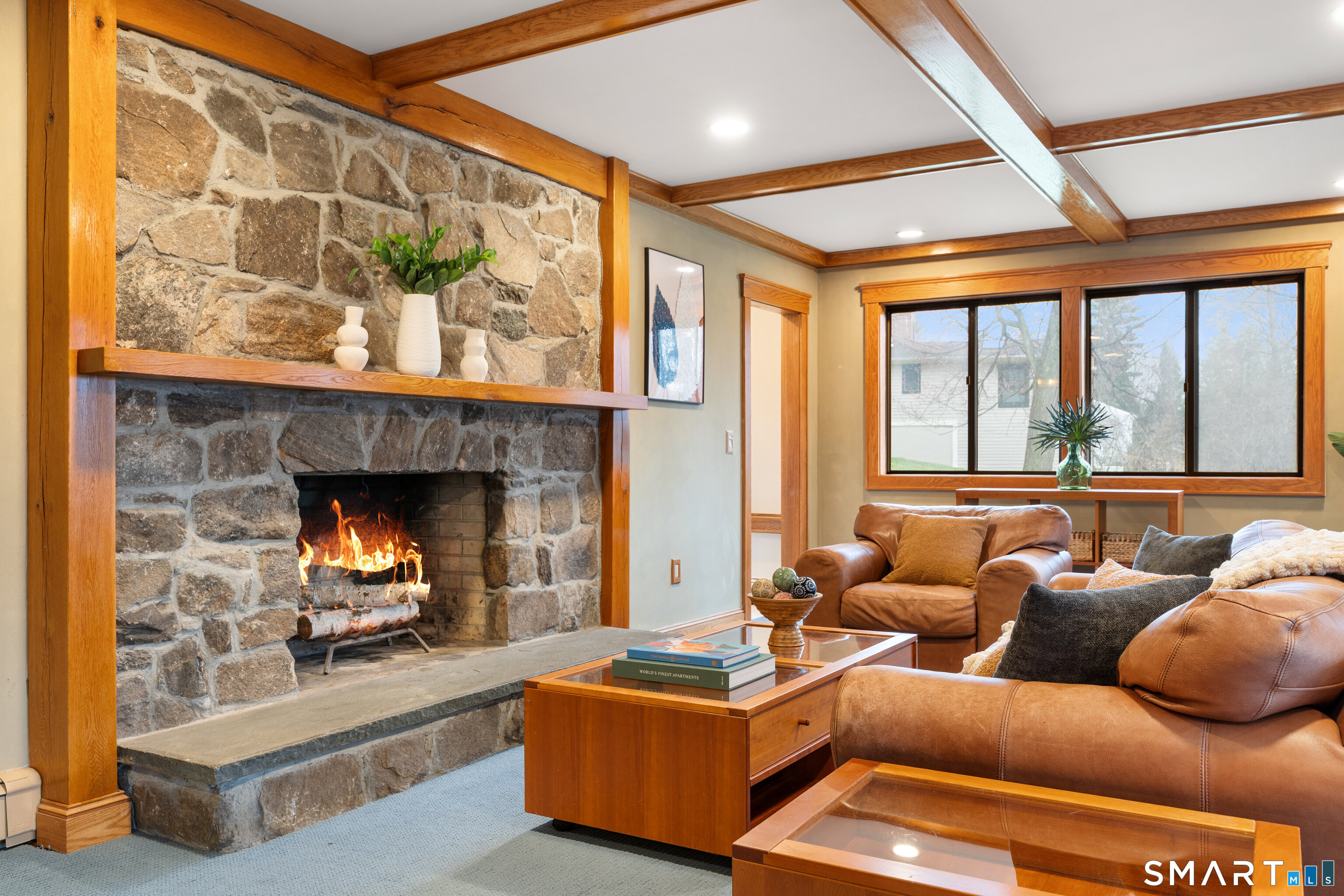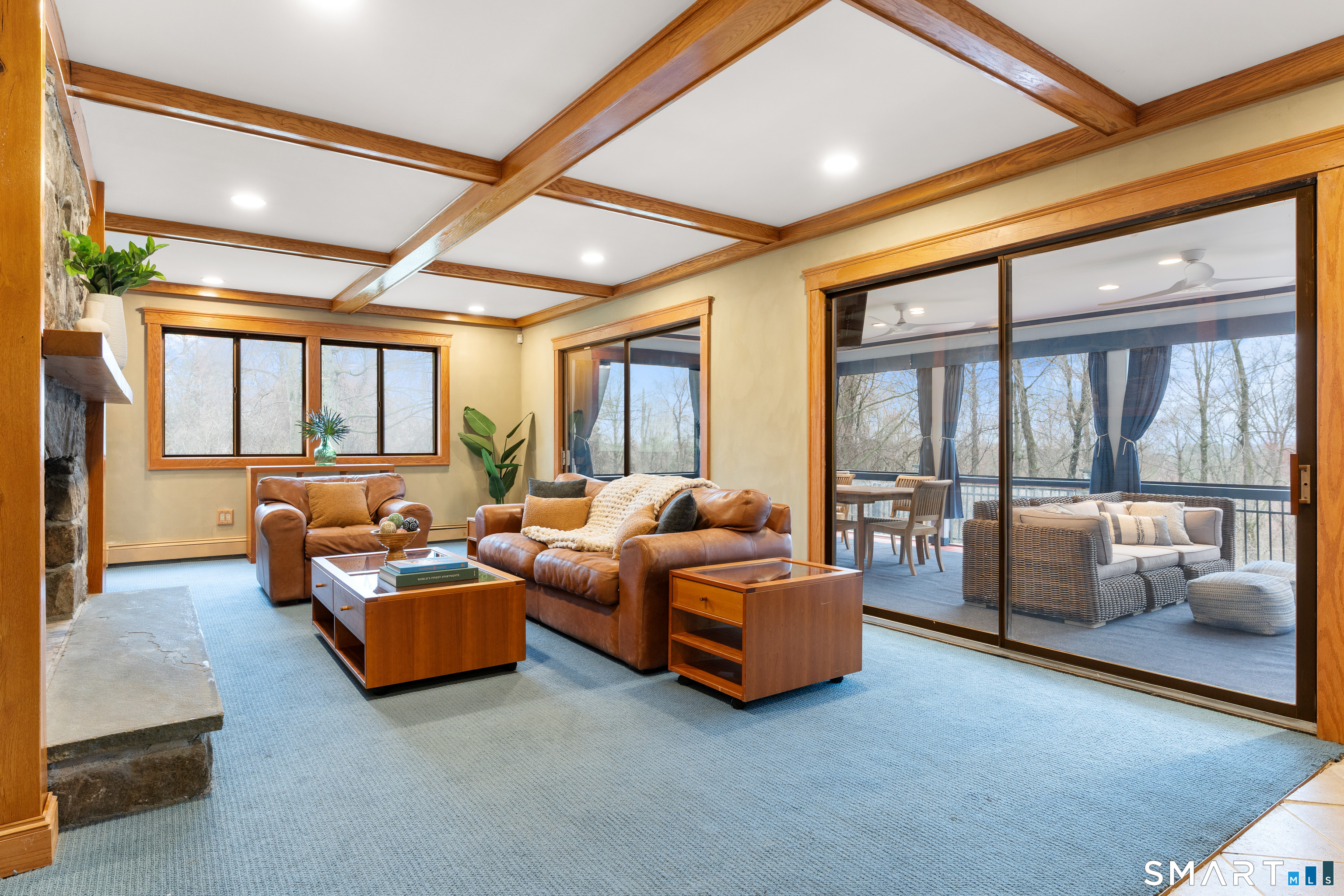 Light-filled contemporary retreat with a California vibe and sweeping sunset views, set on an lovely cul-de-sac. Designed for effortless indoor/outdoor living, this home offers over 3, 500 square feet with open floor plan and natural light, vaulted ceilings, and walls of windows. The kitchen, dining room, and living room are thoughtfully arranged around a striking two-sided fireplace, creating a central focal point and seamless flow for everyday living and entertaining. Rich architectural character and warm wood detailing are carried throughout the home, including wood floors, coffered ceilings, and custom craftsmanship that add depth and texture. Multiple flexible living spaces provide room to gather and unwind, complemented by a dedicated oversized office, as well as convenient laundry and mud room areas. A recently rebuilt sunroom with new windows and wainscoting, along with a huge screened-in porch, extend the living space and offer bright, welcoming and comforting spaces. The lower-level family room features a dramatic fieldstone fireplace, while a private balcony off the primary suite adds another peaceful escape. Outdoor living includes a spacious bluestone patio and oversized fire pit, ideal for entertaining or quiet evenings under the stars. Recently updated with a new septic tank, new well head, refrigerator, freshly painted interior and exterior (2026), it's a rare opportunity to enjoy a home rooted in nature, and a delight to experience, just ten minutes from town