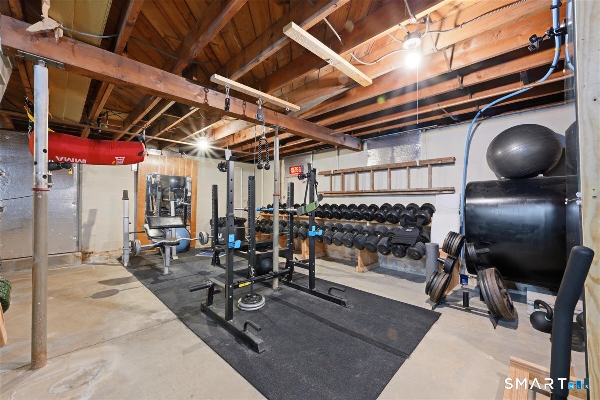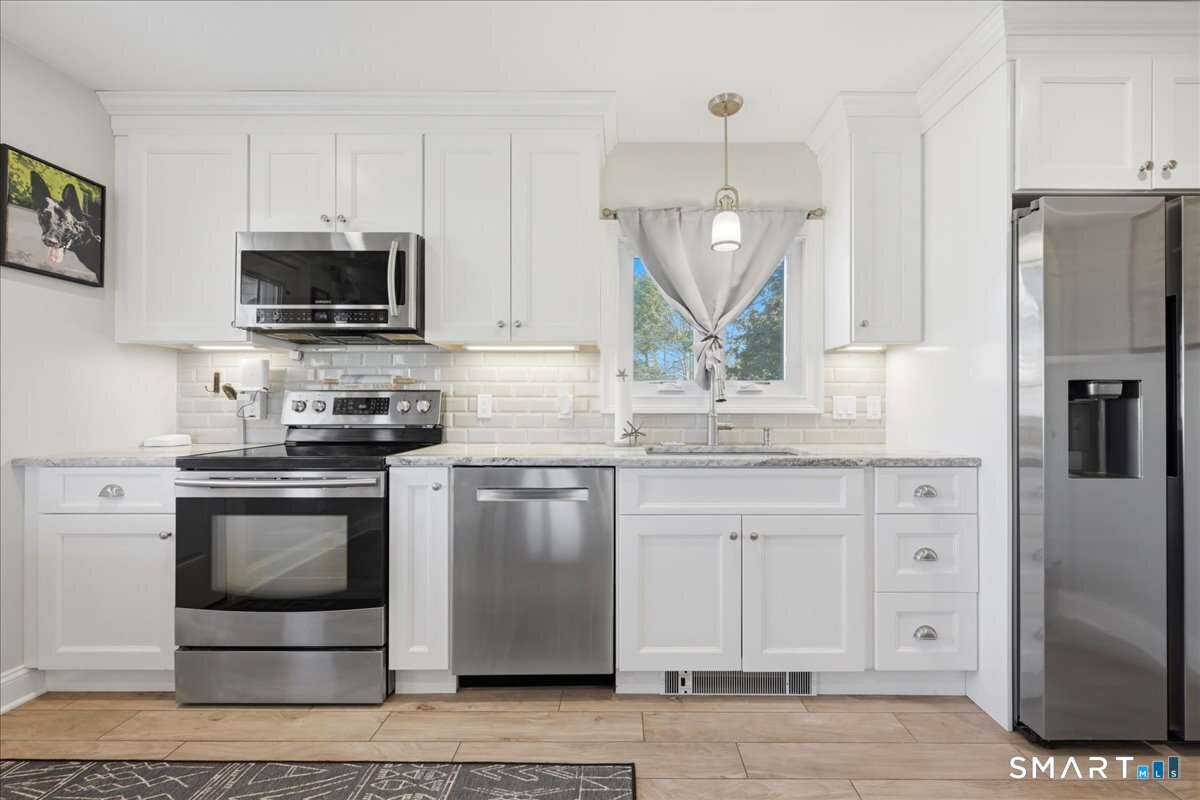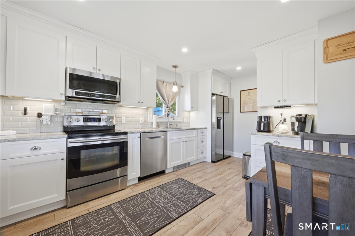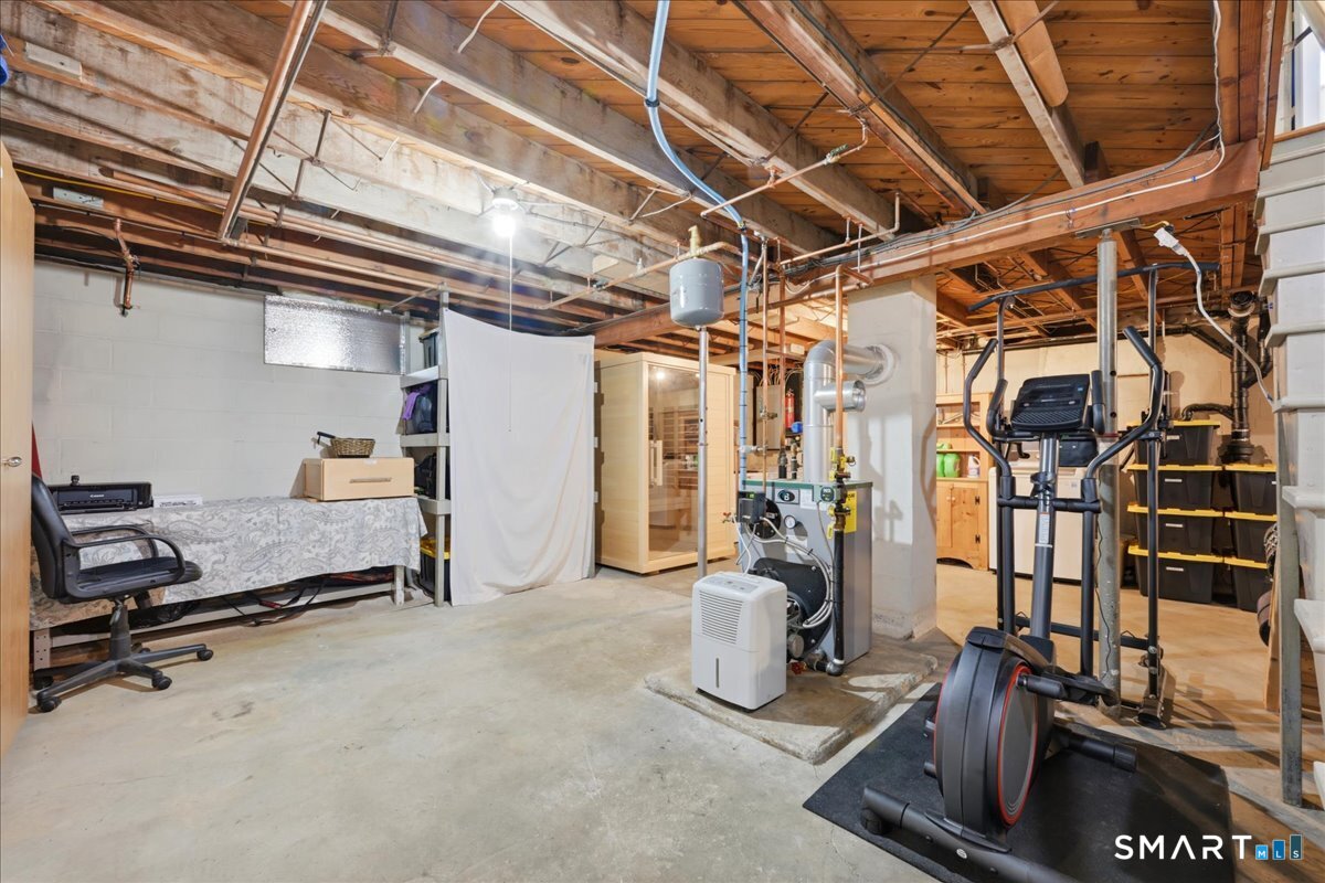 This beautifully updated two-bedroom, one-bath ranch offers the perfect blend of modern upgrades and everyday comfort. The home features a stunning, fully renovated kitchen with granite countertops, sleek cabinetry, and plenty of space for cooking and entertaining. The updated bathroom adds a touch of luxury with heated floors-perfect for those colder mornings. Major improvements provide peace of mind, including central air installed in 2016, an updated electrical panel (2015), oil tank (2017), and a newer boiler (2021). The roof on both the house and garage was replaced in 2013, and the home is equipped with younger windows for added efficiency. Inside, you'll find beautifully refinished hardwood floors throughout, along with recessed lighting on dimmer switches to create the perfect ambiance. Step outside to enjoy a fully fenced-in backyard-ideal for pets, gatherings, or relaxing in privacy-along with a sprinkler system keeping the front yard lush and green. A newer driveway adds to the home's curb appeal. The property also includes a single-car garage with a sink and urinal, offering a unique and functional space. Relax inside or out on the covered pergola with fan & TV. Theres even space for your animal to take a bath, or cool off and relax. The basement has a wall mounted tanning bed, optional sauna and optional gym. Move-in ready and thoughtfully upgraded from top to bottom, this home is a must-see! Come home and relax.
