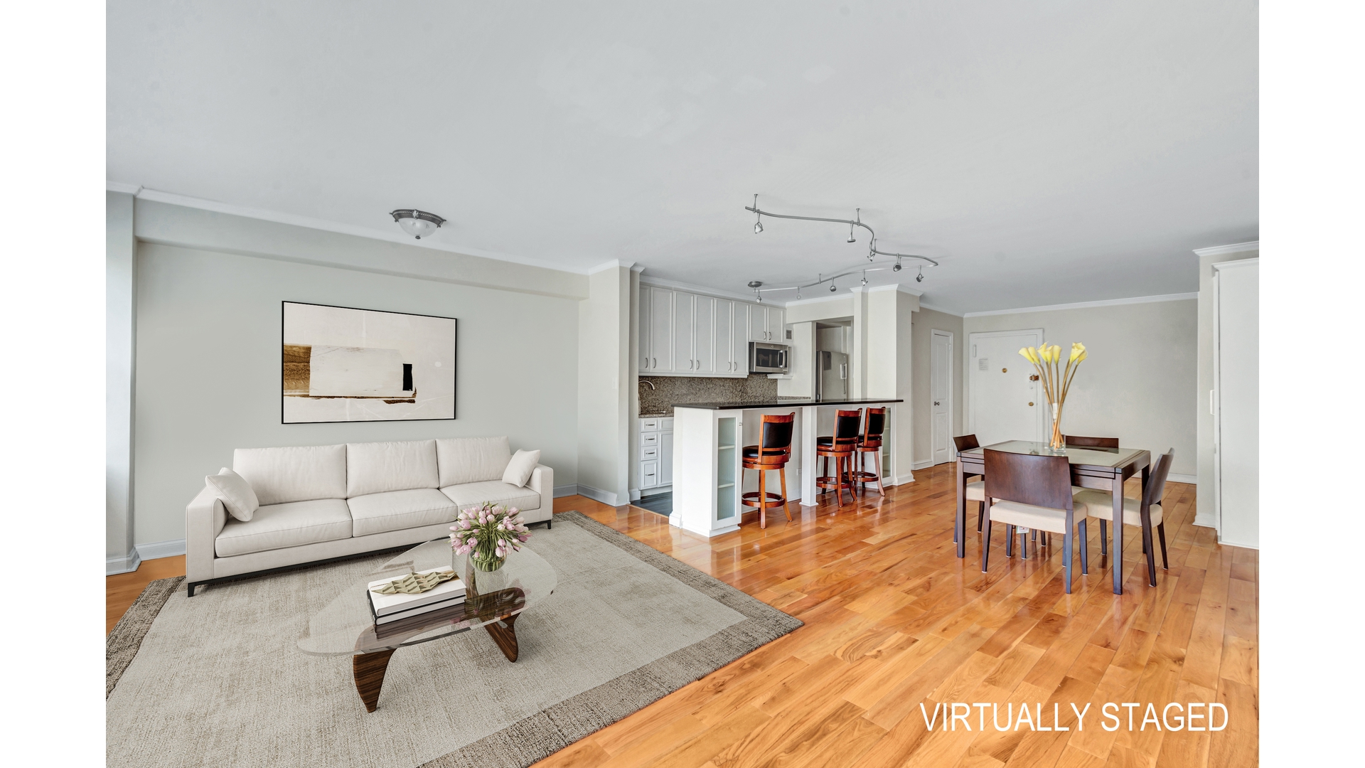 A gracious entry foyer leads into a bright, expansive living and dining area framed by a dramatic wall of windows with charming north- and west-facing views. The open-concept kitchen is perfect for both everyday living and entertaining. With the necessary approvals, the layout easily accommodates the addition of a second bedroom-adding significant value and versatility. Custom built-ins, elegant crown moldings, an oversized cedar closet, and a rare second full bathroom further elevate the space.