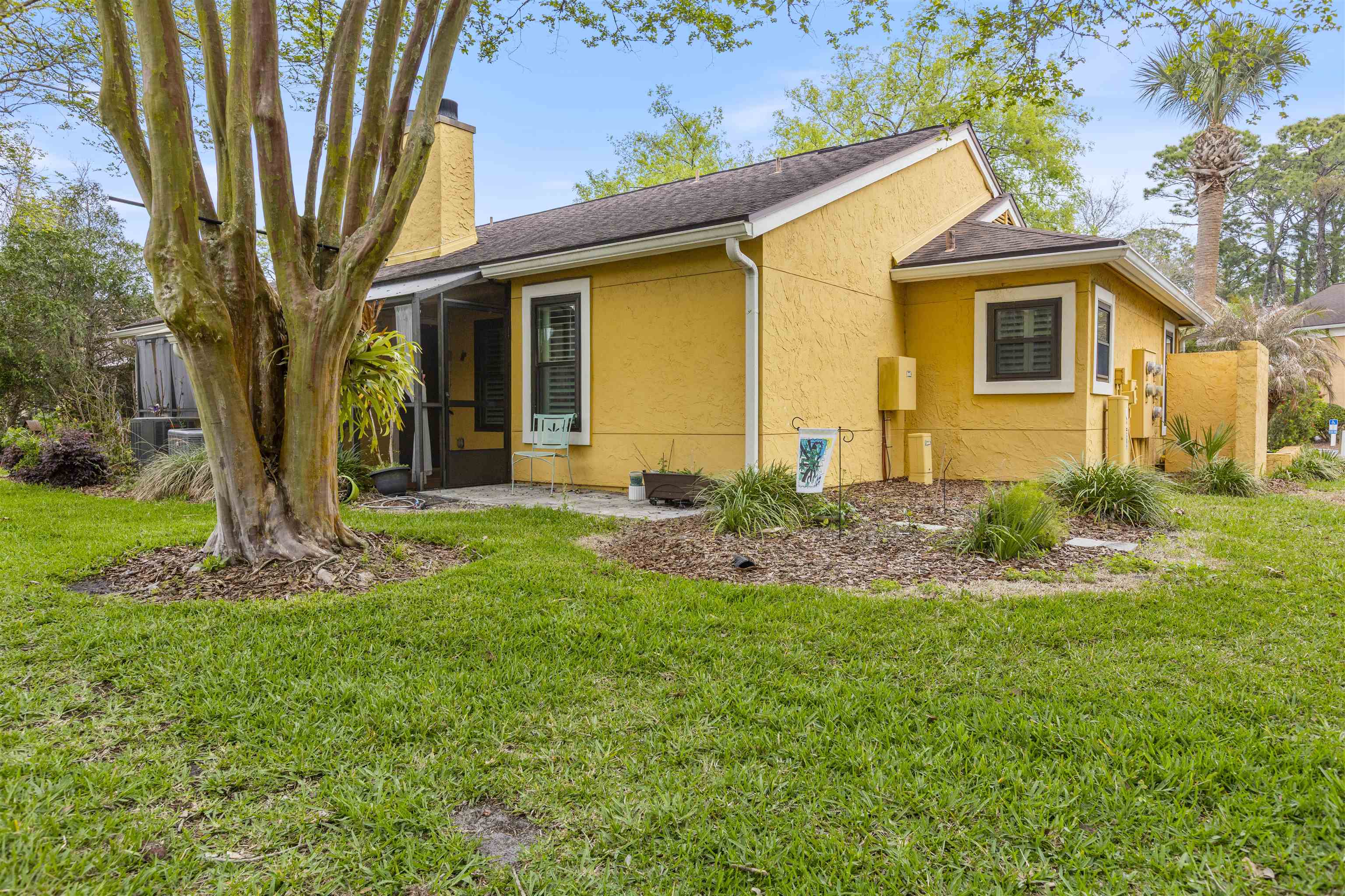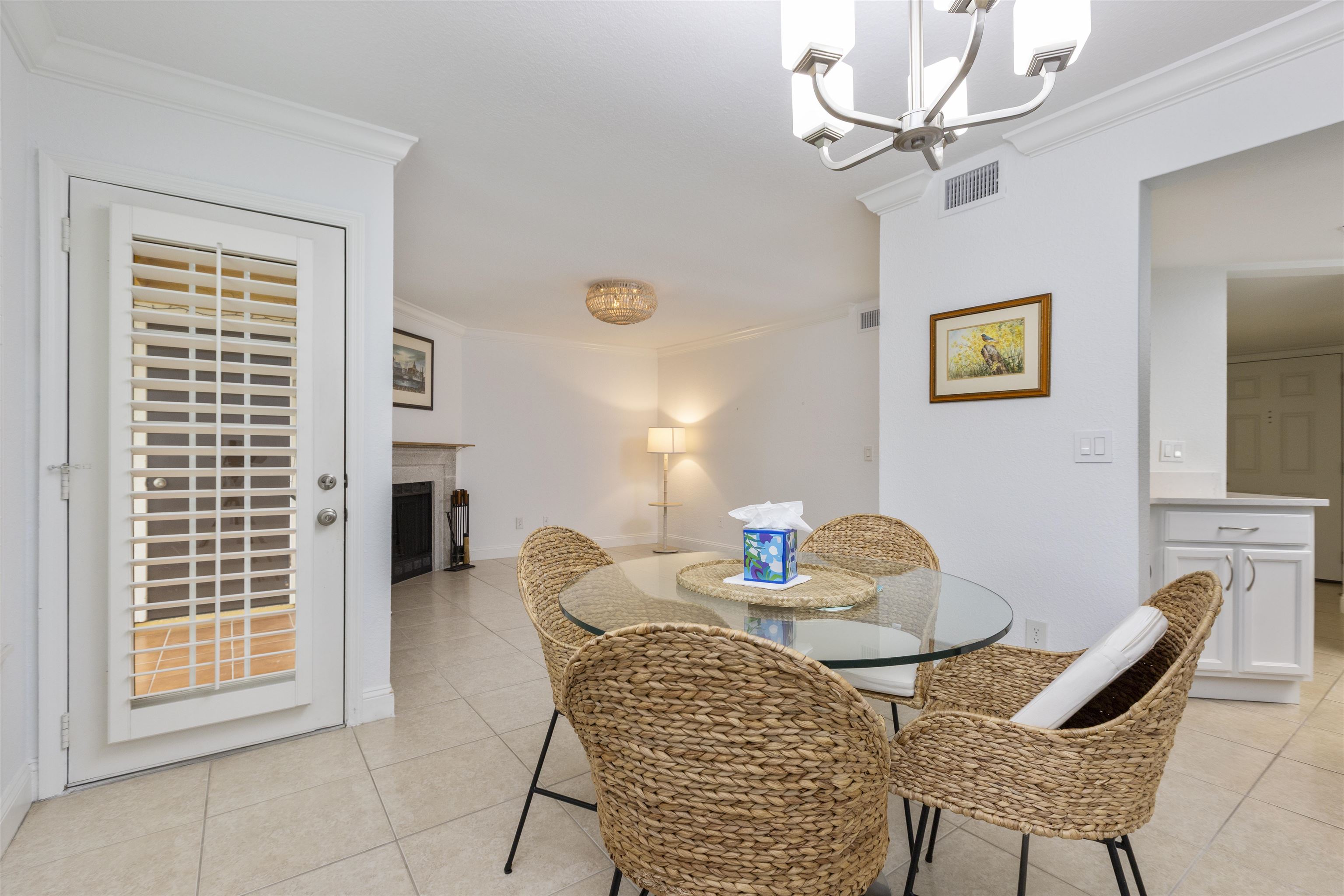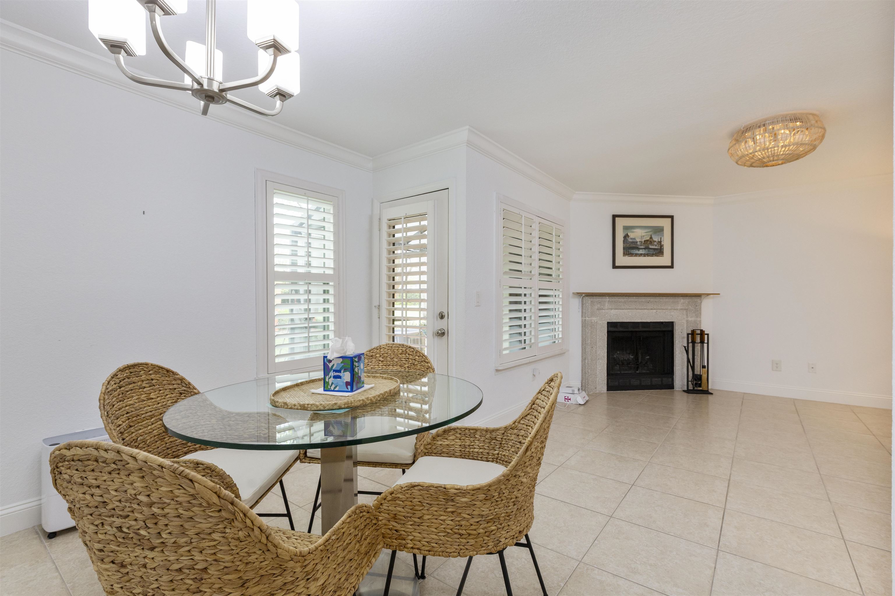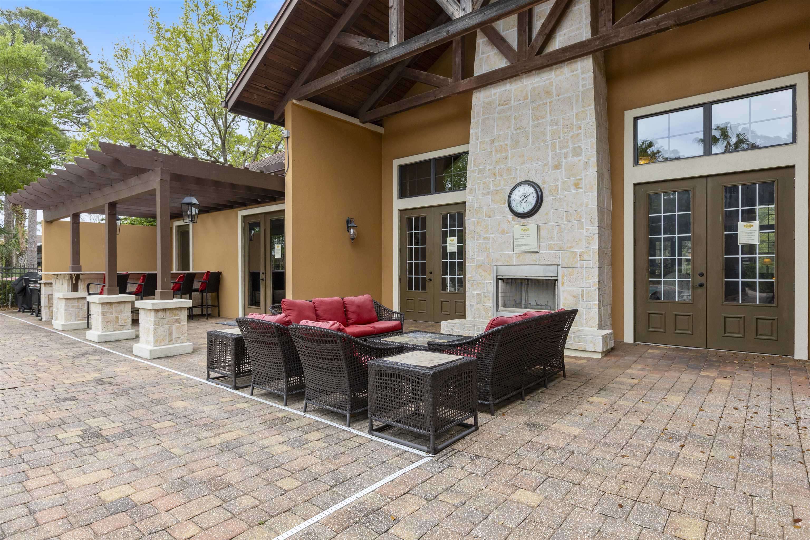 Welcome to effortless coastal living in one of the most desirable and affordable condo communities in Ponte Vedra Beach! This beautifully upgraded, single-story bungalow-style unit offers the perfect blend of comfort, style, and convenience—all just minutes from the ocean. Step inside to discover a meticulously maintained home featuring crisp white walls, elegant crown molding, and stunning plantation shutters throughout. The inviting living room showcases a gorgeous wood-burning fireplace, creating a warm and stylish focal point, while designer lighting adds a modern touch. The kitchen is both functional and beautiful with granite countertops, stainless steel appliances, double sink, and classic white cabinetry. Entertain with ease thanks to the added wet bar, perfect for hosting guests or enjoying a quiet evening at home. The spacious primary suite features laminate wood flooring, 6-inch crown molding, and a walk-in closet, while the updated bathroom offers tile flooring, a walk-in shower, and a stylish barn door for added character. The second bedroom is incredibly versatile with a built-in queen-size Murphy bed, tile floors, and plantation shutters—ideal for guests or a home office. Enjoy Florida living year-round on your private screened porch overlooking a charming paver front garden filled with lush, vibrant plants. Additional conveniences include ample storage, plus an included washer and dryer. This amenity-rich community offers a resort-style lifestyle with a clubhouse, fitness center, pool, tennis courts, library, billiards room, and social bar area. Located just minutes from upscale shopping, dining, pharmacies, and the beach—and only 10 minutes to world-renowned TPC Sawgrass golf—this home delivers the ultimate in location, lifestyle, and value. Don’t miss your opportunity to own a slice of Ponte Vedra Beach paradise!