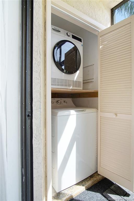 Ground Floor Condo in Savanna Club! The condo fees are paid by the seller for 2026. AC was replaced in 2022. Bright open floor-plan with spacious kitchen with granite countertops, newer appliances. The living room and the bedroom pictures are virtually staged. Ample storage. Sliders open to screened patio and stacked washer/dryer in closet. Additional storage space in exterior hallway. Water and basic cable included. Lovely community with plenty of green space offering 2 pools (one heated), clubhouse with billiards table, ping pong, activities, and multiple gas BBQ Grill areas. Centrally located in Jensen Beach surrounded by shopping, dining, downtown Jensen, great schools, and 10 minutes to gorgeous area beaches. All ages and one pet up to 15lbs welcome. Perfect for investors: no waiting period, minimum rental period is 30 days, a unit can be rented 3 times per year.