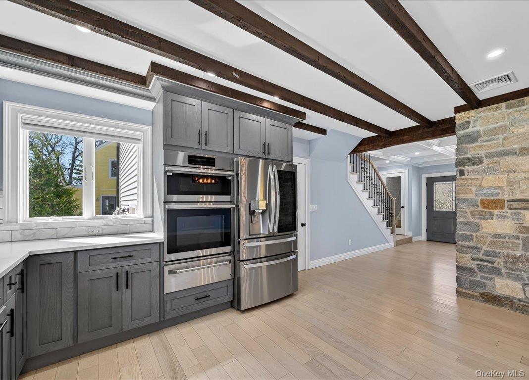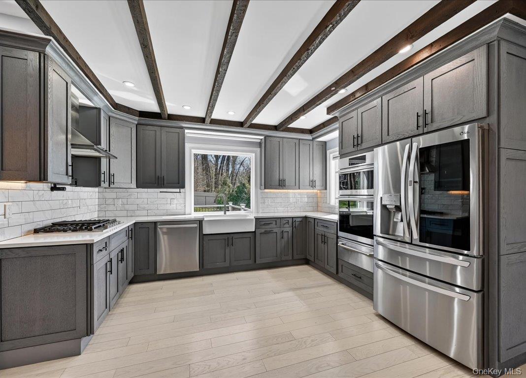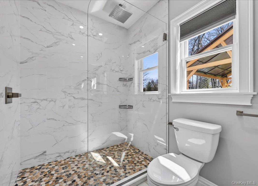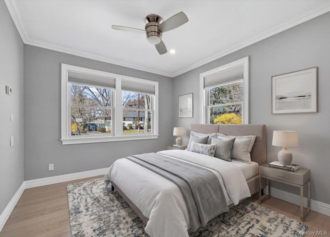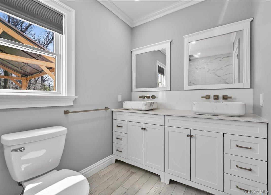 This home might take your breath away! Completely remodeled and augmented inside and out in 2023 by a master contractor, this open flowing floor plan offers higher than 8 ft ceilings, a living and dining area with beautiful tray ceiling , ceiling beams and fireplace. Its sun drenched with natural light and is exquisitely crafted with chefs kitchen, wall to wall cabinets and counter spaces, stainless appliances and farmers sink. Above all , there are 2 primary bedroom suites! One on the main floor and one on the 2nd floor. Another great surprise is all the bedrooms have en suite bathrooms with either double or single sinks, all tile or marble and rain shower heads. There is a classic claw foot tub to elevate one of the en suites and this bedroom has its own outside 2nd floor balcony. All the closets are big, have built ins and all bedrooms have ceiling fans. The beautiful interior doors are accented with thick moldings and black matte hardware, the windows are all Anderson through out, all radiant heated floors throughout, central air-conditioning, and a 2 car garage that is on grade! The roof is a 30 year architectural roof, the property is private and level, its all fenced in, has a spacious trek deck for al fresco dining, and a welcoming circular driveway with paver accents. The driveway is plenty big for parking 6 + cars. Close to Nanuet or Pearl River train stations, this location is perfectly positioned for commuting, shopping, dining, and the NJ border. This makes daily needs and running quick errands effortless. Why not start your morning with a short walk or drive to a nearby coffee and delicious bagel shop. But because the list goes on, you'll need to see this captivating home for yourself.