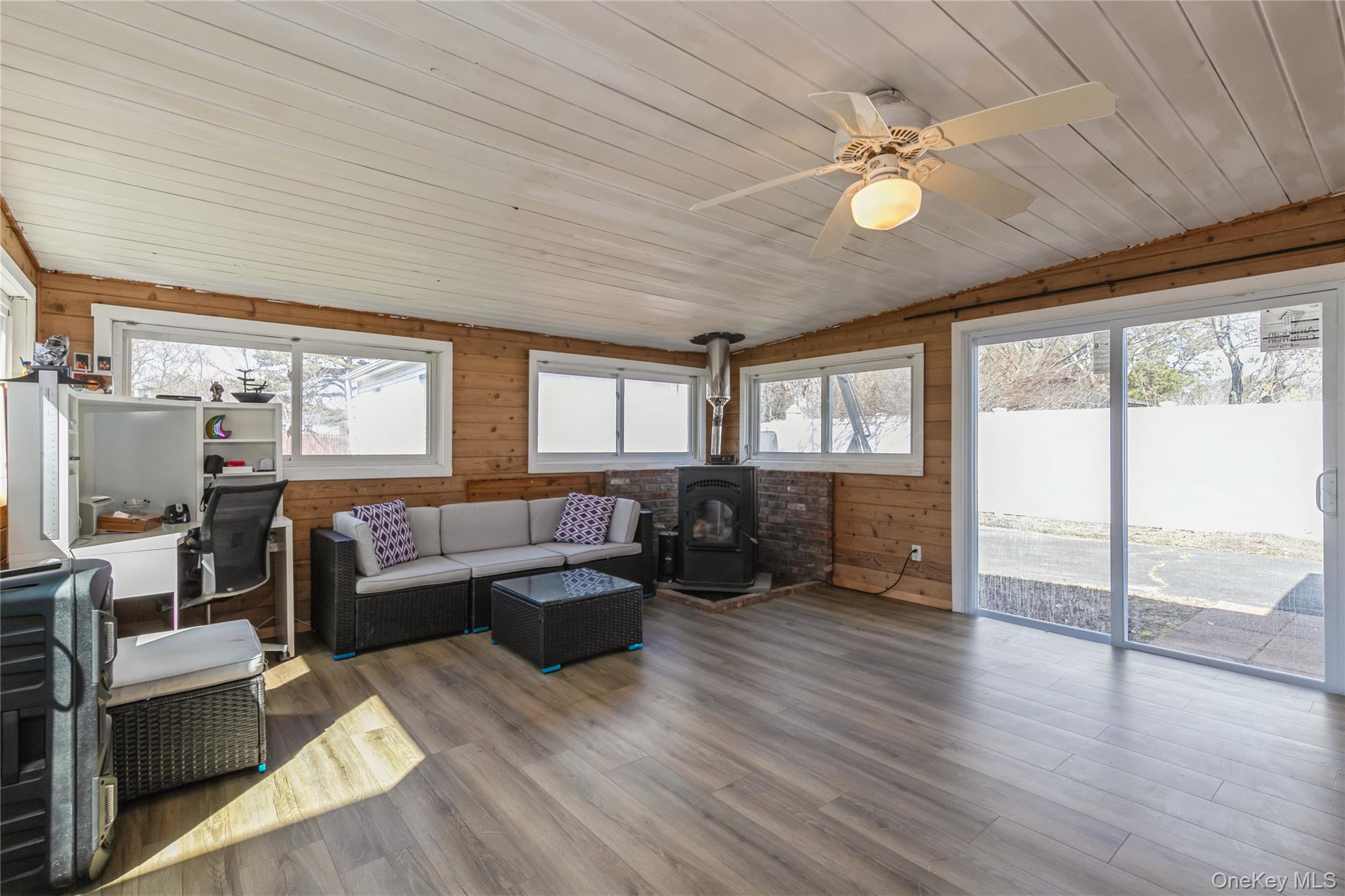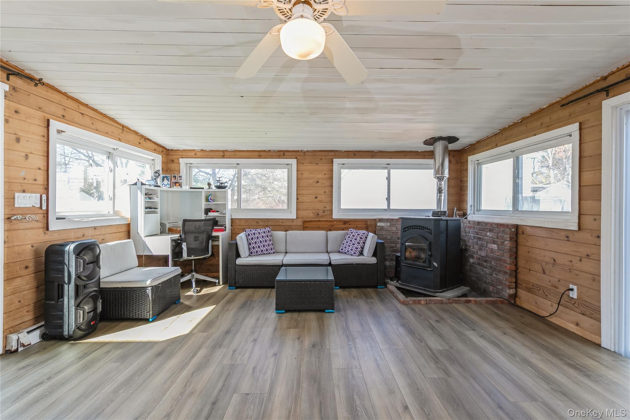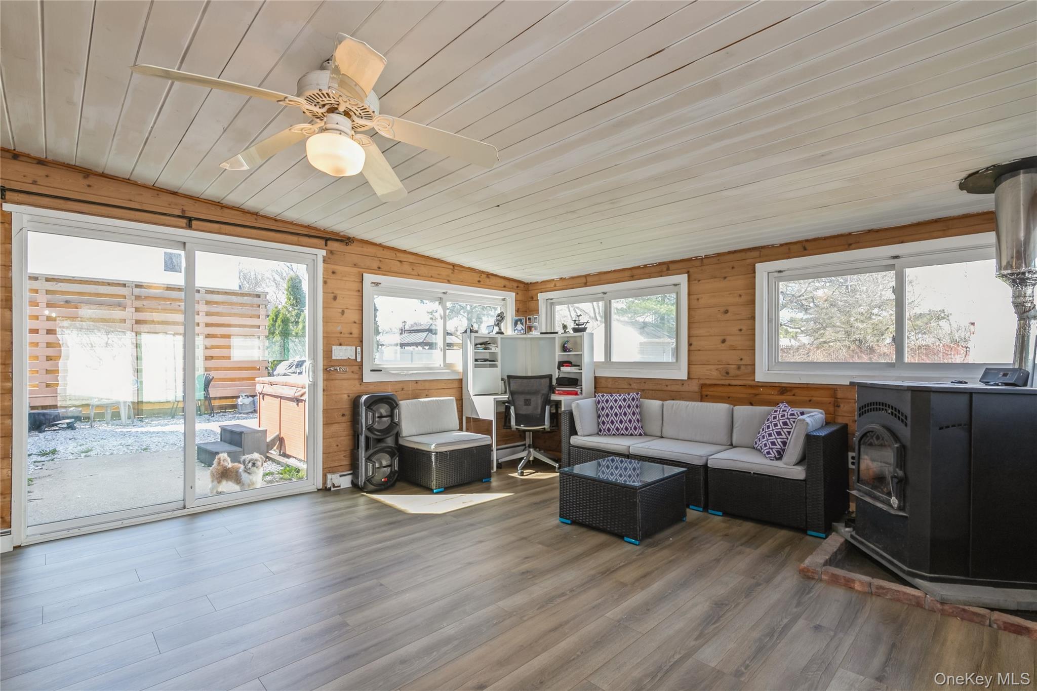 Come see this beautifully expanded Cape offering the perfect blend of space, versatility, and thoughtful updates. The main level features two comfortable bedrooms (one being the Master), a full bath, a bright and inviting living room, formal dining room, sun-lit den, and a cozy office—ideal for today’s work-from-home lifestyle. Upstairs, you’ll find a spacious and private living area with two additional bedrooms, a full bath, and its own living room, presenting a fantastic opportunity for a potential mother/daughter setup or income-producing space with proper permits. This home has been tastefully updated throughout, including a modern kitchen, renovated bathrooms, updated flooring, stainless steel appliances, newer windows, sliding glass doors, and a newer roof—giving you peace of mind and move-in-ready convenience. Step outside to enjoy a generously sized property featuring a fully fenced backyard, perfect for entertaining, pets, or simply relaxing. A detached garage and large driveway provide ample parking, while a charming wood-burning stove adds warmth and character to the home. This neighborhood has underground utilities (helpful in storms in not losing service) and sewers instead of cesspools! A wonderful opportunity with flexibility and charm—don’t miss your chance to make it yours!