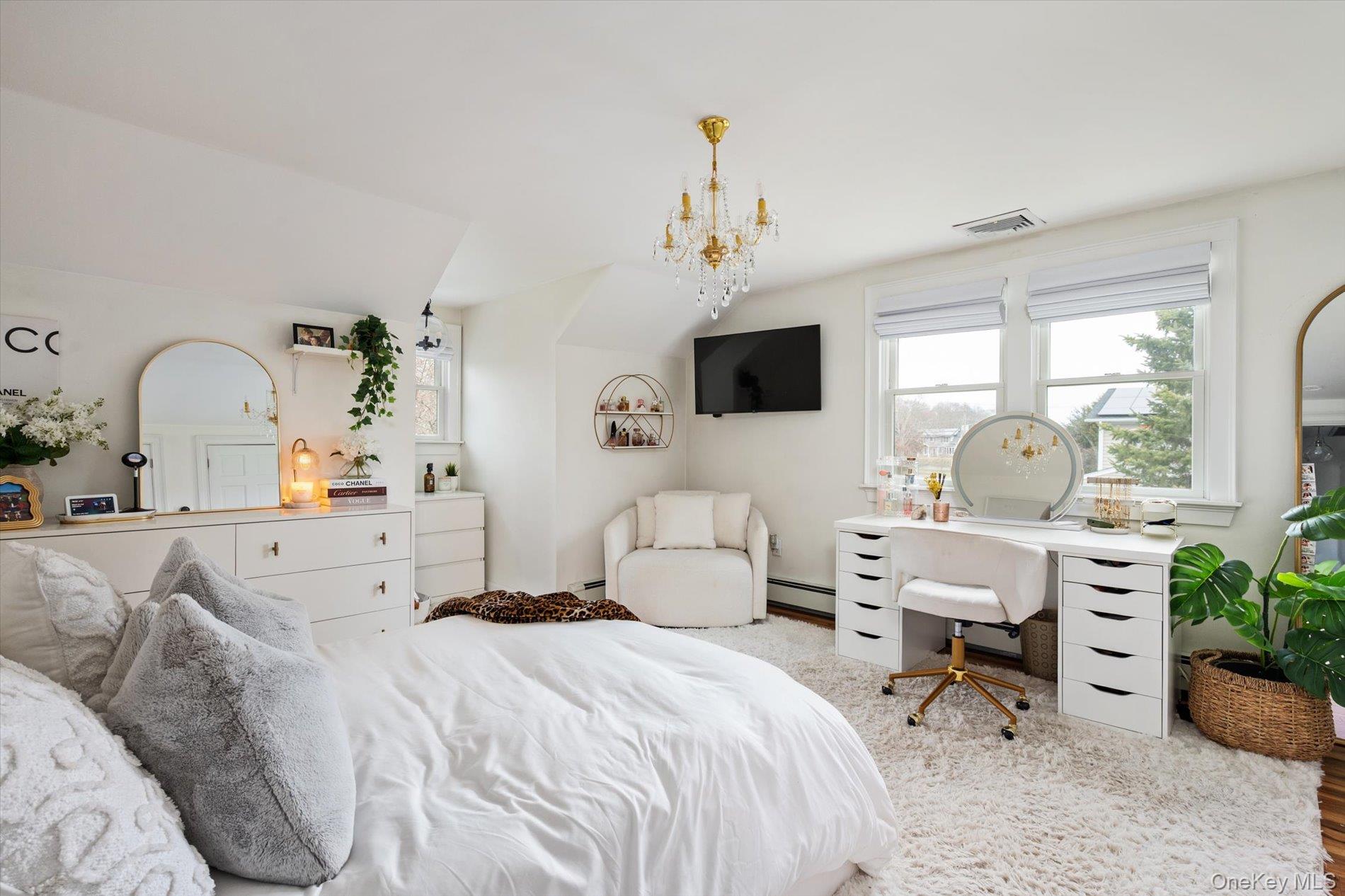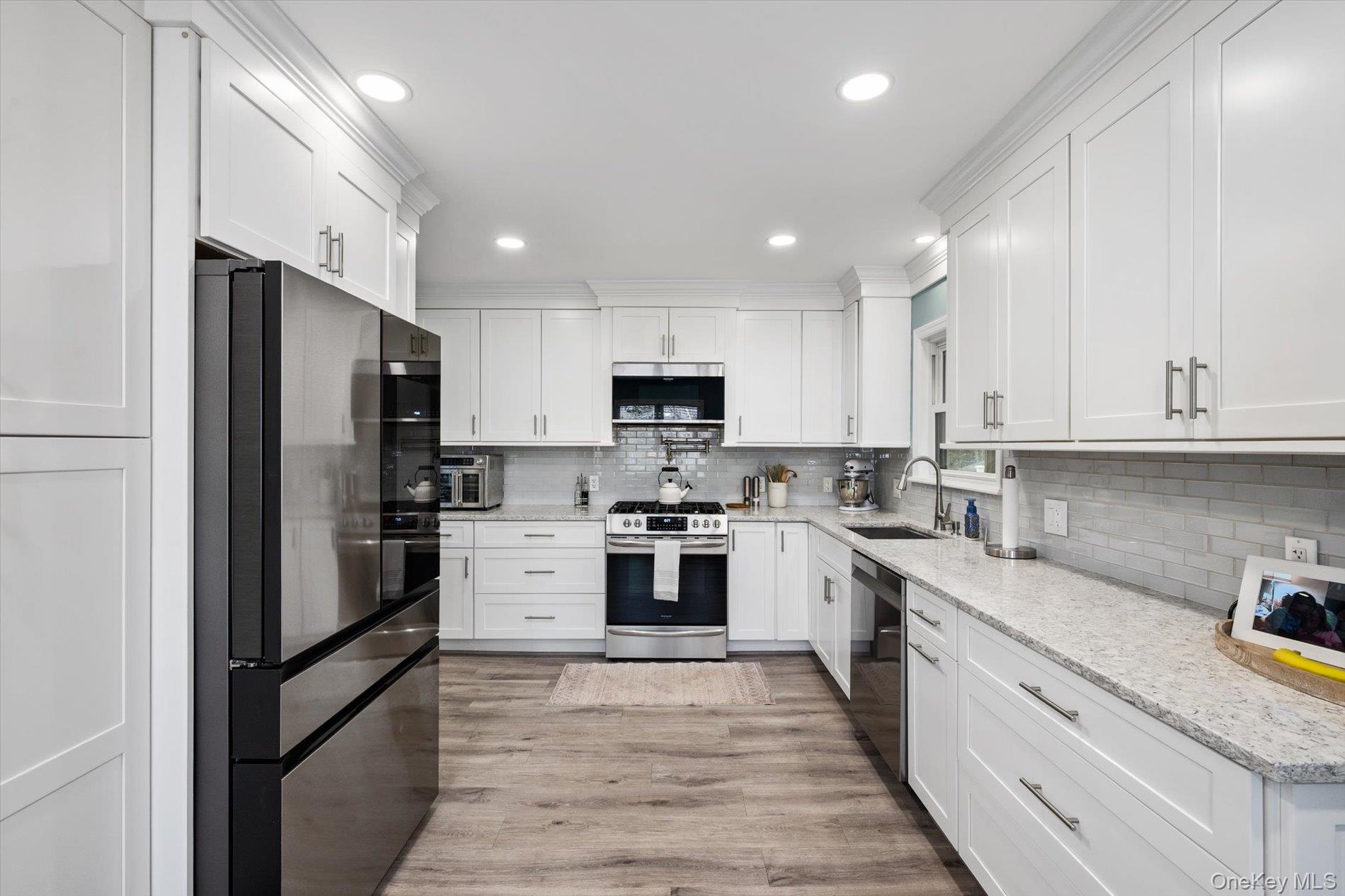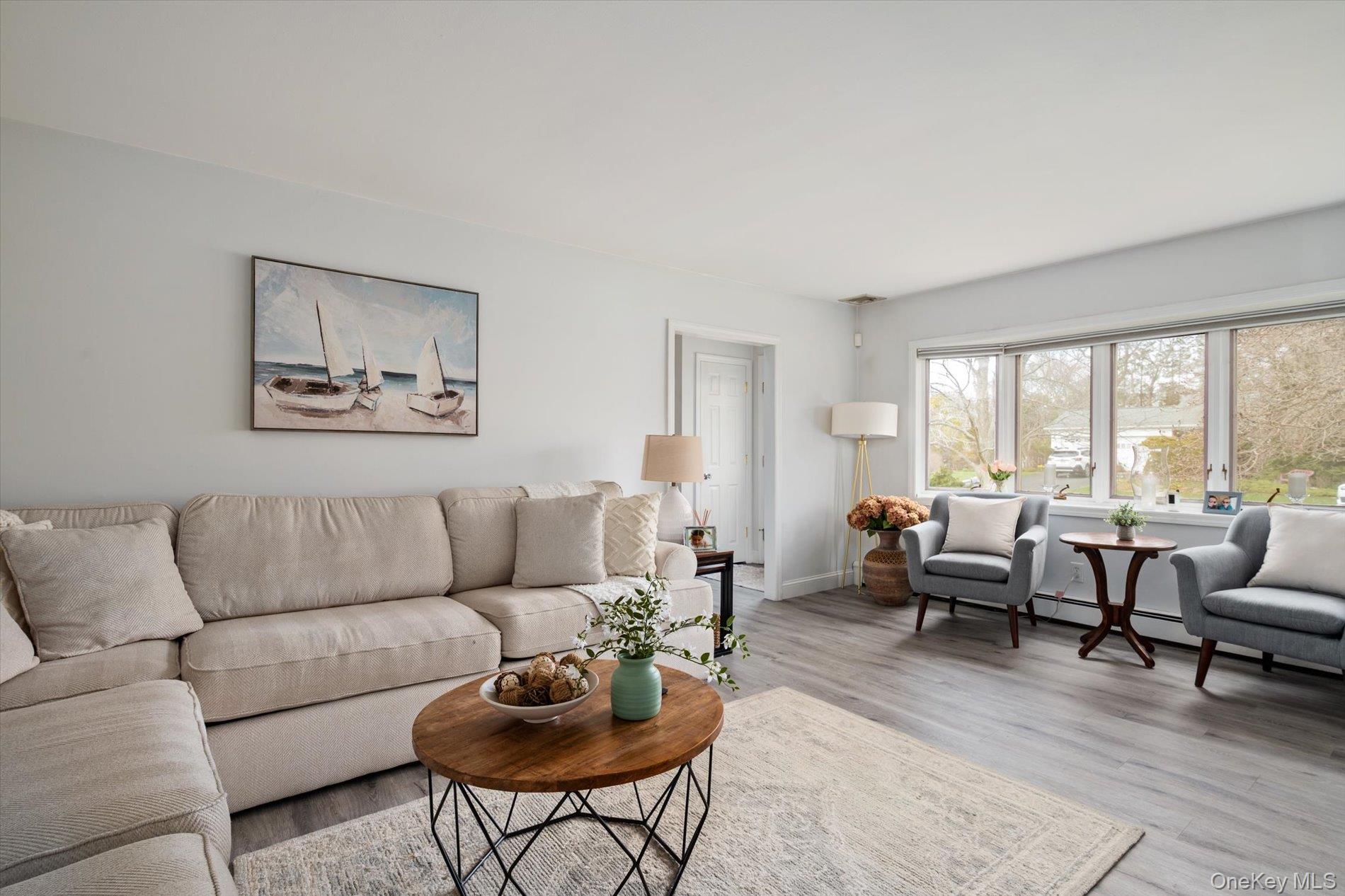 Welcome to this beautifully renovated 4-bedroom, 2 full bathroom home set on approximately half an acre in East Patchogue. Originally built in 1954 and thoughtfully updated, this property offers a blend of modern finishes and functional living space. The main level features a bright living area with a wood burning fireplace, and updated flooring. The renovated kitchen comes with custom cabinetry, quartz countertops, stainless steel appliances, and a tiled backsplash as well as a pot filler!! The true conversation piece of any modern kitchen. Just off the kitchen is a formal dining room (currently being used as an office). The FDR has access to the garage and a sun-filled bonus room that provides additional living and laundry space with views of the backyard and direct access to the deck through the sliding door. BTW the TVs are included! The full bathrooms have been updated, and all 4 bedrooms offer comfortable space and plenty of storage. There are 2 bedrooms upstairs and a full bathroom. Additional features include a full basement with high ceilings, providing excellent storage or potential finishing for future use. The home is equipped with oil heat, baseboard heating, central air conditioning, and supplemental mini-split systems for added efficiency. Solar panels (leased) help offset utility costs. Exterior features include a spacious deck, large yard, shed, attached one-car garage with interior access and charming landscaping. There is space to garden, add a pool or firepit.