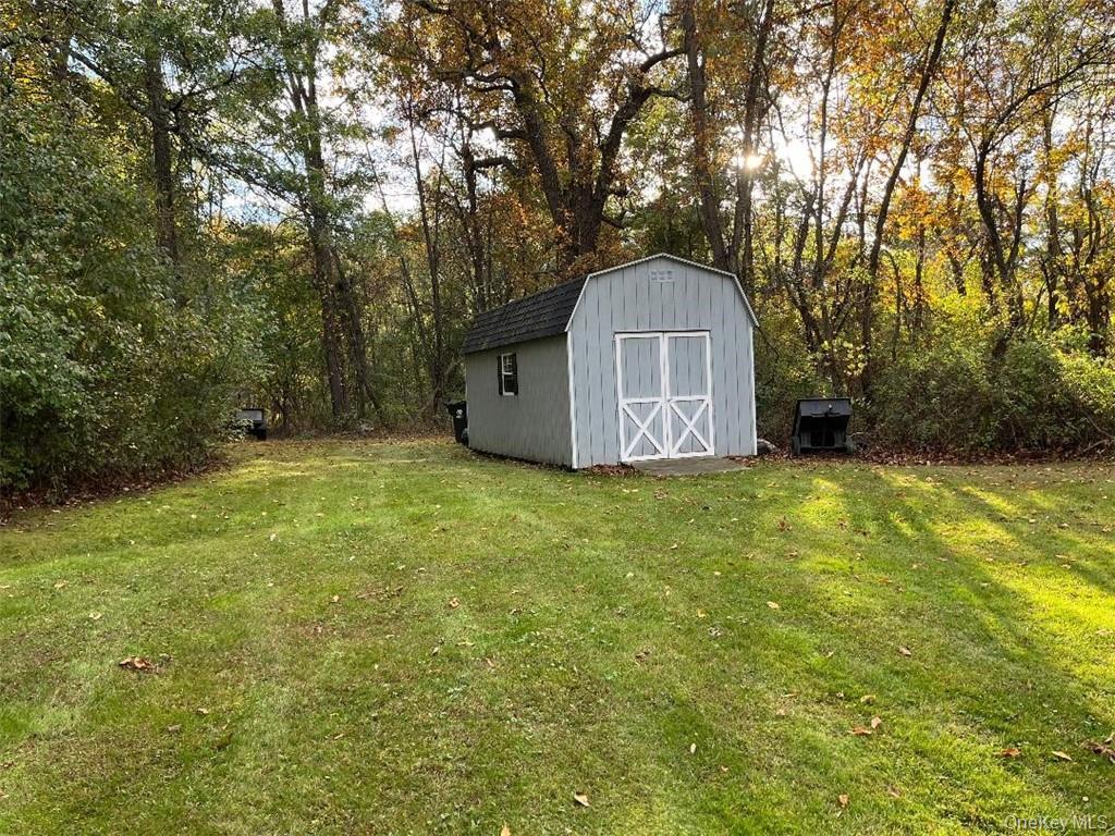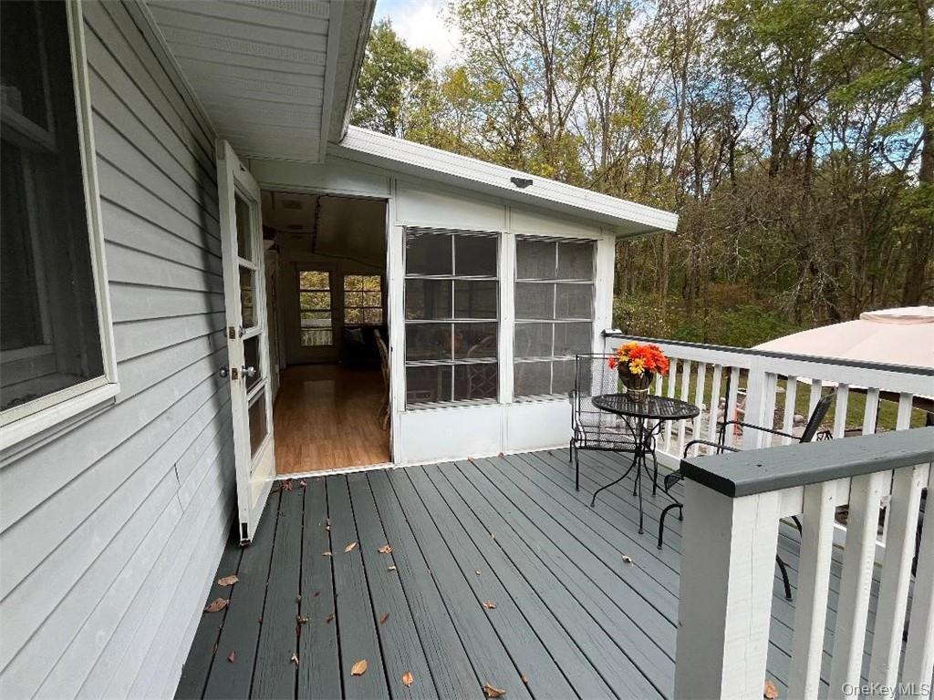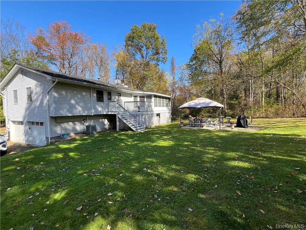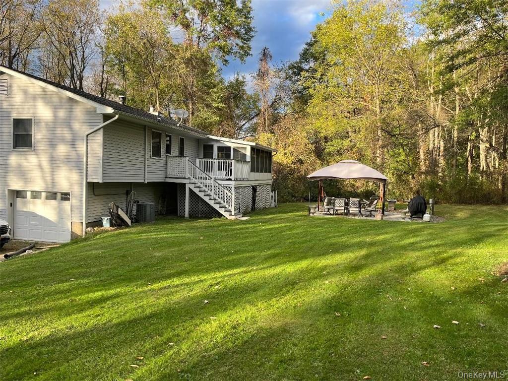 Looking for privacy, yet close to highways, shopping and transit. Look no further. Welcome to your new home on 3 private parklike acres. Spotless, lovingly maintained home featuring spacious open floor plan. Main level offering hardwood floors, large living room with cathedral ceilings, gas fireplace, built ins, eat in kitchen with quartz counters, stainless steel appliances and a formal dining room. Step out onto your 200 square foot 3 seasonal porch and enjoy the peaceful backyard without the bugs. Spacious main bedroom with en-suite bath, plus 2 additional bedrooms and full bath to complete the main level. The lower level features a large den, laundry room an office/multi purpose room, and bathroom. 2 car attached garage. Your secluded back yard offers a patio, fire pit for a your outdoor entertaining plus a large shed for extra storage. Quiet no through traffic road. Just a short walk from your driveway will lead to a Orange County's newest park which is in development of turning 258 acres to future recreation including with tennis, pickleball, dog parks, playground, walking trails, ballfields, splash pad, picnic and in addition this will connect to the 18 mile Heritage Trail. All this, plus quick access to Route 17. Under 10 minutes from the Woodbury Commons, LegoLand and within a few minutes from grocery stores, retails stores and schools.