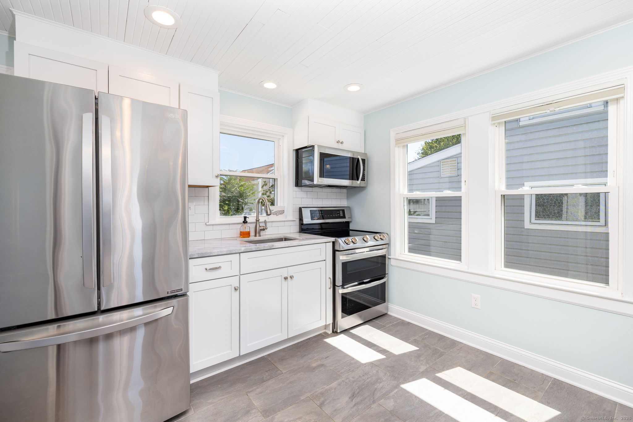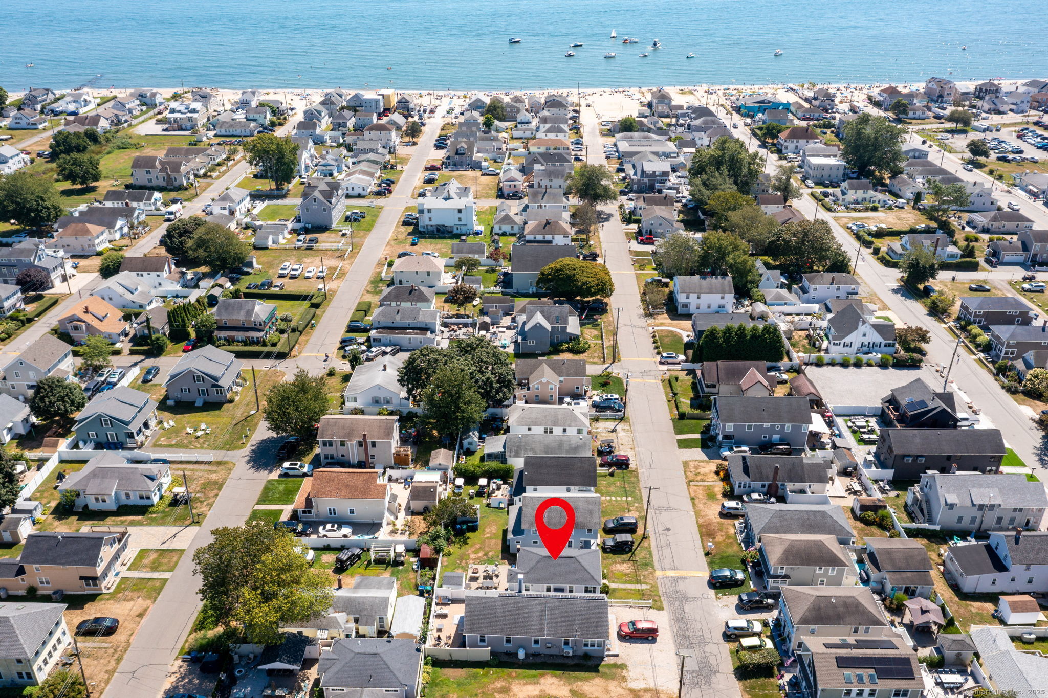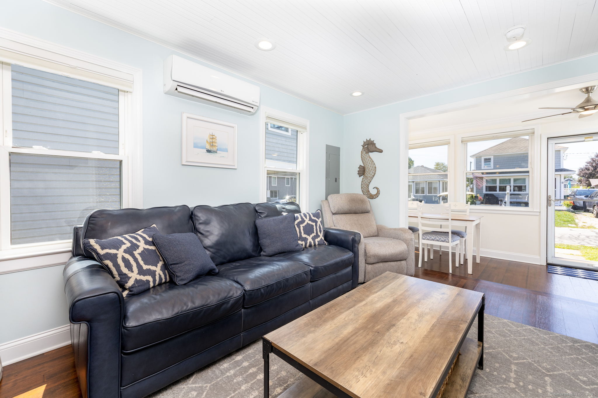 Absolutely everything has been done! This charming, fully furnished bungalow, in the heart of Old Colony's beach community was completely renovated in 2018, blending modern luxury with timeless coastal charm. The only original features remaining is the gorgeous refinished hardwood floors and the bead-board ceilings. Every square inch of this thoughtfully designed home exudes style and functionality, perfect for relaxed beachside living. The heart of the home is a chef's kitchen, boasting sleek shaker white cabinets, sparkling quartz countertops, a chic subway tile backsplash, and stainless steel appliances. Enjoy mornings at the cozy breakfast or coffee bar, while the open, airy layout flows seamlessly into the living room and inviting front sunroom. This versatile sunroom doubles as a dining area and cozy den, bathed in natural light-ideal for entertaining or unwinding. The fully remodeled bathroom features a modern shower stall and convenient stackable laundry area. Additional upgrades include a newer roof, vinyl replacement windows, ductless AC and heat, propane on-demand hot water, an outdoor shower, and updated interior/exterior doors with stylish lighting throughout. Host unforgettable summer gatherings on the expansive rear stone pebble patio, with ample storage in the outdoor shed. Just a short walk or golf cart ride to Old Colony Beach, the iconic Pavilion, Kokomo's restaurant, and the quaint shops and charm of Old Lyme. This home offers the ultimate coastal lifestyle. Gated private security in the summer provides peace of mind. Move-in ready and brimming with upgrades, this bungalow is your perfect seaside retreat!